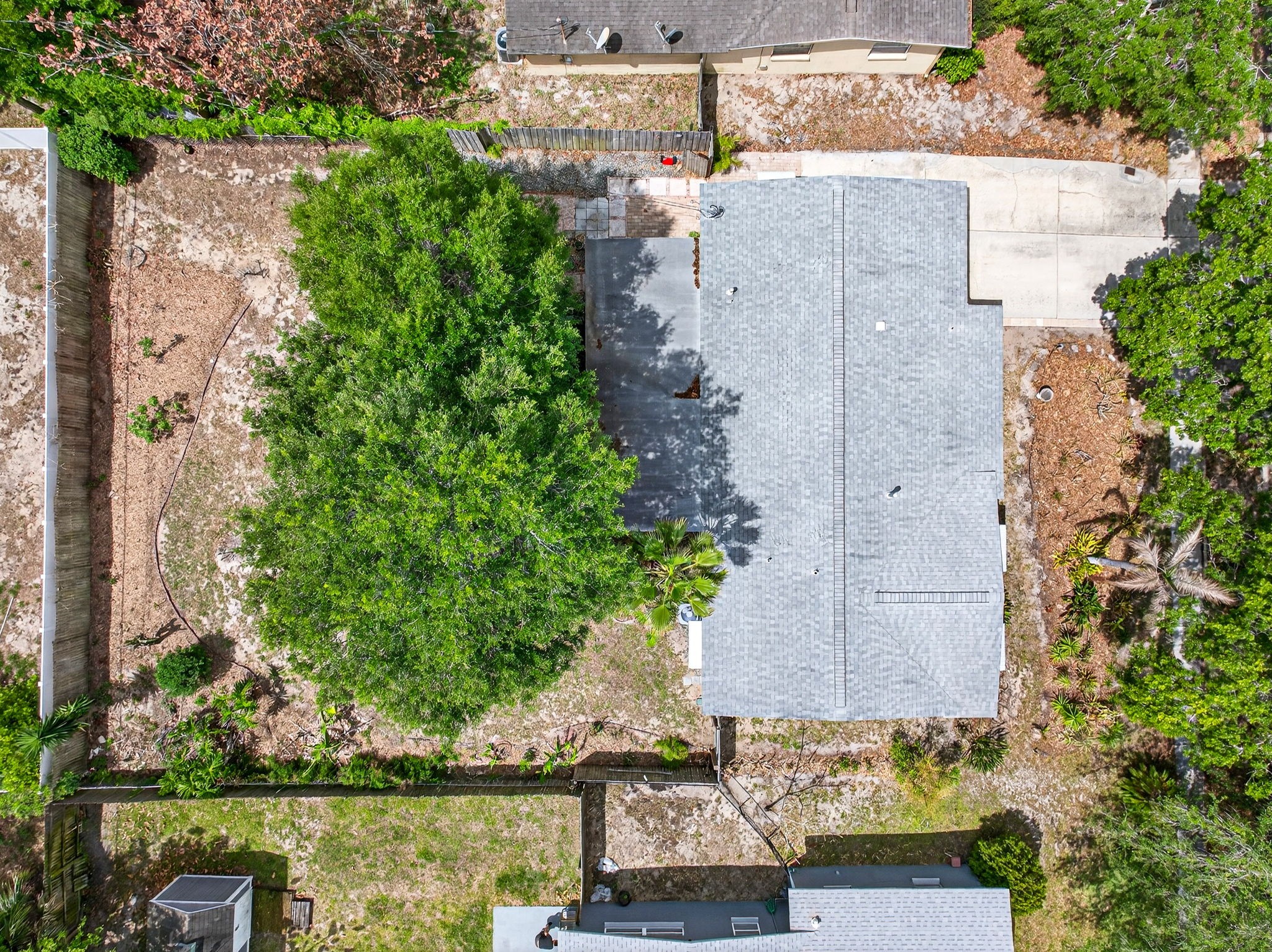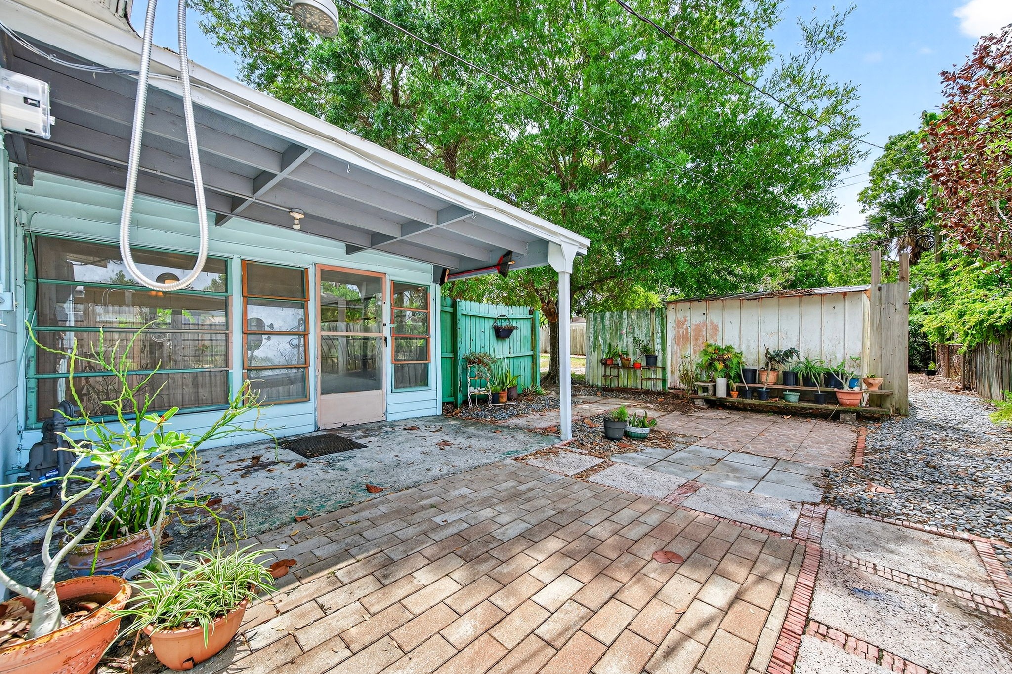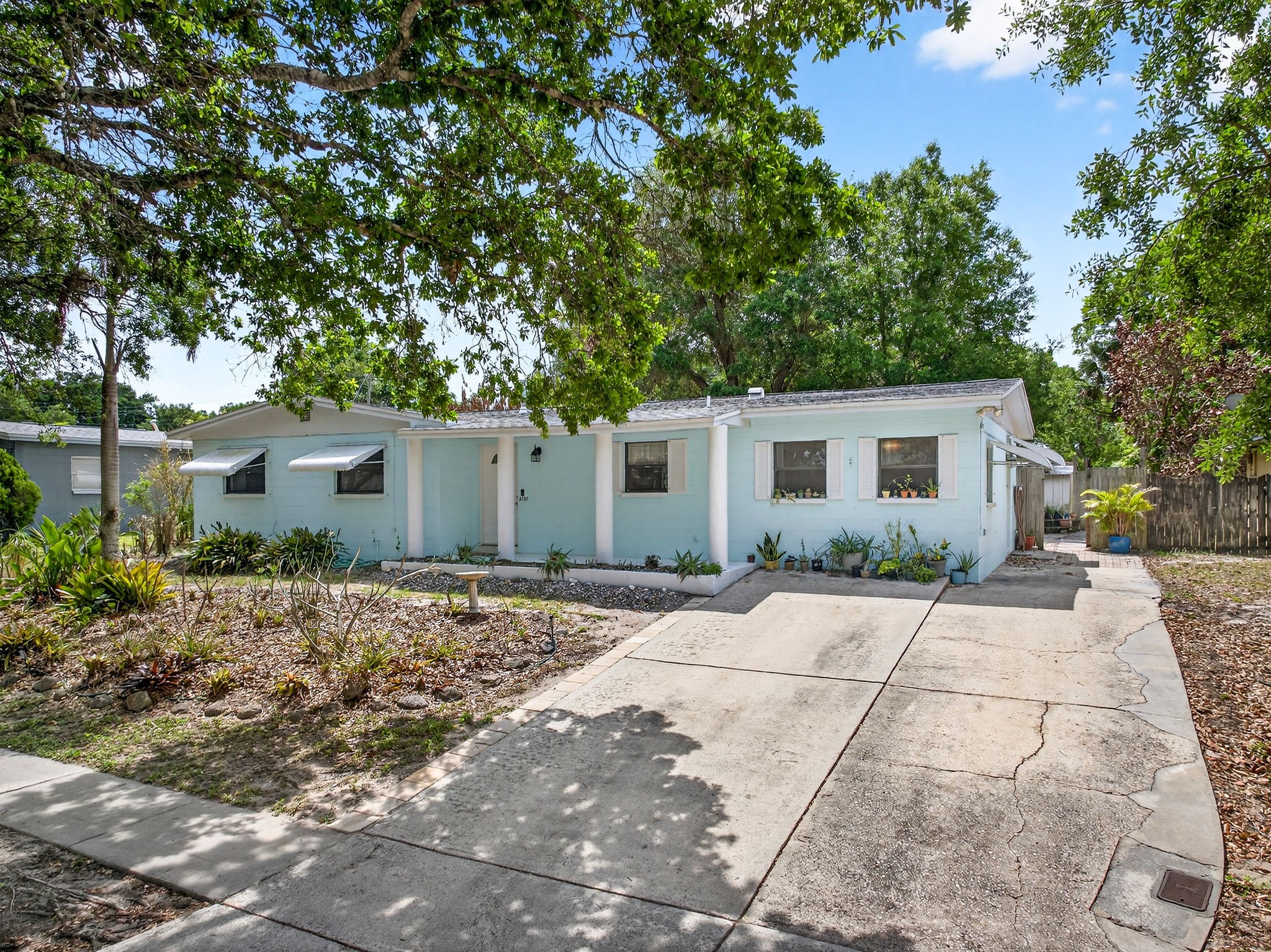 This well-maintained 3-bedroom, 2-bath concrete block home, on nearly a quarter acre, has a stress-free Key West vibe. There is no HOA and no deed restrictions. This fully fenced-in, solid home has many recent upgrades including remodeled bathroom and tiled shower (2017), Corian in both baths (2017), new HVAC (2018), new duct work (2024), new water heater (2023), and new electrical panel with 200 amp, and additional 80 amp outside for a generator. More features include a huge Florida room, granite counters and maple cabinetry, new double oven (2018), roof (2016), and new floors (2018). Gas is available for cooking! There are no carpets. Your own avocado, fig, banana, lichee, and cherry trees are in the backyard! This is a great location, on a quiet street, Within walking distance to Walmart, Aldi, Dollar Tree, and restaurants. Utilities are city water and sewer. It is not in a flood zone. Garage is converted into convenient indoor storage and laundry room; and the shed has electric!