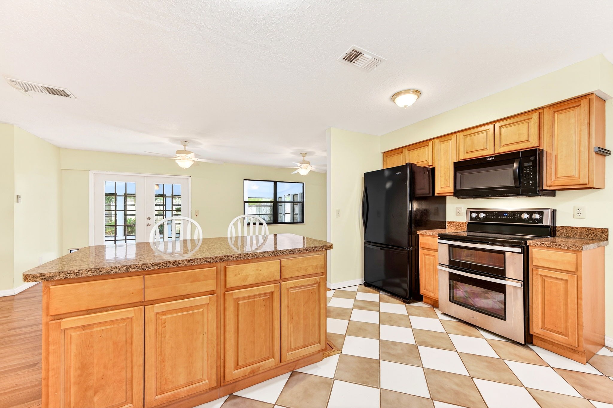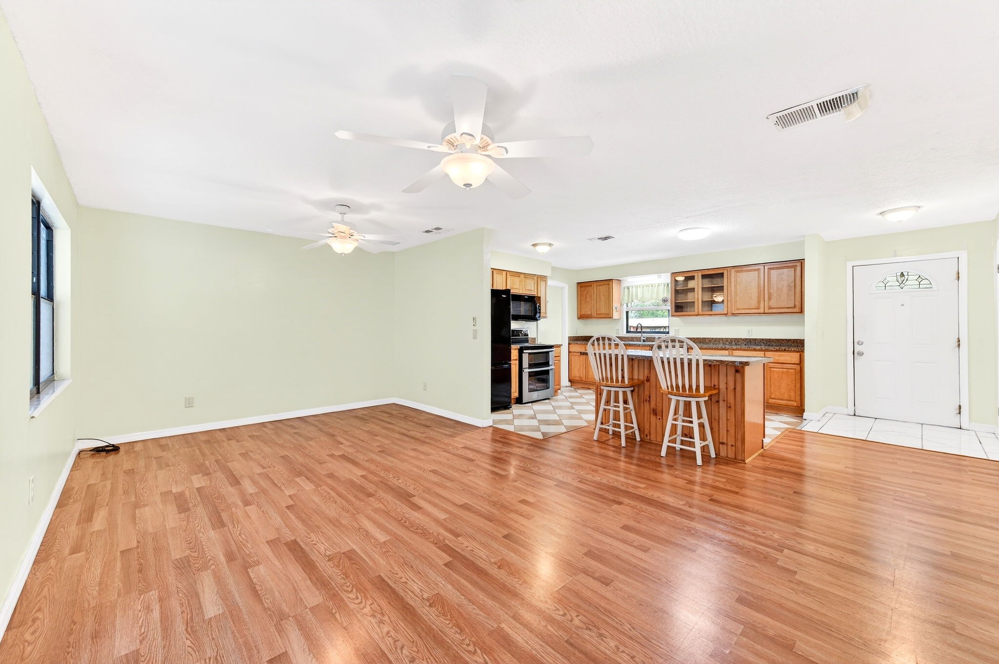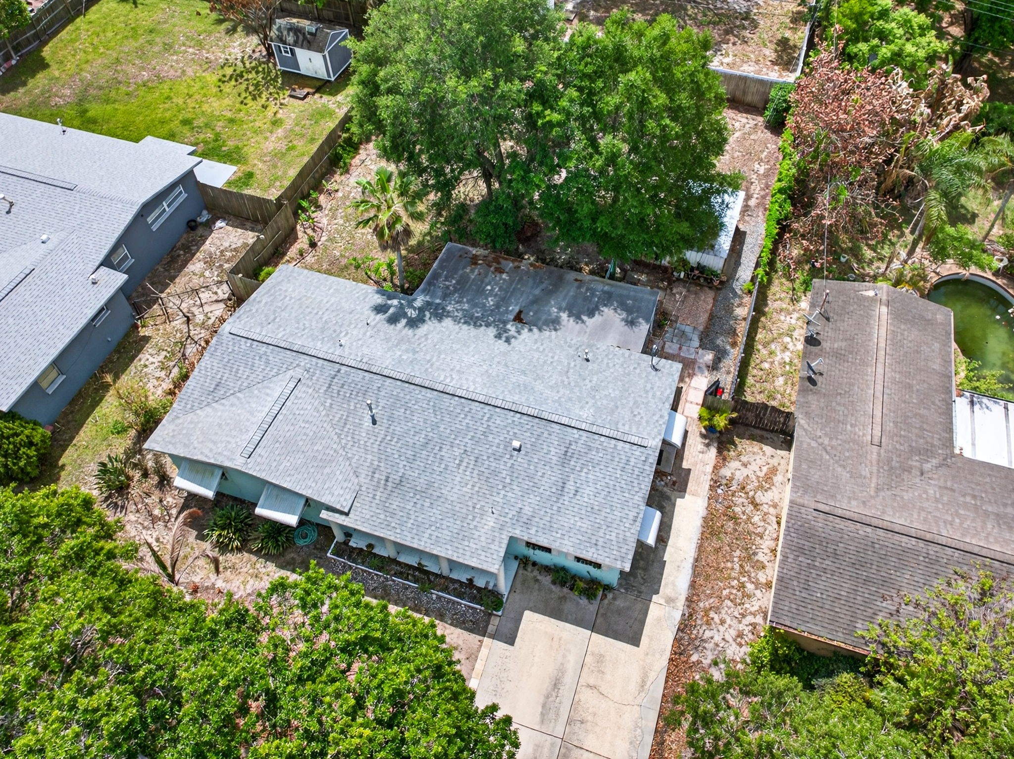 This well-maintained 3-bedroom, 2-bath concrete block home, on nearly a quarter acre, has a stress-free Key West vibe. There is no HOA and no deed restrictions. This fully fenced-in, solid home has many recent upgrades including remodeled bathroom and tiled shower (2017), Corian in both baths (2017), new HVAC (2018), new duct work (2024), new water heater (2023), and new electrical panel with 200 amp, and additional 80 amp outside for a generator. More features include a huge Florida room, granite counters and maple cabinetry, new double oven (2018), roof (2016), and new floors (2018). Gas is available for cooking! There are no carpets. Your own avocado, fig, banana, lichee, and cherry trees are in the backyard! This is a great location, on a quiet street, Within walking distance to Walmart, Aldi, Dollar Tree, and restaurants. Utilities are city water and sewer. It is not in a flood zone. Garage is converted into convenient indoor storage and laundry room; and the shed has electric!