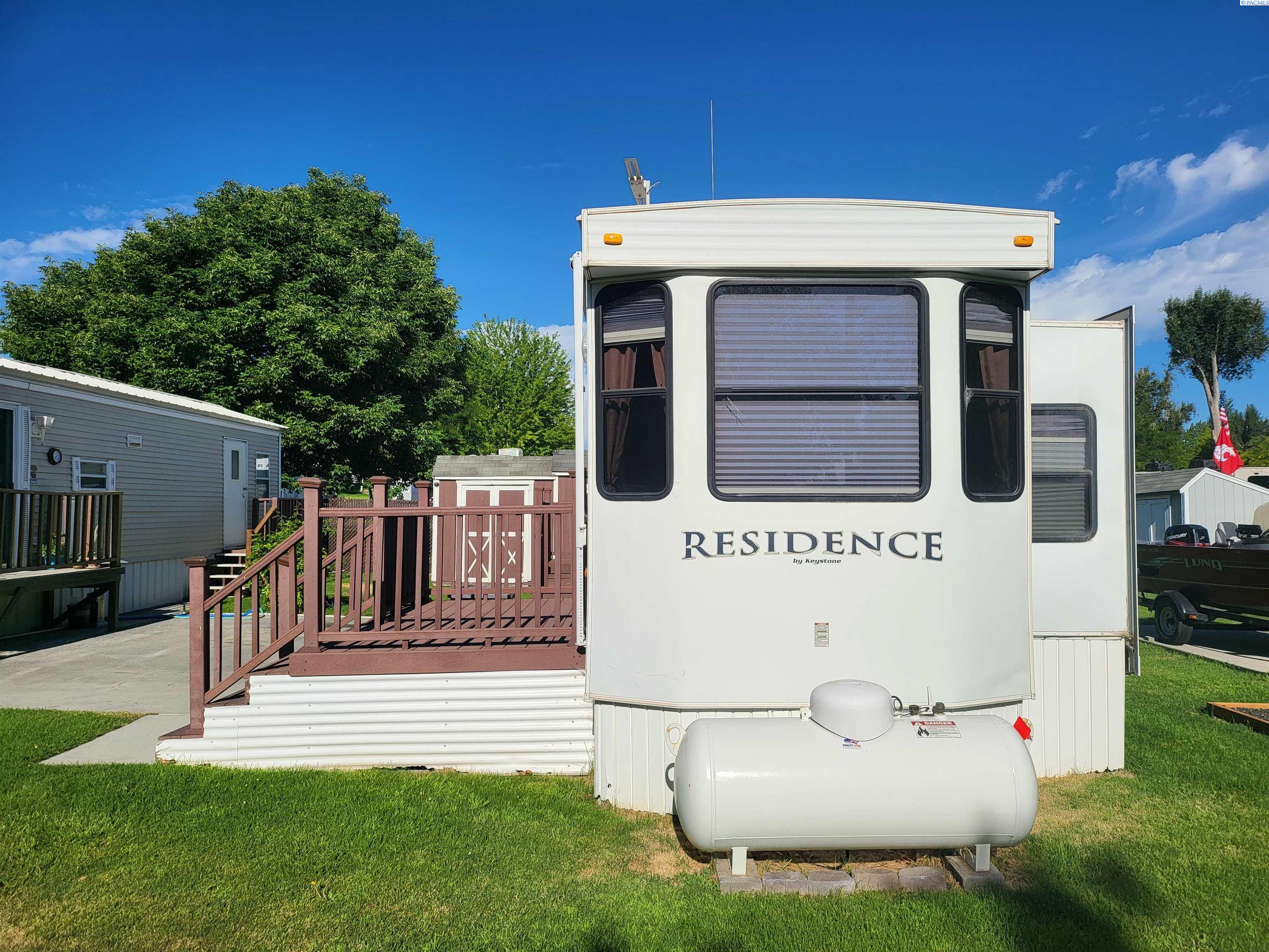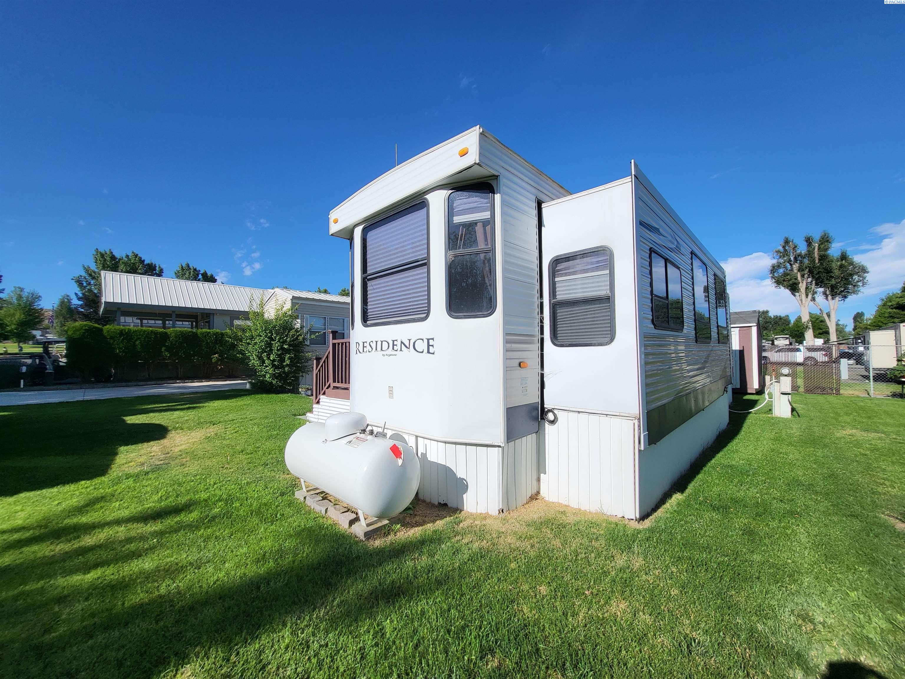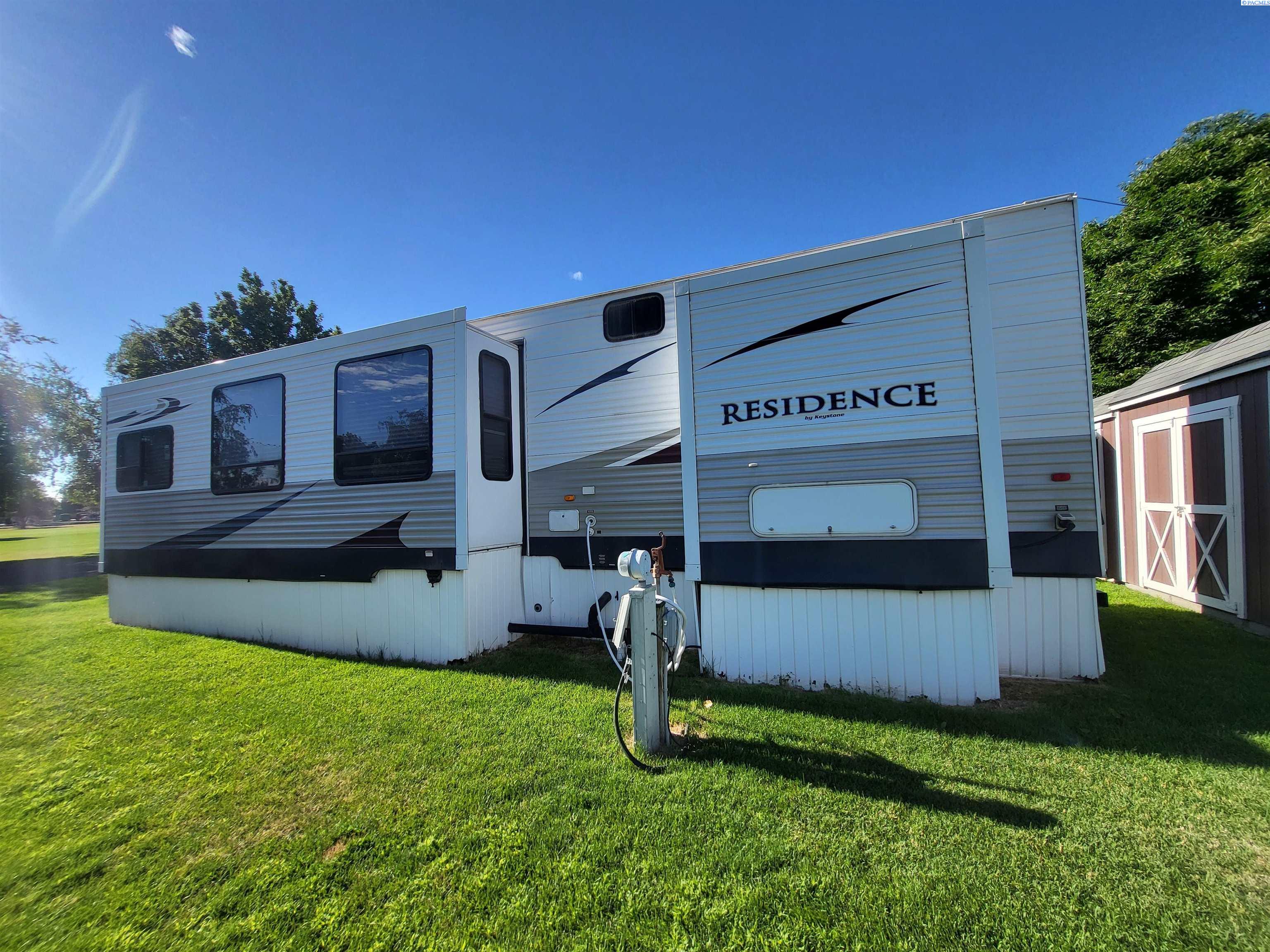 MLS 292025 Enjoy the ultimate recreational retreat or affordable full time living in the highly desirable Potholes Golf and Camping Condominium Community! Just a 2-minute walk to the community clubhouse and restaurant and ideally located right on the beautiful Legacy Golf Course, this well-kept lot and park model offers the perfect blend of relaxation, convenience, and outdoor adventure. Included is a meticulously maintained 2010 Keystone Residence 40 ft park model featuring high ceilings and two slide-outs for added space and comfort. Inside, you'll find a stackable washer and dryer, electric fireplace, propane furnace, and central vacuum system. Fiber optics internet, electric fireplace and gas/electric water heater ensures year-round enjoyment and comfort. Bedroom includes an incredibly comfortable king size bed and closet storage. Step outside to enjoy a low-maintenance Trex deck, a covered awning, a cozy patio area, and three storage sheds, plenty of room for gear, golf clubs, and lake toys. With full utilities, including water, sewer, and garbage covered by a low $500/year HOA fee, and electricity billed quarterly by the HOA, this lot is ready for year-round or seasonal enjoyment at a VERY low cost. Situated just 1 minute from Potholes State Park and boat launch, you'll have easy access to fishing, boating, and lakeside recreation. Whether you're a snowbird, weekend warrior, golf lover, traveler who needs a hub, or tired of high cost living, this slice of paradise is just for you! Seller will NOT lease or rent unit.