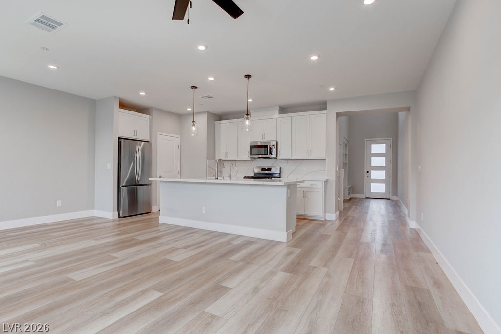 Nearly new in Summerlin West, this spacious two-story townhome has two primary suites and 2.5 baths plus a big loft that has built-in shelves and desk, perfect for office or study. Gorgeous kitchen with an island, Quartz countertops and full quartz backsplash. An abundance of deluxe Shaker cabinets and top of the line S.S. appliances--all overlooking the spacious great room with sliding glass doors to the backyard. Spacious primary suites, one with a private balcony overlooking the common area, generous walk-in closets, Luxury bathroom with dual-sinks and a large walk-in shower. Separate laundry room with upgraded washer and dryer and built-in shelving. Attached two car garage. Community pool and dog park plus outdoor exercise area. Home backs up to the common area. Minutes from Downtown Summerlin, Red Rock hotel/casino, Red Rock canyon and so many nice restaurants and shopping! Great access to the 215 too!
