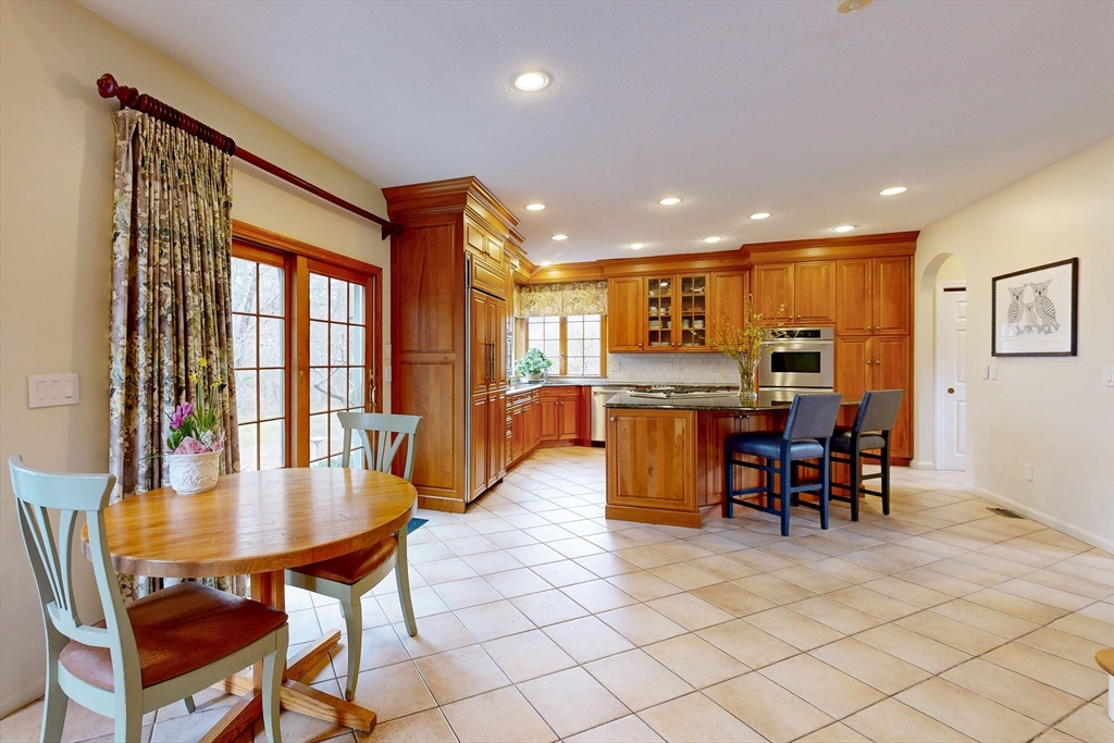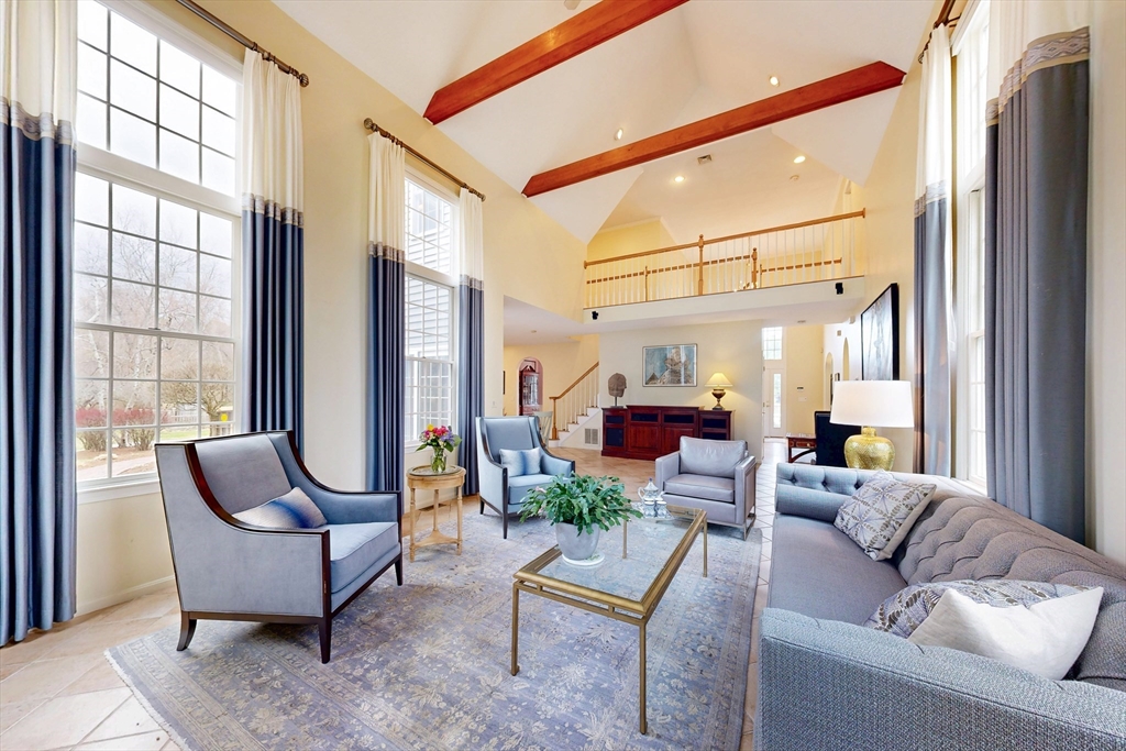 Situated on 3+ acres abutting conservation land, this exceptional home is set on a quiet cul-de-sac, overlooking a beautiful, landscaped yard. Architecturally designed with remarkable detail, the home showcases repeating archways, two staircases, and fabulous millwork. The professional grade chef's kitchen is a true centerpiece, featuring high-end cabinetry, large island, Thermador and Subzero appliances. The dramatic living room offers soaring ceilings and a striking gas fireplace. The family room and dining room provide welcoming spaces for gatherings. Included on the first floor is a private office with mahogany built-ins. Upstairs, the luxurious primary suite includes a spa-like bath and dressing room. There are three more spacious bedrooms, lovely hall bath, and large great room with full bath. The expansive finished basement offers endless potential for a playroom & gym. Extensive upgrade list includes a whole house generator and car charger. Truly the pride of ownership.