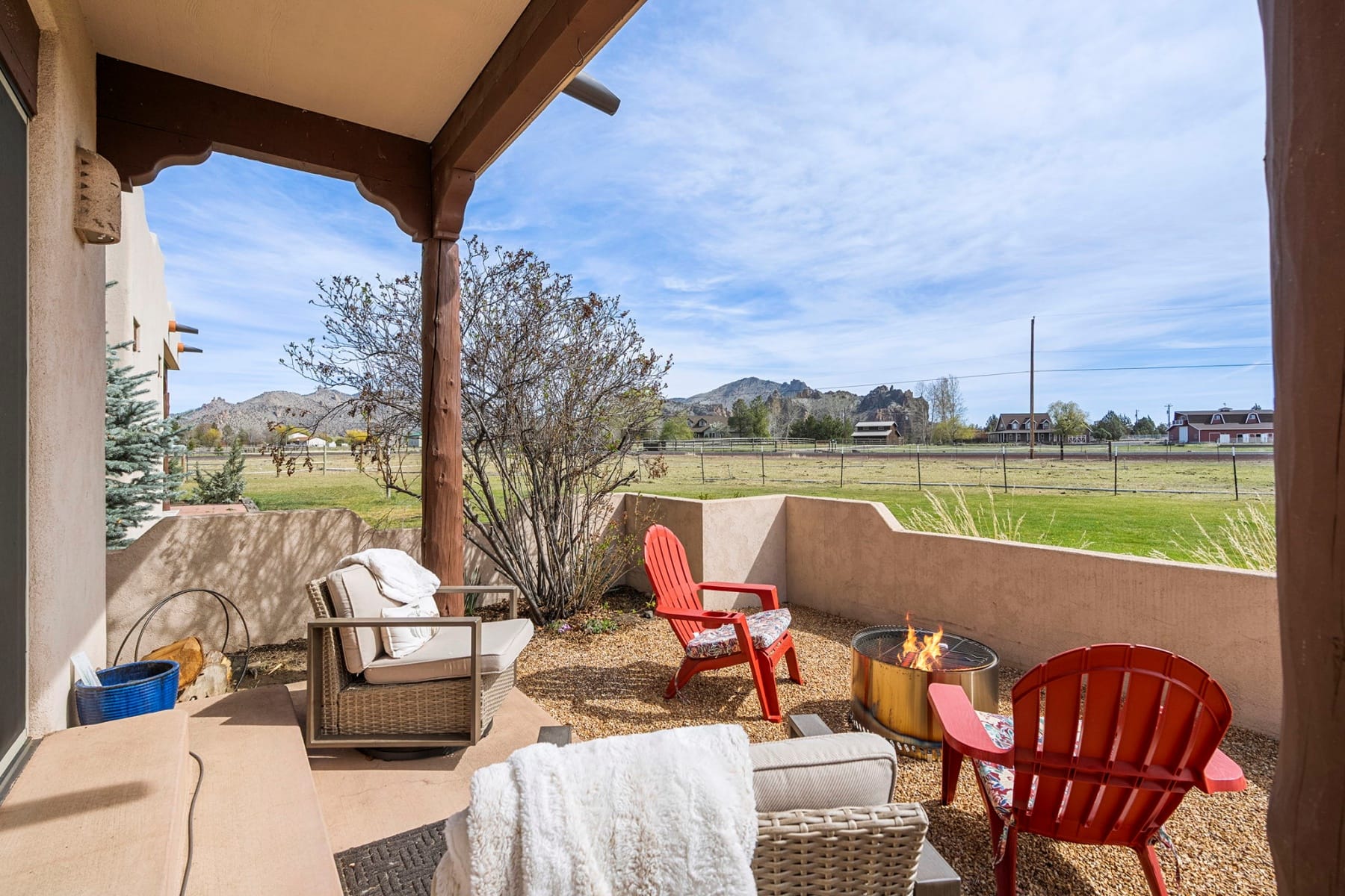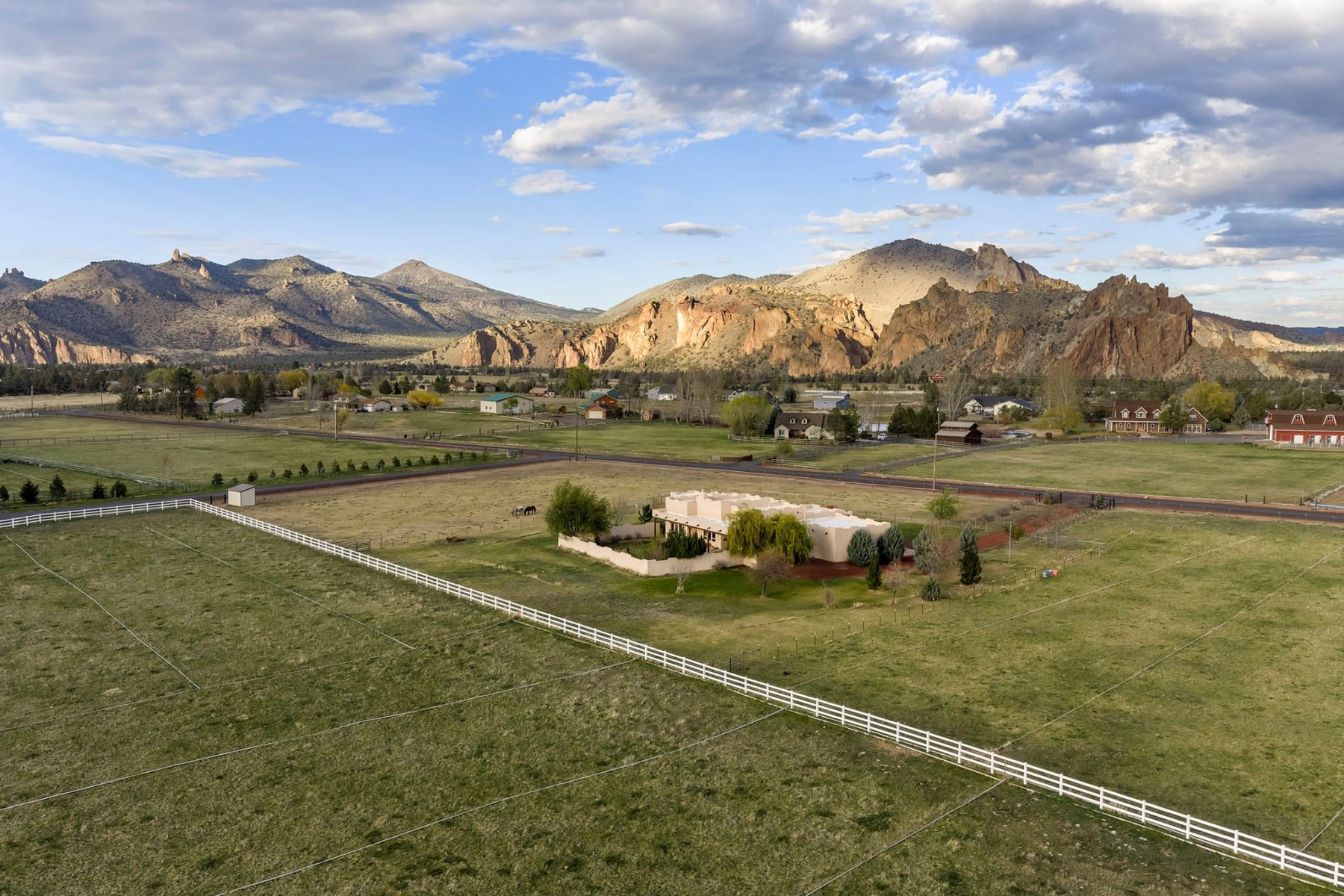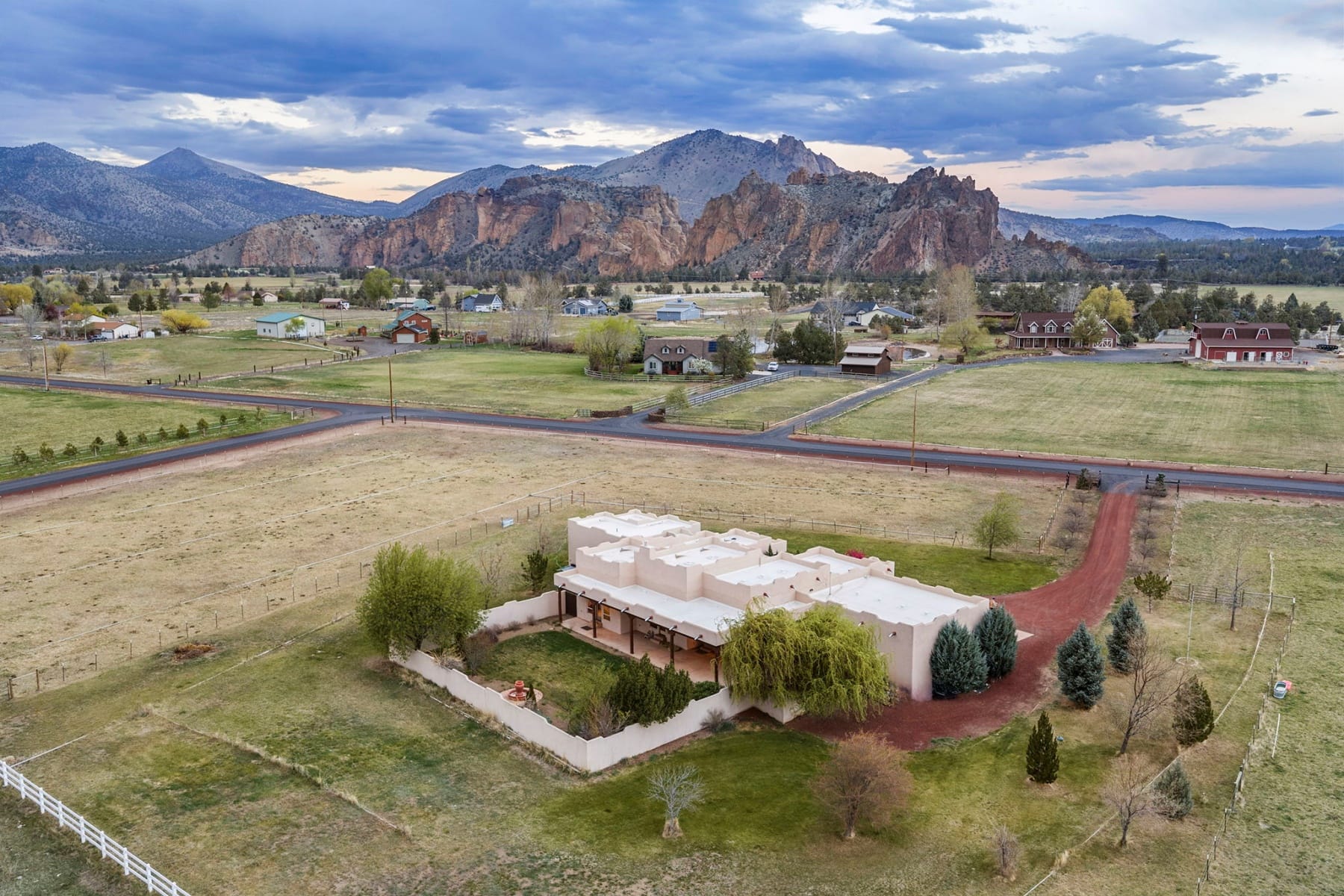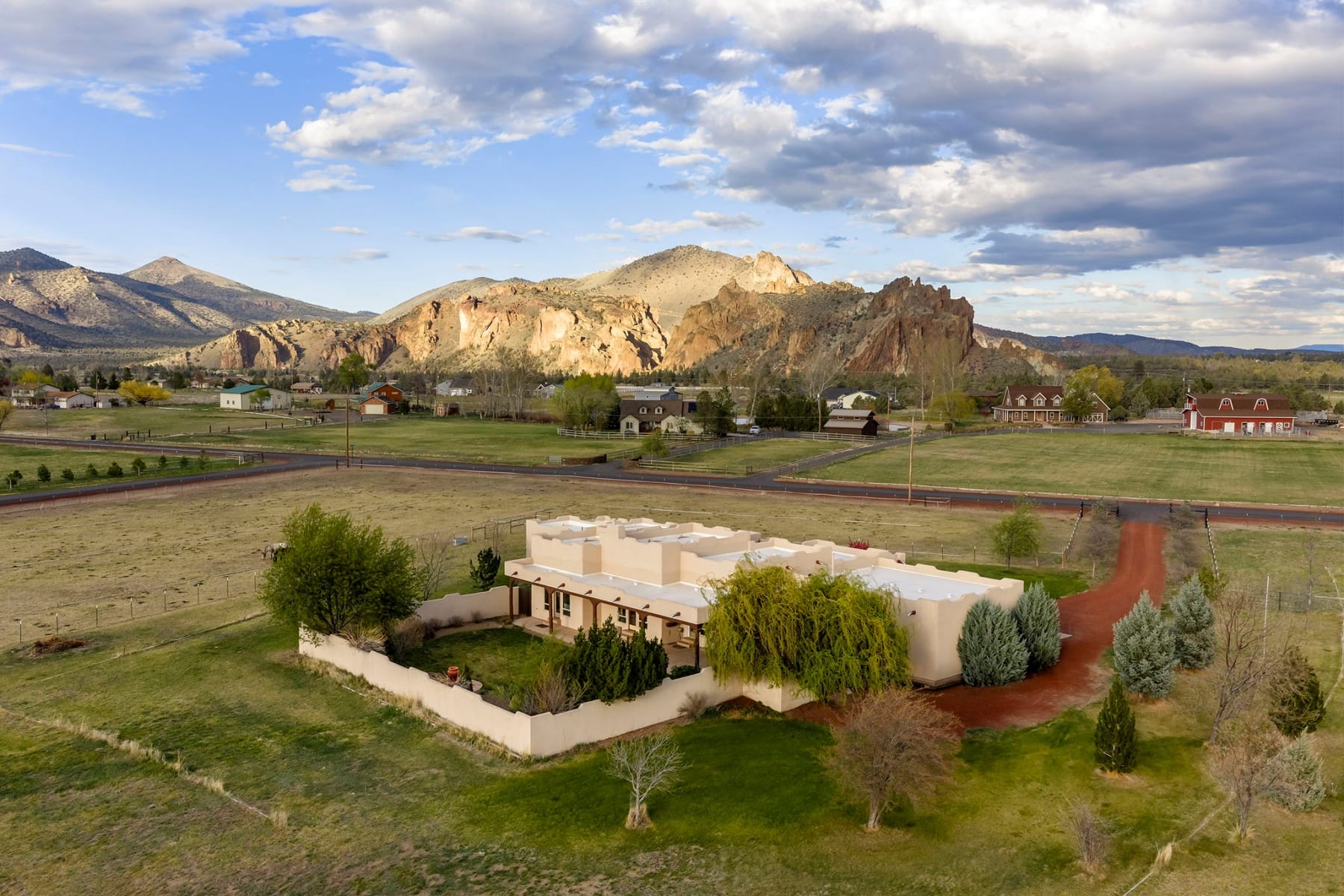 Stunning single-level Southwestern-style home in Harris Estates, ideally positioned adjacent to Smith Rock State Park, w/ breathtaking views of Smith Rock & the Cascade Mountains. This one-of-a-kind property features a private 732 SF attached casita w/ proven Airbnb income, offering excellent flexibility for guests or investment potential. The whole home showcases soaring ceilings, exposed wood beam detail, solid wood doors & trim, travertine floors & counters, wood floors & generous storage. Thoughtful floor plan provides excellent bdrm separation (all en-suites) & comfortable living spaces. Enjoy multiple covered & enclosed patios designed to take full advantage of the incredible Central Oregon scenery. Situated on 5.18 acres w/ over 4 acres of irrigation, fenced & ideal for horses, livestock, or hobby farming, w/ detached shop/barn. Recent updates incl new roof, stucco, & fencing. Rare opportunity to own a truly special property in an unbeatable location near world-class recreation.