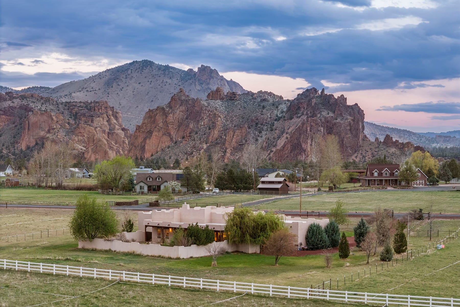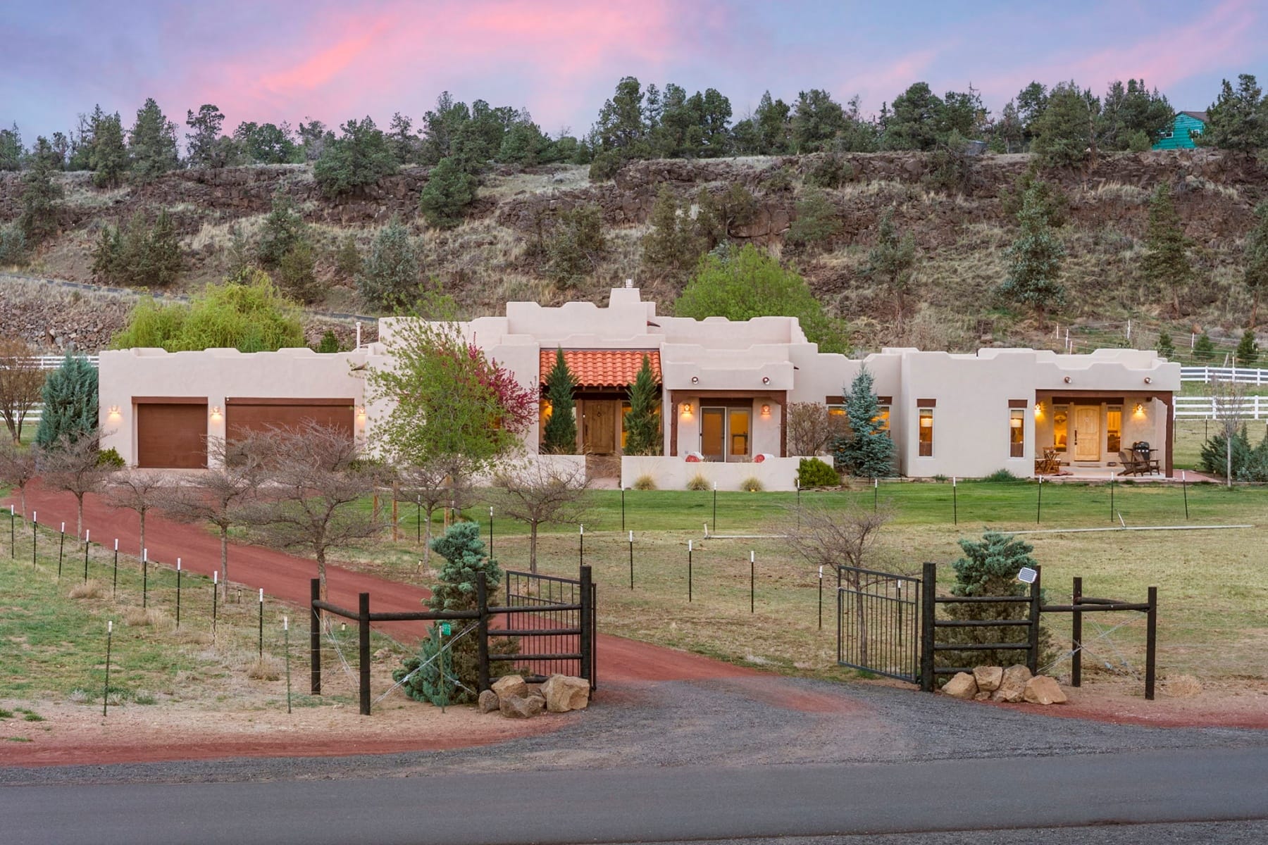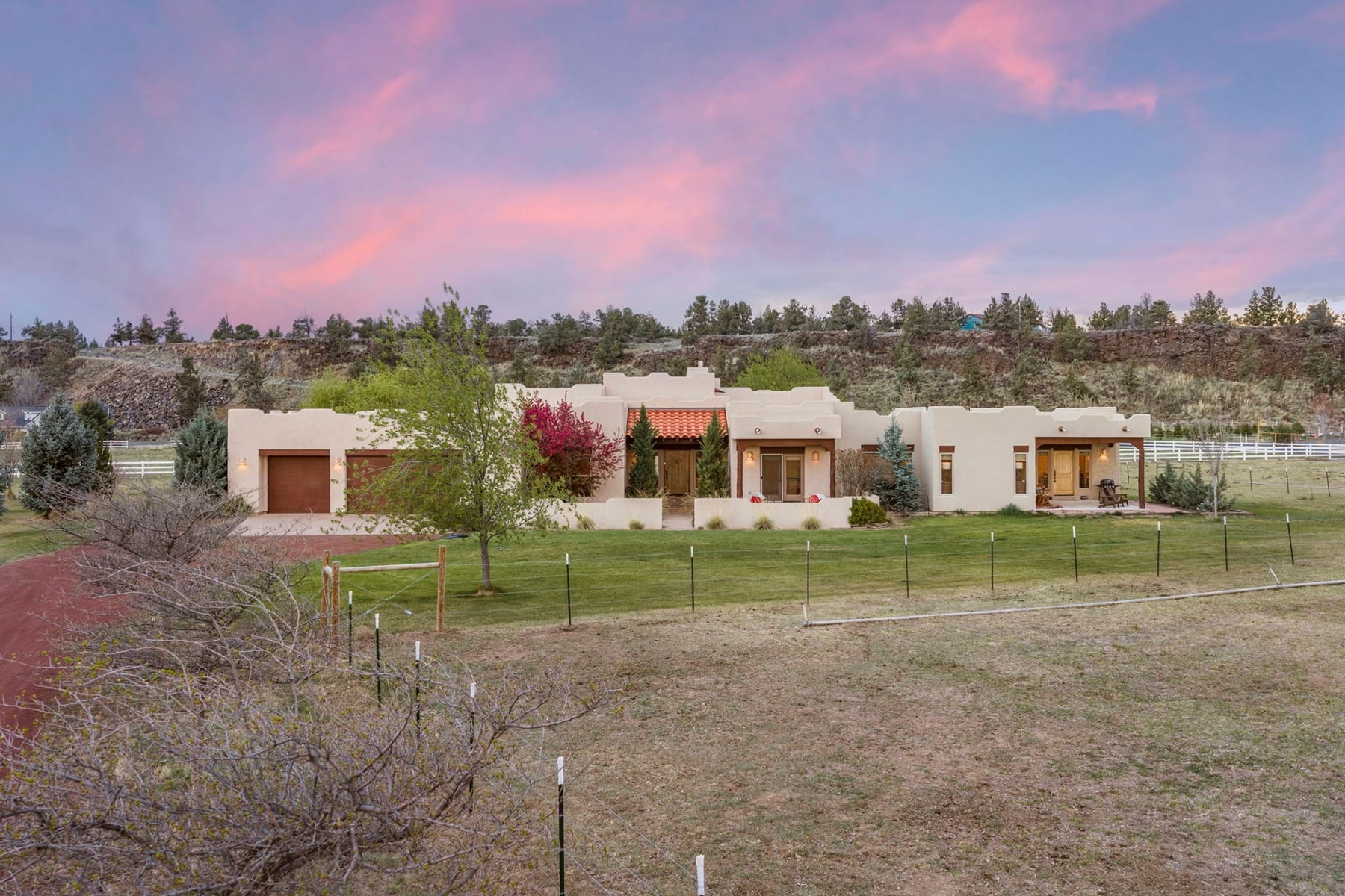 Stunning single-level Southwestern-style home in Harris Estates, ideally positioned adjacent to Smith Rock State Park, w/ breathtaking views of Smith Rock & the Cascade Mountains. This one-of-a-kind property features a private 732 SF attached casita w/ proven Airbnb income, offering excellent flexibility for guests or investment potential. The whole home showcases soaring ceilings, exposed wood beam detail, solid wood doors & trim, travertine floors & counters, wood floors & generous storage. Thoughtful floor plan provides excellent bdrm separation (all en-suites) & comfortable living spaces. Enjoy multiple covered & enclosed patios designed to take full advantage of the incredible Central Oregon scenery. Situated on 5.18 acres w/ over 4 acres of irrigation, fenced & ideal for horses, livestock, or hobby farming, w/ detached shop/barn. Recent updates incl new roof, stucco, & fencing. Rare opportunity to own a truly special property in an unbeatable location near world-class recreation.