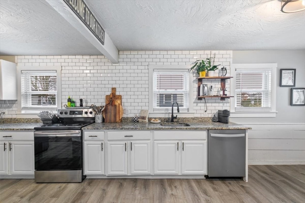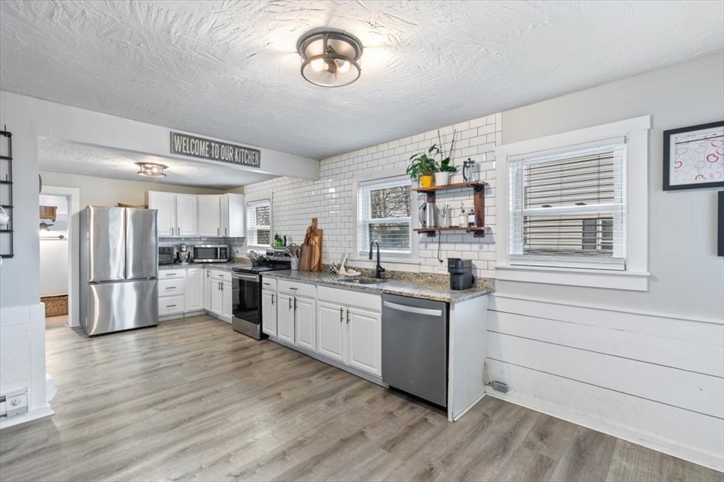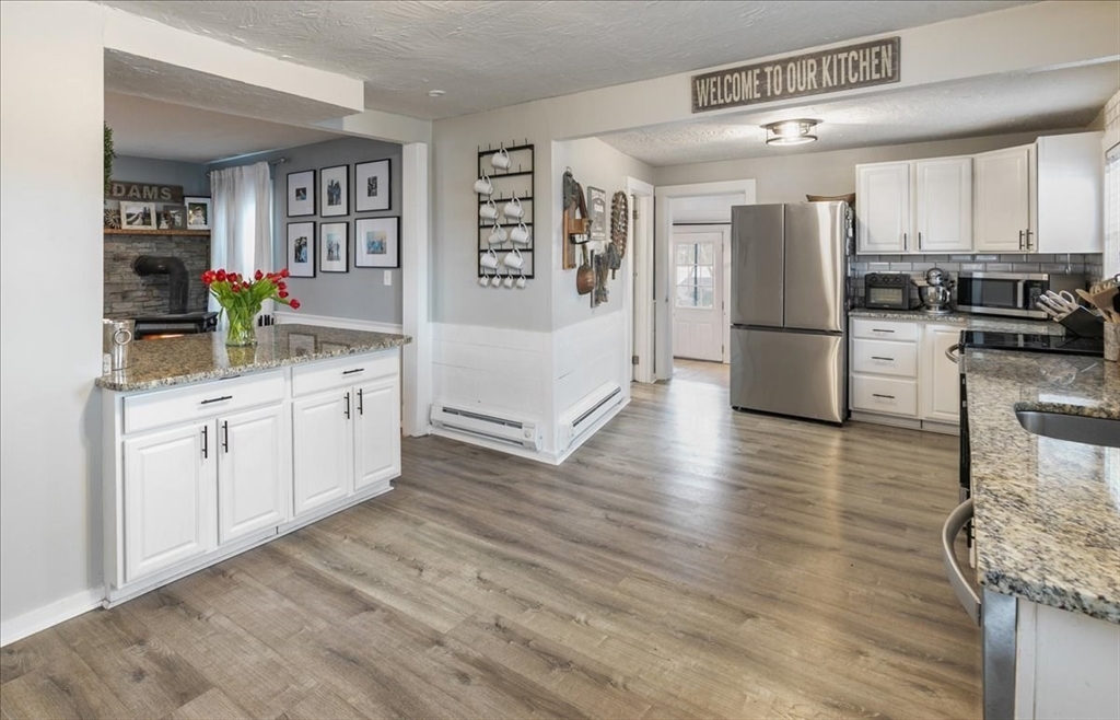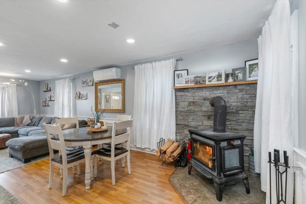This lovingly cared for 3 bed home offers a warm & comfortable feel from the moment you step inside. The inviting living room is the heart of the home, featuring recessed lighting, easy-care flooring, a cozy wood stove for chilly evenings, & a mini split providing both heat & A/C for year round comfort. The kitchen has been thoughtfully updated with granite countertops, a classic subway tile backsplash, & open shelving that adds both charm & function. A full bath with tile & granite, along with a convenient 1st floor laundry area complete with pantry space & direct access to the yard, make everyday living easy. Each bedroom offers hardwood flooring, including one with a walk-in closet, creating peaceful spaces to unwind. Step outside to enjoy the deck overlooking a fenced yard. Perfect for relaxing & entertaining. Solar panels will help keep electric costs low, Mass Save insulation, and a 200-amp electrical panel this is a truly special home that is ready to welcome its next chapter.