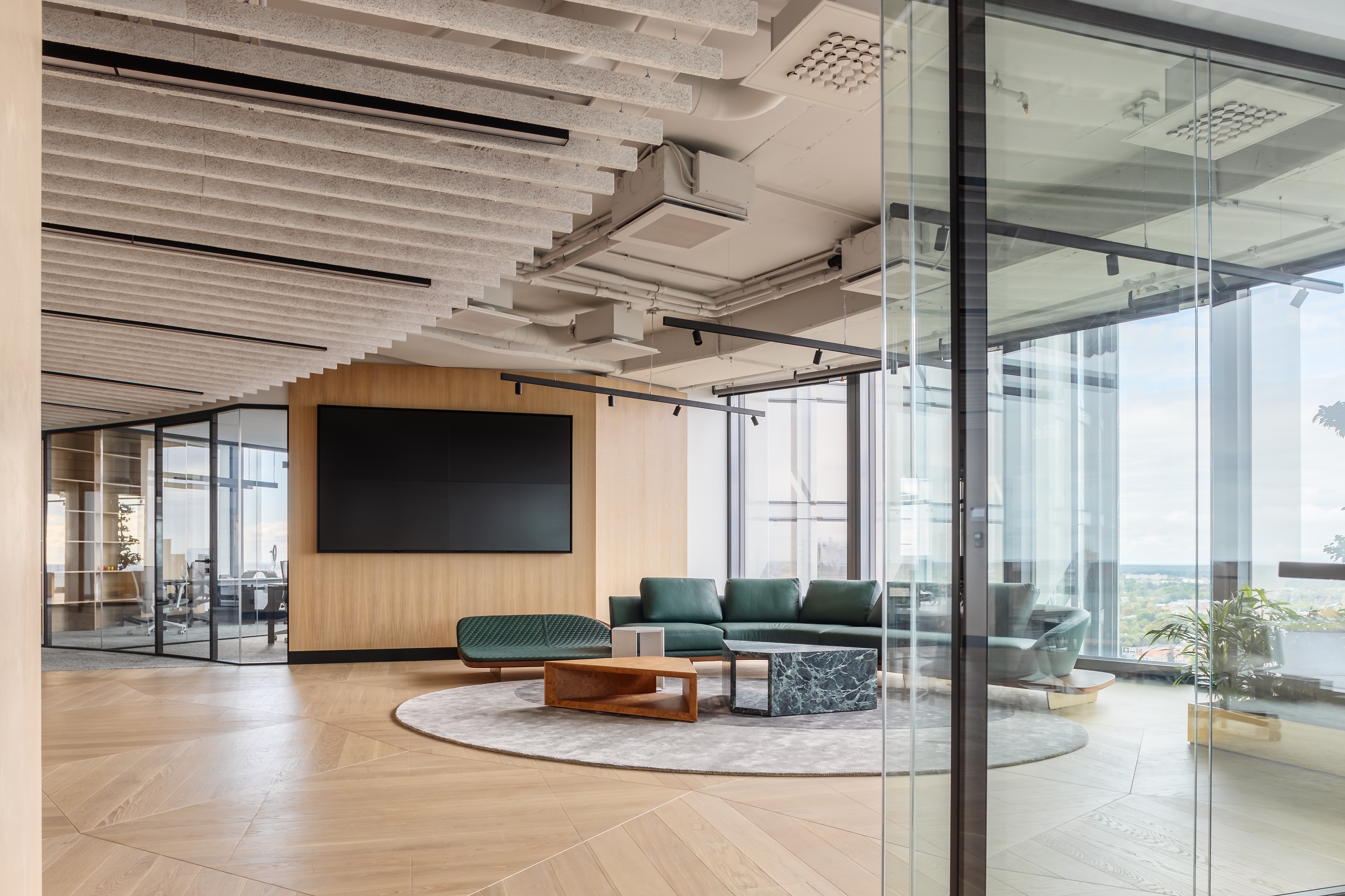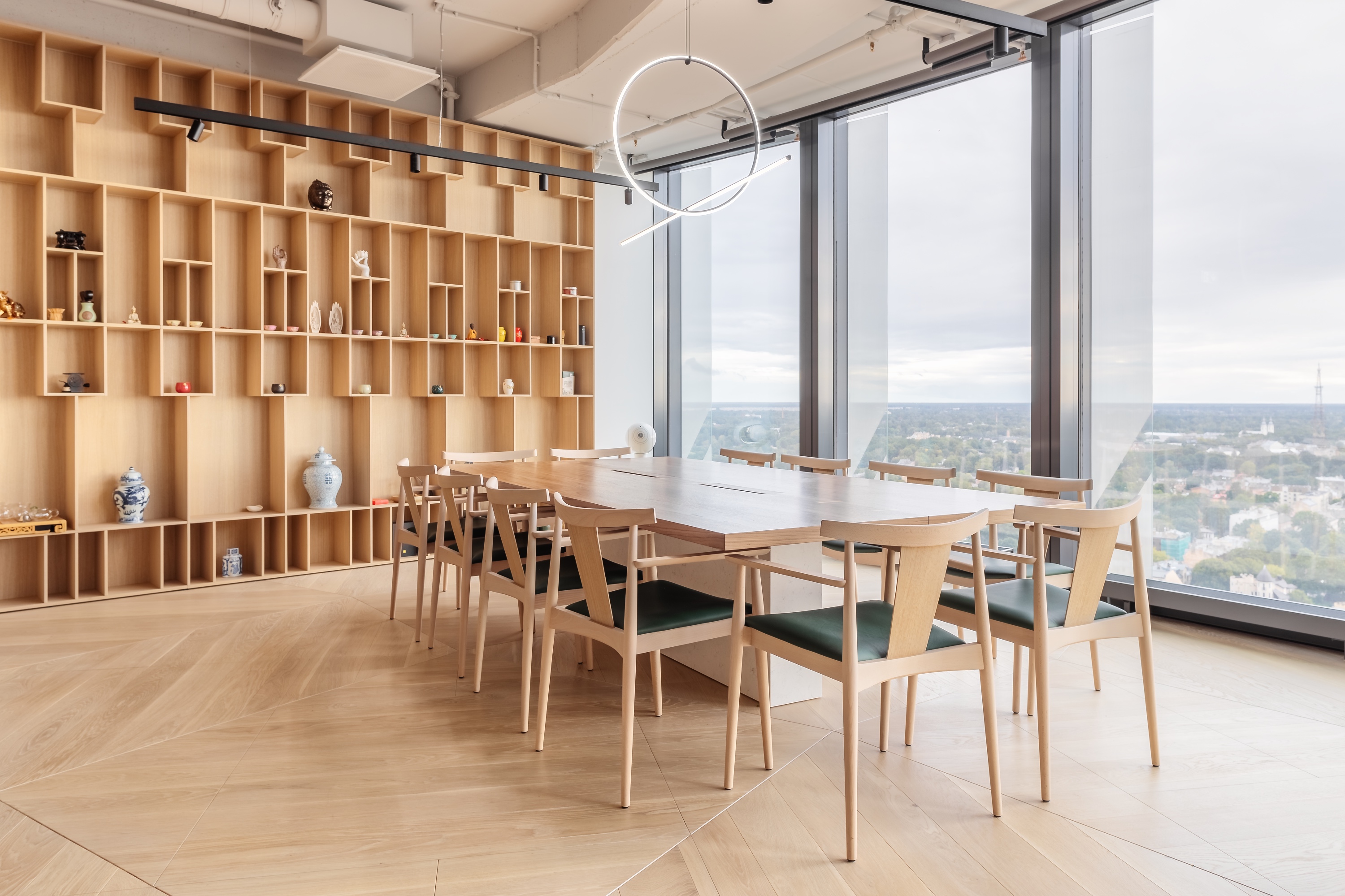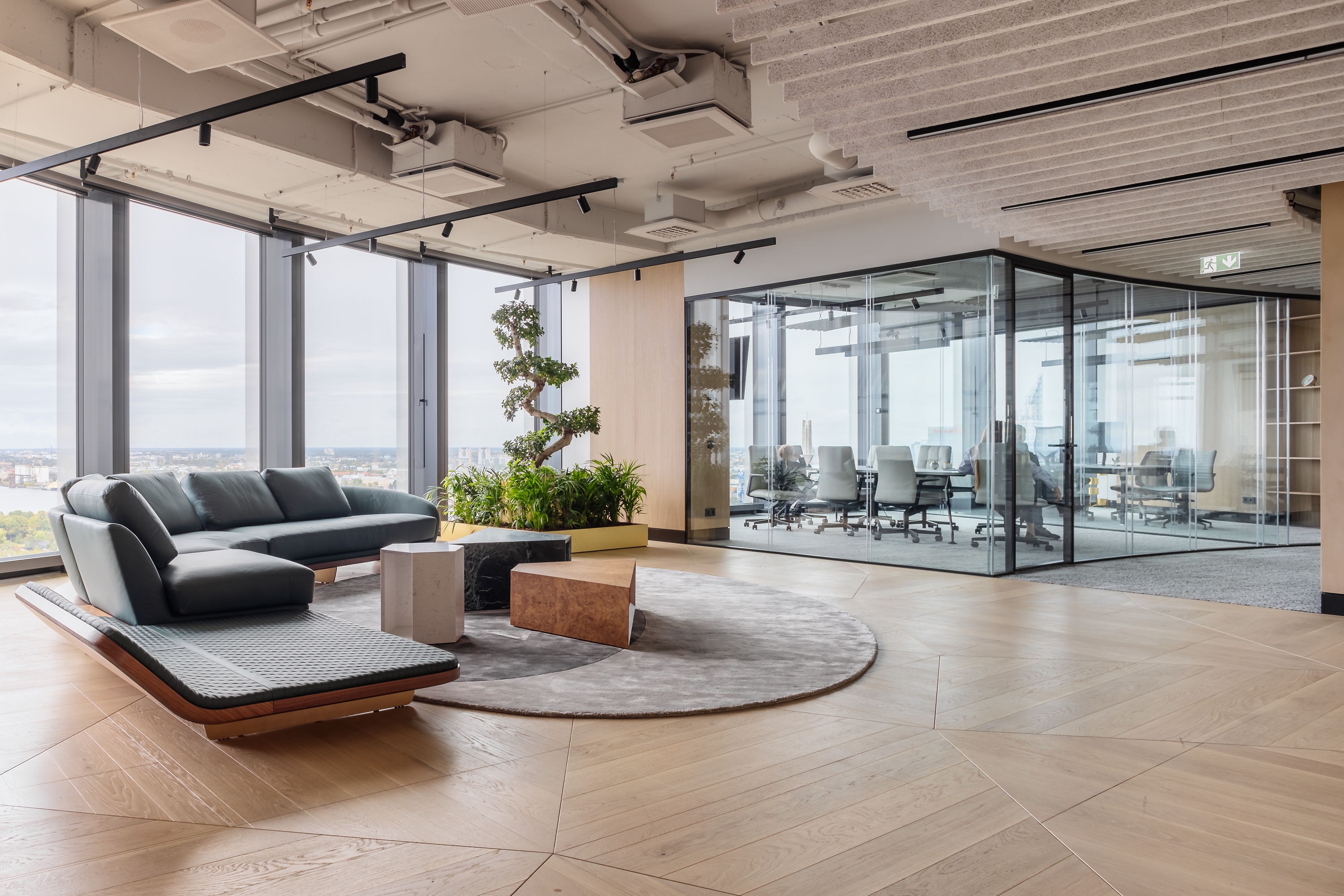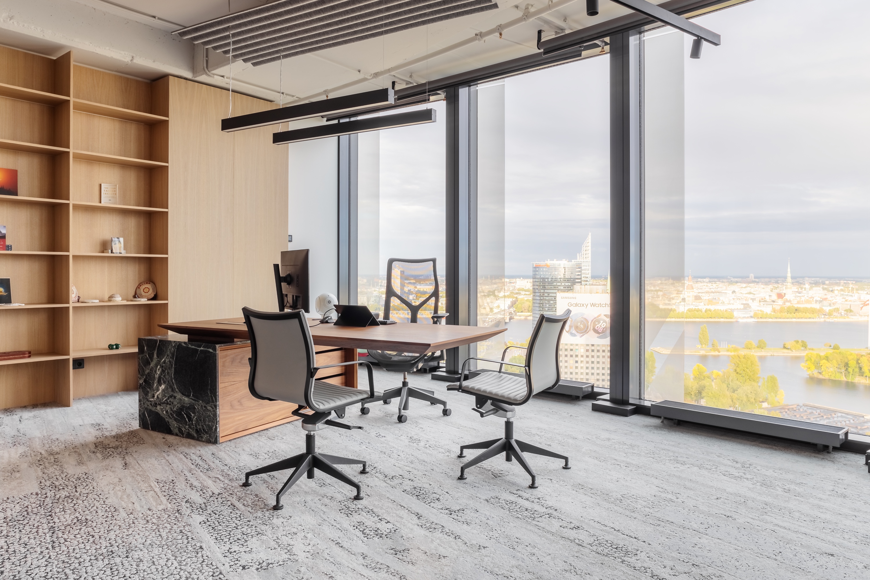 We offer fully fitted office premises for lease in the Zunda Towers project! One of the tallest building complexes in the Baltics and the first multifunctional development in Latvia, Zunda Towers comprises residential apartments, office spaces, a Podium leisure area, venues for social events and conferences, as well as a four-level underground parking facility. The complex was designed by renowned architect Andis Sīlis. Zunda Towers is located in Riga, on the left bank of the Daugava River — where the dynamic energy of a 21st-century metropolis meets the history and traditions of an 800-year-old European capital. The office space, with a total area of 796.7 sqm, is situated on the 20th floor and occupies the entire level, ensuring maximum privacy, a prestigious working environment, and impressive panoramic views over the Daugava River, Old Town, Āgenskalns, and the city center. The premises are fully equipped and ready for immediate occupancy. The interior features high-quality furniture and design elements from brands such as Herman Miller, Andreu World, Walter Knoll, Pininfarina for Reflex, and de Sede, along with bespoke-made furniture, ensuring both comfort and refined aesthetics. The office layout is thoughtfully designed, offering a variety of workspaces — from quiet private offices to open collaboration and lounge areas, as well as a custom-built amphitheatre for presentations and team events. Excellent sound insulation is ensured throughout, while floor-to-ceiling windows provide a sense of openness and abundant natural light. Tenants benefit from all advantages of the Zunda Towers complex, including a prestigious environment, modern infrastructure, 24/7 security, on-site restaurants, and underground parking with electric vehicle charging stations. The office is suitable for a wide range of businesses, including IT, finance, creative industries, and international companies that value quality, comfort, and a representative setting. Design team: Zane Tetere-Sulce, Kristaps Sulcs, Linda Balode, Girts Kula, Olga Ponomarjova, Maria Gembitskaya Photos: Alvis Rozenbergs