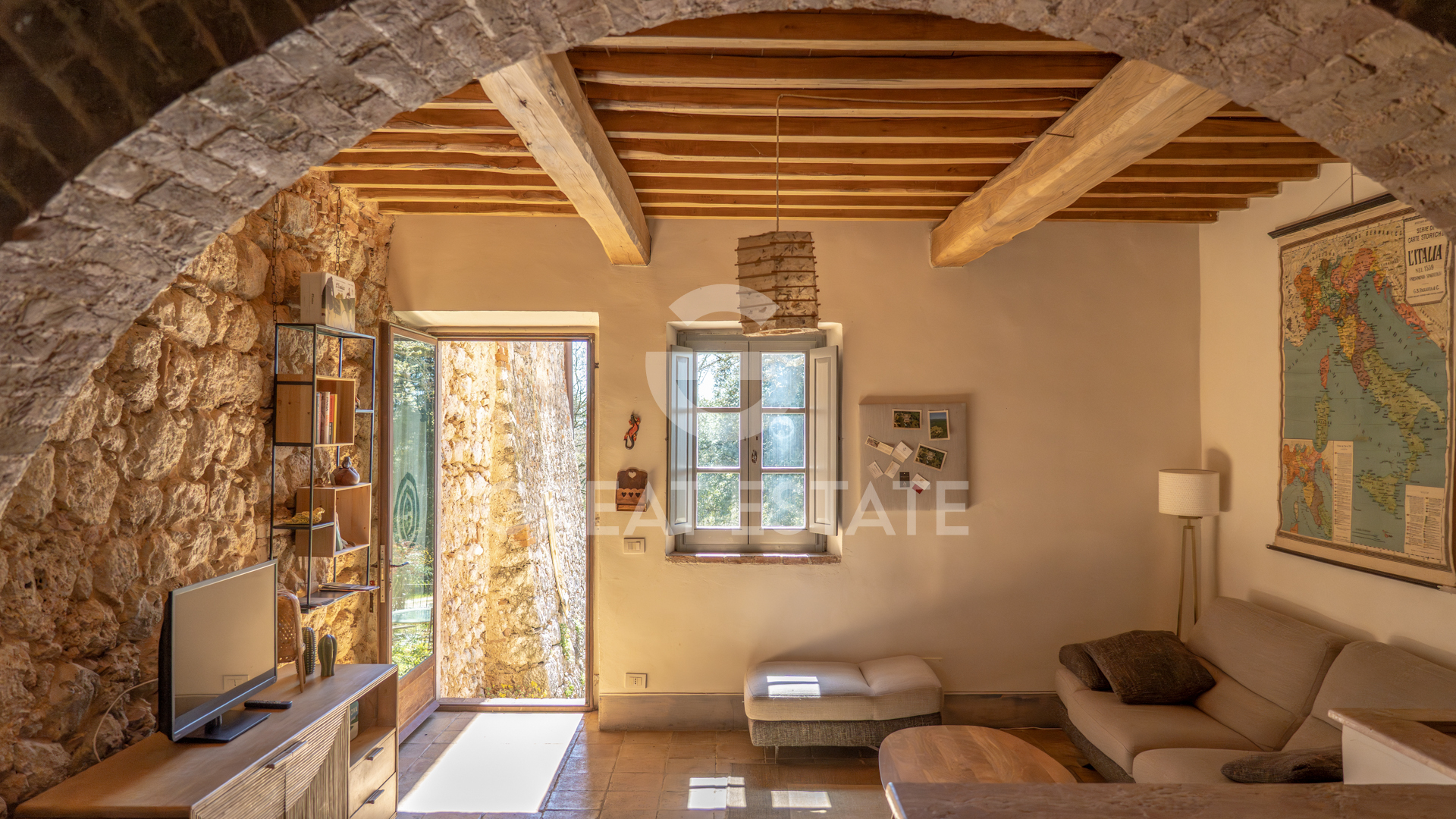 The farmhouse has preserved its historic charm intact, enhanced by fine finishes such as exposed stone, parquet flooring, and ceilings with wooden beams, typical of authentic Tuscan residences. All window and door frames have been completely replaced and crafted in cypress wood with double glazing, ensuring a perfect balance between traditional aesthetics and modern living comfort.