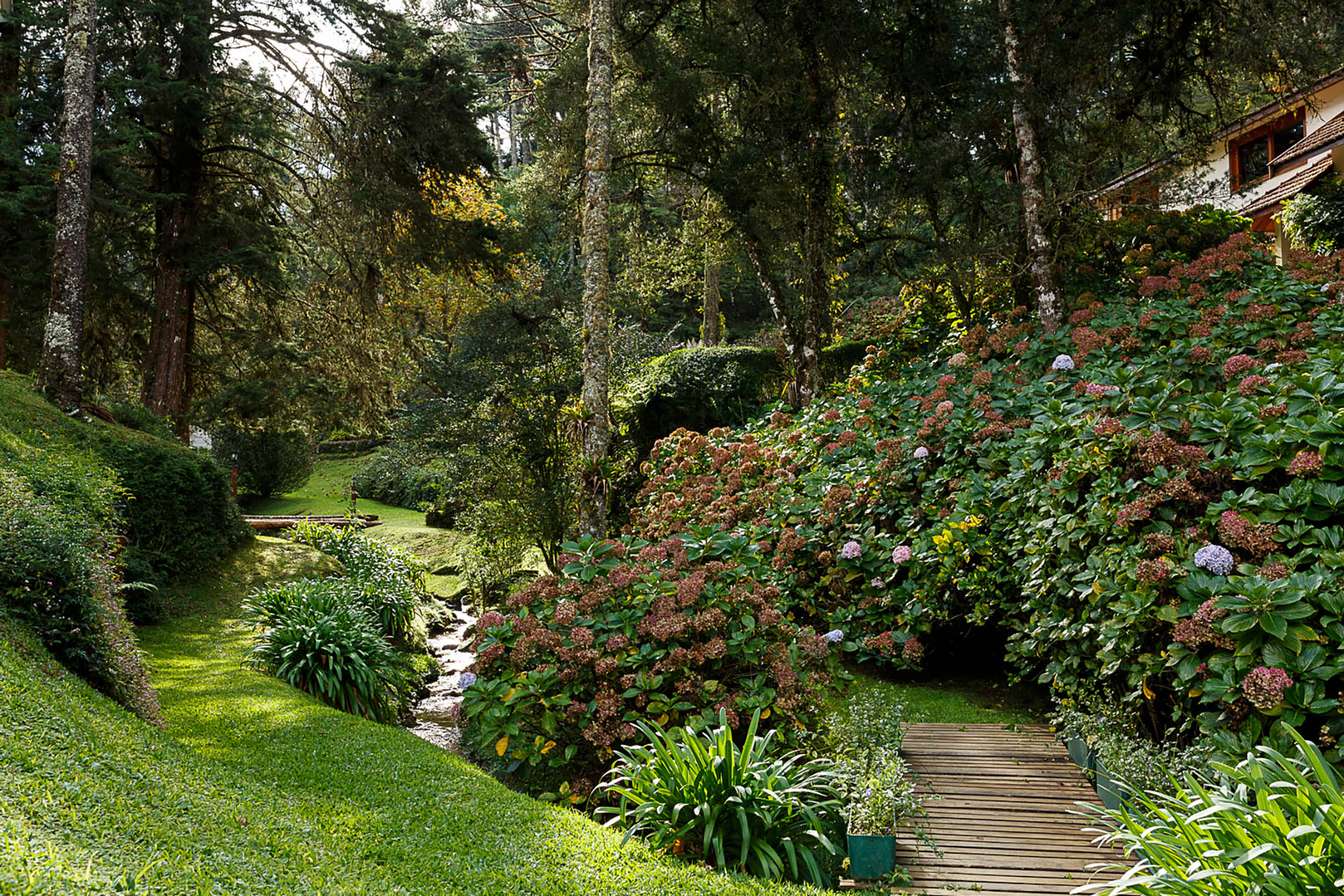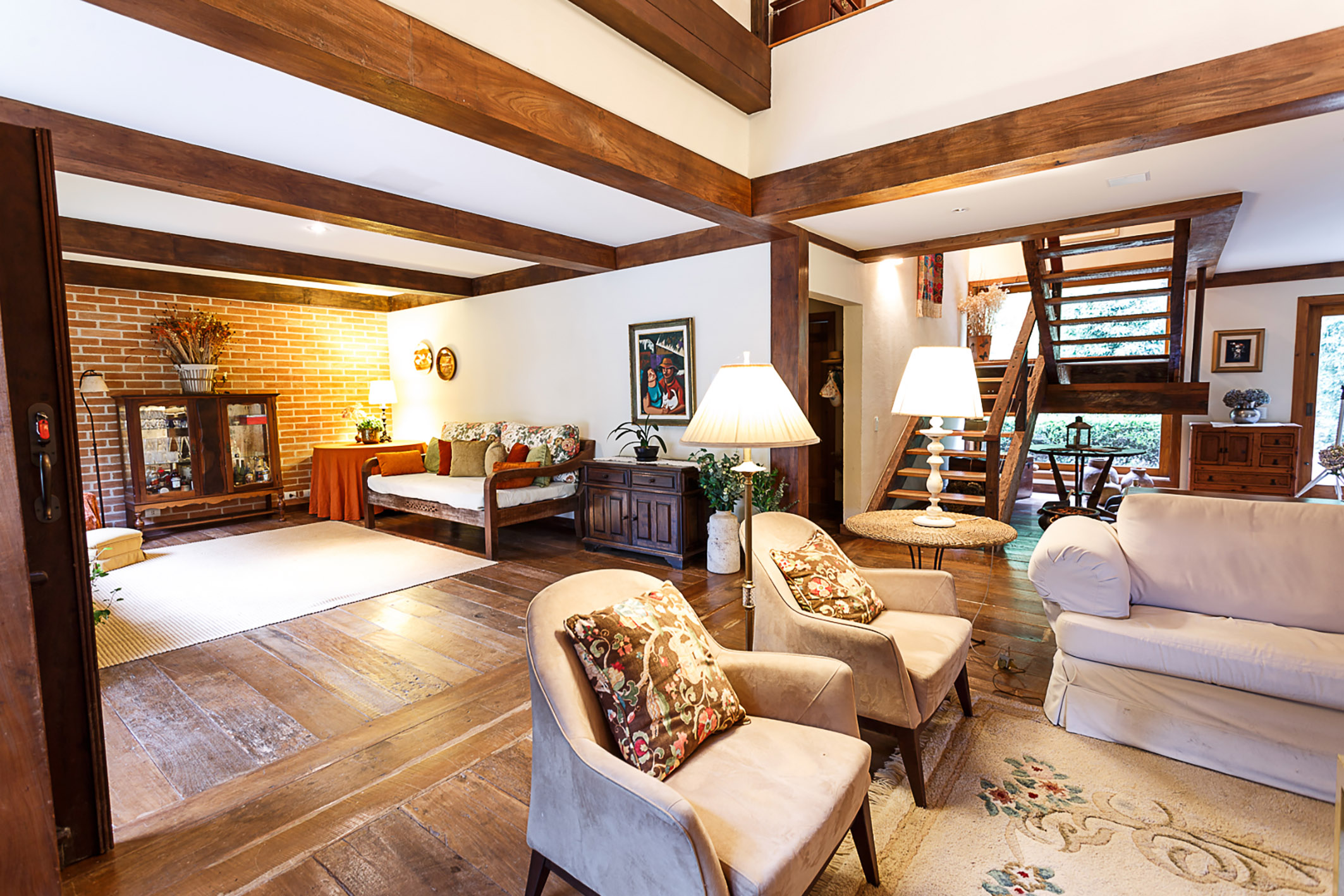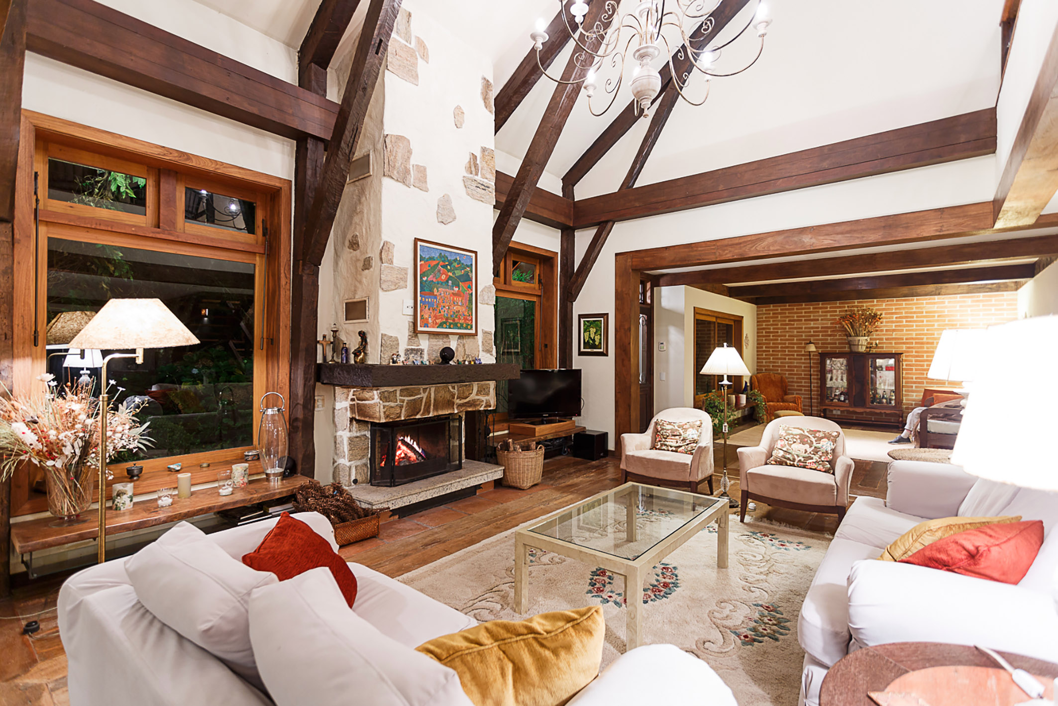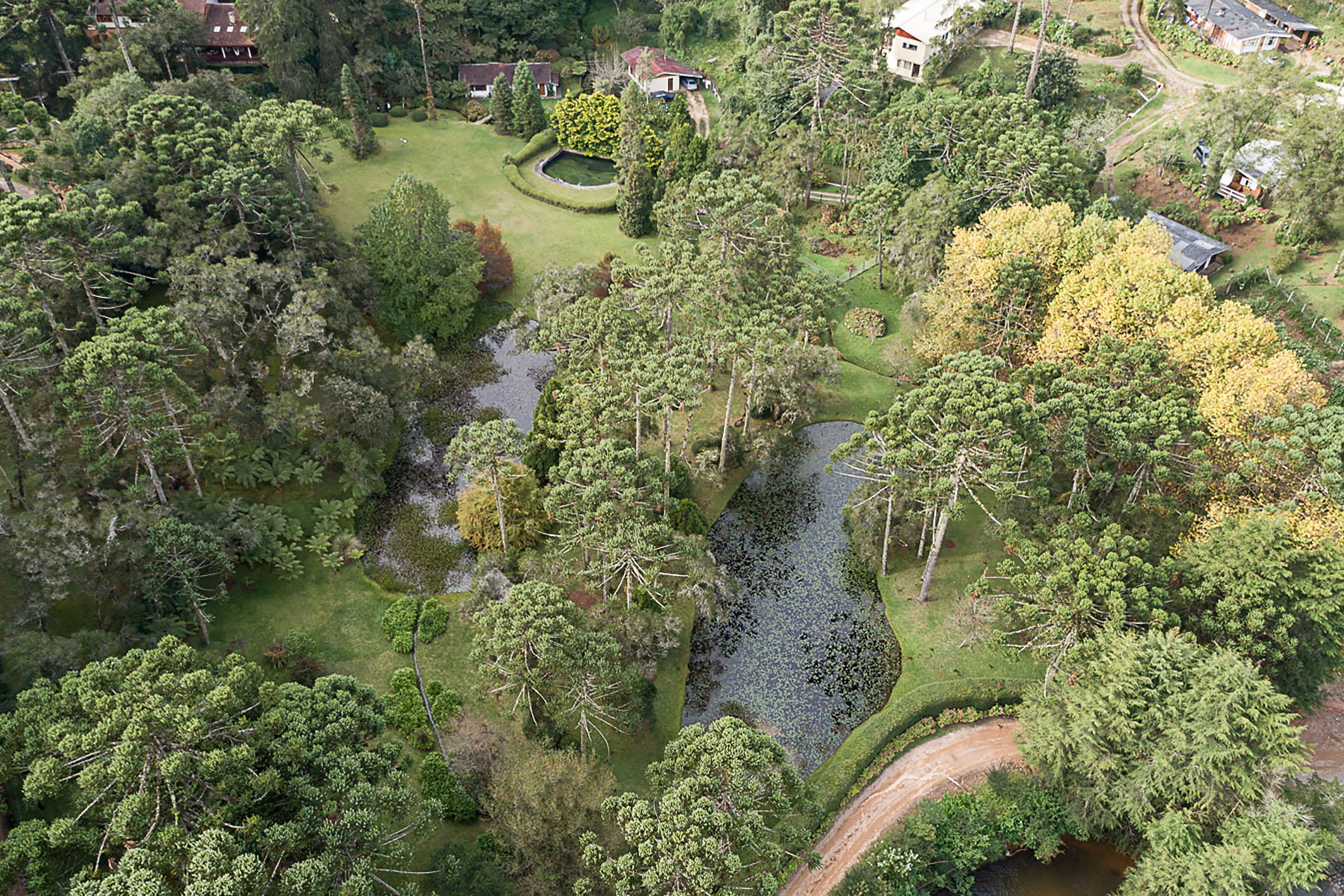 A rare retreat where silence, nature, and well-being converge in balance, just minutes from the center of Campos do Jordão, with easy access and a preserved setting surrounded by native forest with century-old araucarias, trails, and natural springs. The property reveals an intimate landscape where each element has been designed to foster comfort and a genuine connection with the outdoors. The residence features a living area with double-height ceilings, refined millwork, and a mezzanine that enhances spatial flow with lightness and character. The social spaces are fully integrated, including a fireplace lounge, office, gourmet kitchen, and an additional support kitchen, reinforcing both functionality and conviviality. The panoramic veranda extends the experience, offering a complete gourmet area with wood-burning stove, pizza oven, and barbecue. Heated flooring is present throughout the house, ensuring comfort in all environments. On the ground floor, there are two suites, one with a mezzanine accessed via a Santos Dumont staircase. The upper level includes two additional suites—one with a private terrace—and an expansive extra bedroom designed to accommodate up to four guests. The outdoor area includes a caretaker’s house and support structures for maintenance and operation. Leisure amenities feature a rustic pool, jacuzzi, a stream crossing the property, two natural springs, two ponds, and an 86,111 sq. ft rustic garden. The property also offers parking for up to ten vehicles. A residence that values what is essential: privacy, nature, and a singular living experience.