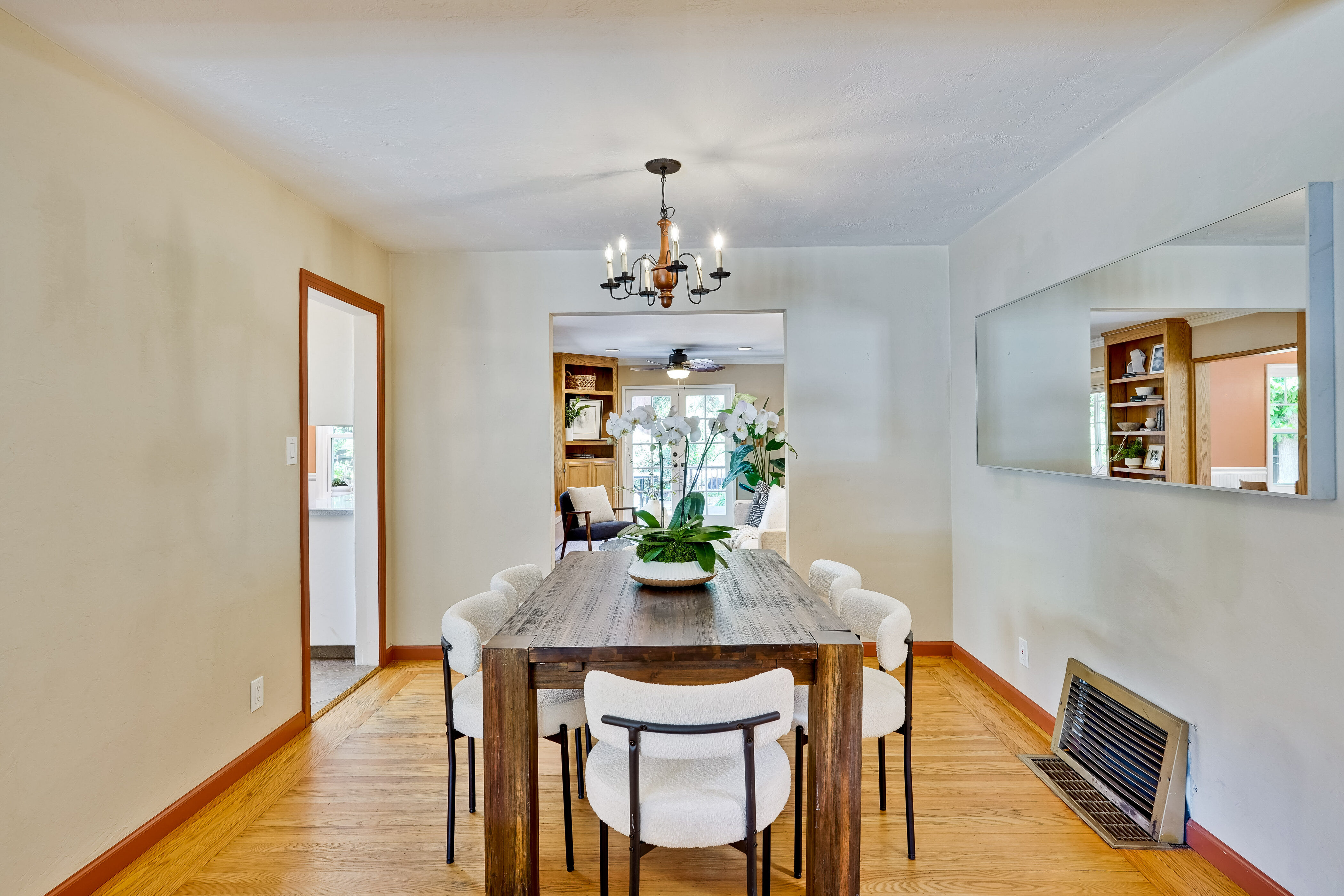 Spectacular creekside setting nestled under majestic redwoods, this serene Castro Valley property offers a rare combination of tranquility, charm, and function. Set on a large lot, the home features three spacious wood patios and peaceful garden paths, ideal for relaxation or entertaining. Inside, the eat-in kitchen boasts Corian countertops and a gas stove, flowing into generously sized separate living and dining areas. The primary suite opens to a private patio through elegant French doors and includes a large bathroom, while both bathrooms offer ample space and comfort. Additional features include a 14’ x 12’ storage shed with flexible potential for an office, studio, or workshop, dual-pane windows throughout, and access to highly rated Castro Valley schools. Located near the vibrant and charming downtown, this must-see property is perfect for those seeking nature, privacy, and convenience in one exceptional home.