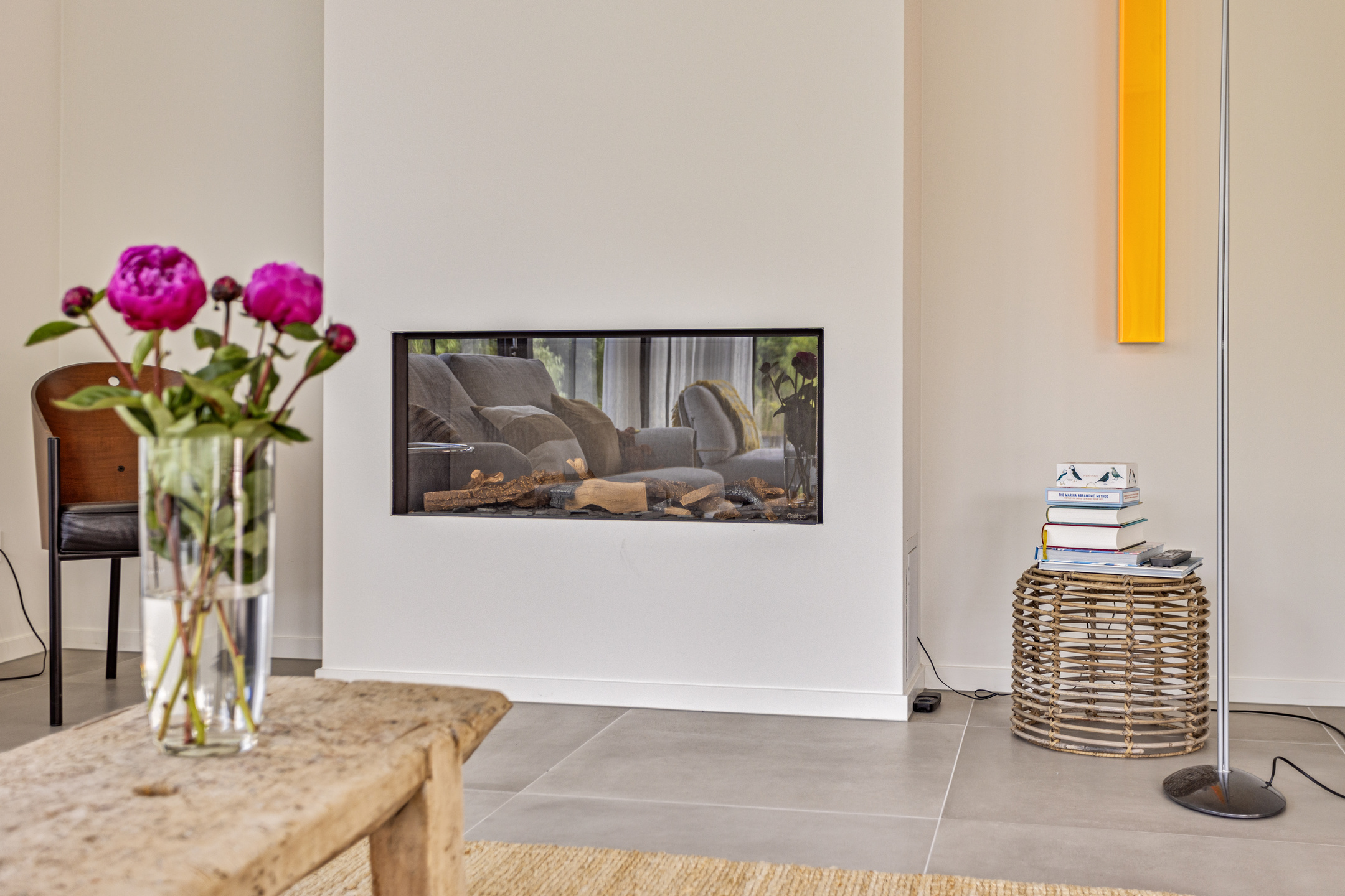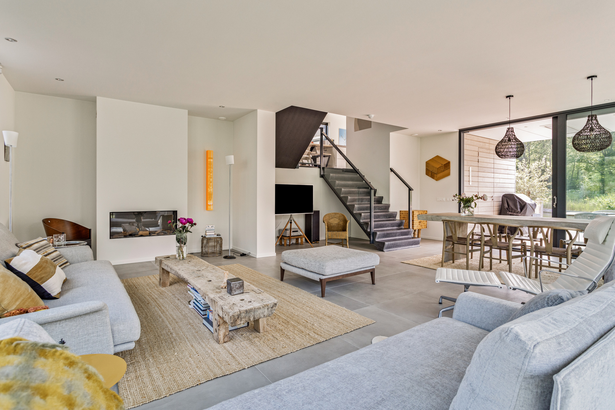 One level down is the generous living room with a fireplace. Large windows and direct access to the terrace and jetty enhance the connection to the water. Here, you truly live by the lake: dining with a view, relaxing by the fire, or heading straight out onto the water via your private boathouse with boat lift.