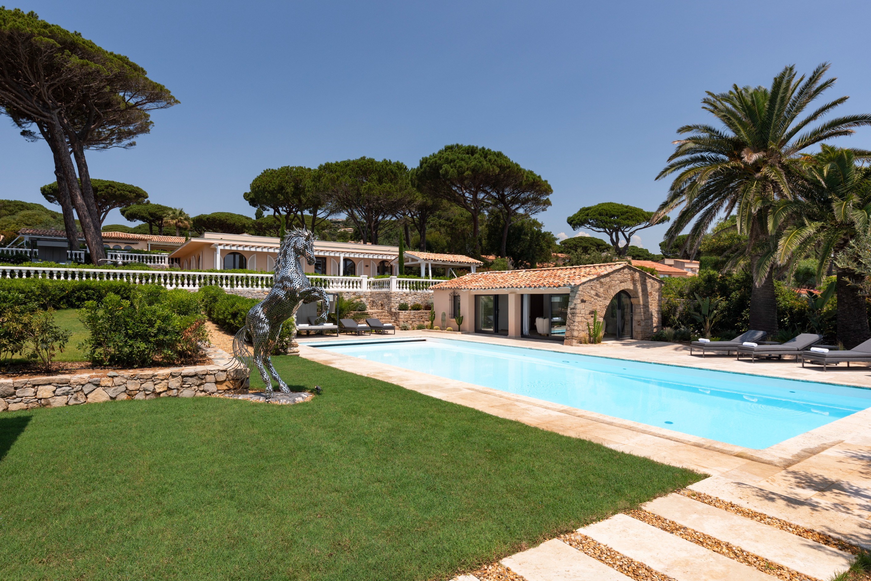 Ideally located in the heart of the Gulf of Saint-Tropez, this exceptional property, offering approximately 500 sqm of total living space, represents a rare opportunity on the market. It stands out for the remarkable quality of its finishes, its spectacular sea views, and its prime setting within a highly sought-after environment. The property comprises a main villa of approximately 300 sqm featuring four en-suite bedrooms, a caretaker’s house, a guest house of approximately 120 sqm with three en-suite bedrooms, as well as an elegant pool house. The estate is set within nearly 5,000 sqm of beautifully landscaped grounds, enhanced by two swimming pools, meticulously designed to create an enchanting setting dedicated to relaxation and the refined lifestyle of the Gulf of Saint-Tropez. The property can be arranged as two independent or interconnected residences, depending on your project: – A first section including the main villa, complemented by a very large heated swimming pool, as well as the caretaker’s house. – A second section, entirely independent and not overlooked, comprising a guest house and a pool house with an en-suite bedroom, also benefiting from a spacious swimming pool. This configuration allows for hosting guests in complete privacy or considering a partial rental investment. Exceptional property – Confidential file. Information available only to qualified clients. This property is presented by Côte d’Azur Sotheby’s International Realty, your expert in luxury real estate in the Gulf of Saint-Tropez.