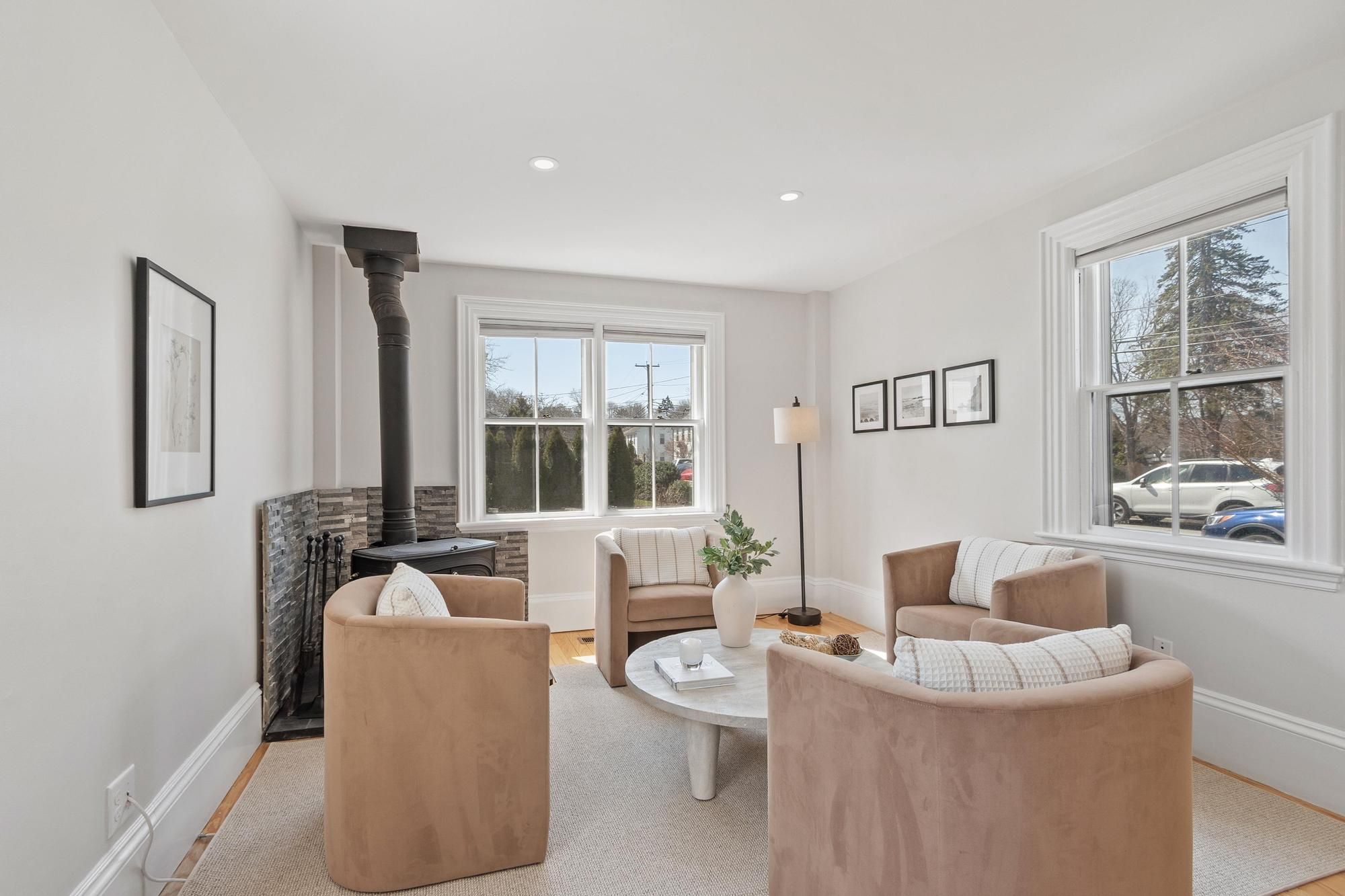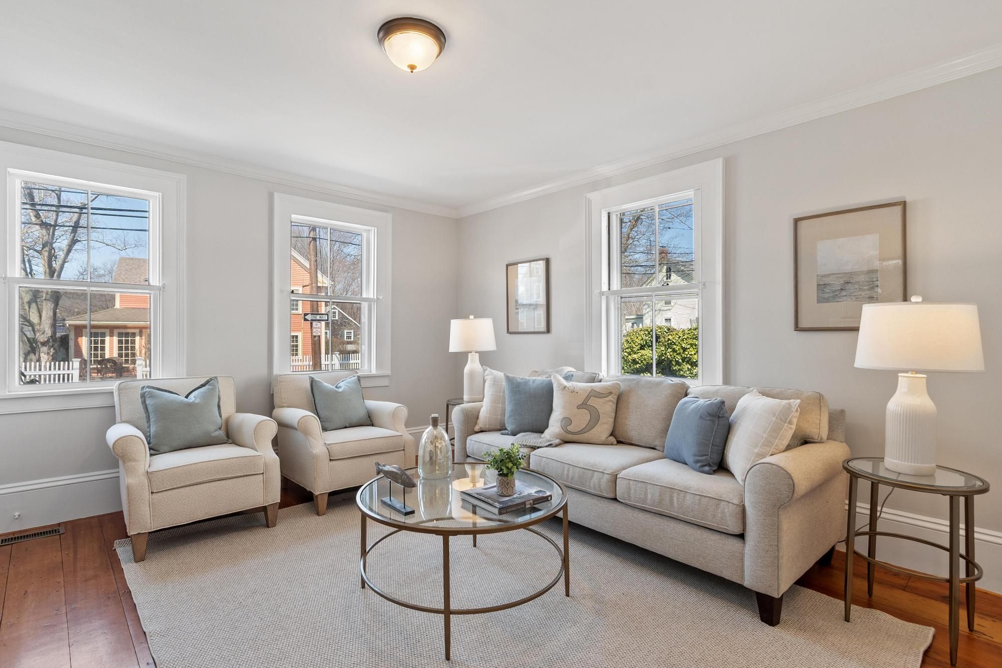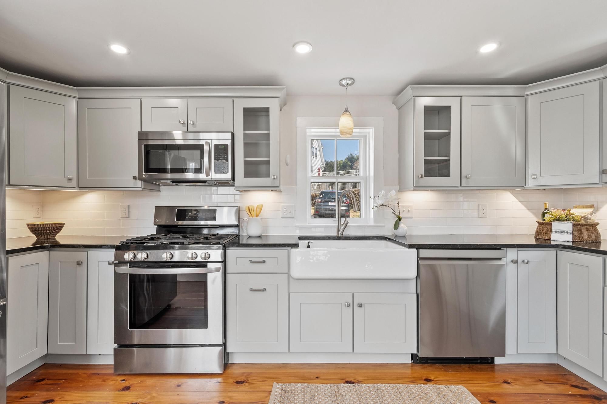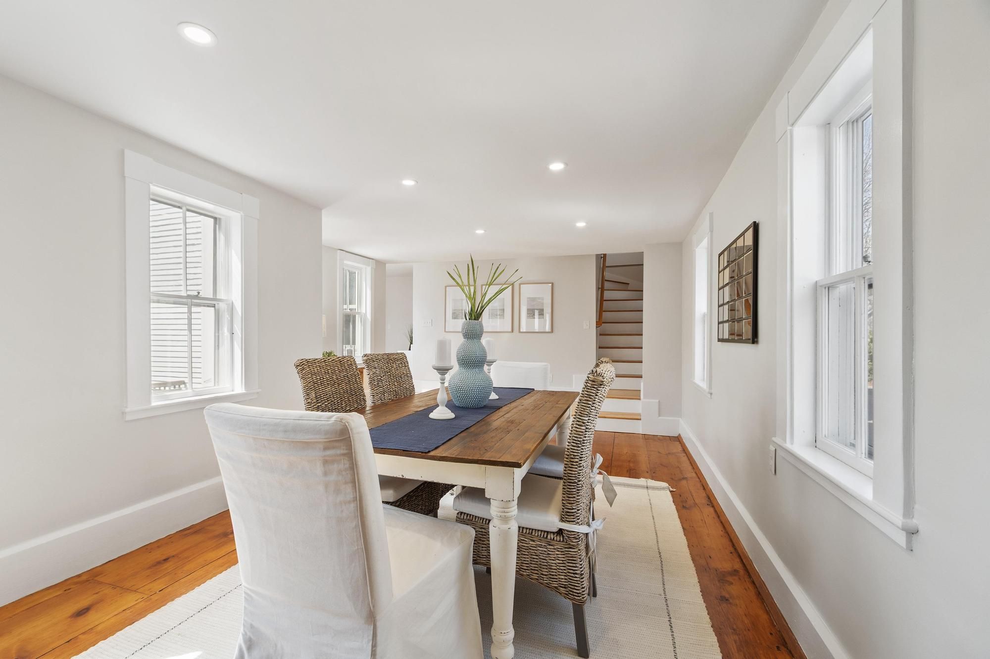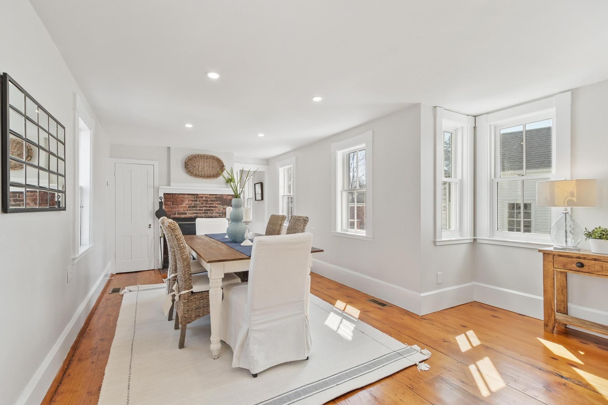 The perfect blend of historic charm and modern comfort in the heart of downtown Rockport! This beautifully renovated antique Colonial offers over 2,500 Sq. Ft. across three levels, featuring four bedrooms and three new baths in a flexible, functional layout. Timeless character shines through with original pumpkin pine floors, indian shutters, and two original, working fireplaces. Thoughtful upgrades include central A/C, a cozy wood stove, and all new systems (2019) and roofs. The inviting farmhouse kitchen includes a pantry and offers seamless access to the deck and sunny, enclosed yard—ideal for everyday living and entertaining. Enjoy mature gardens with irrigation, a one-car garage that includes a workshop and storage, plus ample parking. It's just a short stroll to the commuter rail, Front Beach, and downtown's many shops, restaurants, boating opportunities, and vibrant music scene. Move-in ready for summer with ample room for family and friends - this is coastal living at its best!