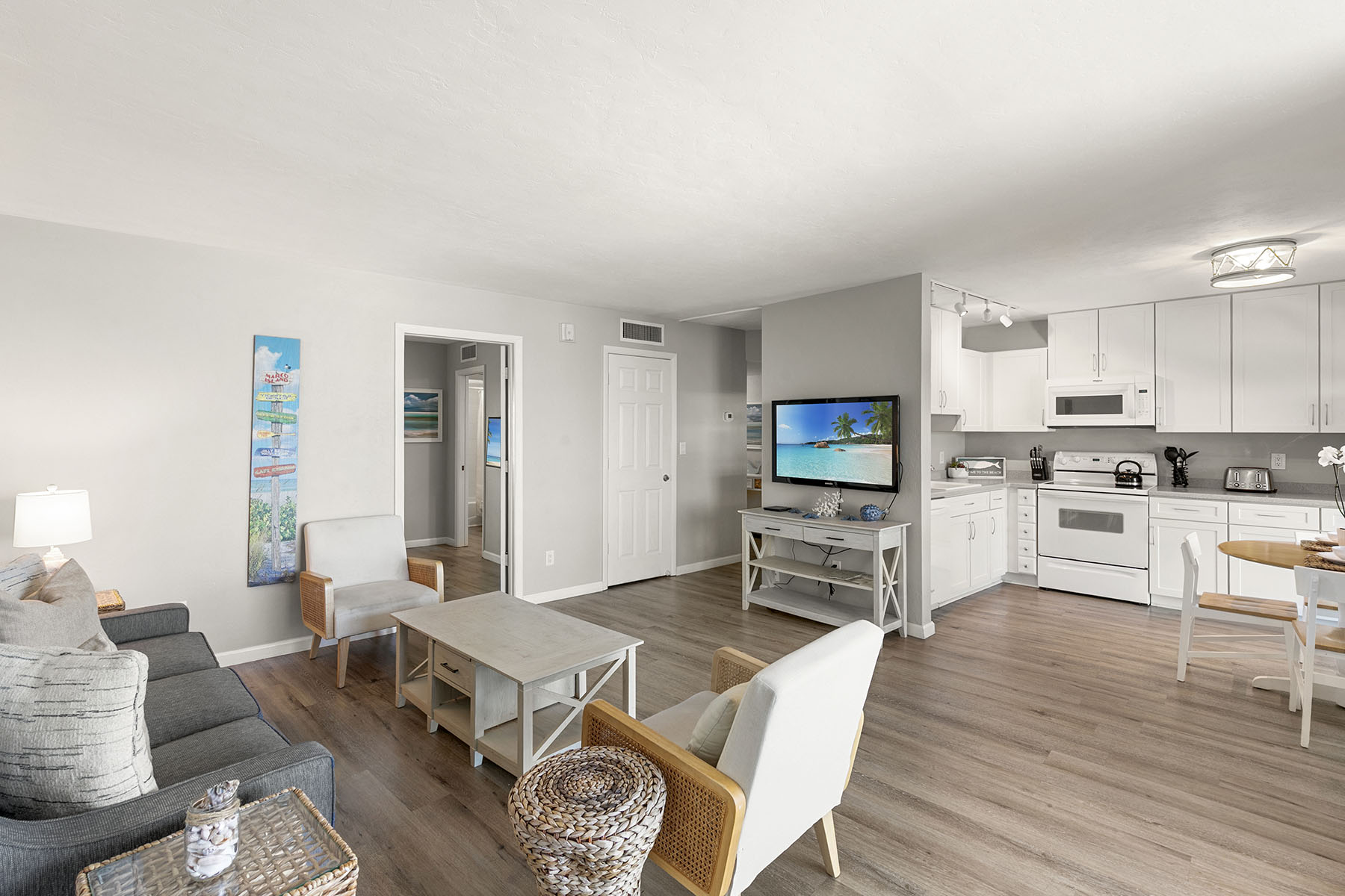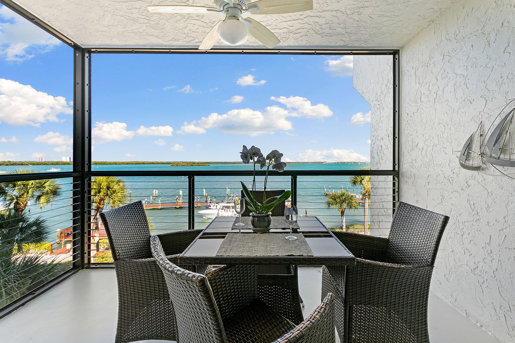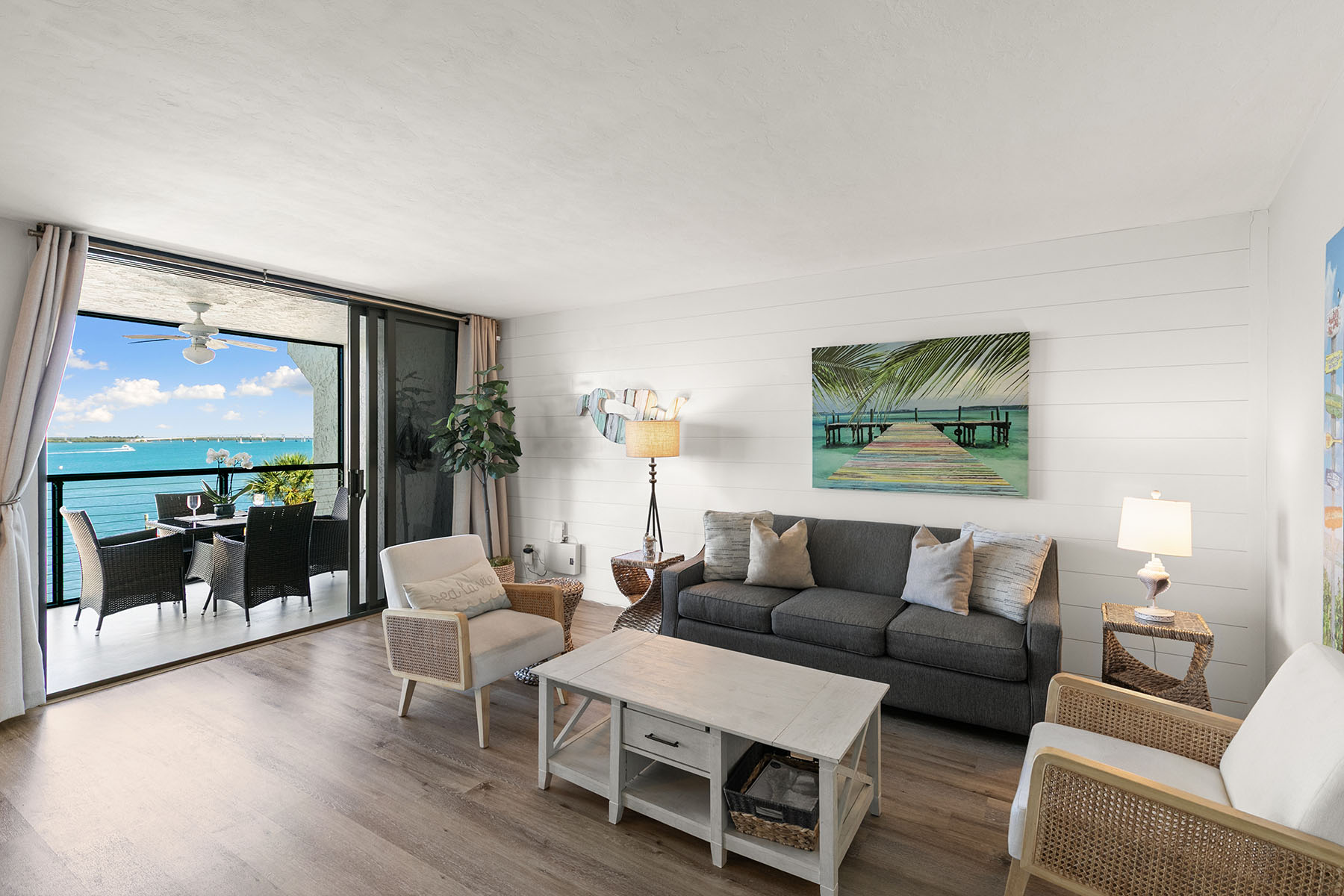 Welcome to Riverside C406, a furnished fourth-floor, one-bedroom, one-bath waterfront condominium on the Marco River with wide-water views from a private screened lanai. Enjoy a front-row perspective of river activity, Pelican Pier Marina, the Jolly Bridge and sunrise views over the pool. The residence offers 800 square feet under air, is nicely maintained, and features luxury vinyl plank flooring plus a bright eat-in kitchen with white cabinetry and a clean-lined, coastal look. Daily rentals are allowed, creating exceptional flexibility for personal use and investment, and the condominium has a strong rental history. Fees include electricity, water, cable with premium channels and internet, along with community amenities. Riverside Club is home to Pelican Pier Marina and offers two pools, a clubhouse, tennis and pickleball courts, a fishing dock and a boat launch. Boat slips are available on a first-come, first-served basis for $400 per year per slip, plus gated, locked boat trailer storage on property. In the heart of Old Marco, close to waterfront dining, outdoor dining, live music venues, shopping and island boating, with nearby bike and boat rentals and local favorites for happy hour. Go onto the lanai, take in the river view and you will understand how easily this becomes your Marco routine.
