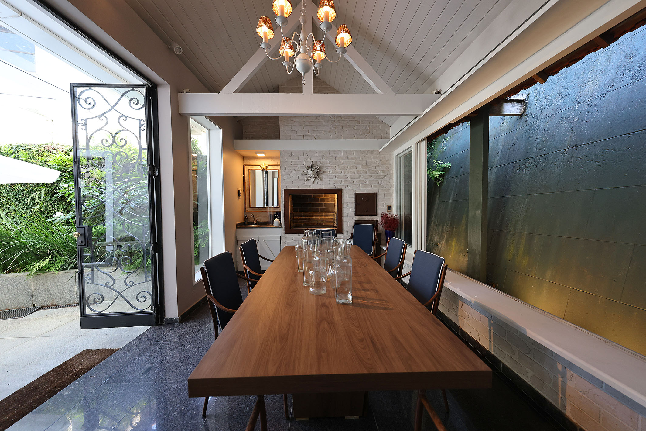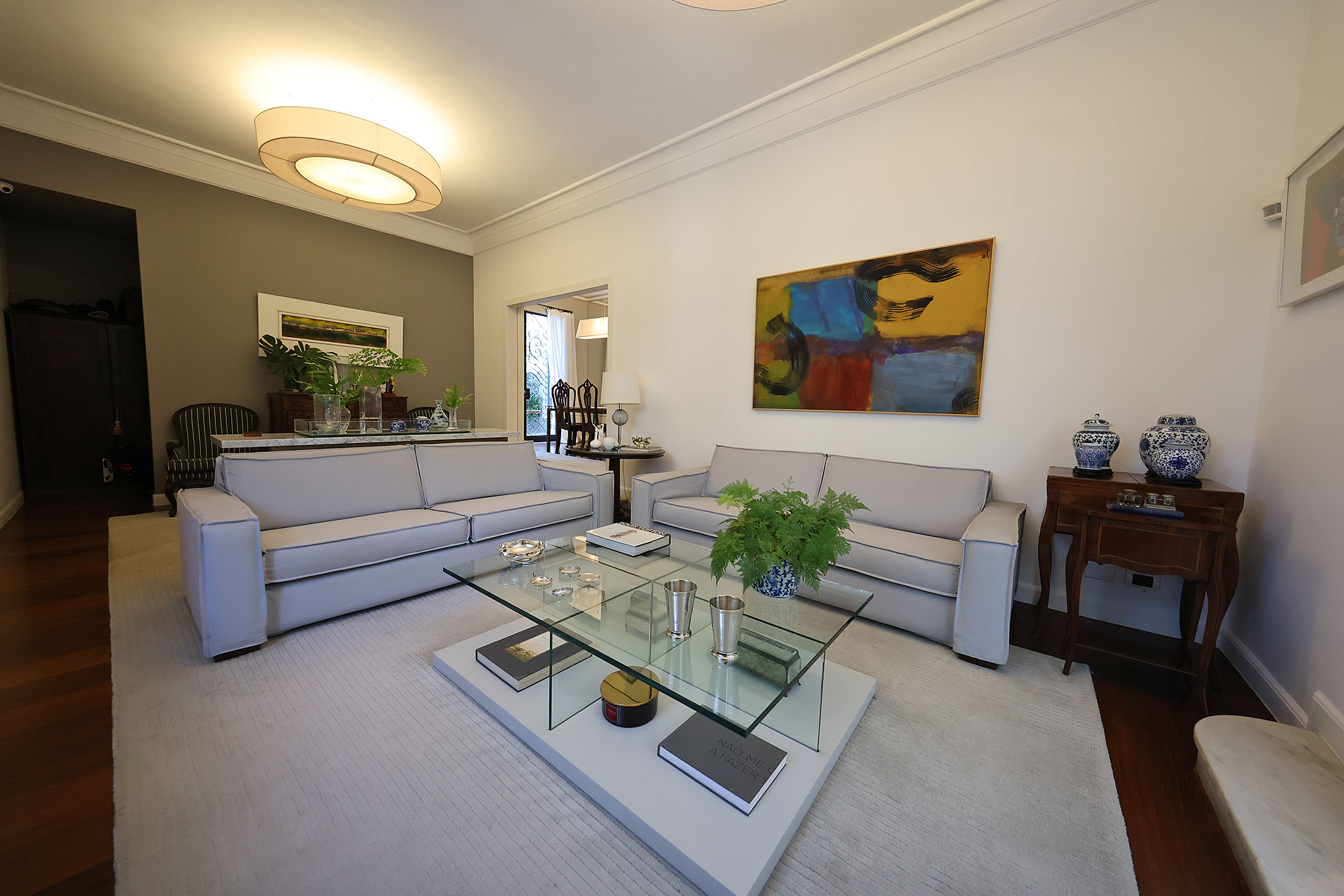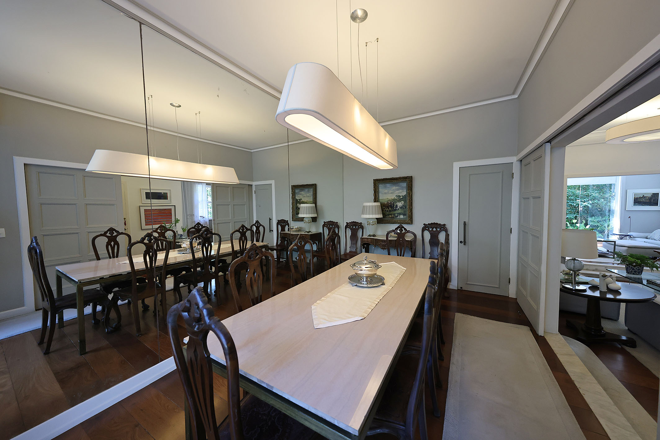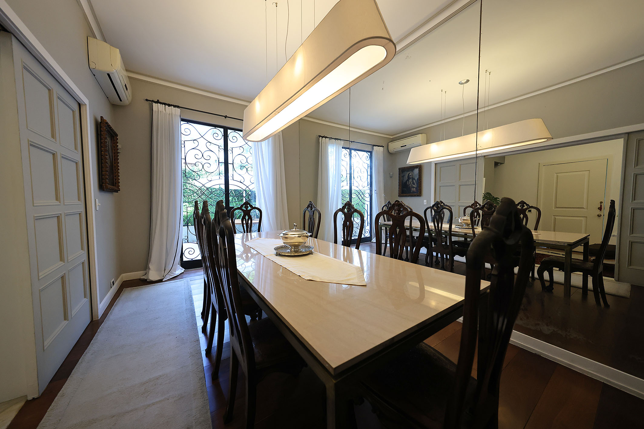Located on a quiet, tree-lined street with controlled access, this neoclassical residence is surrounded by greenery and offers a well-balanced combination of space, functionality, and privacy. With approximately 6,222 sq. ft. of built area, the property features an outdoor area with a swimming pool and a gourmet space designed for leisure and entertaining. On the main floor, the layout includes a living room, dining room, TV room, powder room, kitchen, laundry area, and two staff bedrooms. On the upper level, there is a primary suite of approximately 592 sq. ft. with a walk-in closet and home office, along with an additional suite, two bedrooms, and a shared bathroom. The property also includes a covered garage for three vehicles and a caretaker’s house. Additional features include a private water supply system, solar panels for water heating, alarm, and internal monitoring system, enhancing efficiency and security.