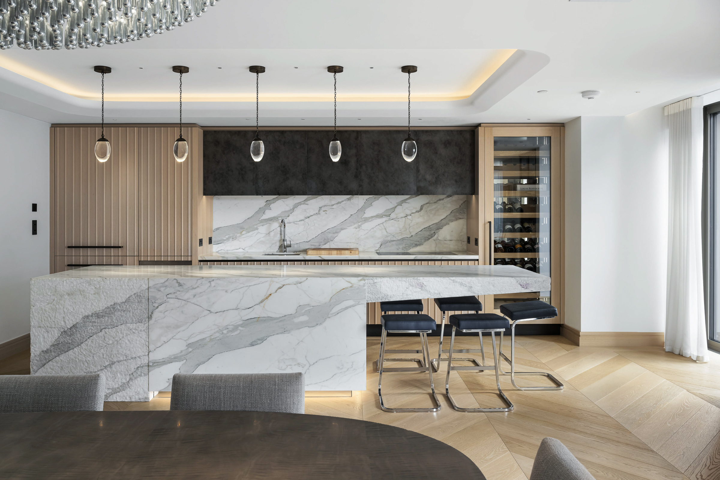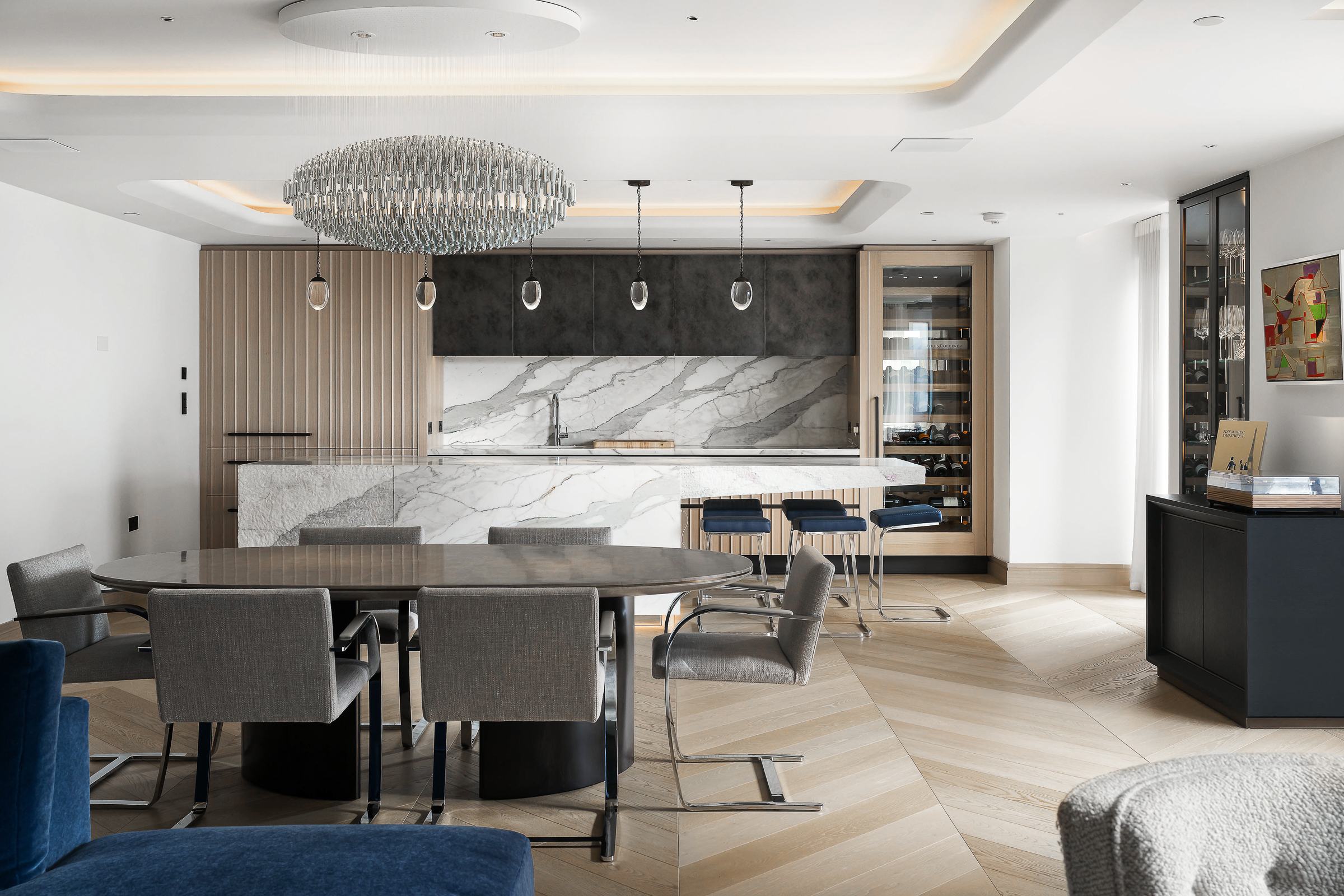The kitchen sits open-plan yet clearly defined, centred around a striking marble island. Wolf and Gaggenau appliances, alongside a Sub-Zero fridge, signal a serious approach to cooking, while the south-facing aspect keeps the space bright and sociable throughout the day. It’s the kind of room designed for long, informal evenings rather than formal display.