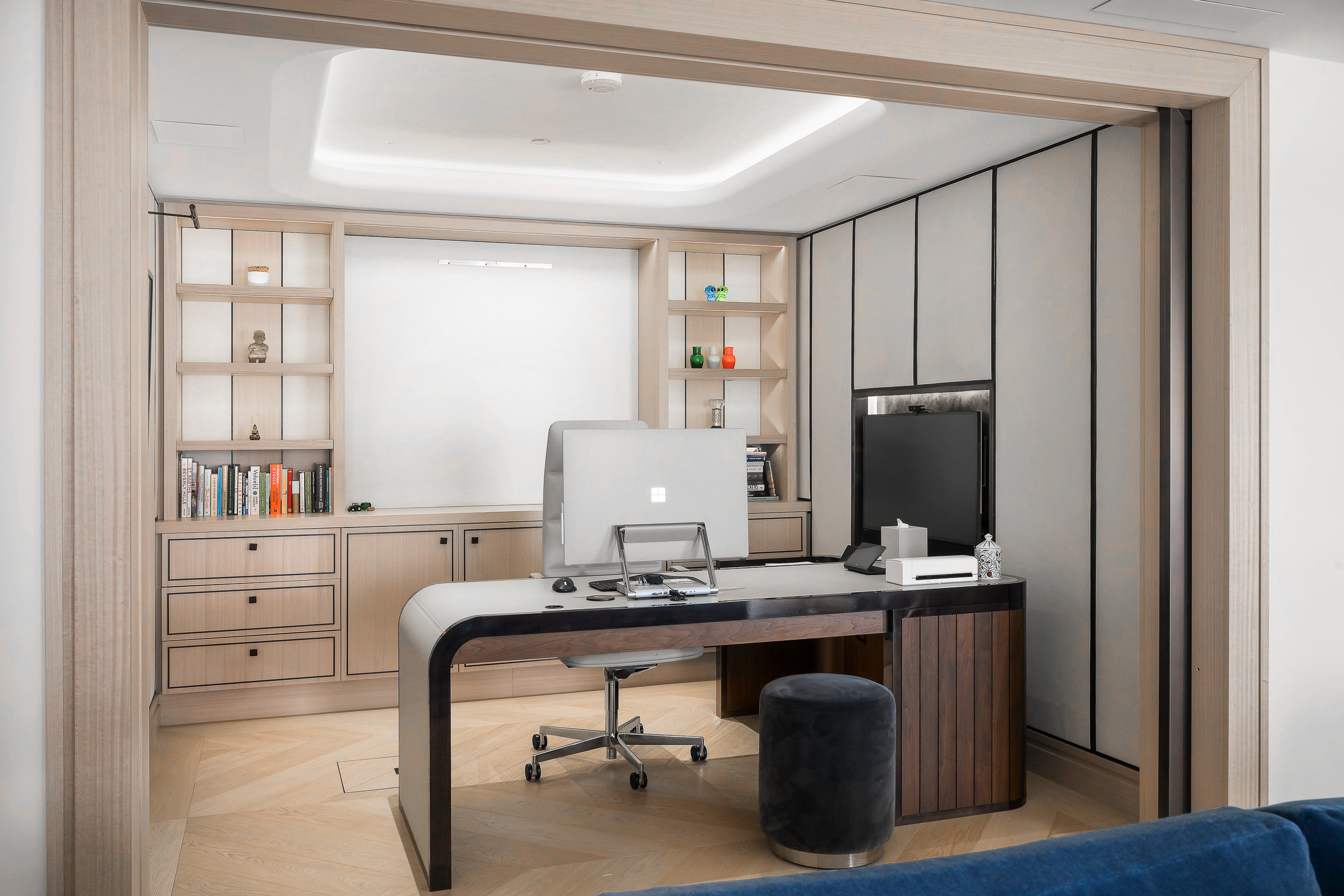 The reception room is generous in scale, arranged for both entertaining and day-to-day living. A concealed study sits behind bespoke pocket doors, allowing the space to shift easily between work and relaxation without compromising flow. A built-in surround sound system is cleverly integrated, adding a layer of considered detail.