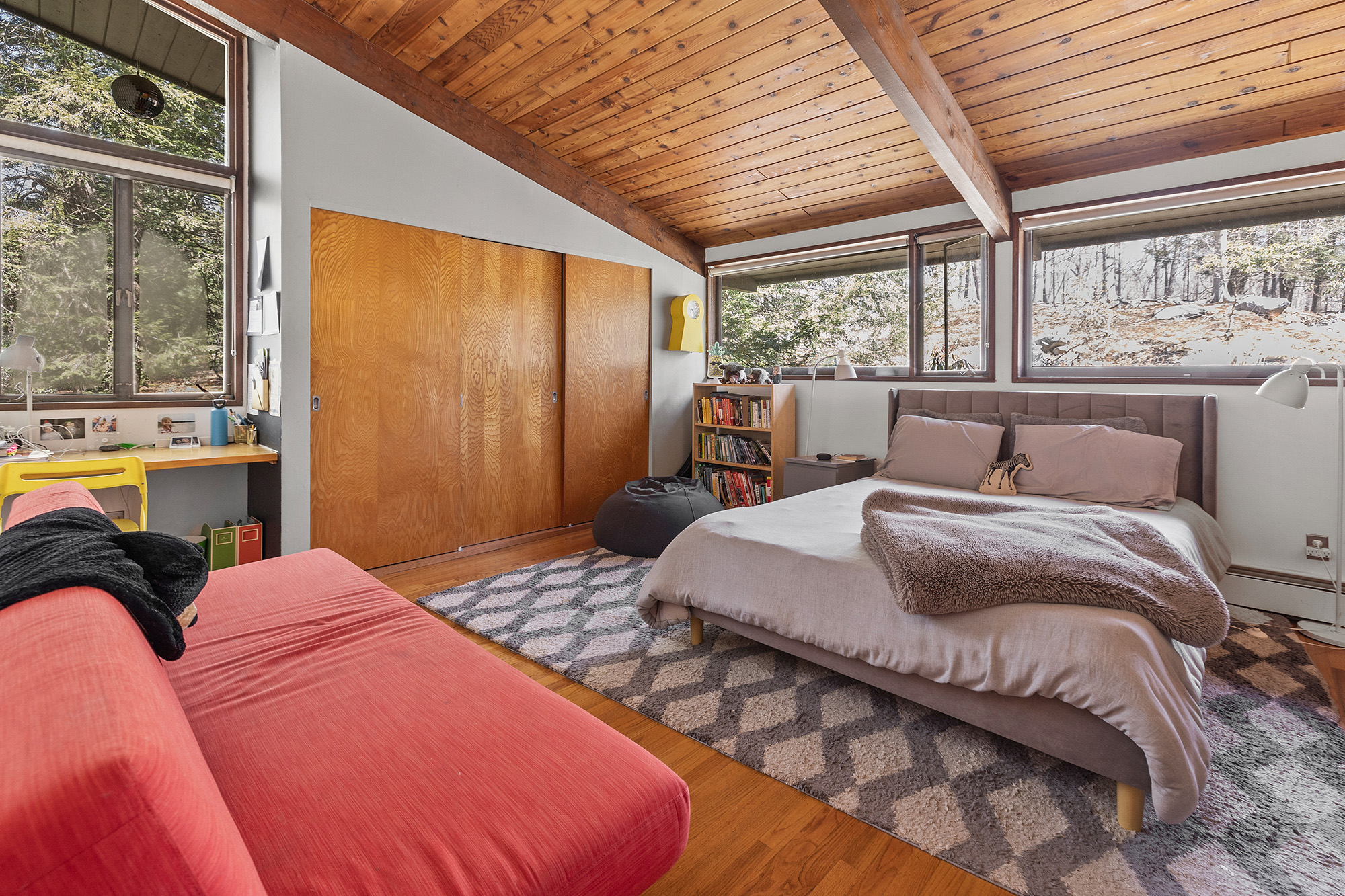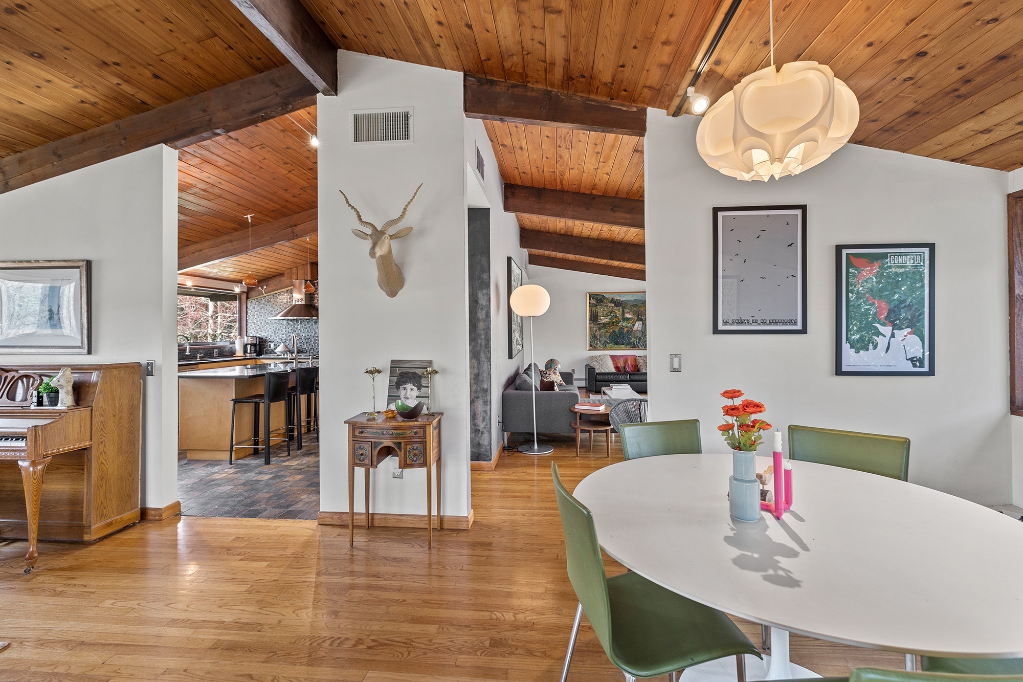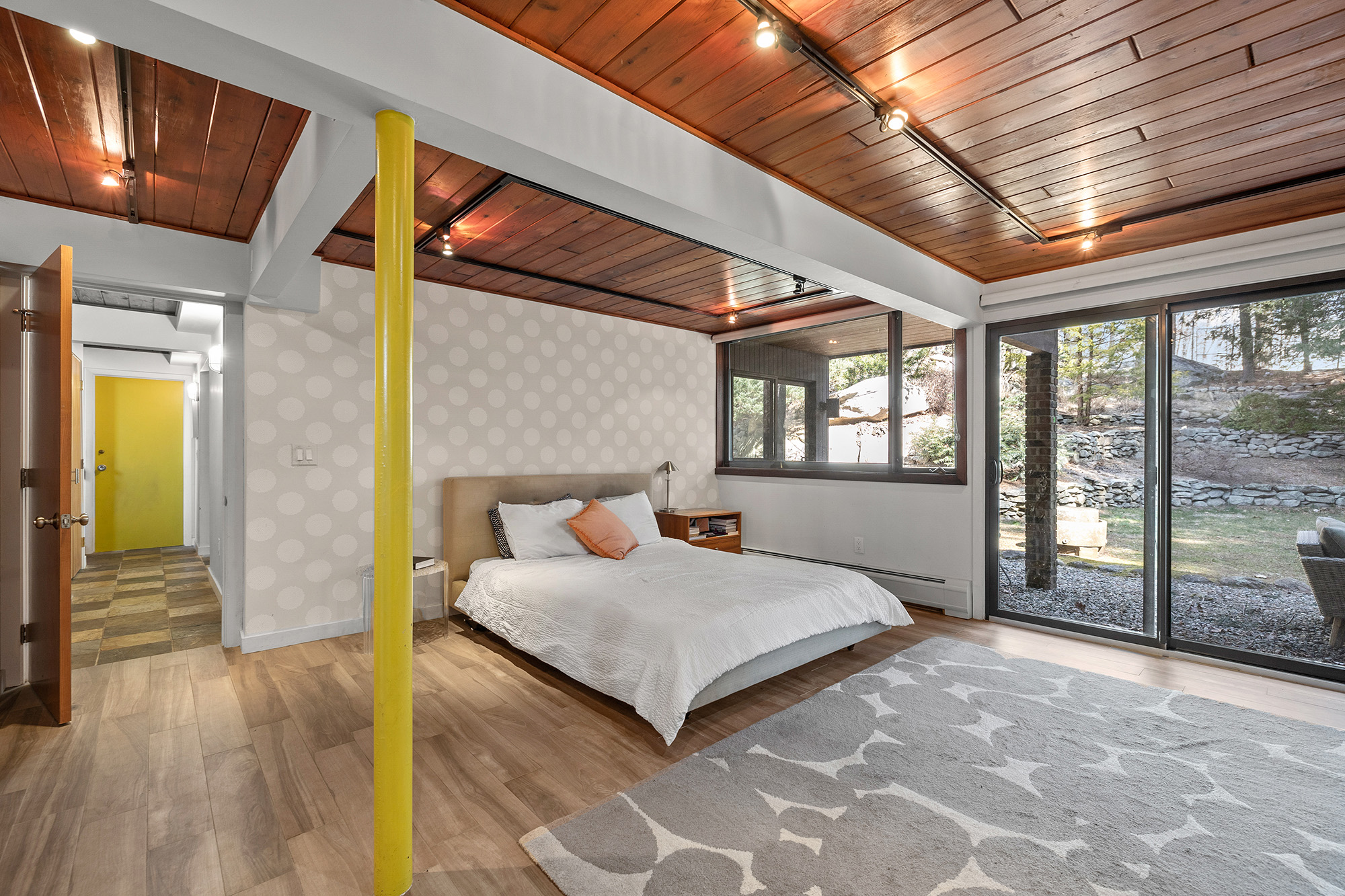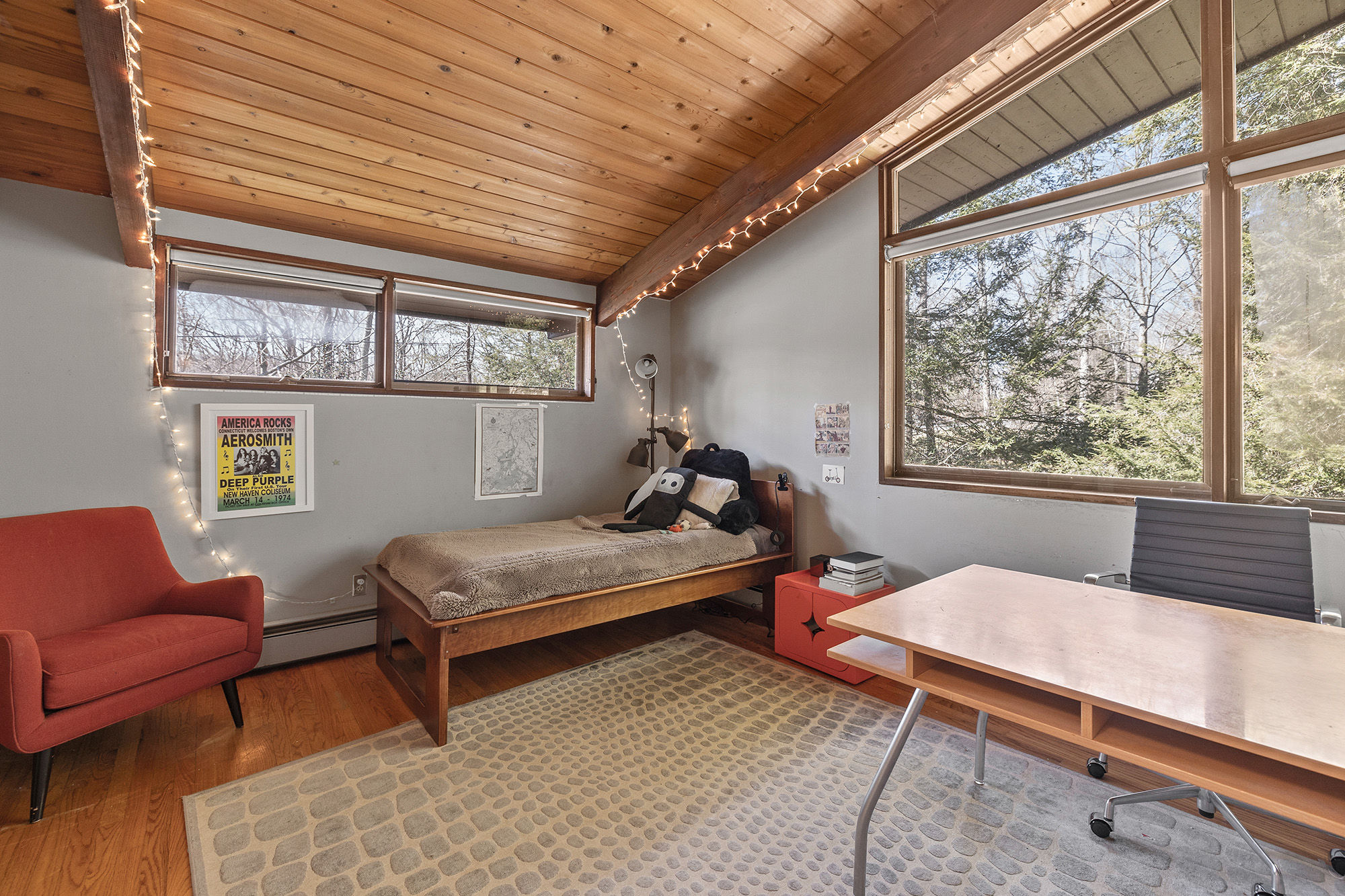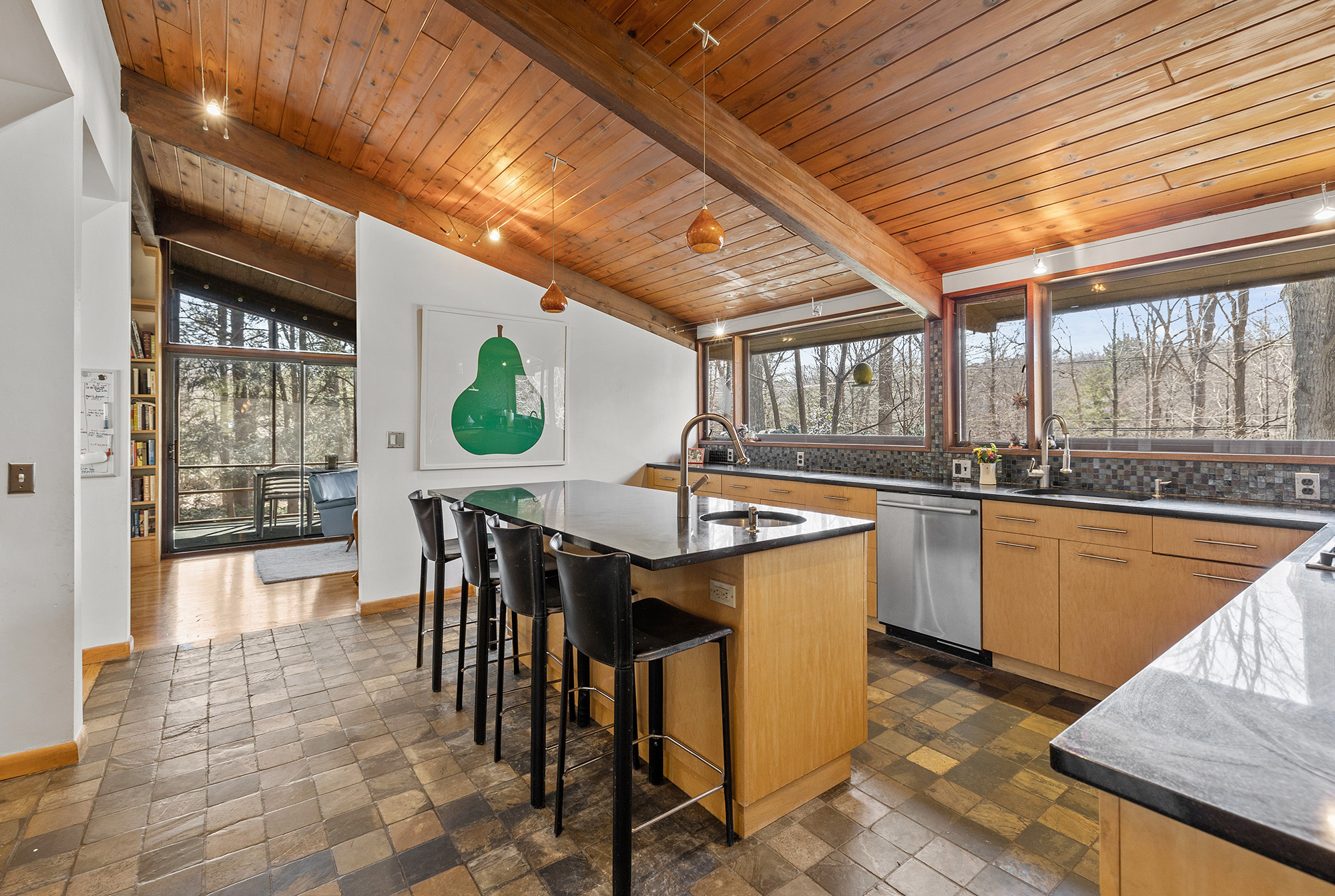 Nestled on a private acre, this 4-bedroom, 3.5-bath Mid-Century deck house seamlessly blends retro charm with contemporary style, embracing many trademark features of the design: an open floor plan, tall ceilings, gigantic windows, and sliding doors with screens. The living room, bathed in natural light, offers an inspiring view through a wall of glass, seamlessly connecting indoors and outdoors. Start your day on the front lawn, savoring your morning coffee in Adirondack chairs. Wander the fully fenced gated property, then return to the kitchen bar for a breakfast made with thoughtful amenities like the waffle maker and blender—perfect for crafting waffles and fresh fruit smoothies. The lower level office invites productivity, while the nearby rail trail beckons for a workout session. Retreat to the home's library for leisurely reading, then dine al fresco on the screened porch, taking in wooded views while grilling dinner on the gas grill. Cap off the evening with stargazing before unwinding in the lower level family room, streaming a movie on the smart flat-screen TV. Accommodating 8+ guests with 2 queen beds, 2 twin beds, and 1 futon, this oasis offers flexibility with a primary bedroom on both main and lower levels. The ensuite bathrooms offer a spa-like retreat. Conveniently located just 5 minutes from Ridgefield's vibrant downtown offerings—arts, history, music, dining, and shopping.