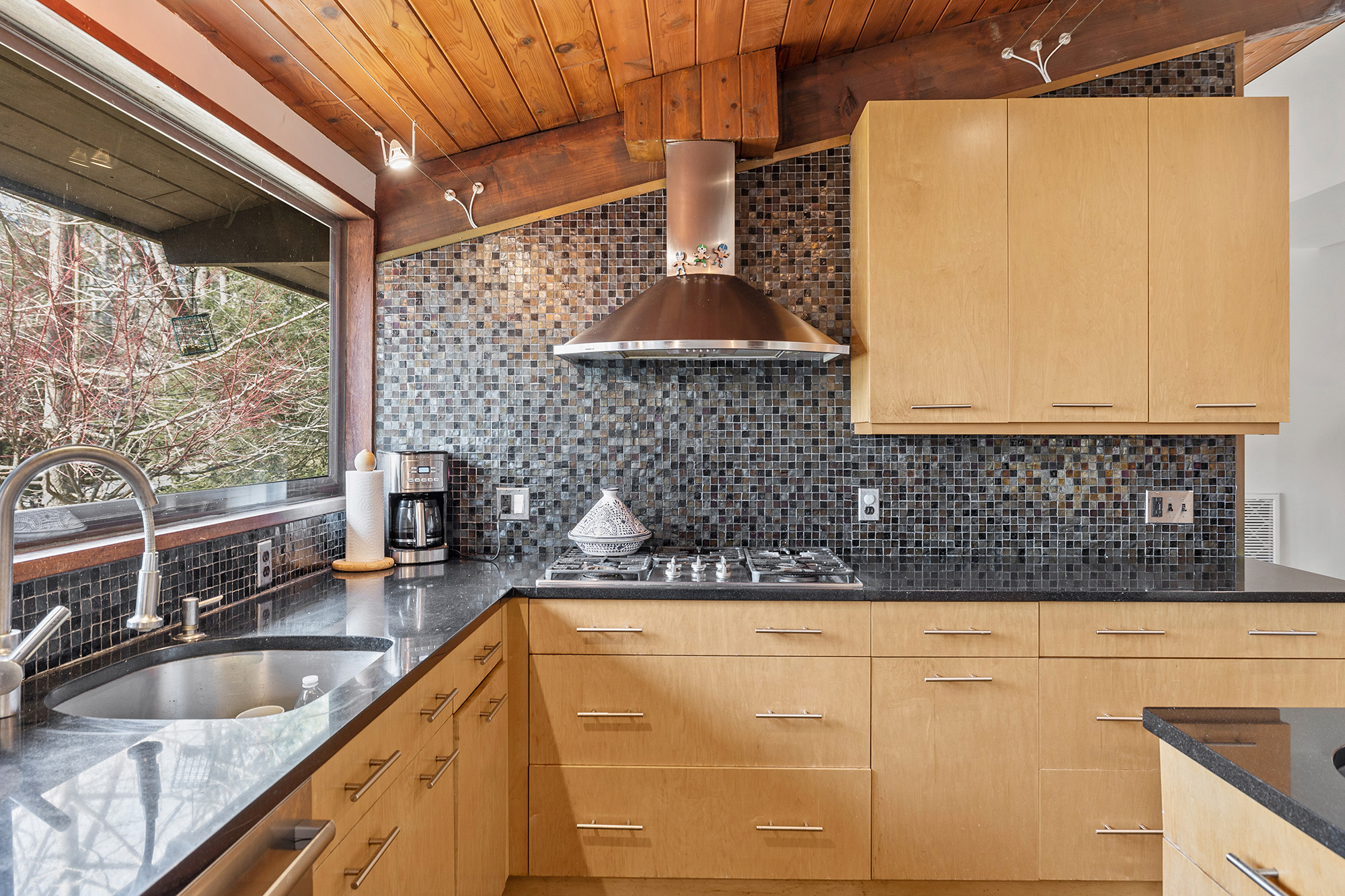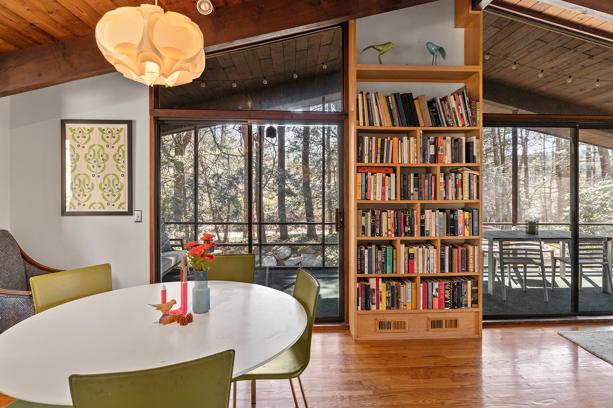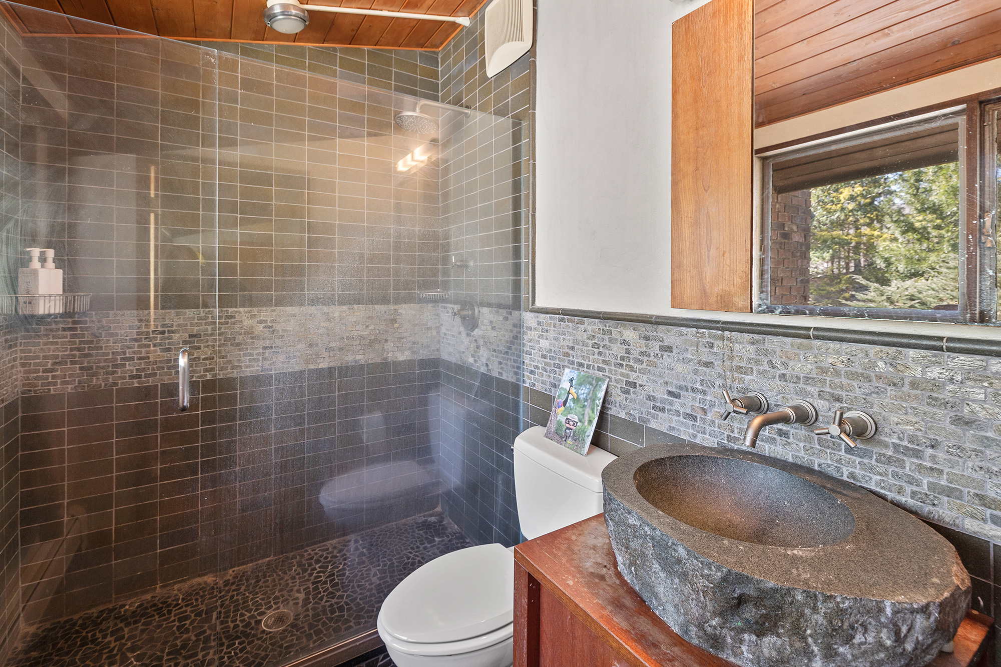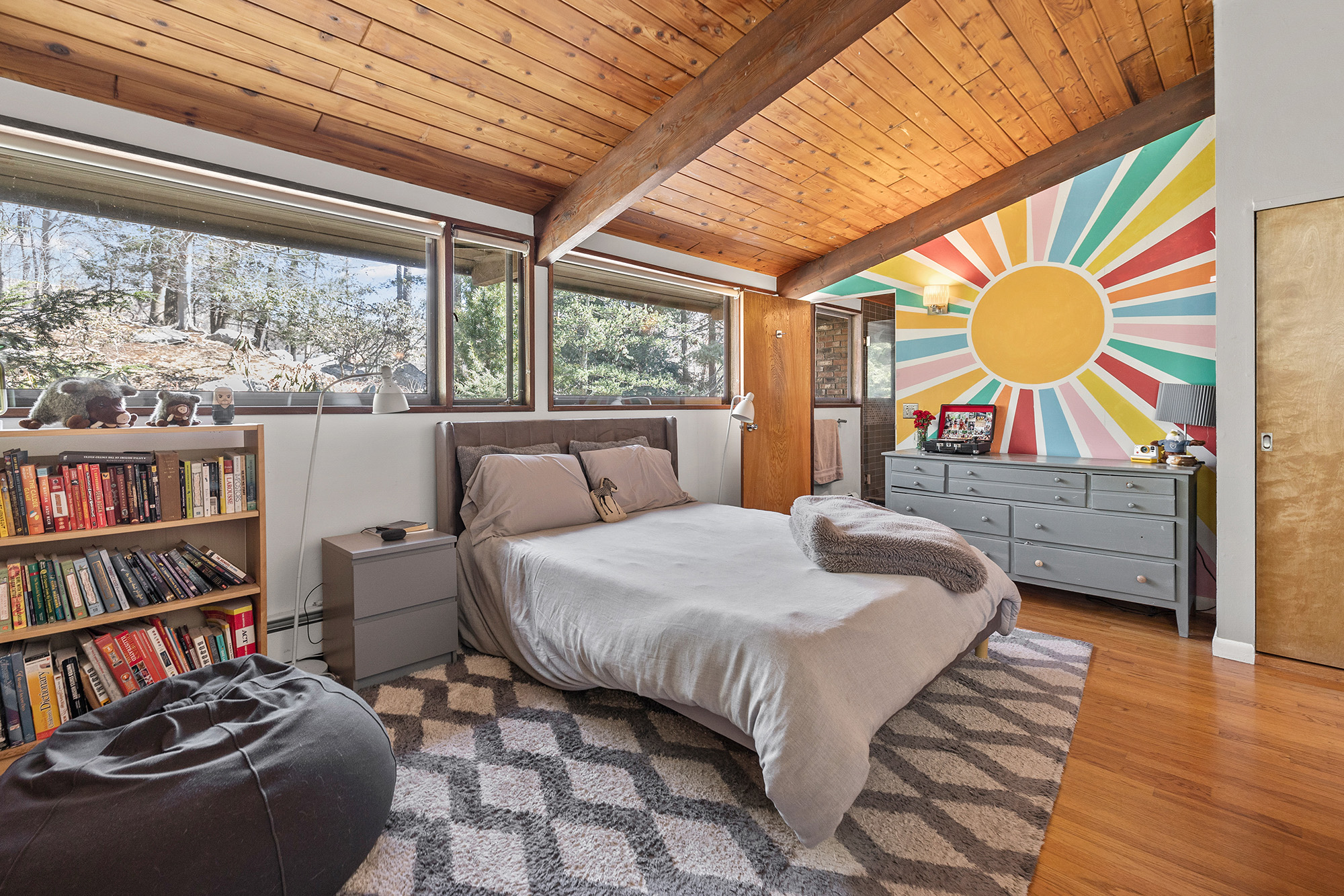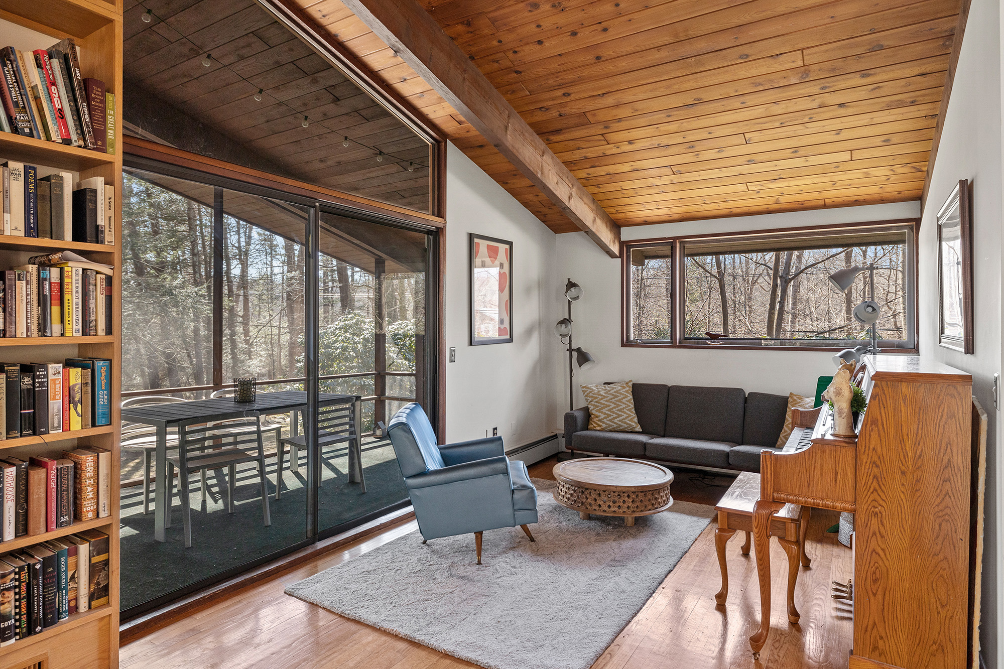 Nestled on a private acre, this 4-bedroom, 3.5-bath Mid-Century deck house seamlessly blends retro charm with contemporary style, embracing many trademark features of the design: an open floor plan, tall ceilings, gigantic windows, and sliding doors with screens. The living room, bathed in natural light, offers an inspiring view through a wall of glass, seamlessly connecting indoors and outdoors. Start your day on the front lawn, savoring your morning coffee in Adirondack chairs. Wander the fully fenced gated property, then return to the kitchen bar for a breakfast made with thoughtful amenities like the waffle maker and blender—perfect for crafting waffles and fresh fruit smoothies. The lower level office invites productivity, while the nearby rail trail beckons for a workout session. Retreat to the home's library for leisurely reading, then dine al fresco on the screened porch, taking in wooded views while grilling dinner on the gas grill. Cap off the evening with stargazing before unwinding in the lower level family room, streaming a movie on the smart flat-screen TV. Accommodating 8+ guests with 2 queen beds, 2 twin beds, and 1 futon, this oasis offers flexibility with a primary bedroom on both main and lower levels. The ensuite bathrooms offer a spa-like retreat. Conveniently located just 5 minutes from Ridgefield's vibrant downtown offerings—arts, history, music, dining, and shopping.