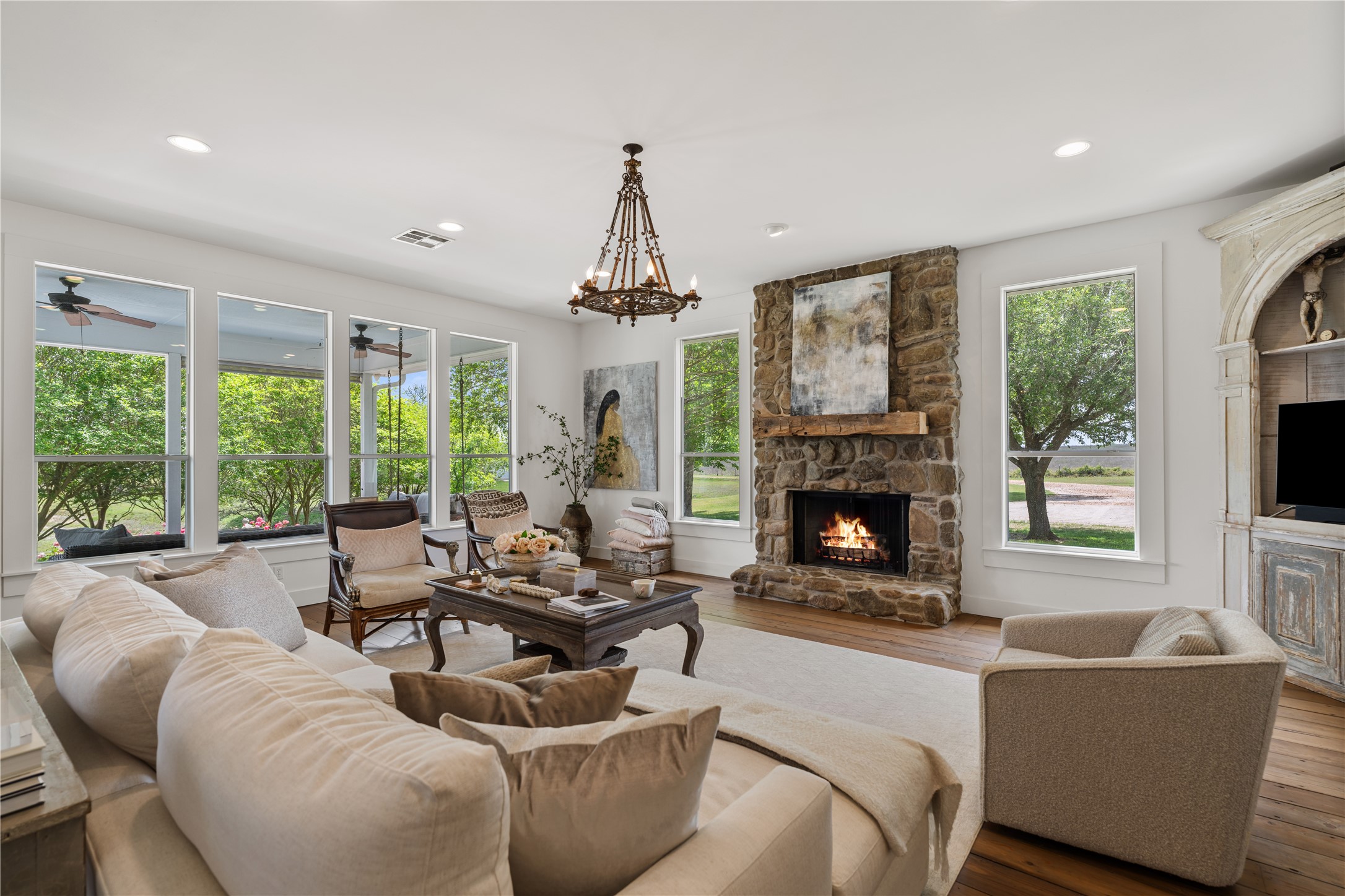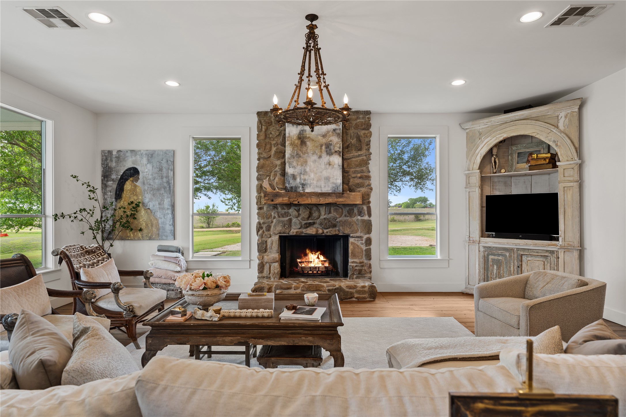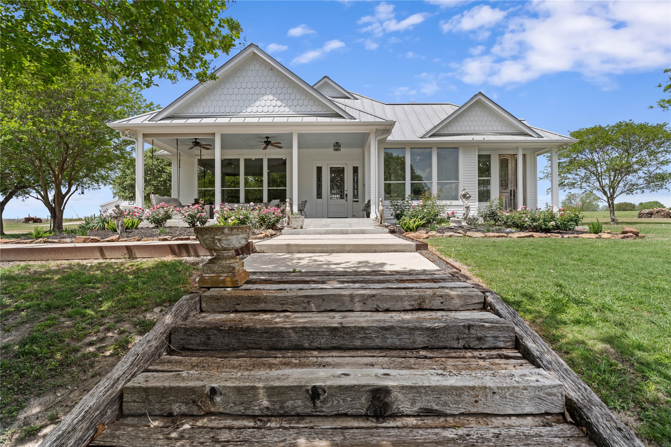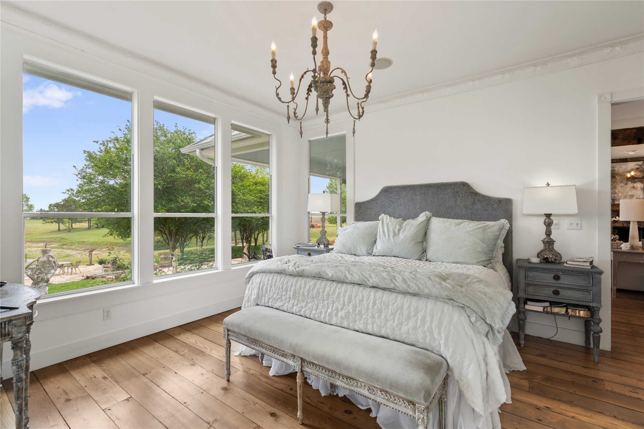 Experience this luxury Texas estate on acreage just minutes from Round Top, offering panoramic 360 degree views and exceptional income potential. The property includes a 4 bed, 2 bath French Country barn home, a designer 2 bed, 2 bath residence, a fully furnished guest house, and a charming 1 bed, 1 bath chapel style cottage ideal for weddings, events, or rentals. Interiors feature hand hewn beams, wide plank wood floors, and custom finishes. A 3,000 sq ft climate-controlled party barn with two story glass doors could easily be converted to living space. Set on one of the highest points in Washington County, the estate offers a fishing pond with pier, fire pit, orchard, raised beds, and a 400 vine Blanc du Bois vineyard. Ag exempt and operating as a successful event venue and B&B, it provides 7 bedrooms, 5 full baths, and 1 half bath, making it a rare turnkey retreat, investment property, or dream country home.