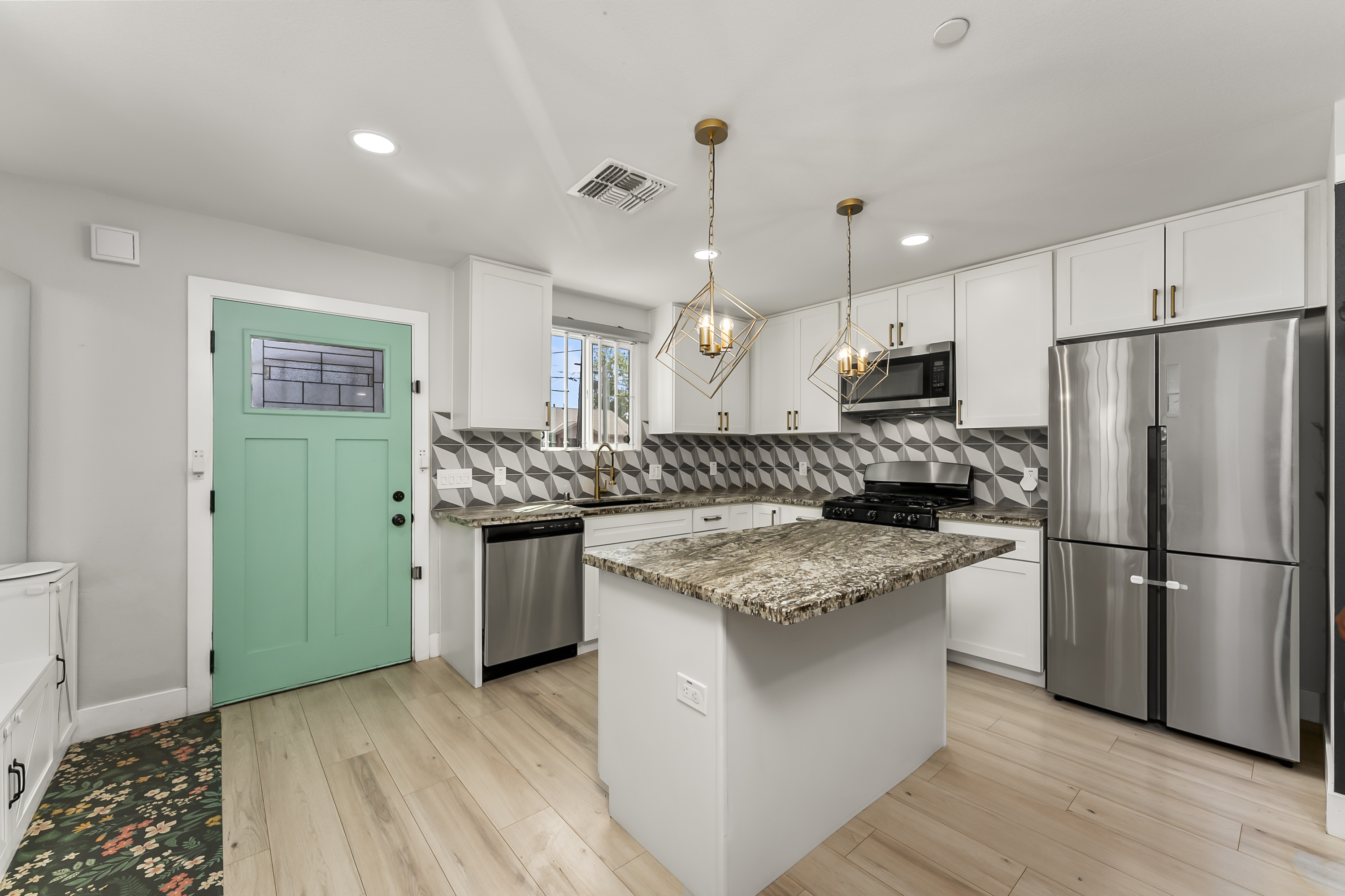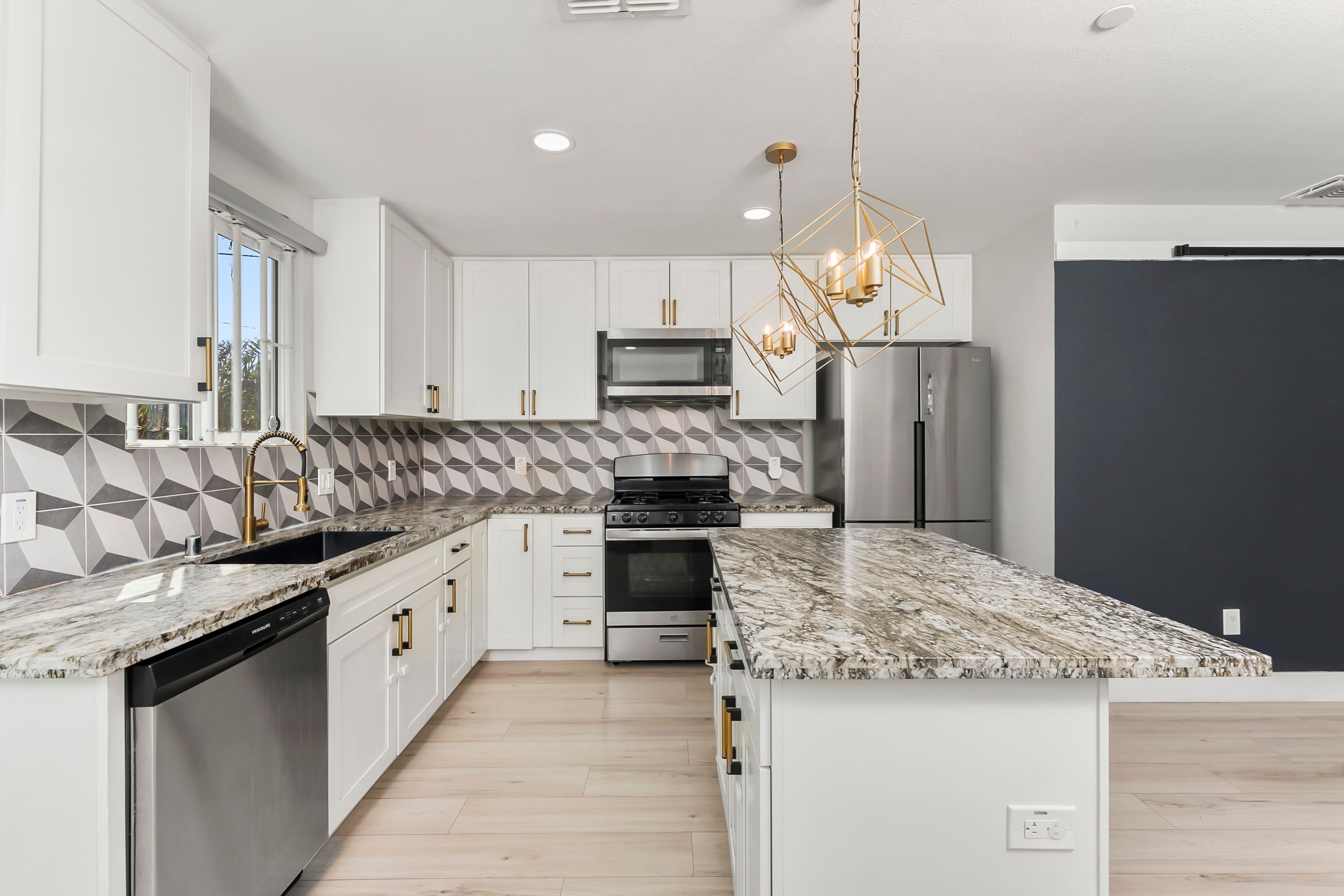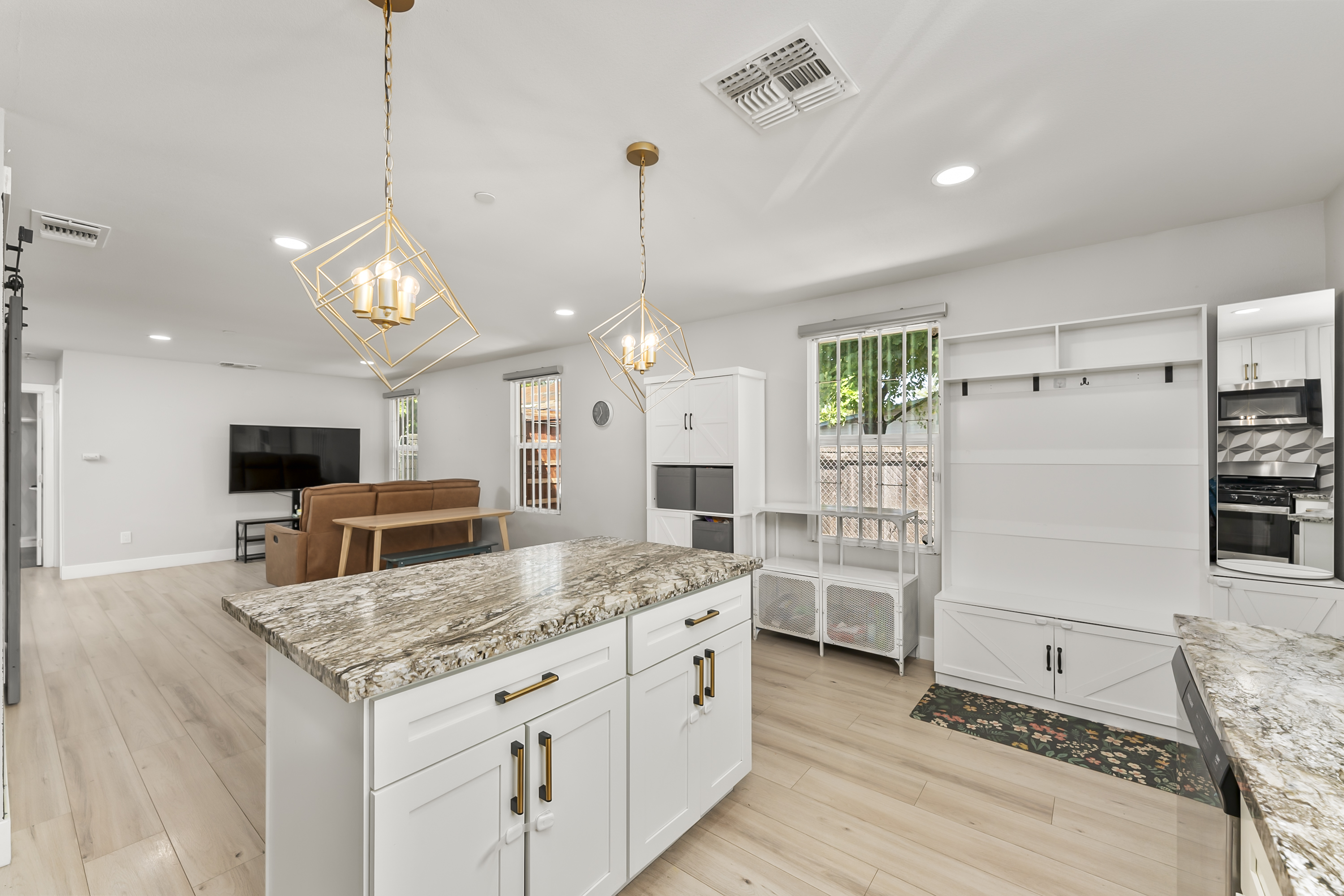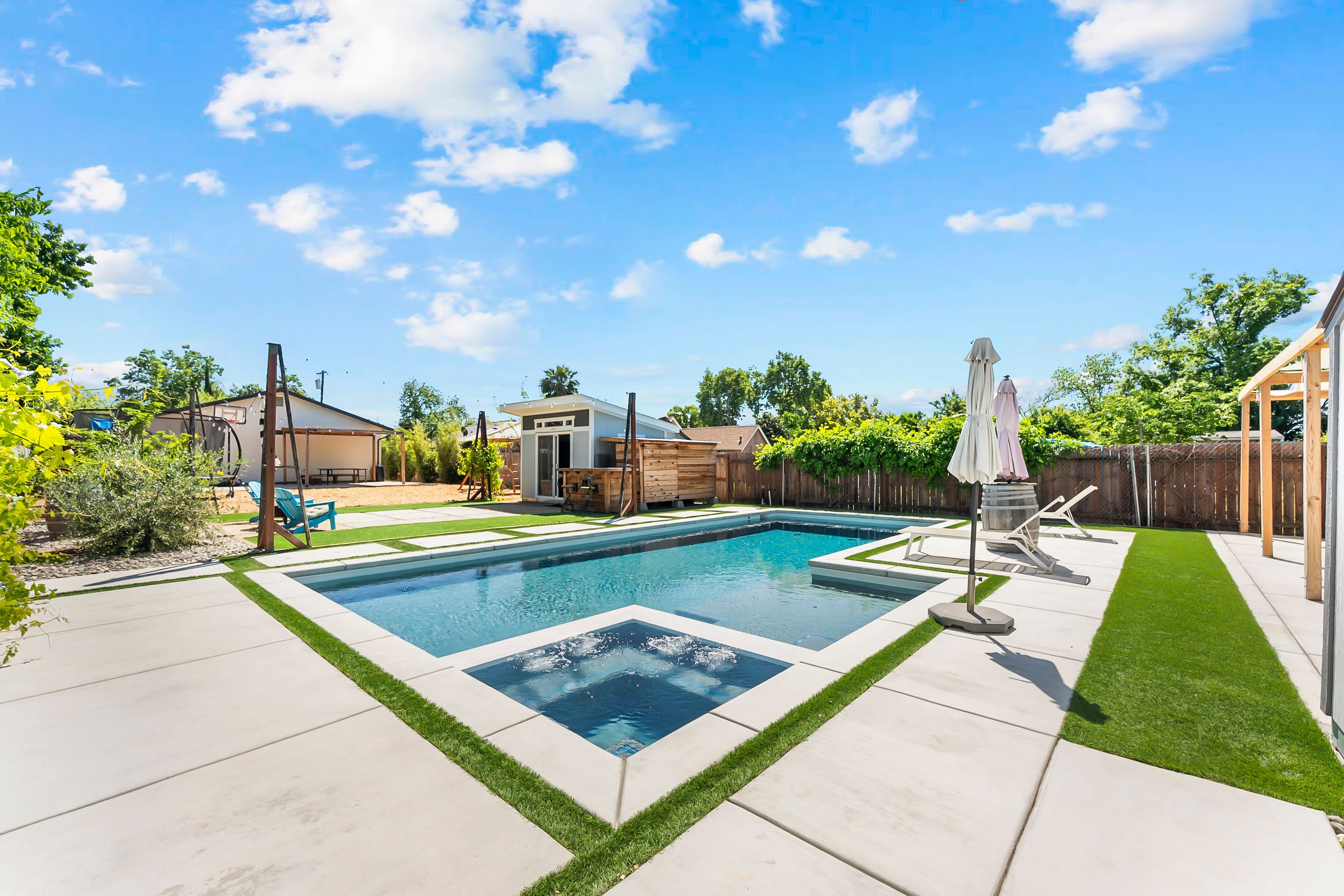 YOUR DREAM BACKYARD. Brand-new pool, freshly landscaped, detached office/home gym, basketball hoop, trampoline, and even an outdoor bathroom to keep your home (and pool) nice and clean. This property checks all the boxes for entertaining guests or for just a peaceful getaway, all in the comfort of your backyard. This 2022 Mid-Century Modern was carefully rebuilt from scratch, featuring a spacious great room with granite countertops and laminate flooring. With 3 Beds, 2 Baths, and a dream backyard, this home is turn-key and ready for you to move in.