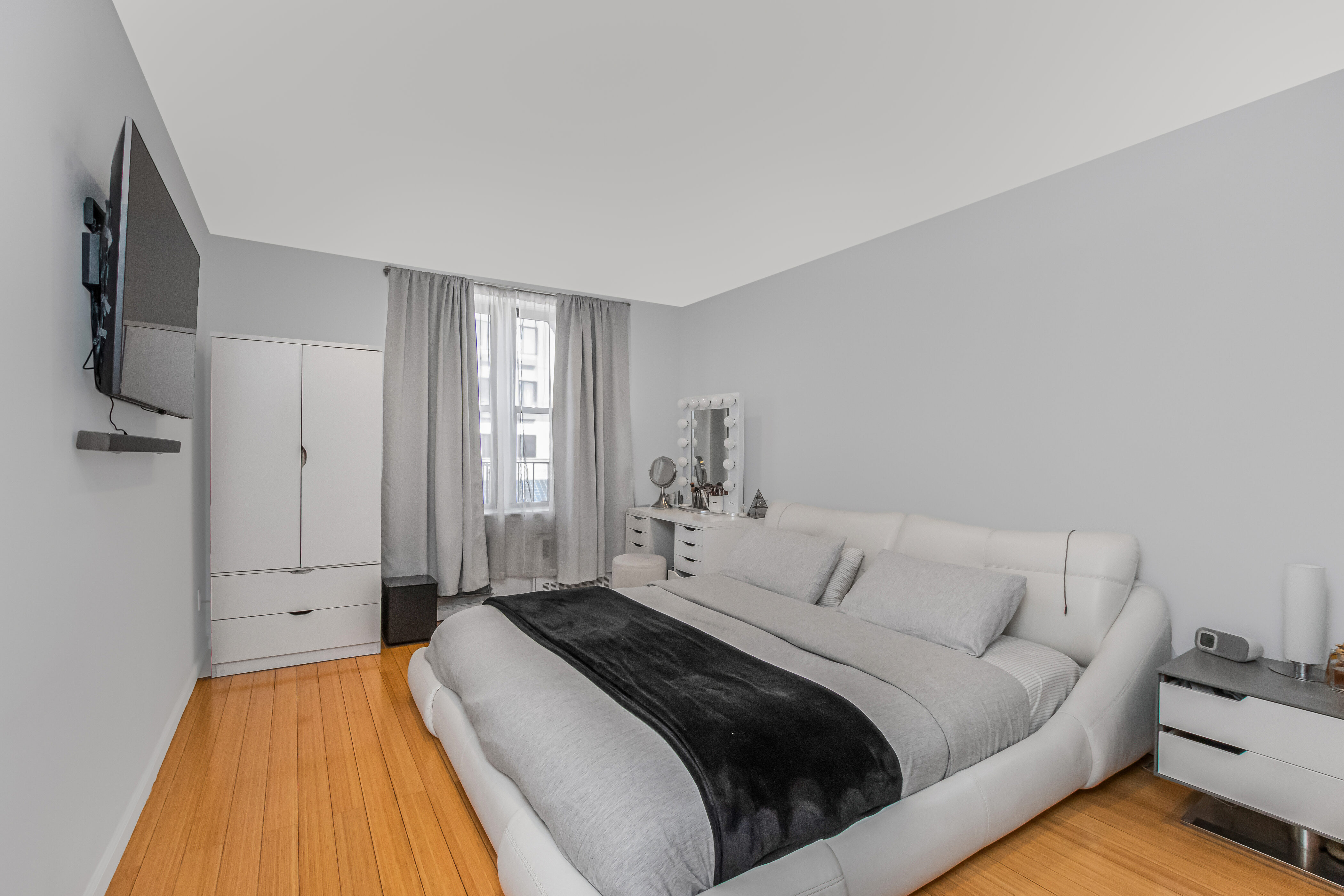 This turnkey residence features an open-concept layout with a renovated kitchen showcasing granite countertops, stainless steel appliances, and seamless flow into the expansive living area—ideal for both everyday living and entertaining. The updated bathroom adds a modern touch, while the king-size bedroom is filled with natural light and offers generous closet space. Additional highlights include recessed lighting and bamboo flooring throughout.