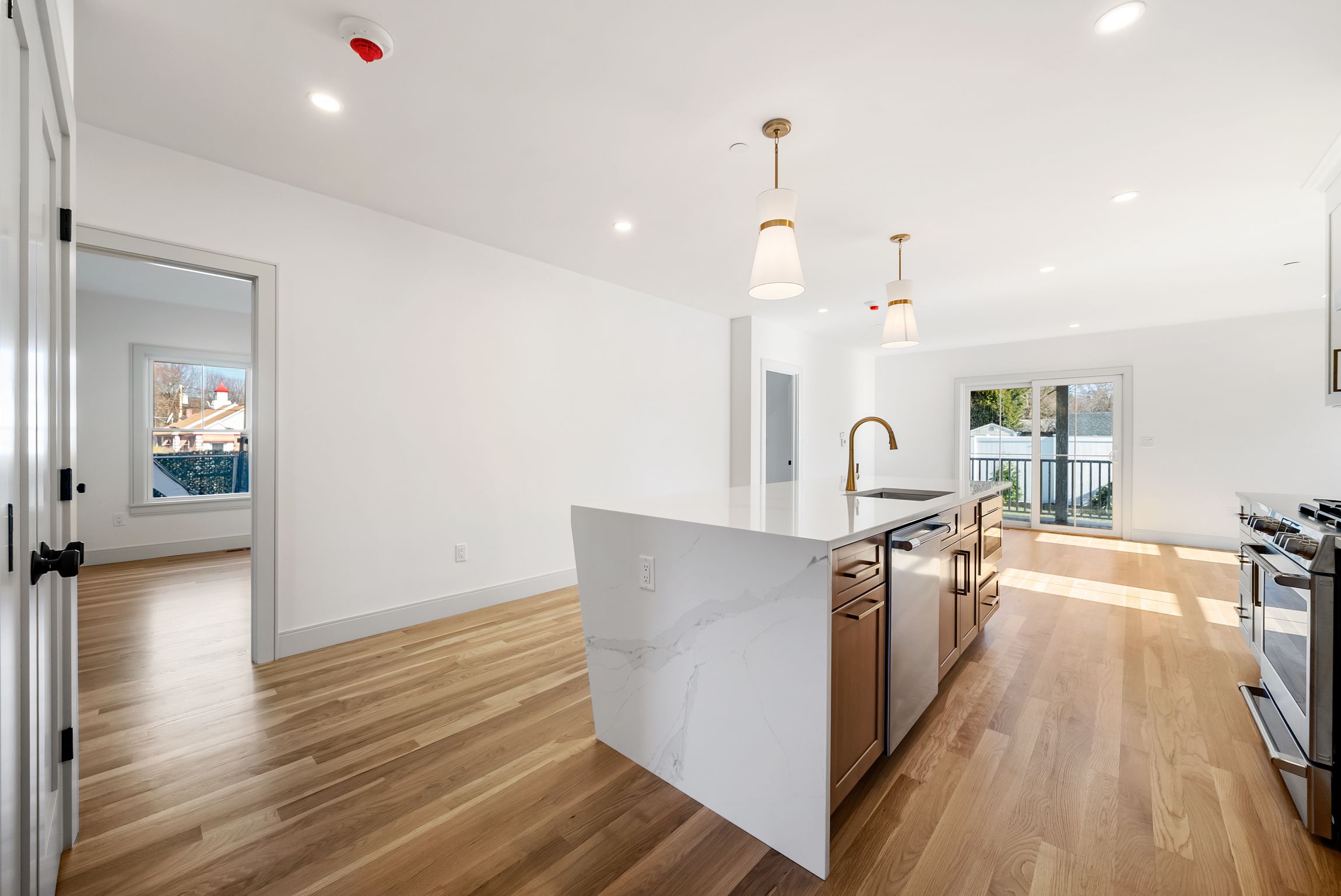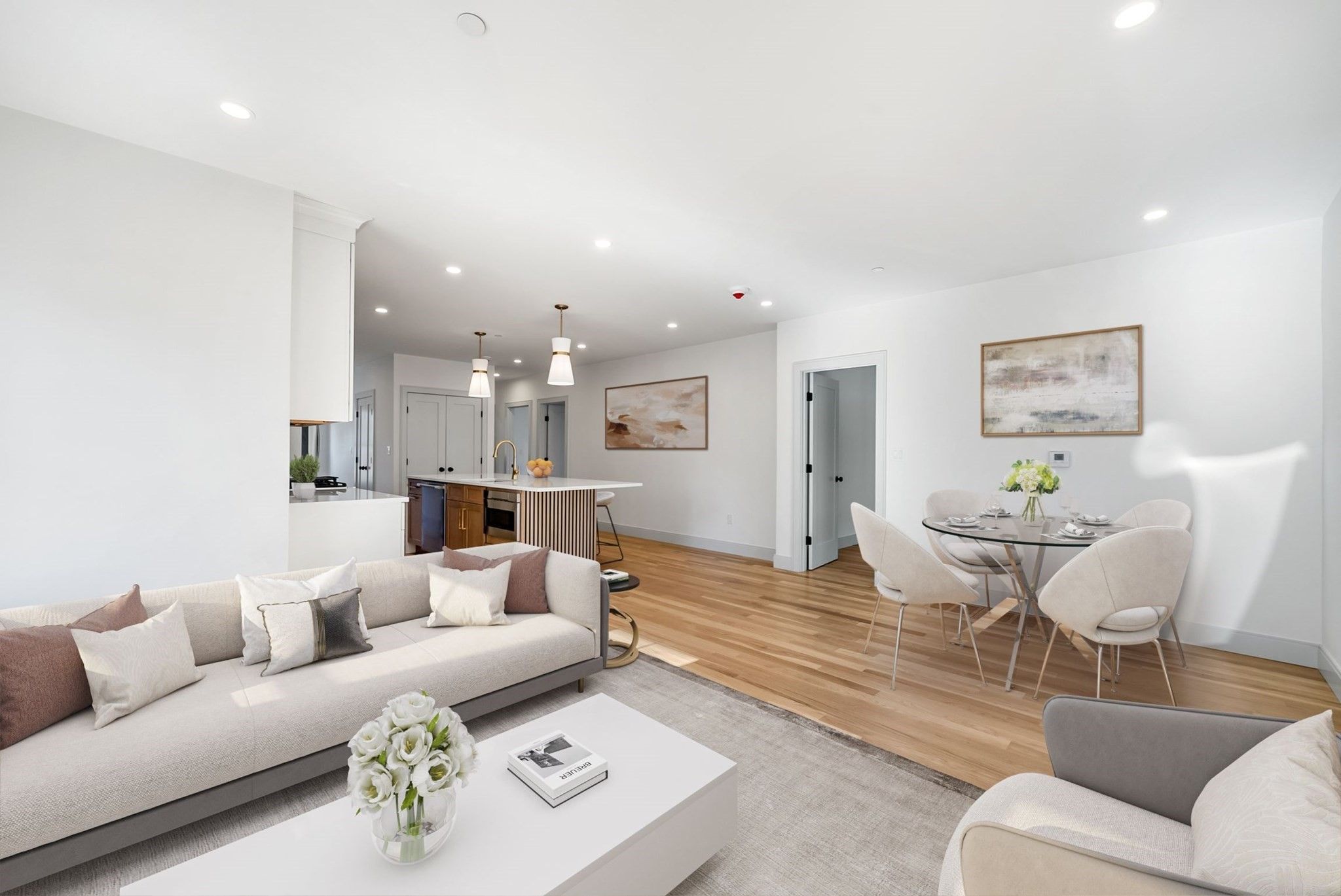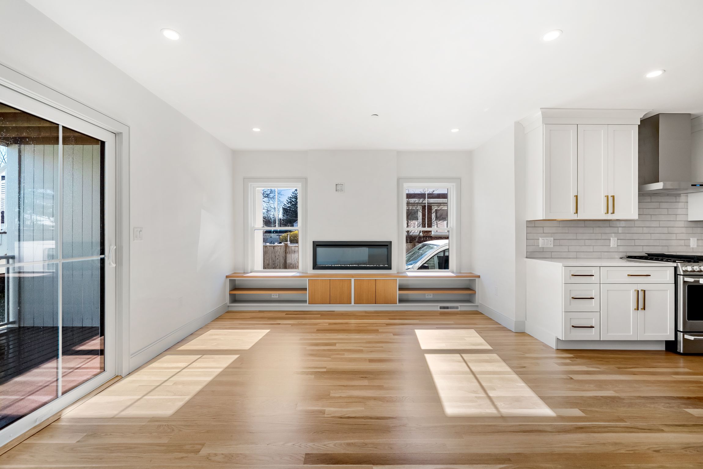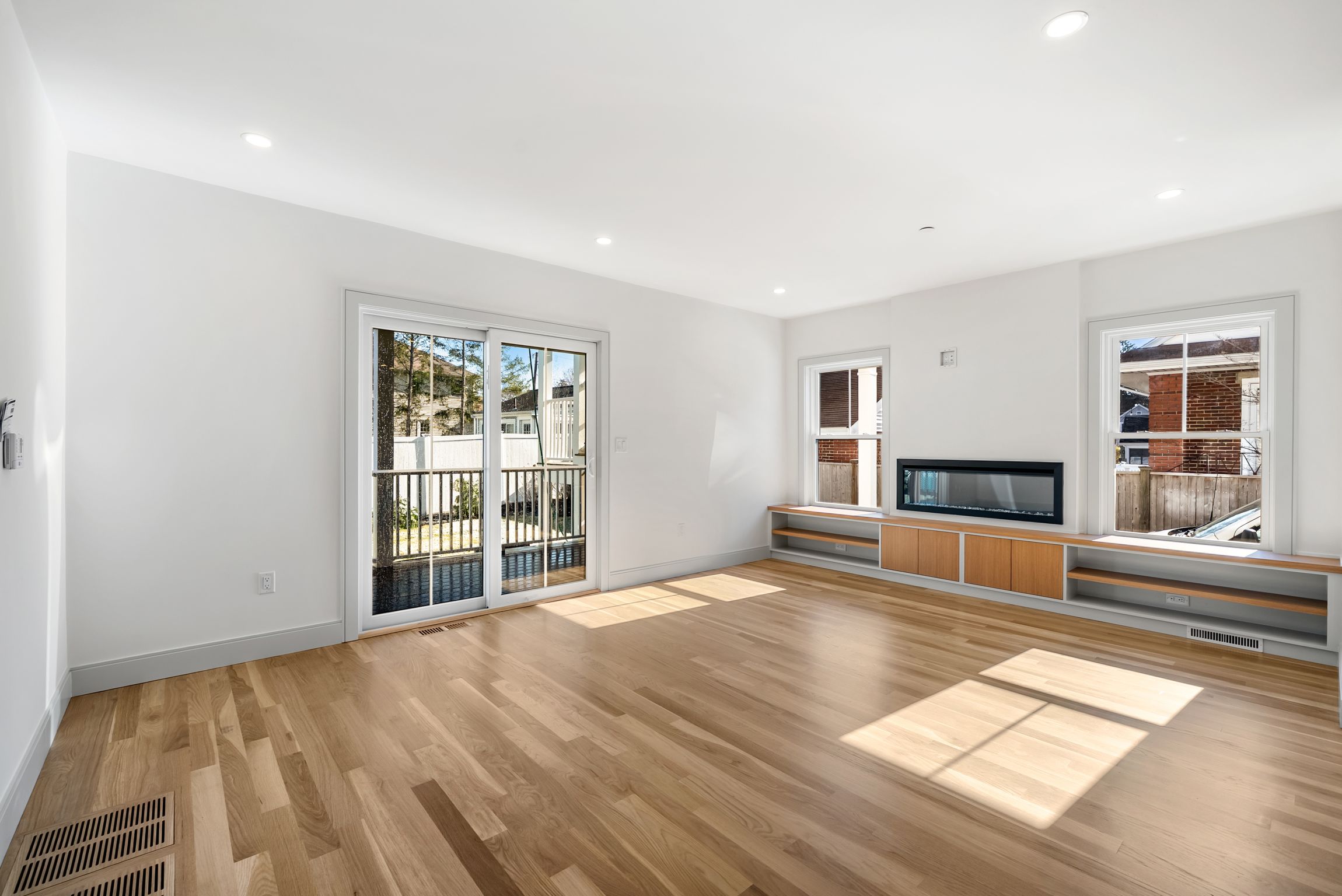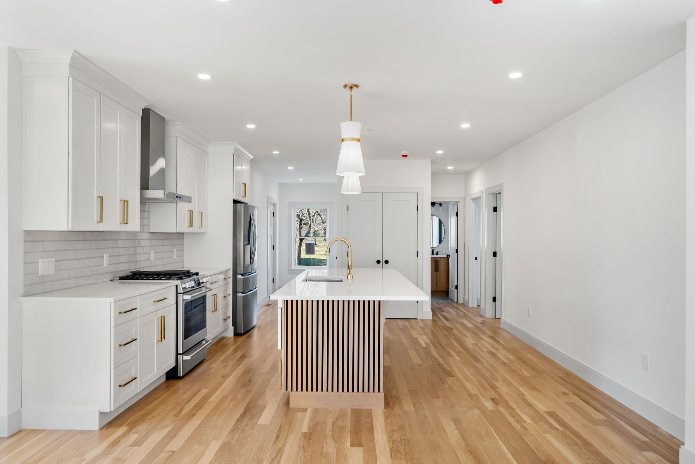 Perfectly positioned across from Spot Pond, this newly constructed three-bedroom, two-bath luxury residence offers a refined blend of elevated design and natural beauty. This direct-entry first-floor home is thoughtfully crafted with custom finishes throughout, showcasing white oak flooring, bespoke cabinetry, and elegant quartz surfaces in both the kitchen and baths. The open-concept layout is designed for modern living and effortless entertaining, highlighted by stunning custom-designed living room built-ins anchored by a sleek, modern fireplace. A private ~200 sq ft deck extends the living space outdoors, while select rooms capture partial pond views, bringing a serene backdrop indoors. Ideally located just moments from the trails of Middlesex Fells Reservation and Stone Zoo, with convenient access to Interstate 93, this residence offers an exceptional lifestyle of both tranquility and connectivity complete with two off-street parking spaces and dedicated storage.