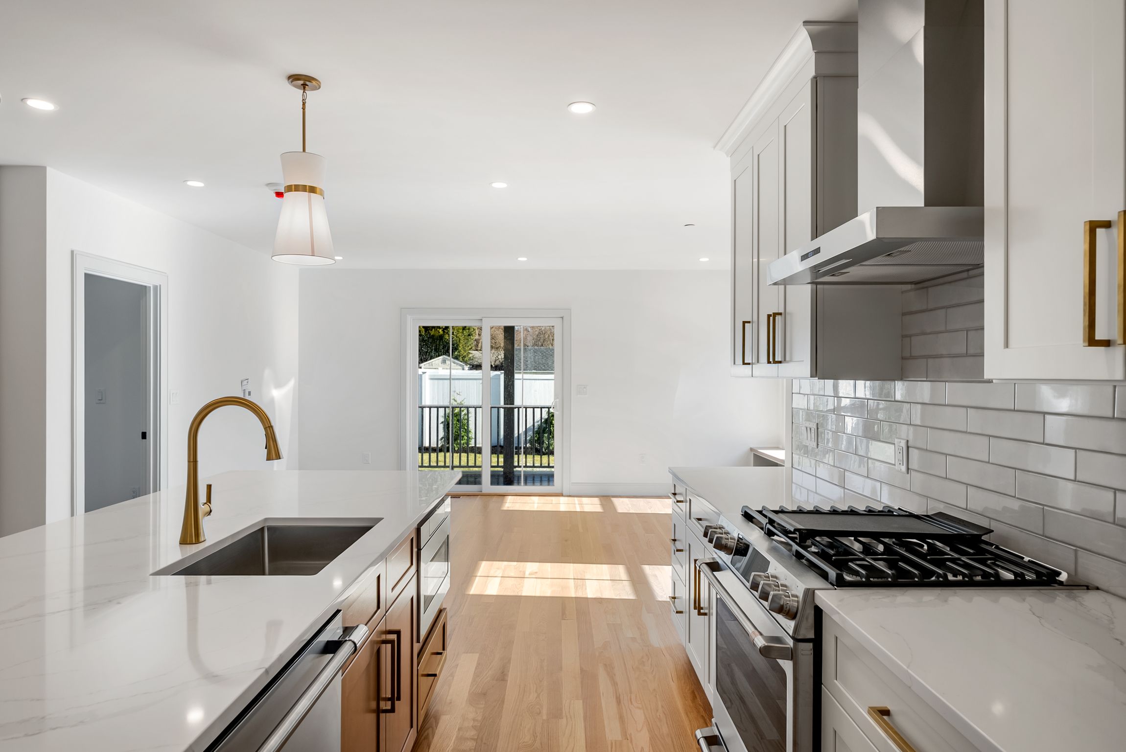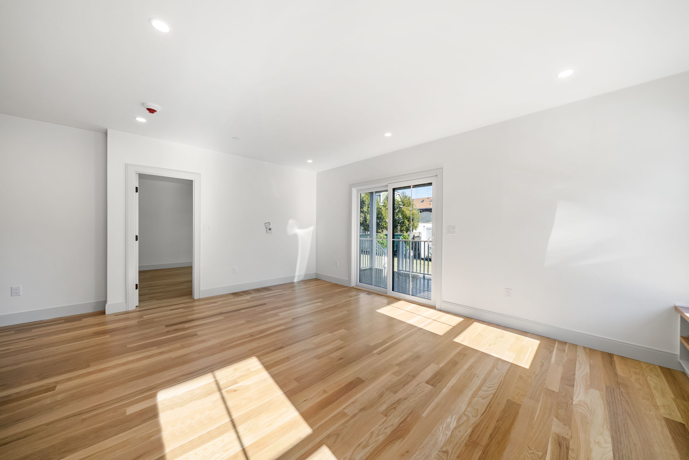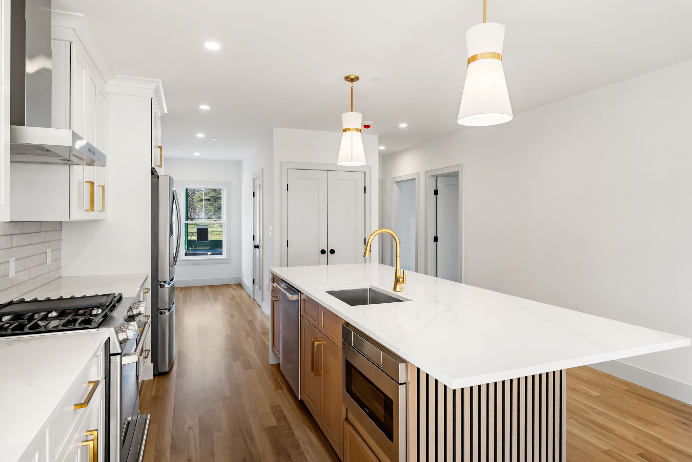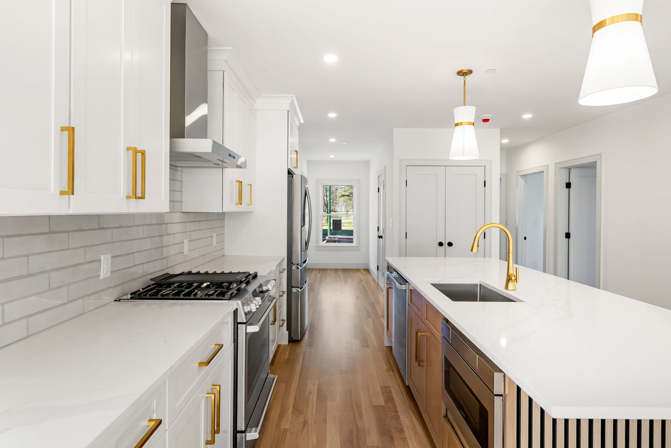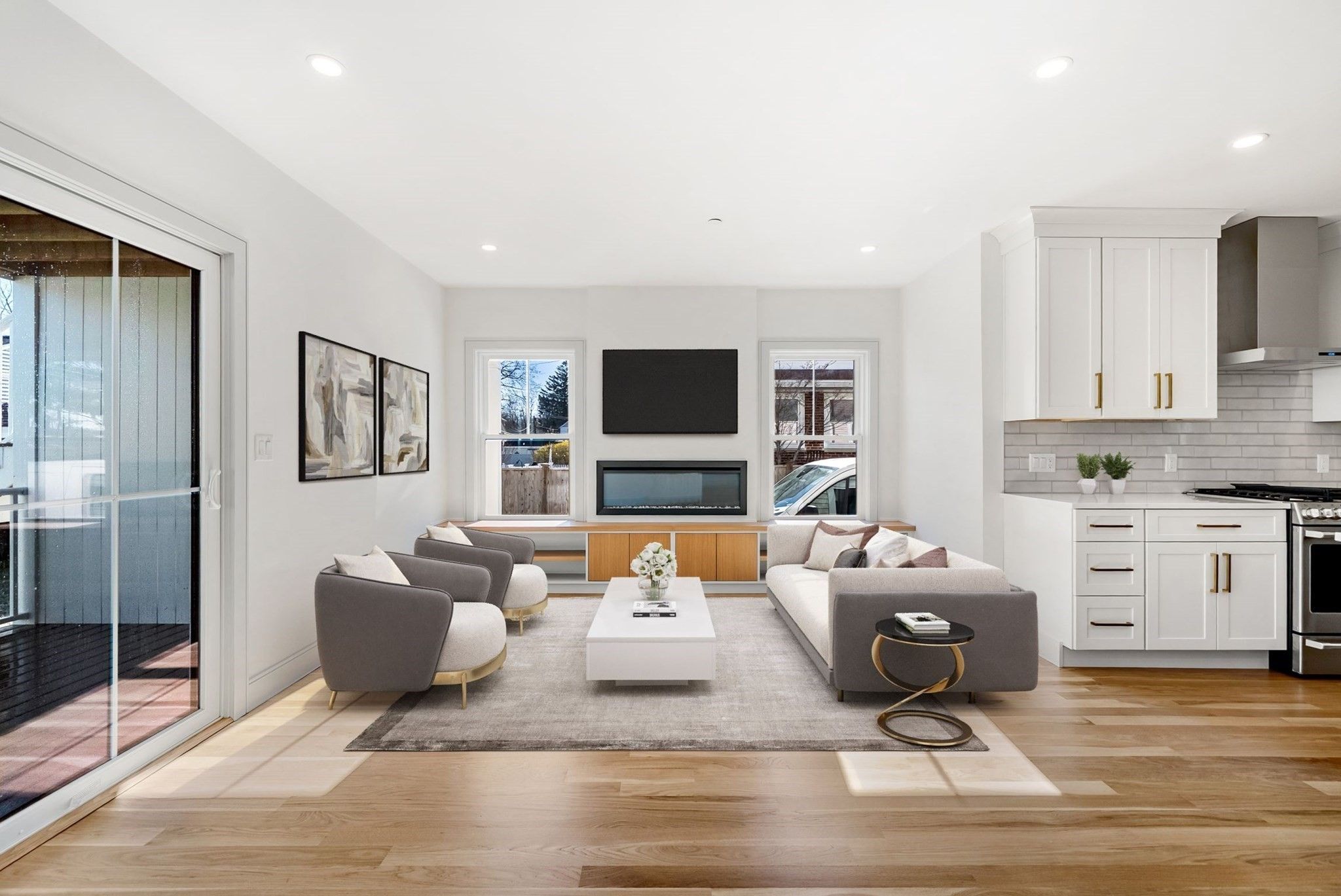 Perfectly positioned across from Spot Pond, this newly constructed three-bedroom, two-bath luxury residence offers a refined blend of elevated design and natural beauty. This direct-entry first-floor home is thoughtfully crafted with custom finishes throughout, showcasing white oak flooring, bespoke cabinetry, and elegant quartz surfaces in both the kitchen and baths. The open-concept layout is designed for modern living and effortless entertaining, highlighted by stunning custom-designed living room built-ins anchored by a sleek, modern fireplace. A private ~200 sq ft deck extends the living space outdoors, while select rooms capture partial pond views, bringing a serene backdrop indoors. Ideally located just moments from the trails of Middlesex Fells Reservation and Stone Zoo, with convenient access to Interstate 93, this residence offers an exceptional lifestyle of both tranquility and connectivity complete with two off-street parking spaces and dedicated storage.