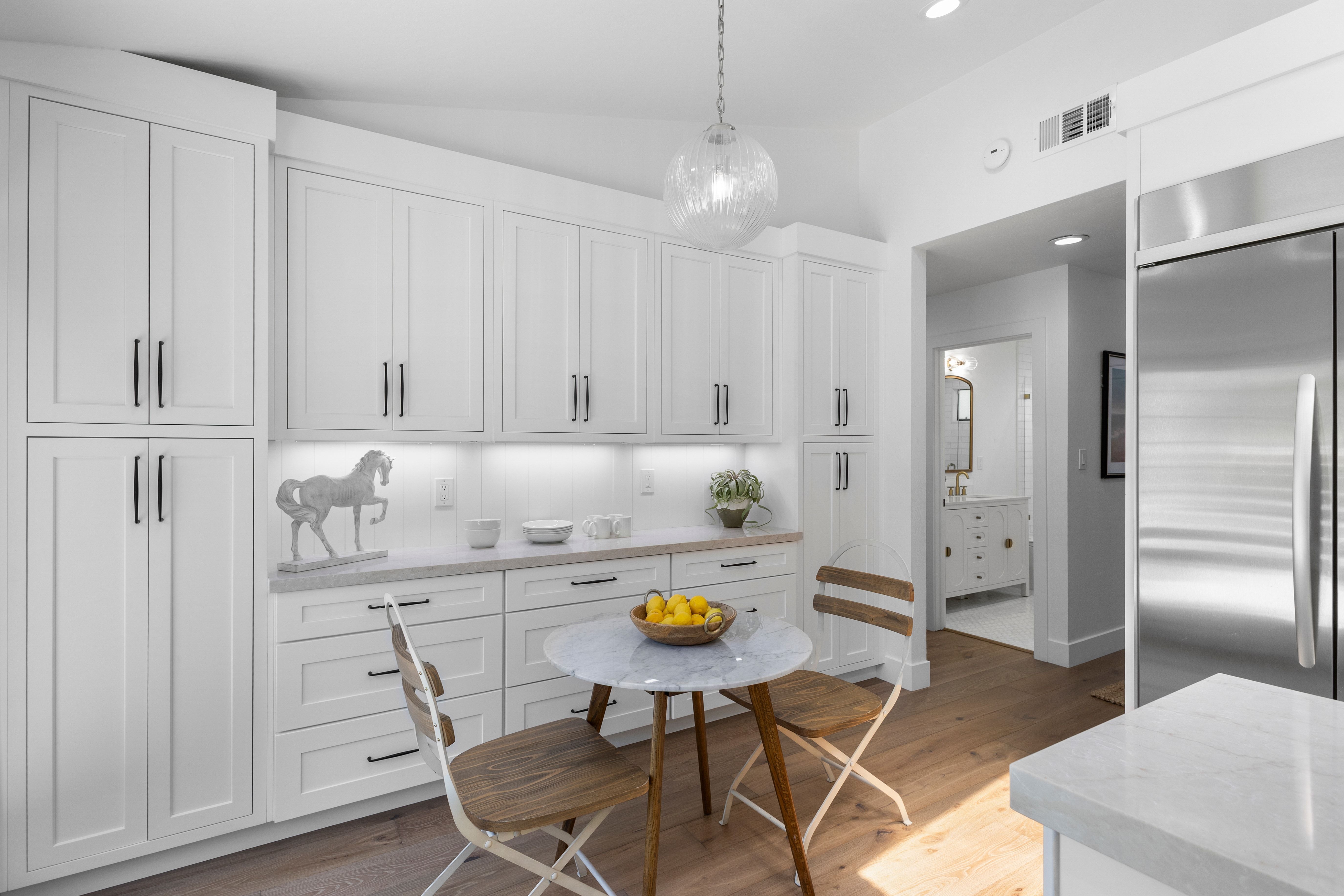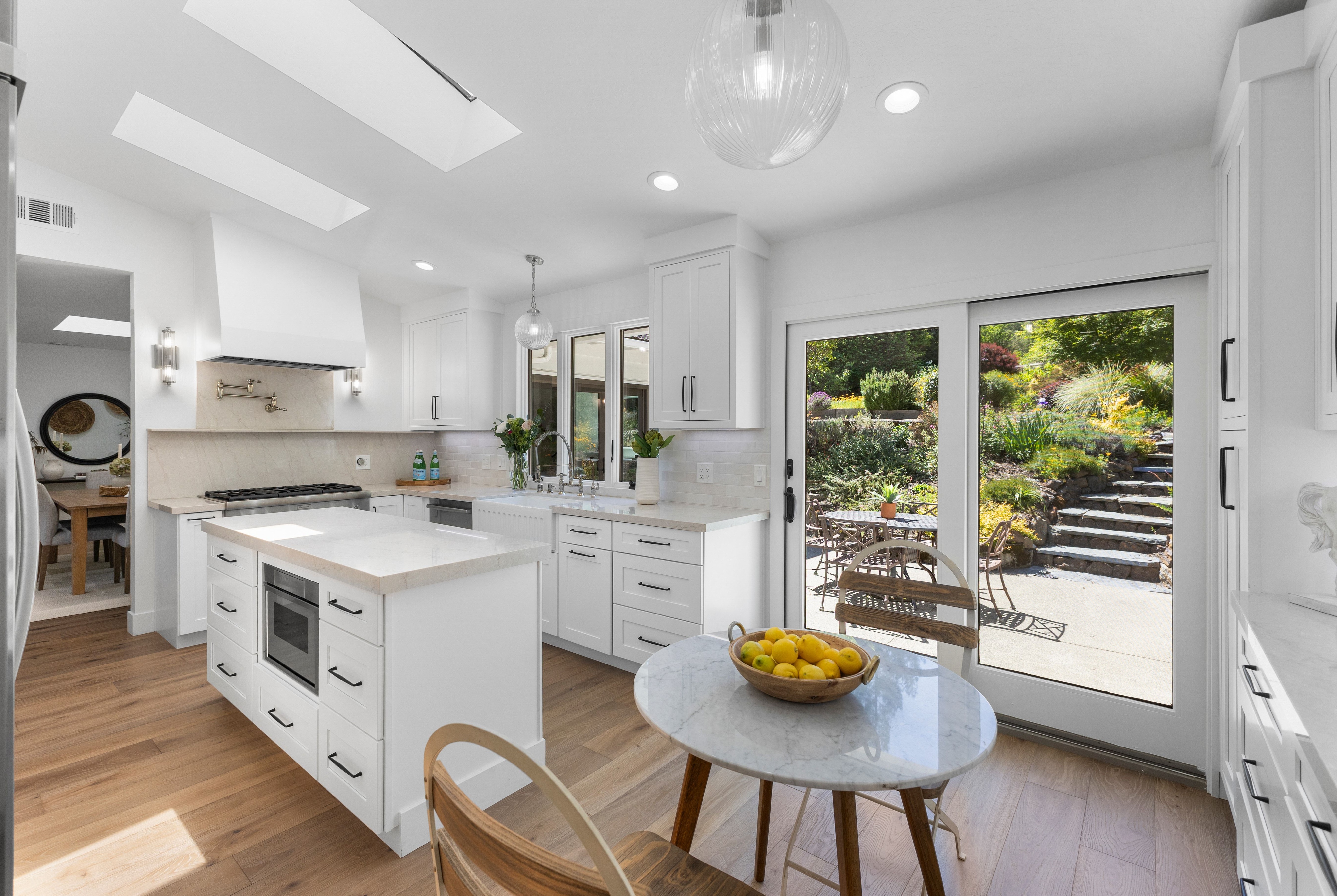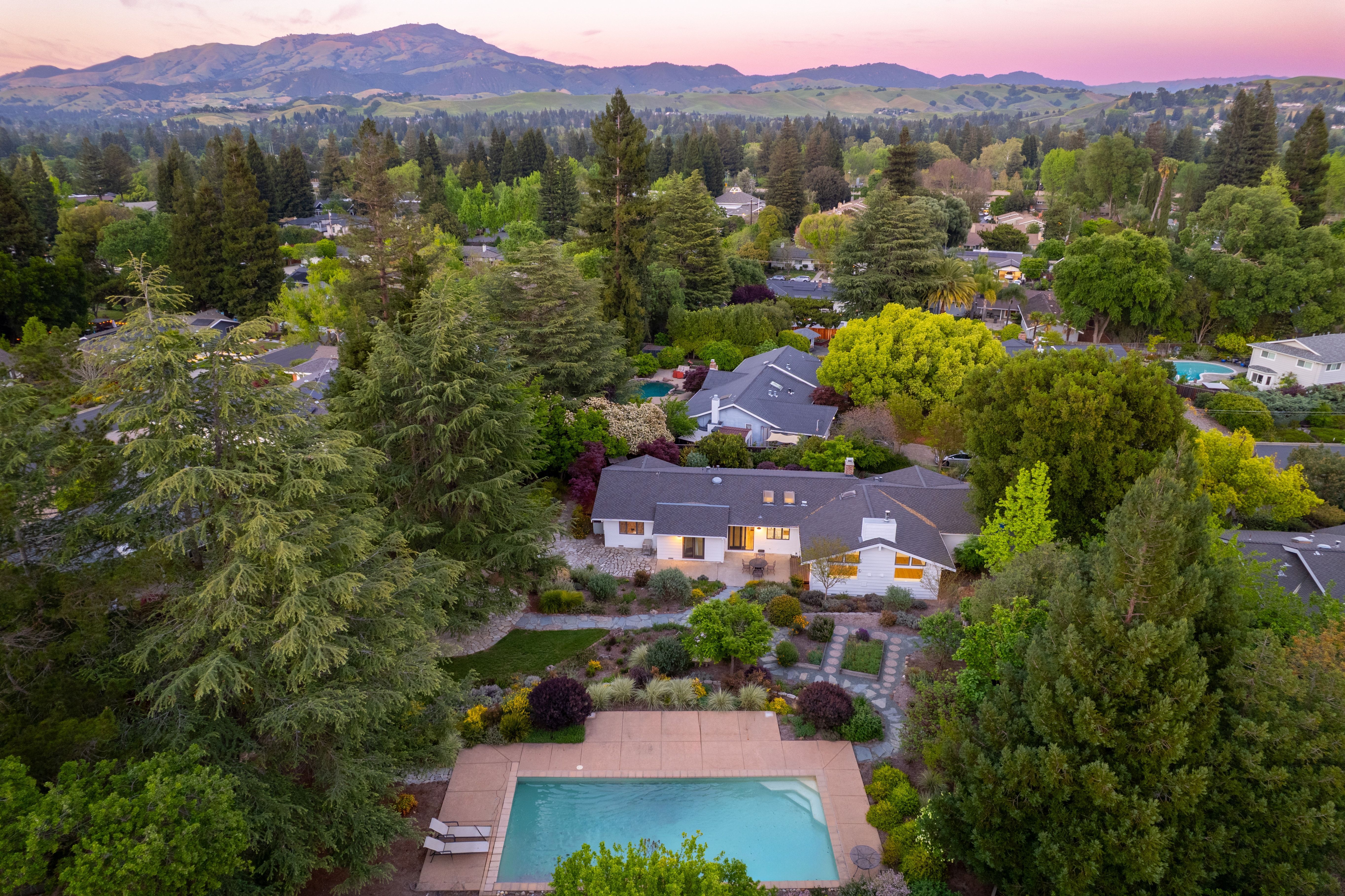 Prime Westside Danville court location on a rare 0.60± acre lot. This completely renovated residence blends quality craftsmanship with thoughtful design throughout. The custom kitchen features bespoke cabinetry, Taj Mahal quartzite slab countertops, a Thermador range, designer pendant lighting, and a custom tile backsplash. Bathrooms have been finished with high-end tile work, including a luxurious primary suite with a spacious stall shower, custom vanity, and heated towel warmer. Hardwood flooring runs throughout the home, enhancing the warm, cohesive feel. Additional improvements include new designer lighting fixtures throughout, fresh interior and exterior paint, and new interior doors. The expansive family room opens seamlessly to a resort-style backyard with pool and multiple walking paths, creating a private setting ideal for both everyday living and entertaining. A detached casita offers flexible space for a home office or gym. A rare opportunity in one of Danville’s most sought-after Westside locations.