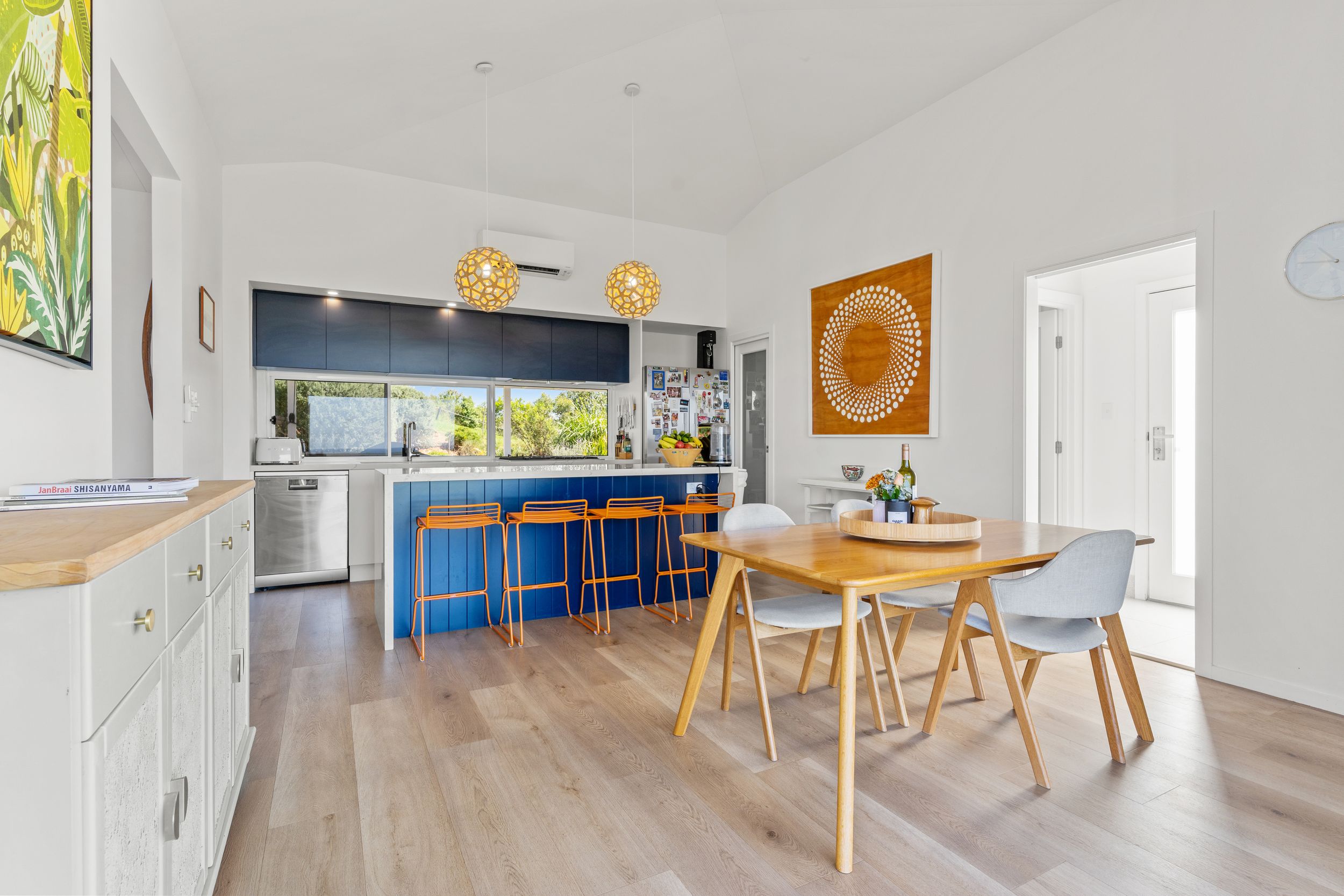 – Designer kitchen with navy cabinetry, stone benchtops, timber accents and statement pendant lighting