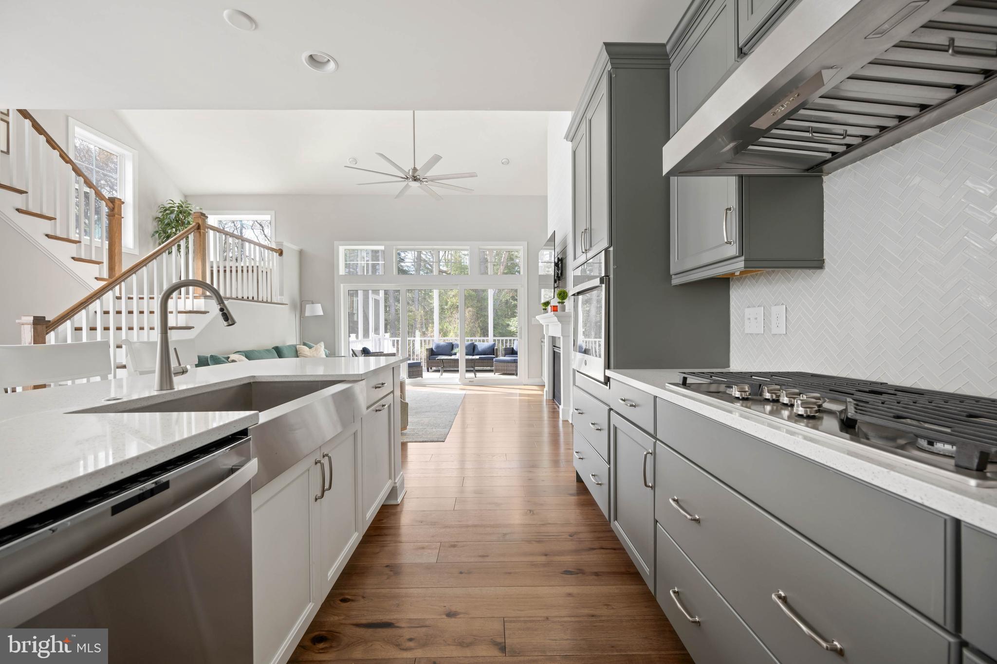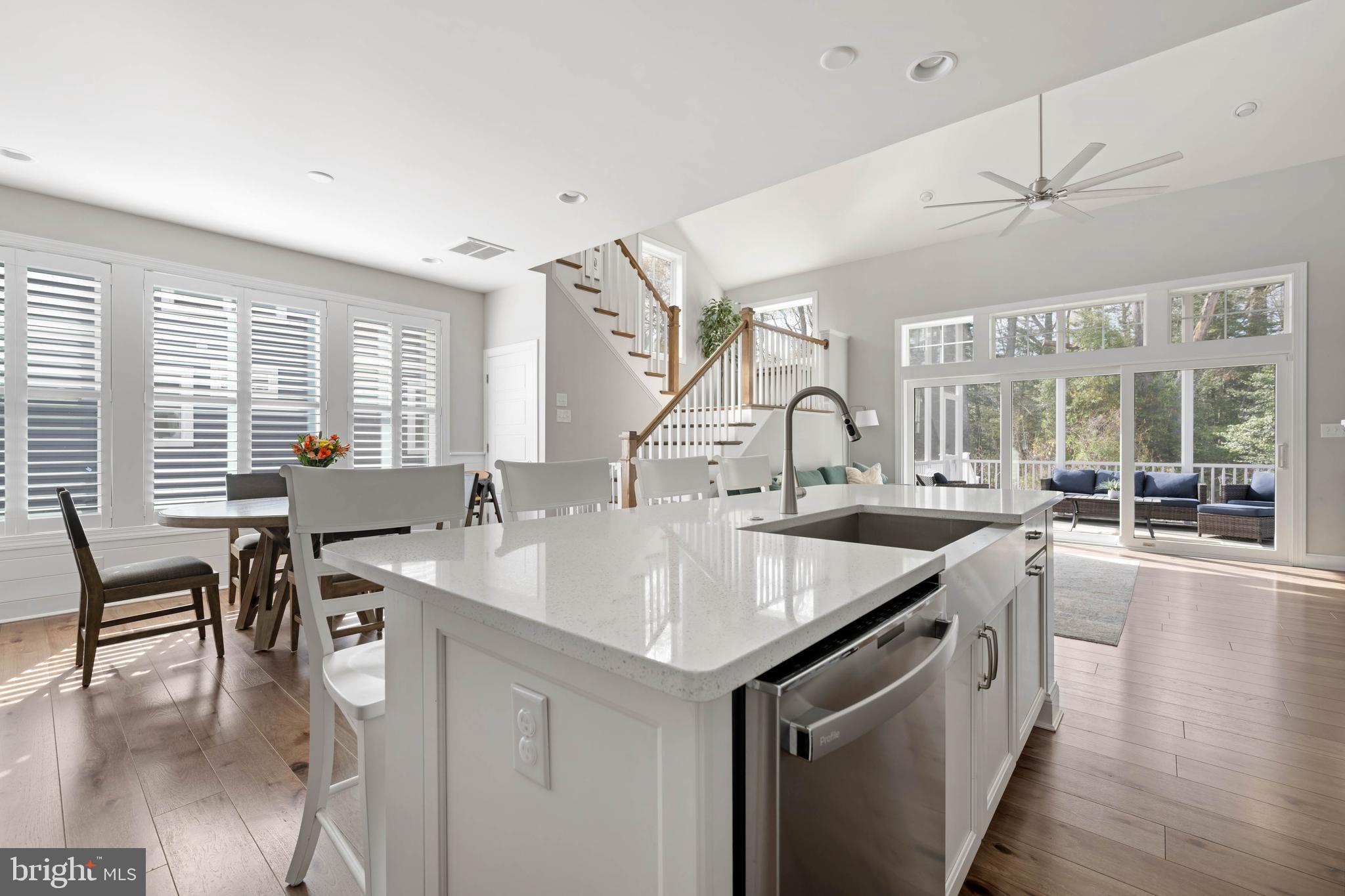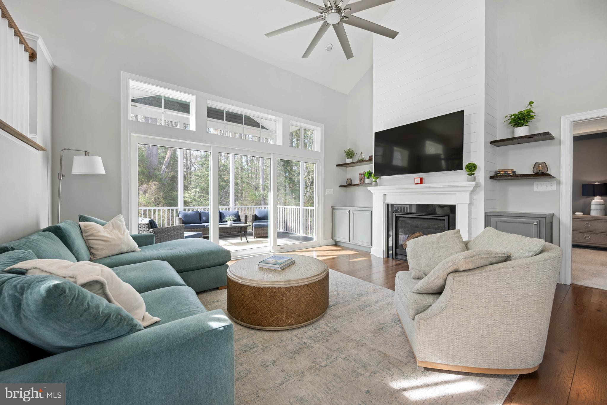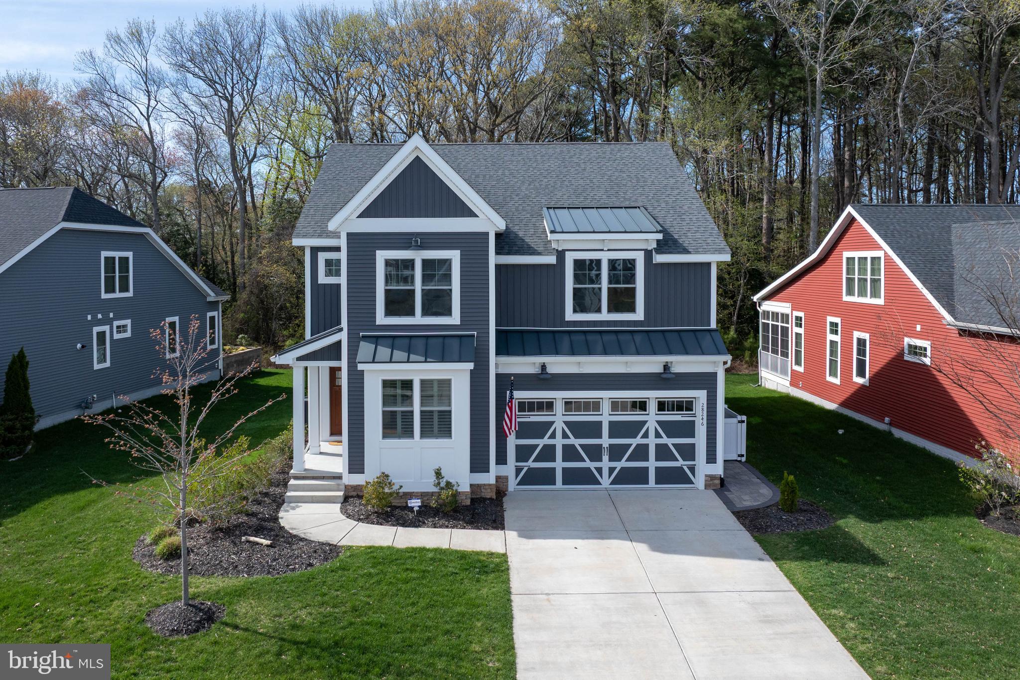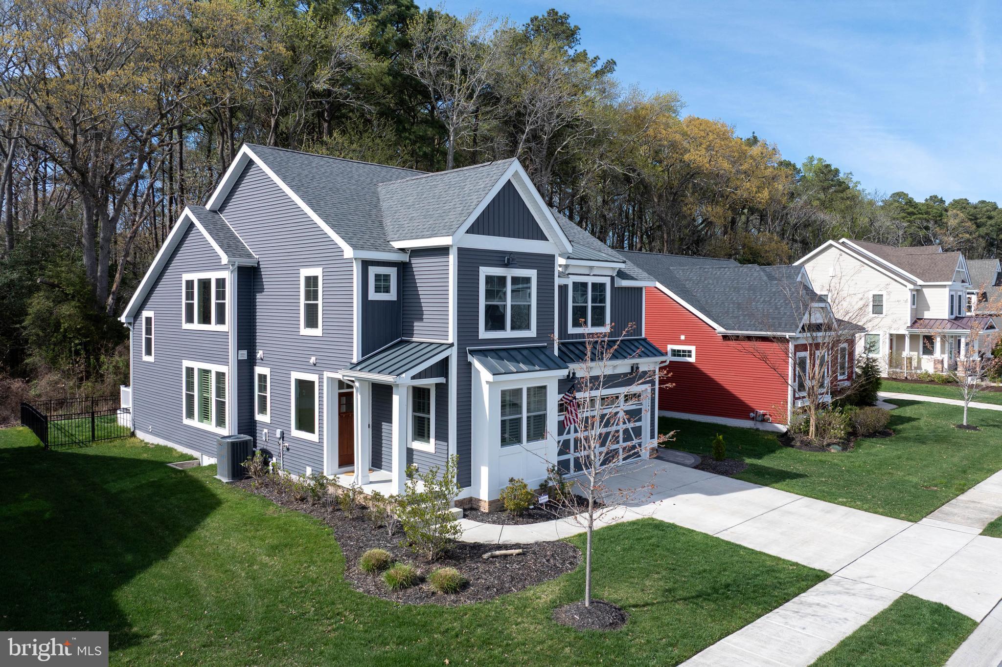 Built in 2021, this Schell Brothers farmhouse-style home delivers a true open-concept design with a vaulted great room, fireplace, and custom live-edge shelving. A full-wall infinity slider opens to a screened porch, grilling deck, and custom courtyard featuring a smokeless fire pit, all set against a private wooded backdrop. The professional kitchen is outfitted with Profile stainless steel appliances and designed for both everyday use and entertaining. The first-floor owner's suite includes a luxury bath with extended shower, double vanity, and custom closet systems. A second private suite upstairs features a tray ceiling and oversized walk-in closet - ideal for guests or multi-generational living. Additional highlights include 4 bedrooms, 3.5 baths, a spacious loft with built-in entertainment center, unfinished storage, storage under the stairs, a laundry room with utility sink and cabinetry, fenced backyard, paver walkways, and extended garage. Located in a quiet community just 5 miles to the Delaware beaches, with a clubhouse and infinity-edge pool.