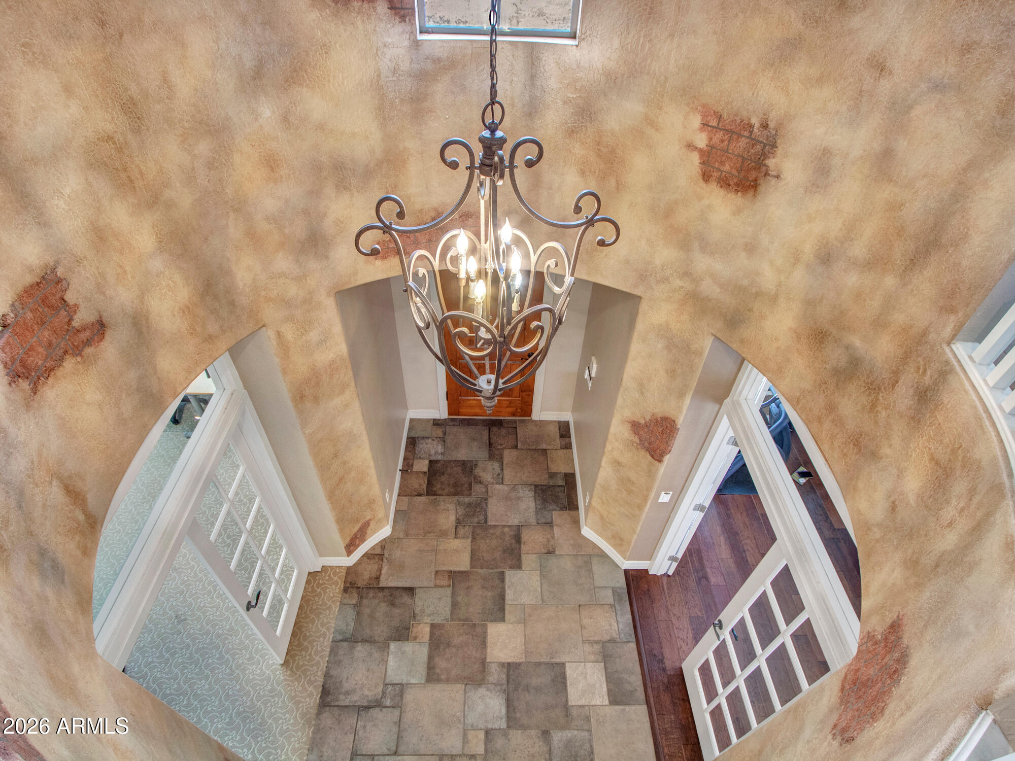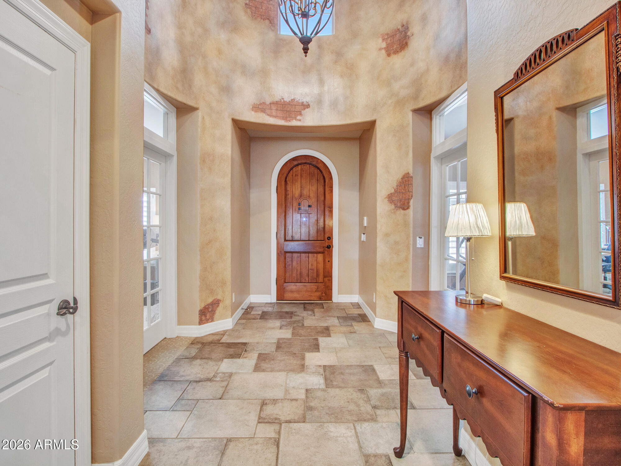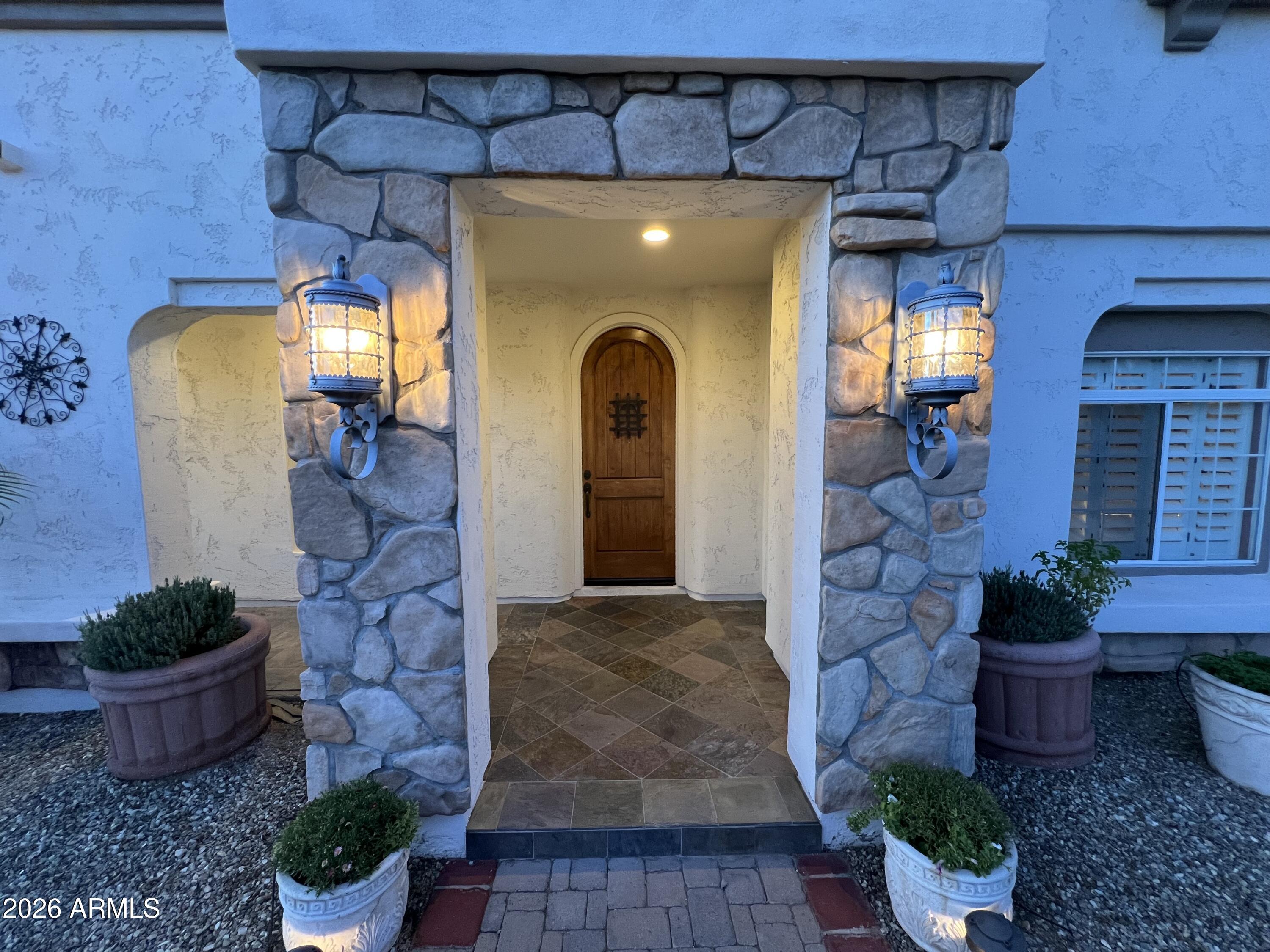 Situated on a premium 0.6-acre cul-de-sac lot siding to the greenbelt in the highly desirable gated community of Talas, this beautifully maintained and thoughtfully appointed home offers a rare combination of privacy, space, and livability inside and out. The setting is exceptionally quiet and peaceful, with no through traffic and limited surrounding traffic flow--yet just minutes from the 101, shopping, dining, hiking trails, and top-rated schools. The home offers striking curb appeal, enhanced by mature trees and custom landscape lighting that creates a stately yet inviting first impression--especially in the warm glow of the evening. The layout is designed for both everyday comfort and effortless entertaining. A dramatic two-story circular entry welcomes you inside and sets the tone for the home's spacious, well-designed interior. The chef's kitchen features gas cooking with a vented range hood, double ovens with a warming drawer, stainless steel appliances, and a custom travertine backsplash. Extensive cabinetry with roll-outs and a 13-foot butler's pantry provide exceptional storage, while the large island and generous eat-in space create a natural gathering point. The kitchen opens seamlessly to the family room with a gas fireplace, extending the central living area. A formal dining room, along with a front living room and private first-floor office/den with French doors, offers flexibility for entertaining, work, or quiet retreat. Upstairs, a wide central hall leads to the spacious primary suite--a private escape with its own gas fireplace, large bath with dual vanities, soaking tub, walk-in shower, generous closet, and a private deck with mountain views and spectacular sunsets. Also upstairs are three additional bedrooms--one with an en suite bath, and the other two adjoined by a Jack-and-Jill bathroom with a double vanity--all with new carpet. A large bonus room completes the upstairs, providing additional flexible living space ideal for media, play, or fitness. Back downstairs, French doors off the family room and kitchen open onto a large, covered patio with a built-in gas grill, creating a seamless indoor-outdoor flow. A sparkling pool with attached spa, kiddie pool, and playful water feature enjoy their own distinct space, surrounded by an expansive cool deck enclosed by wrought iron fencing. A serene west-facing courtyard provides an additional outdoor living area. The oversized lot and greenbelt adjacency enhance both privacy and open space, with beautiful sunset views to the west, while mature shade trees and custom landscape lighting further contribute to the resort-like feel of this inviting, tranquil setting. A separate detached back garage--insulated and finished, with a large window and overhead door, and wired for 220V service--offers exceptional additional flexible space for hobbies, creative use, storage, or whatever you envision. Additional features include recessed lighting, ceiling fans, plantation shutters throughout, a separate laundry room on the main level with ample storage, and five-channel surround sound pre-wired in the family room, primary bedroom, and upstairs bonus room. A rare opportunity to own a spacious, well-located home with exceptional indoor-outdoor living in one of North Peoria's most desirable gated communities.