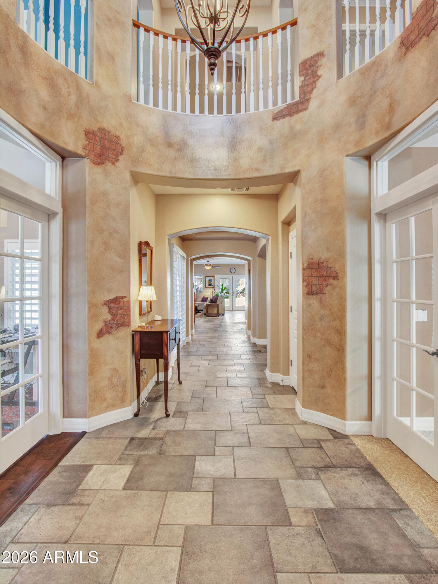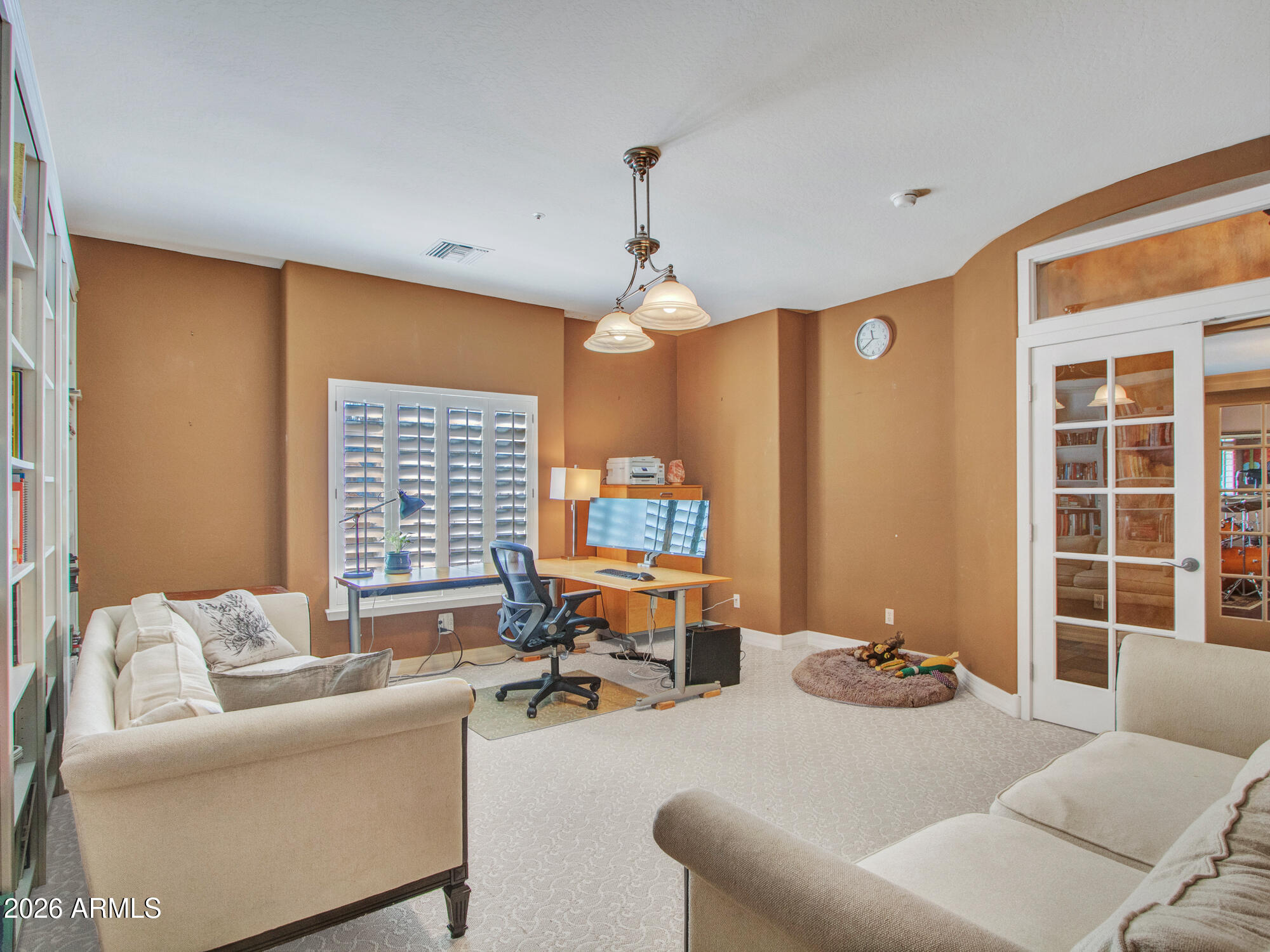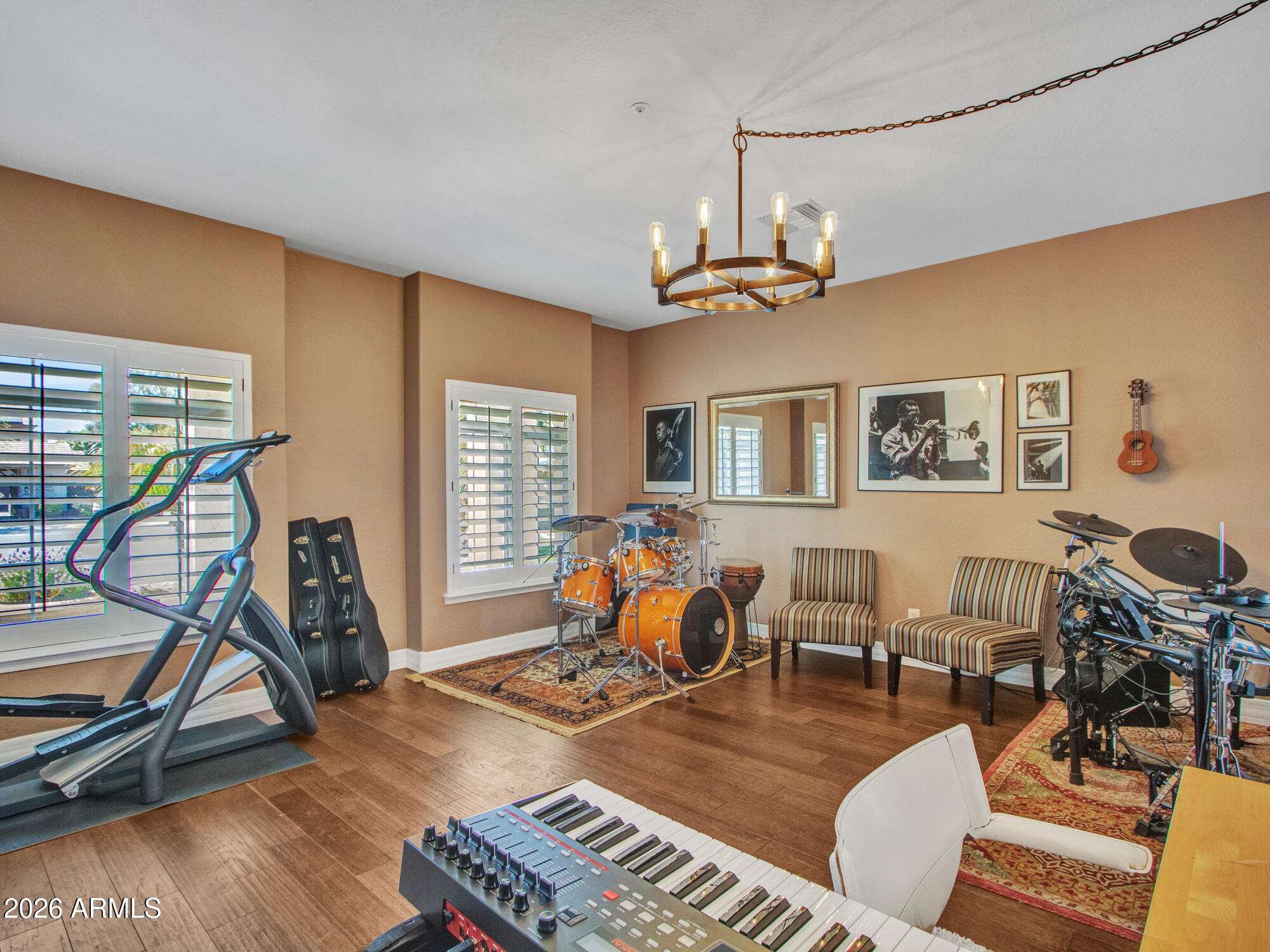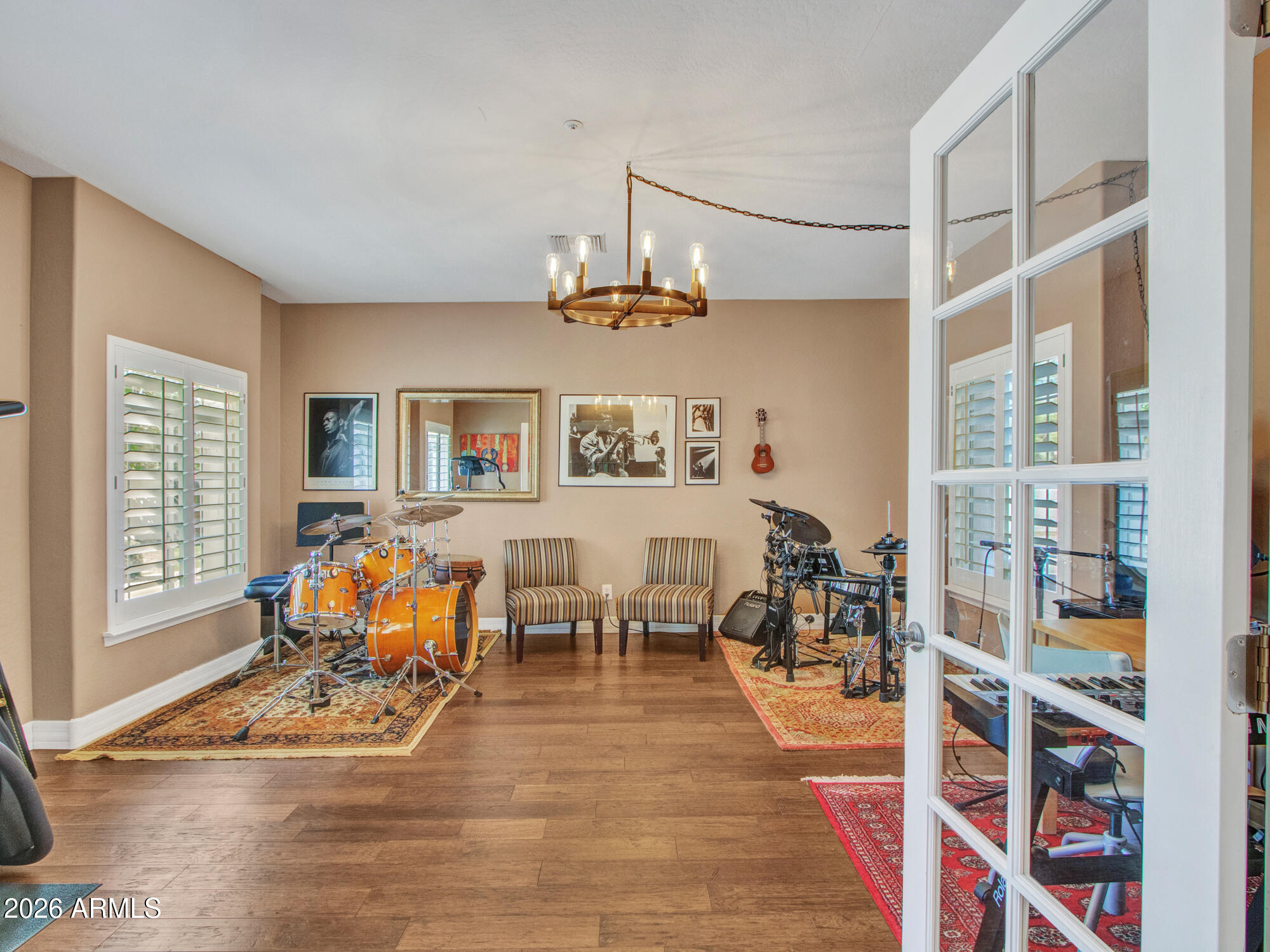 Situated on a premium 0.6-acre cul-de-sac lot siding to the greenbelt in the highly desirable gated community of Talas, this beautifully maintained and thoughtfully appointed home offers a rare combination of privacy, space, and livability inside and out. The setting is exceptionally quiet and peaceful, with no through traffic and limited surrounding traffic flow--yet just minutes from the 101, shopping, dining, hiking trails, and top-rated schools. The home offers striking curb appeal, enhanced by mature trees and custom landscape lighting that creates a stately yet inviting first impression--especially in the warm glow of the evening. The layout is designed for both everyday comfort and effortless entertaining. A dramatic two-story circular entry welcomes you inside and sets the tone for the home's spacious, well-designed interior. The chef's kitchen features gas cooking with a vented range hood, double ovens with a warming drawer, stainless steel appliances, and a custom travertine backsplash. Extensive cabinetry with roll-outs and a 13-foot butler's pantry provide exceptional storage, while the large island and generous eat-in space create a natural gathering point. The kitchen opens seamlessly to the family room with a gas fireplace, extending the central living area. A formal dining room, along with a front living room and private first-floor office/den with French doors, offers flexibility for entertaining, work, or quiet retreat. Upstairs, a wide central hall leads to the spacious primary suite--a private escape with its own gas fireplace, large bath with dual vanities, soaking tub, walk-in shower, generous closet, and a private deck with mountain views and spectacular sunsets. Also upstairs are three additional bedrooms--one with an en suite bath, and the other two adjoined by a Jack-and-Jill bathroom with a double vanity--all with new carpet. A large bonus room completes the upstairs, providing additional flexible living space ideal for media, play, or fitness. Back downstairs, French doors off the family room and kitchen open onto a large, covered patio with a built-in gas grill, creating a seamless indoor-outdoor flow. A sparkling pool with attached spa, kiddie pool, and playful water feature enjoy their own distinct space, surrounded by an expansive cool deck enclosed by wrought iron fencing. A serene west-facing courtyard provides an additional outdoor living area. The oversized lot and greenbelt adjacency enhance both privacy and open space, with beautiful sunset views to the west, while mature shade trees and custom landscape lighting further contribute to the resort-like feel of this inviting, tranquil setting. A separate detached back garage--insulated and finished, with a large window and overhead door, and wired for 220V service--offers exceptional additional flexible space for hobbies, creative use, storage, or whatever you envision. Additional features include recessed lighting, ceiling fans, plantation shutters throughout, a separate laundry room on the main level with ample storage, and five-channel surround sound pre-wired in the family room, primary bedroom, and upstairs bonus room. A rare opportunity to own a spacious, well-located home with exceptional indoor-outdoor living in one of North Peoria's most desirable gated communities.