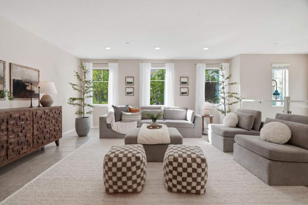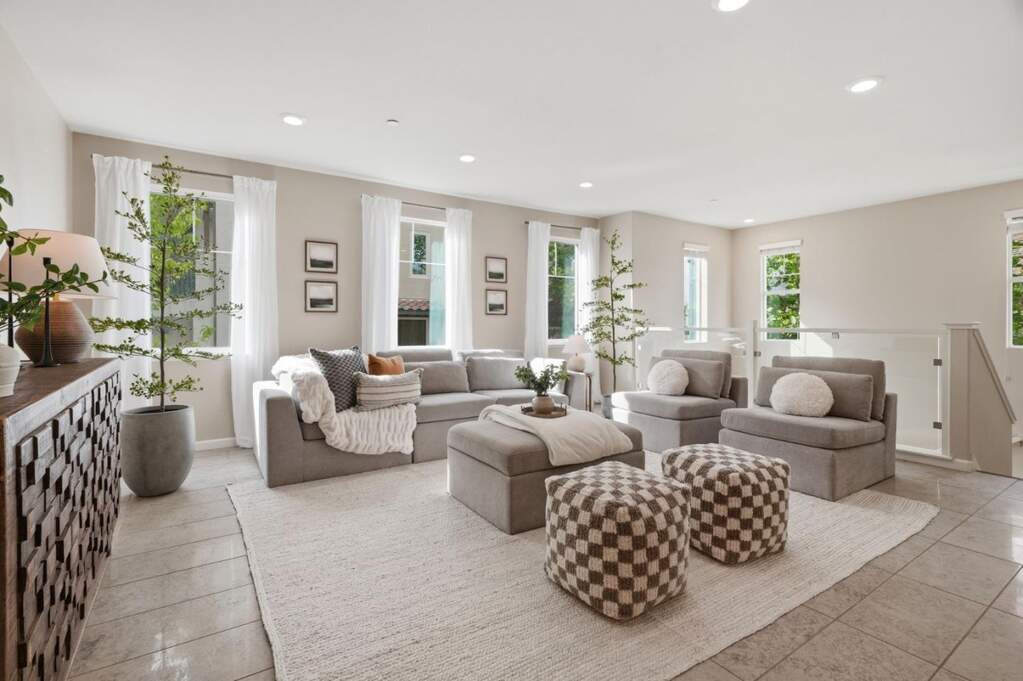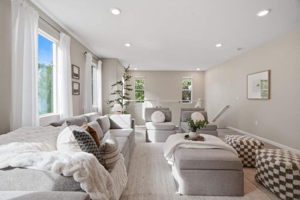Perched at the top of Communications Hill, this corner-unit condo stands out as one of the best-located homes in the community, with park views, plentiful guest parking nearby, and a sought-after two-story layout that lives larger and more comfortably than many of the three-story alternatives. The floor plan is one of the most functional in the community, beginning with a spacious entry level that includes a full bedroom and bath, a large side-by-side 2-car garage, and a generous landing area with room for the practical moments of daily life, from strollers to shoes to bags and gear. Upstairs, soaring ceilings and glass railings keep the main level feeling open, bright, and connected. A gigantic living room, dedicated dining area, and kitchen with breakfast bar and pantry create exceptional common space for both daily living and entertaining, while two additional bedrooms and two full bathrooms complete the upper level. The private balcony overlooks the park, and the home is ideally located near the overlook bench and scenic trails while still feeling tucked within the community. Additional features include central heat and A/C, dual-pane windows, water softener, EV wiring, & excellent access to Caltrain, light rail, major highways, DT San Jose, DT Willow Glen, and SJC.