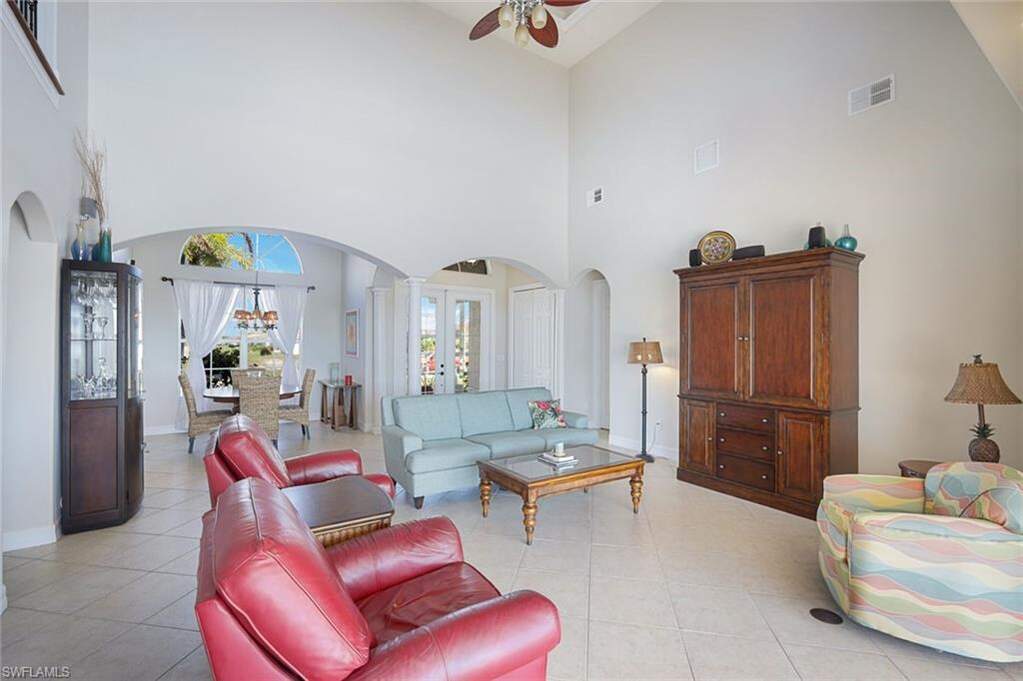 If you value privacy, deep wide water canal with no bridges to world class fishing and beaches, beautiful sunsets in a custom-built one-of-a-kind home this can be yours. Located on the spreader "rim" canal across from a state preserve, no structures will ever be built to obstruct your view or privacy. The home has an east-west exposure to enjoy world class sunsets and experience the Florida lifestyle. Enjoy a short 20-minute boat ride to Matlacha and open water with no bridges. This one owner home is built with quality throughout, the home is thoughtfully designed and features a grand great room with soaring 20-foot ceilings and views straight out to the water. The main bedroom is located on the first floor for easy living. The kitchen features wood cabinets, pull outs with dovetail drawers and & "blue eye" exotic granite counter tops. Upstairs there is another living area and a large, screened balcony to overlook the water and watch the eagle soar. Outdoors there is a large pool area with brick paver decking, great for watching dolphin and manatee swim. Cruise to the gulf - no bridges from the dock with a 10,000-pound lift. The home features a tile roof that was replaced in 2022 as well as a three-car garage. The home has always been high and dry. There are impact windows upstairs and shutters which provide you with peace of mind for the future. If you are tired of the modern white boxes and looking for a charming home with some individuality, come see this home. This currently the lowest priced home on the spreader canal! Don't miss the opportunity to come and live your dream.