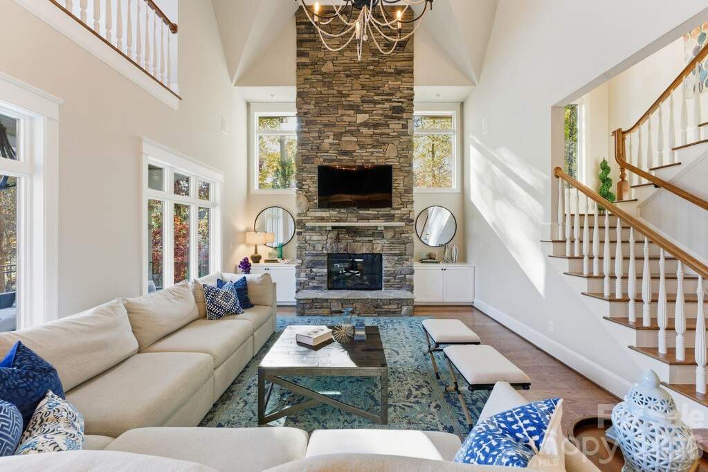 Experience the pinnacle of Lake Norman living in this stunningly reimagined estate, perfectly positioned within the prestigious community of The Point at Trump National Golf Course. This meticulously maintained stucco and stone residence has been transformed into a private resort experience, blending sophisticated modern updates with an unmatched waterfront lifestyle. The exterior serves as a true sanctuary, featuring a rare private sandy beach and a newly rebuilt dock complete with a dedicated sitting area and boat lift. Whether you are hosting on the expansive new balcony finished with Montalcino porcelain tile or relaxing on the travertine patio by the outdoor kitchen and hot tub, the home is designed to maximize its commanding water views and exceptional privacy. The interior reflects a commitment to high-end design, beginning with an inviting foyer that leads to an executive office featuring a gas fireplace and an elegant coffered ceiling. The heart of the home opens into a soaring two-story great room with a floor-to-ceiling stone fireplace and abundant natural light. The upscale kitchen is a culinary showpiece, featuring stylish quartz counters, coffered ceilings, and a premium appliance suite including a Wolf cooktop, double oven, and a built-in microwave drawer. This space flows seamlessly into the breakfast area and a formal dining room serviced by a refined butler's pantry. The main-level owner's suite serves as a luxurious retreat, offering a private Juliet balcony overlooking the lake and a newly completed spa-like bathroom. This sanctuary is outfitted with dual quartz vanities, a sleek glass shower, a soaking tub, and elegant herringbone tile floors with radiant heating. Upstairs, the home continues to impress with new hardwood flooring throughout, three spacious bedrooms with updated baths, a large bonus room, and a versatile loft space perfect for a home workstation. The walk-out lake level is an entertainer's dream, featuring an expansive family room anchored by a cozy fireplace and a fully equipped second kitchen and bar. This level also includes a billiard area, plenty of storage for lake essentials, and a dedicated theater room for cinematic experiences at home. Wellness is prioritized with a private exercise room and sauna, alongside a fifth guest bedroom. This property has been curated for those seeking the ultimate in gracious lakefront living, complete with a whole-house generator installed in 2024 for total peace of mind.