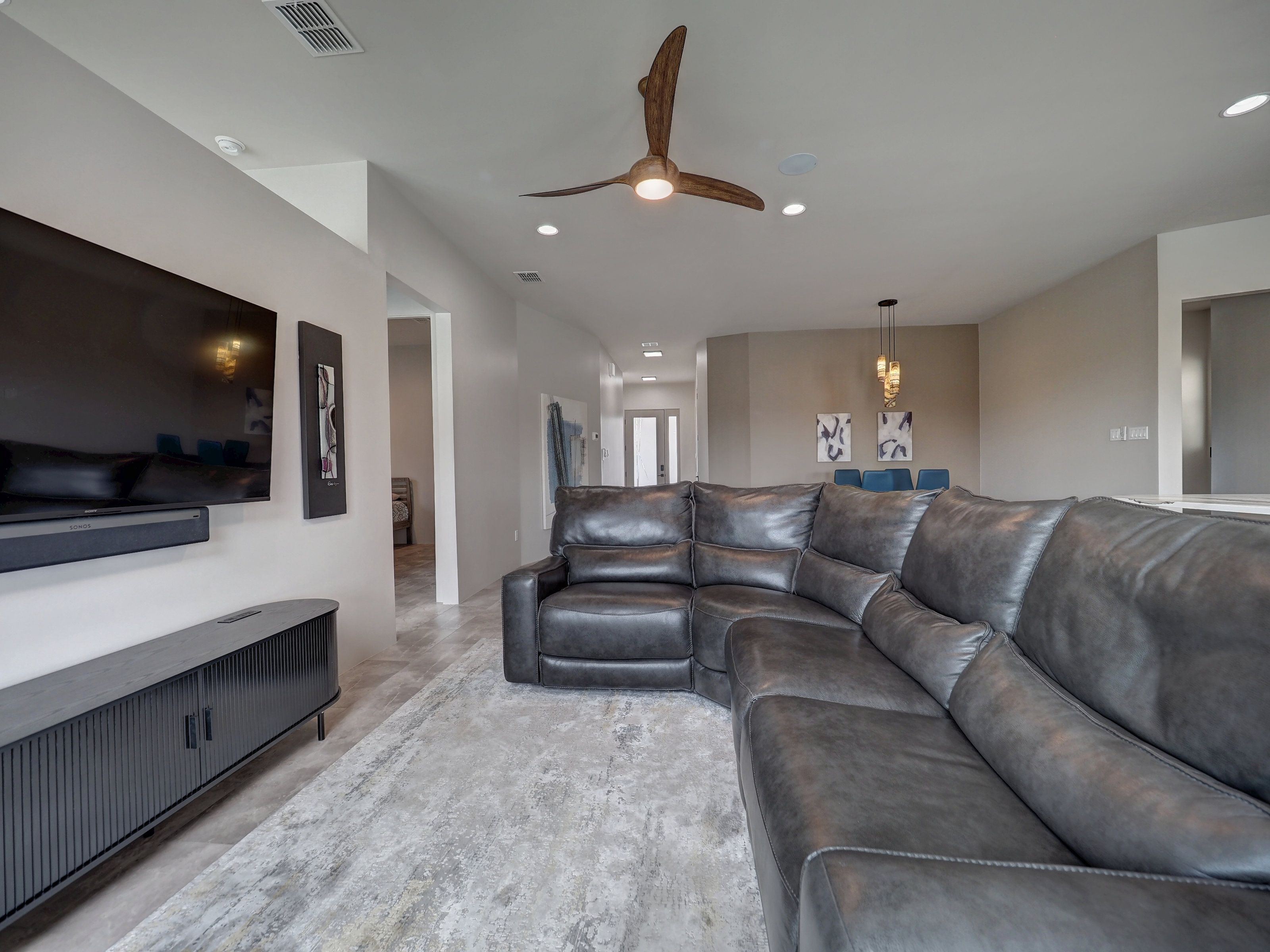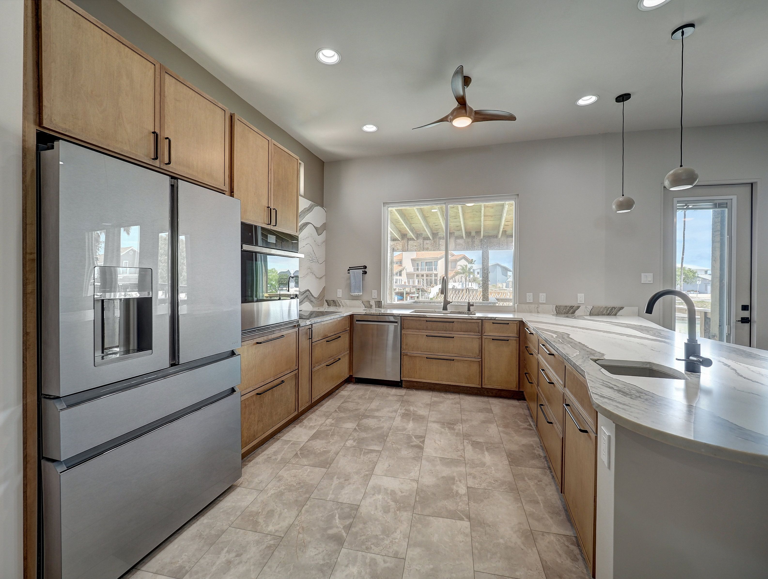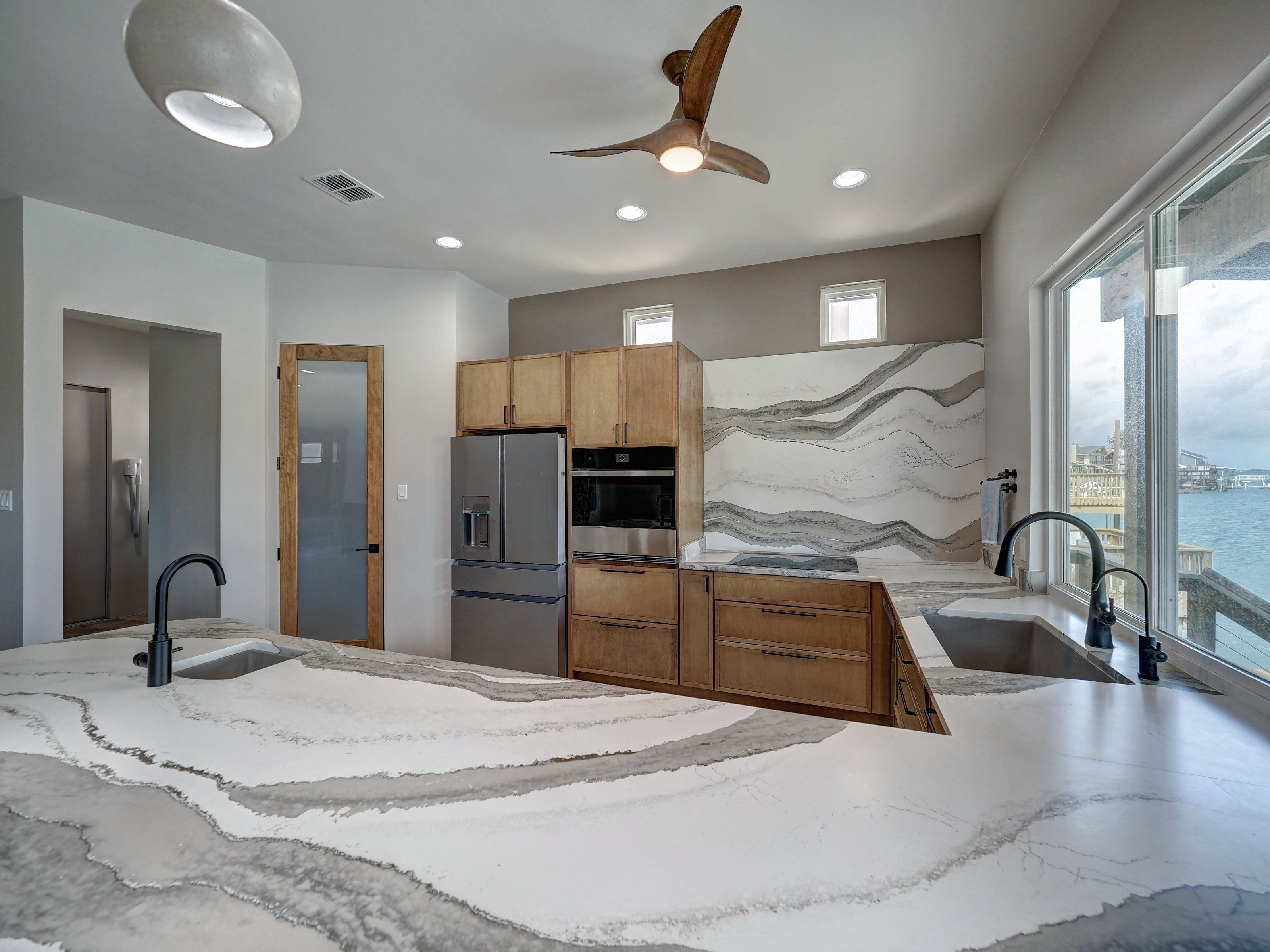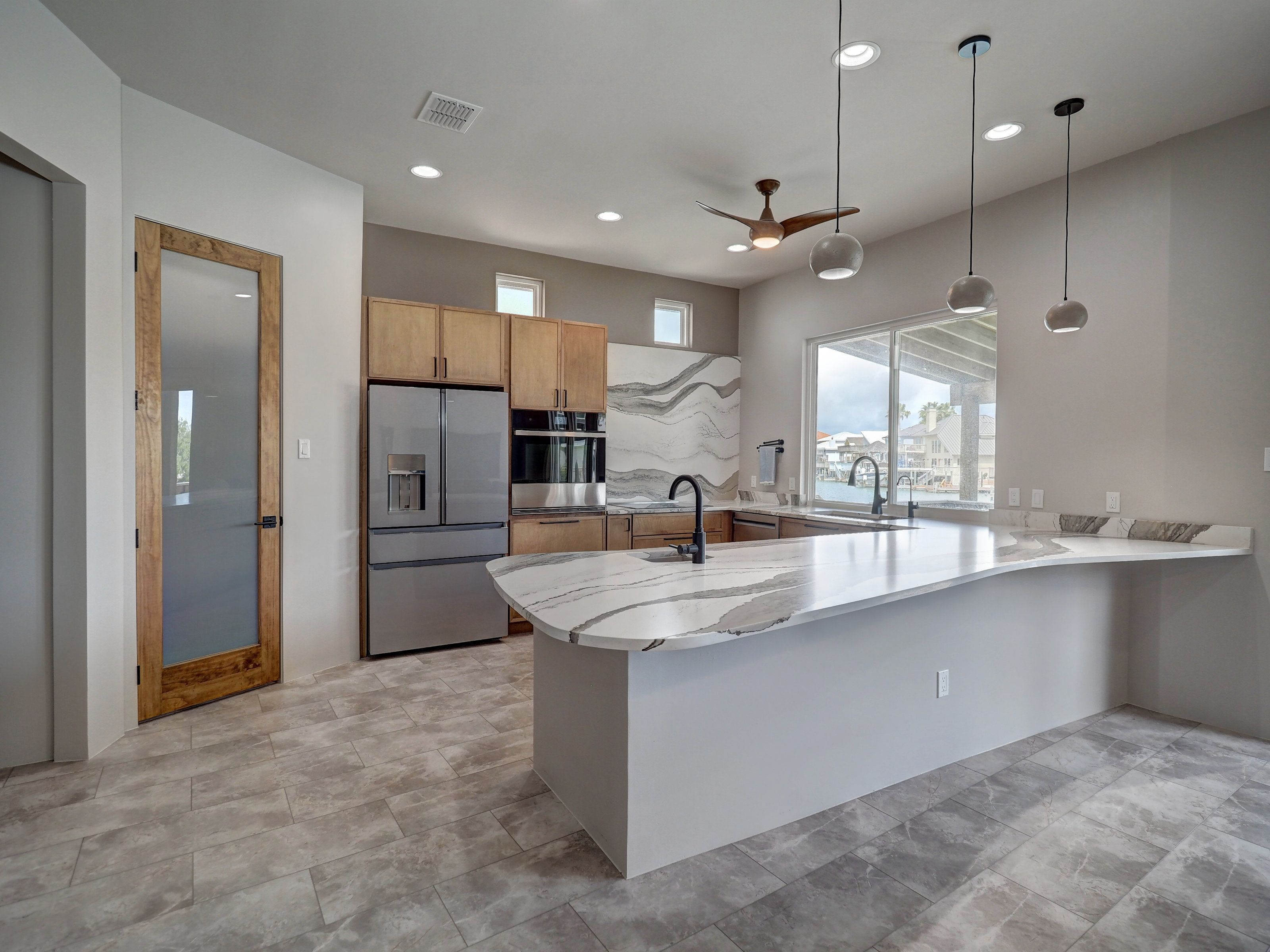 Step into a home where every detail is intentional and thoughtfully executed. Clean lines,flush walls, and a shadow-line finish eliminate traditional baseboards and door frames, creating a seamless, gallery-like feel throughout. Custom built and completed in June 2024 by Newcastle Homes, with owner-inspired upgrades. Just outside the primary suite, a private swim spa offers the perfect space to exercise or unwind in a hot tub setting. A striking etched-glass front door welcomes you into a light-filled, open-concept layout designed for both comfort and effortless flow. The dining area is highlighted by a custom-designed onyx light fixture, while the chef’s kitchen is equally impressive—featuring Showplace cabinetry with deep drawers and dowel dividers, JennAir appliances, an induction cooktop with pop-up exhaust, and a dramatic custom 12-foot peninsula with matte quartz surfaces that extend seamlessly into a full-height backsplash. The office or guest suite showcases large windows with water views, while the primary suite includes a custom closet system. Even the laundry room is elevated with innovative fold-out shoe storage for optimal organization, wall vacuum for cleaning dryer lint. Bathrooms feature floating cabinetry and illuminated mirrors, continuing the home’s clean, modern aesthetic. Additional highlights include: Insulated garage with split AC and heat—ideal for a gym or flex space, Whole-house water filtration system and surround sound, Central vacuum system for both interior and garage, Composite deck and dock with a 30-year warranty, Spray foam insulation for exceptional efficiency and low utility costs, Impact windows for enhanced durability and security Bulkhead-level lower deck, two outdoor showers, concrete side yards, and artificial turf-no watering needed. Every element of this home has been carefully designed to deliver a balance of luxury, functionality, and low-maintenance living—offering a modern yet timeless waterfront lifestyle.