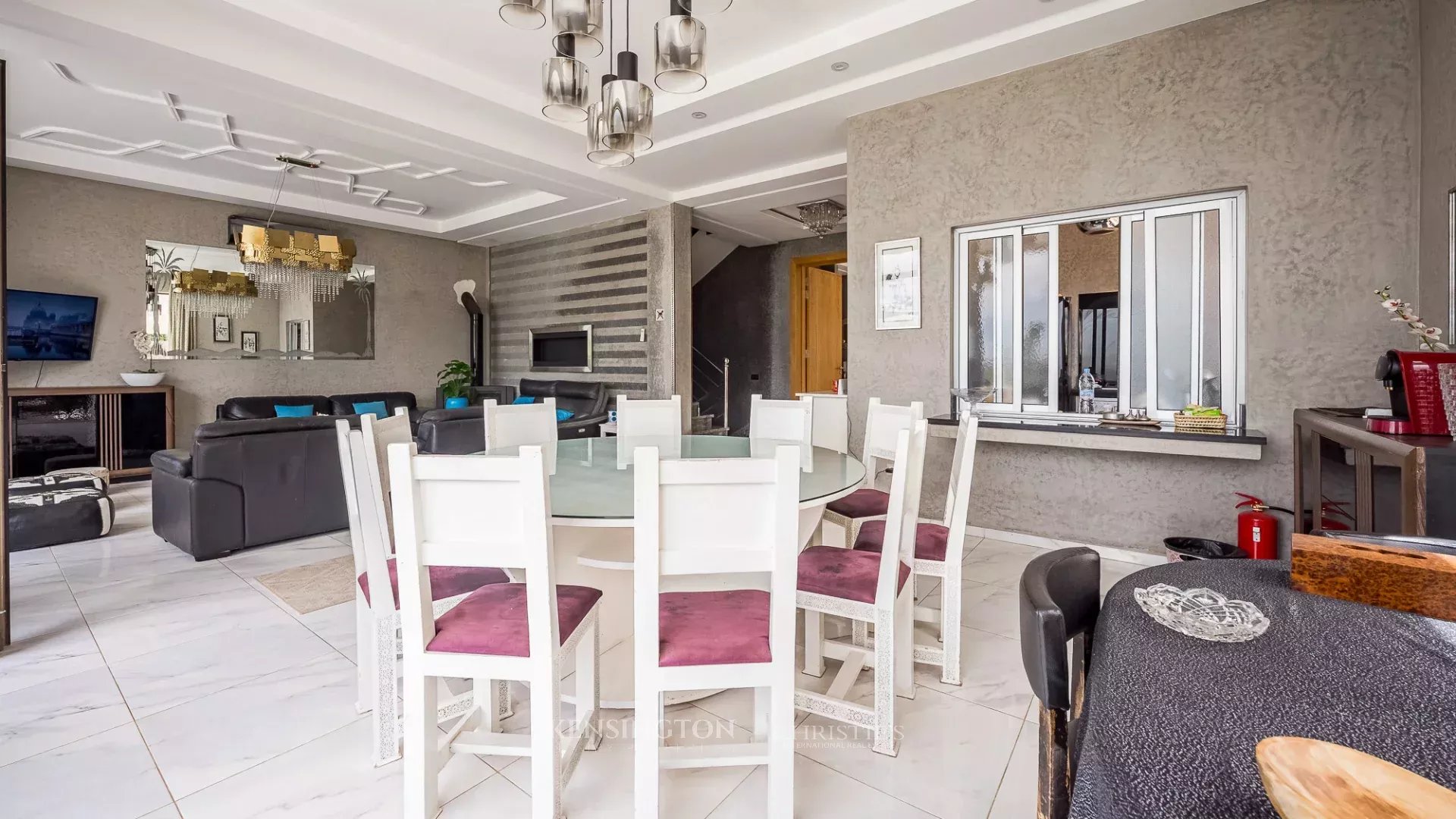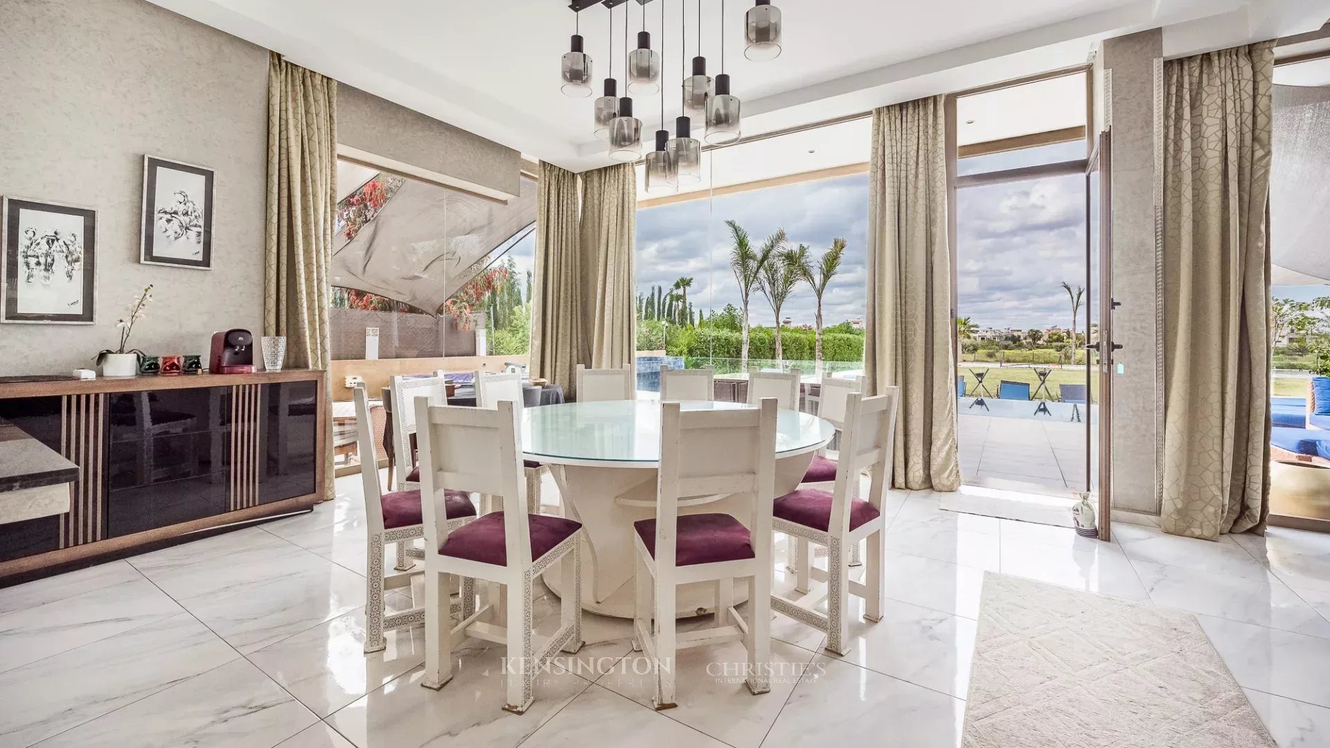 Ideally situated on the front line of a prestigious golf course, this sumptuous villa offers a unique living environment, combining luxury, spacious rooms, and breathtaking panoramic views of the course, the lake, and the Atlas Mountains.