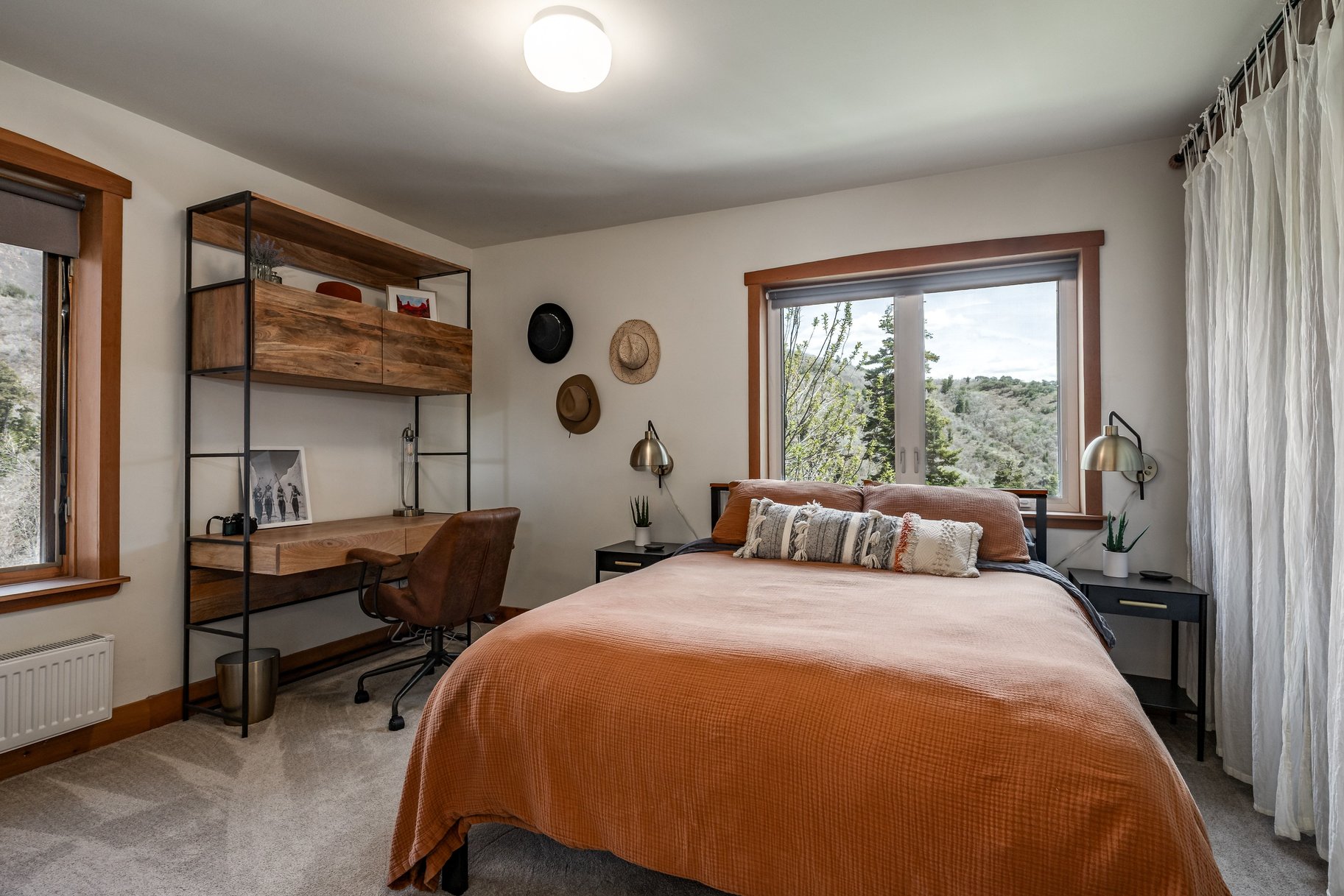 Tucked high along the alpine edge at the top of Pinecrest in Emigration Canyon, this bohemian “surf shack” cabin lives in the sun. Perched above it all, the home soaks in puddles of light throughout the day and opens to sweeping, bird’s-eye views of the canyon in every direction. Inside, the home has real wood floors, a wood burning stove, and lots of other woodsy details to adore. The windows are tall and the decks are wide: made for bare feet, long evenings, and the kind of quiet that settles in your lungs.