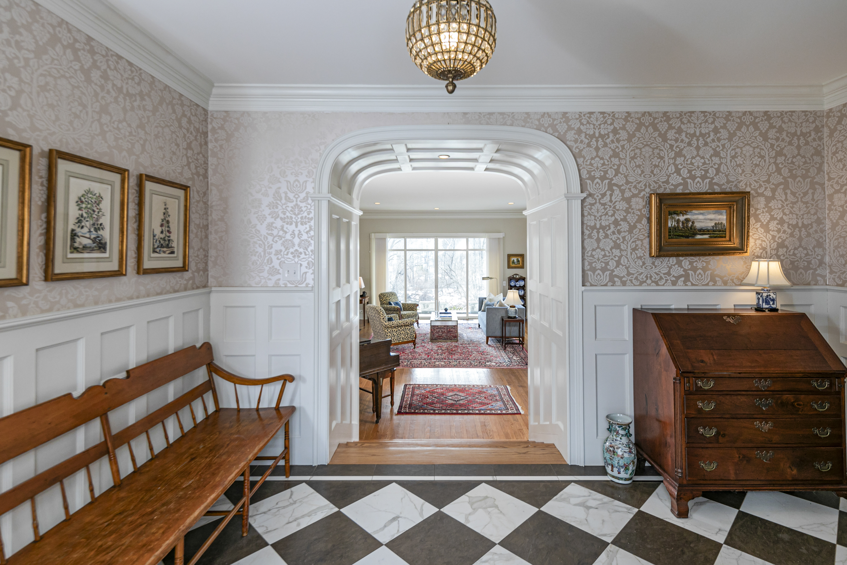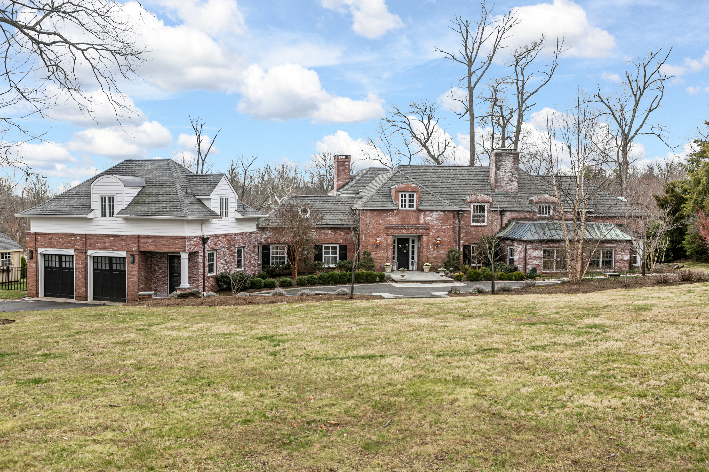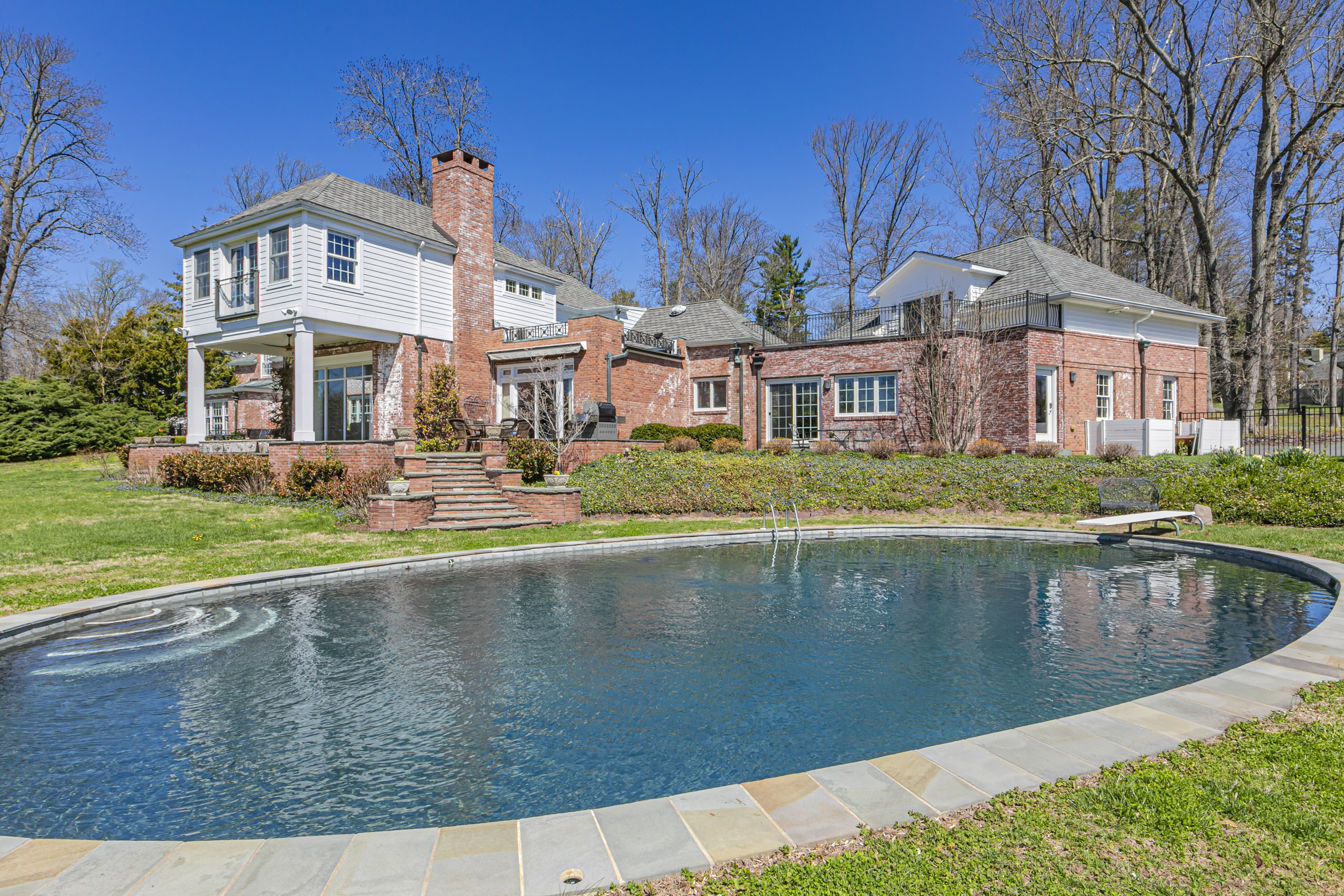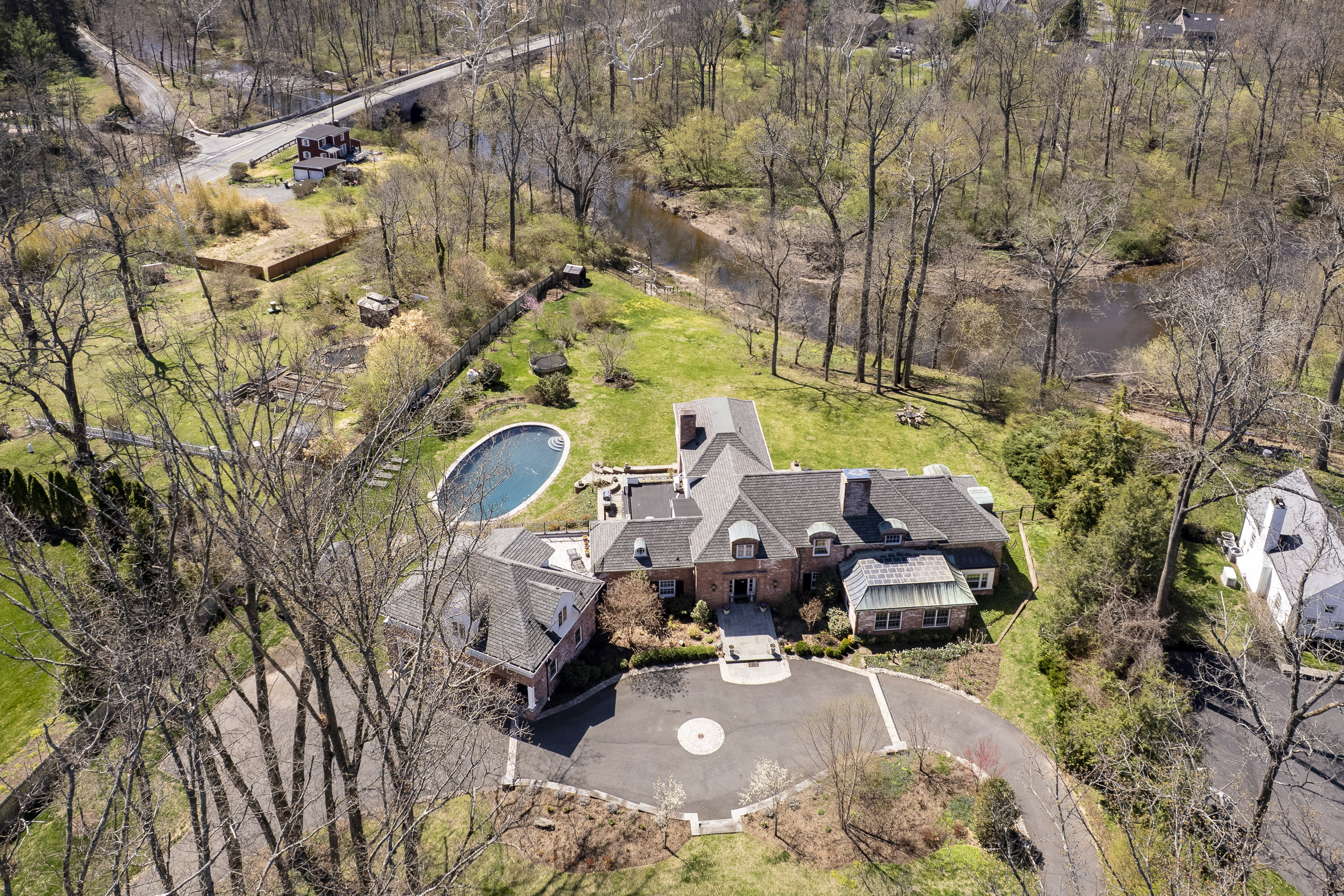 Set on more than two picturesque acres with panoramic views of Stony Brook, this beautifully expanded and flawlessly renovated brick home pairs classic details with smart updates. Just around the bend from The Hun School and a quick mile and a half from downtown, the setting feels well connected, yet peacefully estate-like, replete with a glorious oval swimming pool. The stunning entrance hall, finished in harlequin marble, introduces interiors designed for both elegant entertaining and comfortable living. In the grand living room, 11-foot ceilings, a fireplace and walls of glass create a light-filled gathering space that showcases the stunning outdoor backdrop. The kitchen, newly updated in 2024, centers around a generous quartz island and Thermador appliances. The openly adjoining sitting room with built-in computer station naturally draws everyone together. Hand-painted metallic wallpaper adds gleaming artistry to the dining room, while a wet bar serves the cozy library with its own fireplace. Within the bookshelves of this sophisticated retreat, a secret passage to the family room awaits discovery! A multi-room guest wing provides first-floor accommodations suitable for extended visits. A bonus room addition, currently used as a gym, is nicely separated and extra versatile with a generous sundeck and pristine full bath. The primary suite enjoys a central upper level position, along with every requisite amenity: custom walk-in closet, study, radiant heated modern bathroom with oversized shower and, of course, exquisite views from three exposures. Two more roomy suites have the perk of their own laundry closet, a supplement to the big, storage-rich mudroom. A circular driveway with extra parking court provides space for plenty of friends, who will be pleased to pop over for a swim or just to relish the view from one of the many stone terraces.