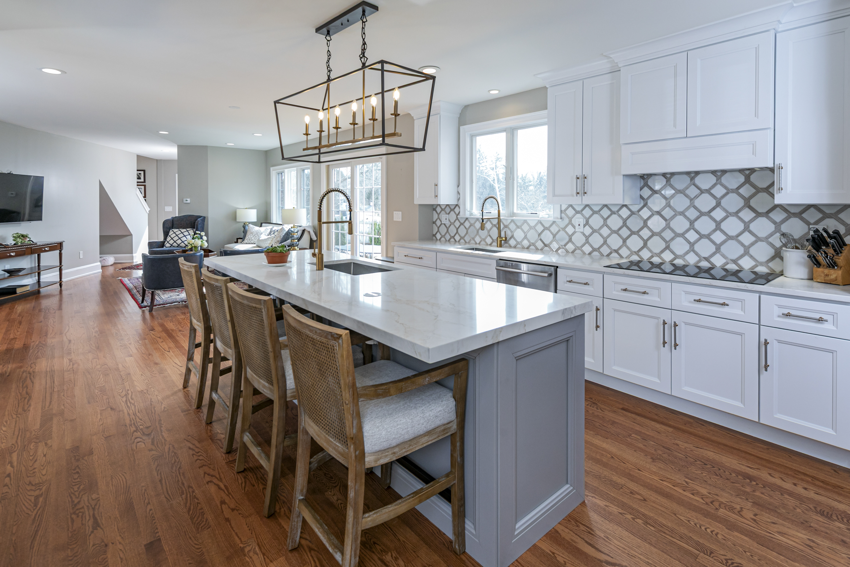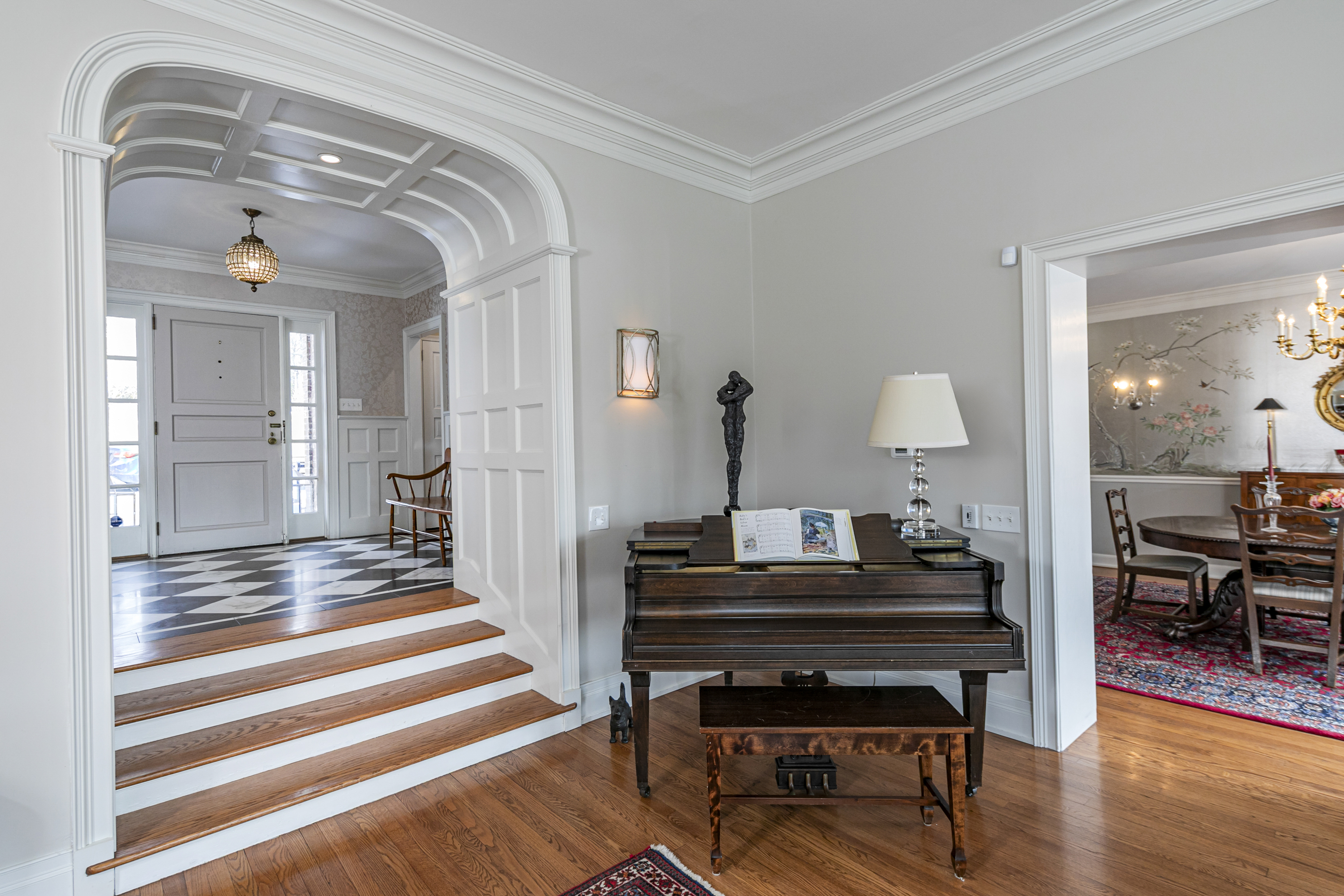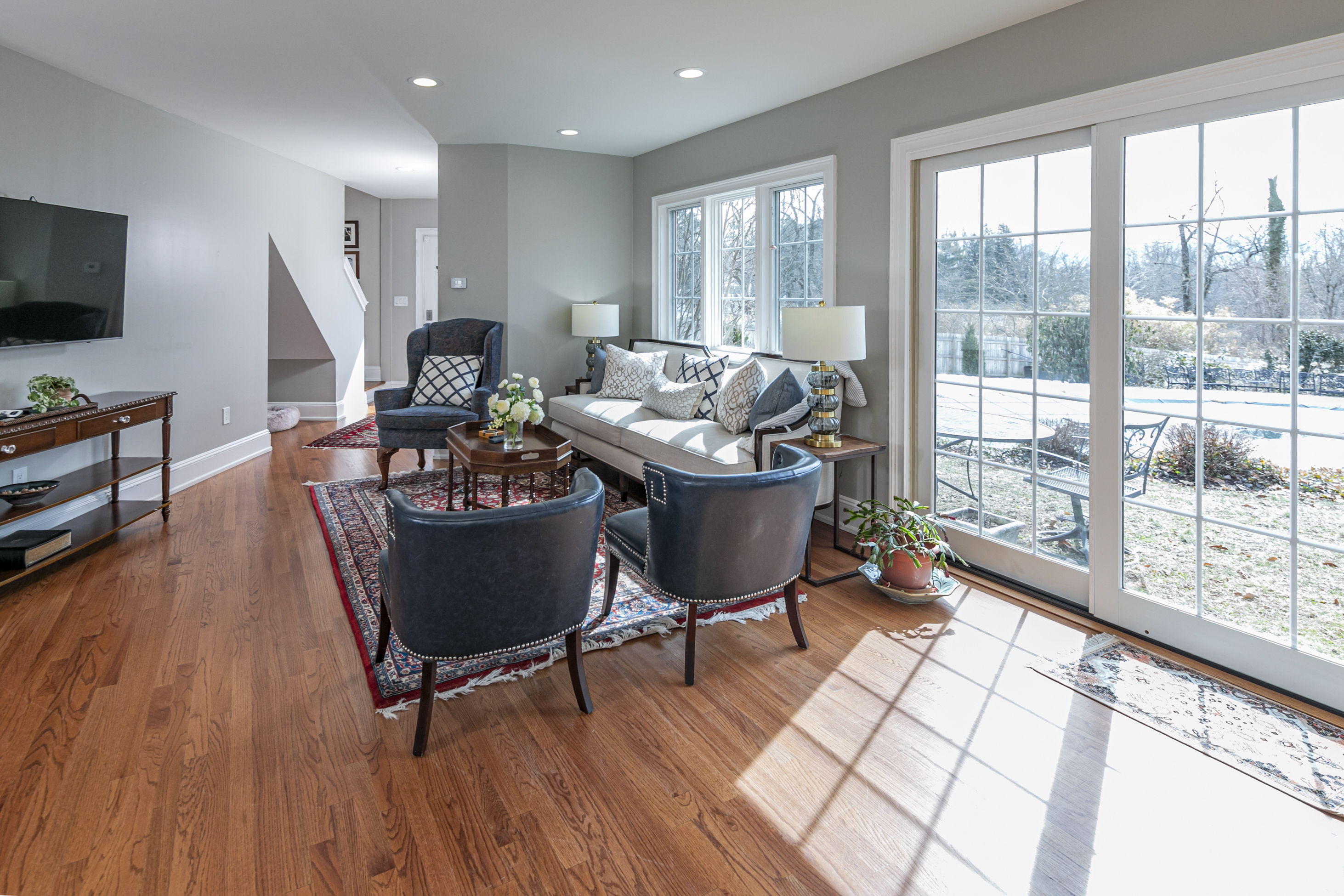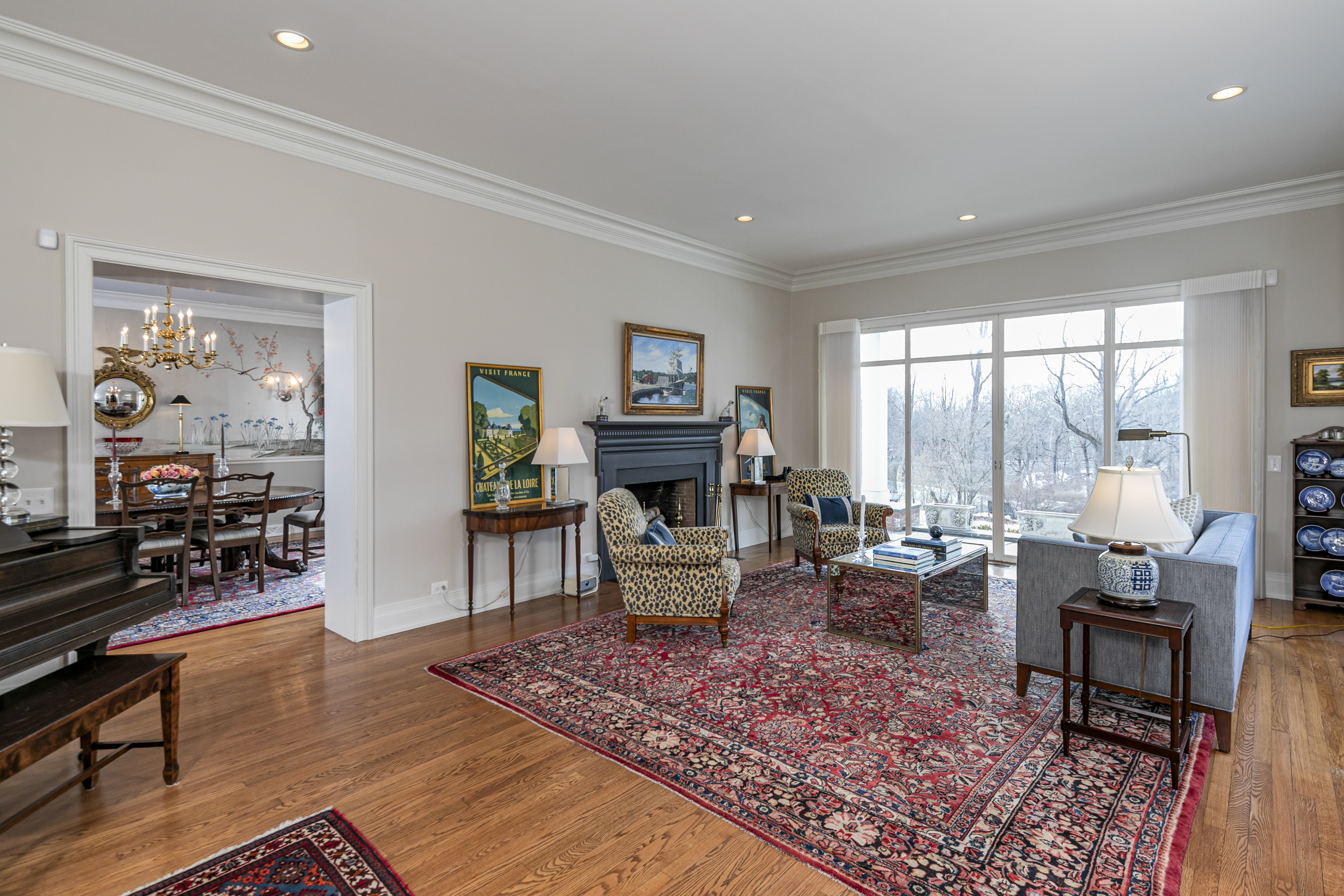 Set on more than two picturesque acres with panoramic views of Stony Brook, this beautifully expanded and flawlessly renovated brick home pairs classic details with smart updates. Just around the bend from The Hun School and a quick mile and a half from downtown, the setting feels well connected, yet peacefully estate-like, replete with a glorious oval swimming pool. The stunning entrance hall, finished in harlequin marble, introduces interiors designed for both elegant entertaining and comfortable living. In the grand living room, 11-foot ceilings, a fireplace and walls of glass create a light-filled gathering space that showcases the stunning outdoor backdrop. The kitchen, newly updated in 2024, centers around a generous quartz island and Thermador appliances. The openly adjoining sitting room with built-in computer station naturally draws everyone together. Hand-painted metallic wallpaper adds gleaming artistry to the dining room, while a wet bar serves the cozy library with its own fireplace. Within the bookshelves of this sophisticated retreat, a secret passage to the family room awaits discovery! A multi-room guest wing provides first-floor accommodations suitable for extended visits. A bonus room addition, currently used as a gym, is nicely separated and extra versatile with a generous sundeck and pristine full bath. The primary suite enjoys a central upper level position, along with every requisite amenity: custom walk-in closet, study, radiant heated modern bathroom with oversized shower and, of course, exquisite views from three exposures. Two more roomy suites have the perk of their own laundry closet, a supplement to the big, storage-rich mudroom. A circular driveway with extra parking court provides space for plenty of friends, who will be pleased to pop over for a swim or just to relish the view from one of the many stone terraces.