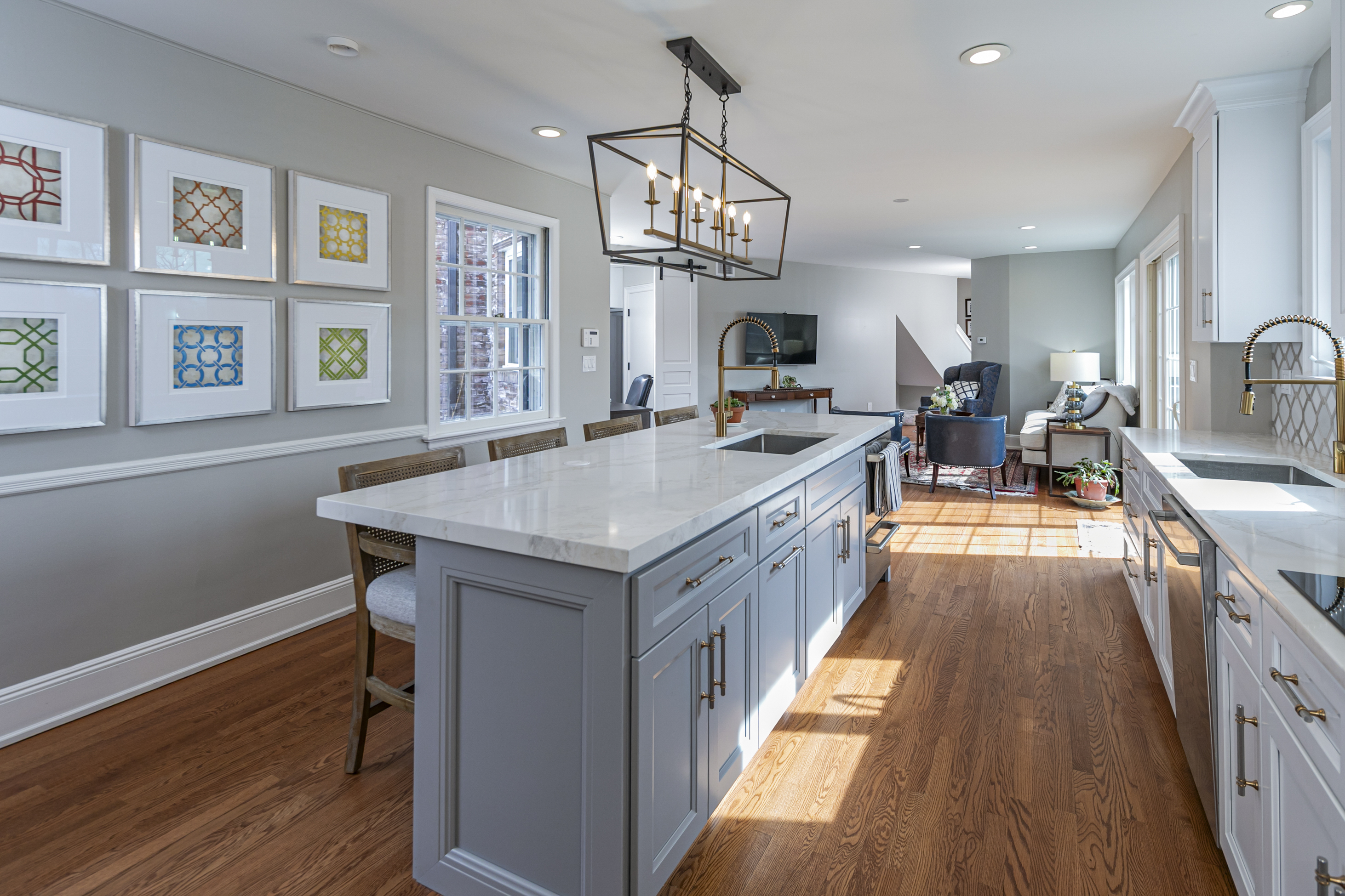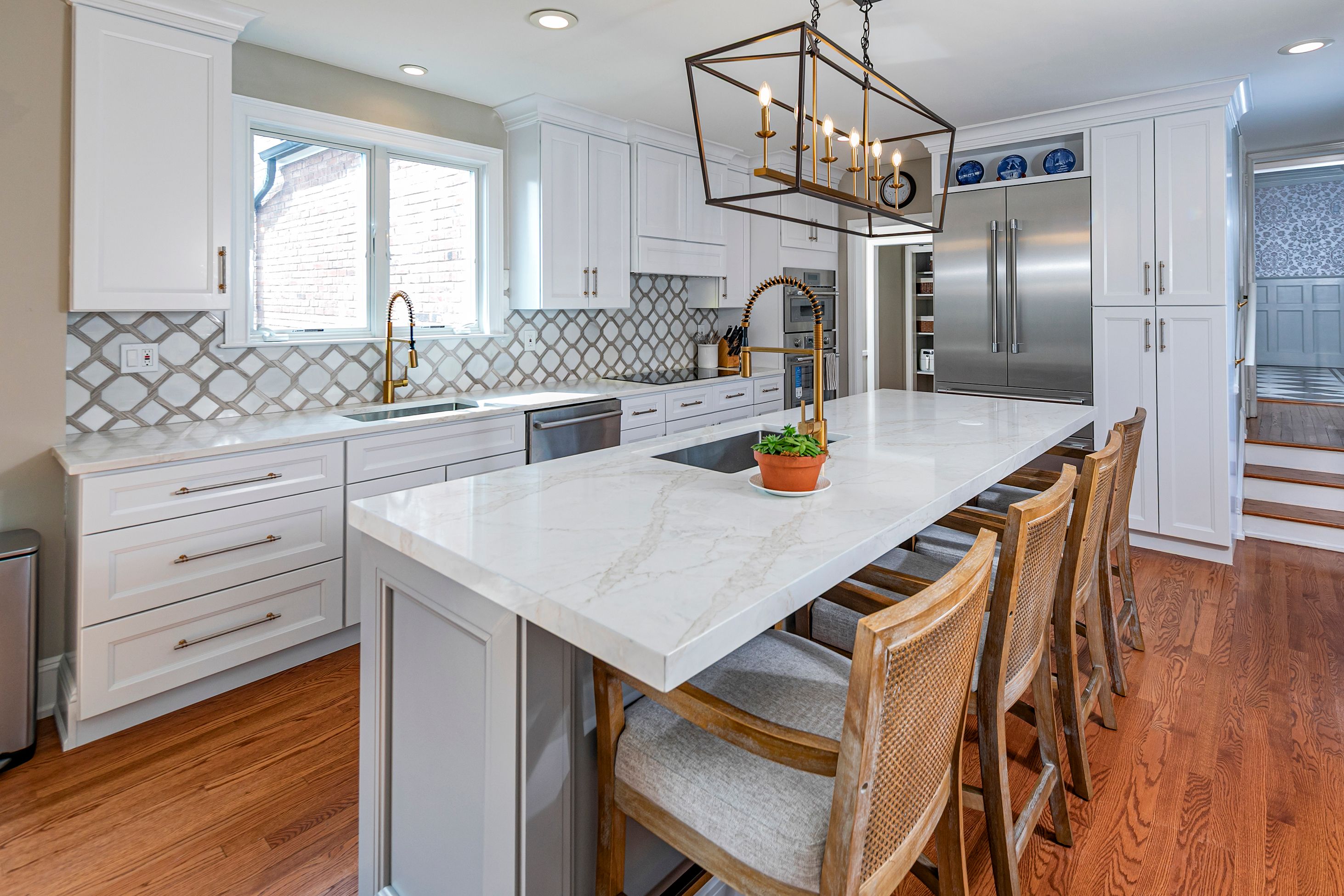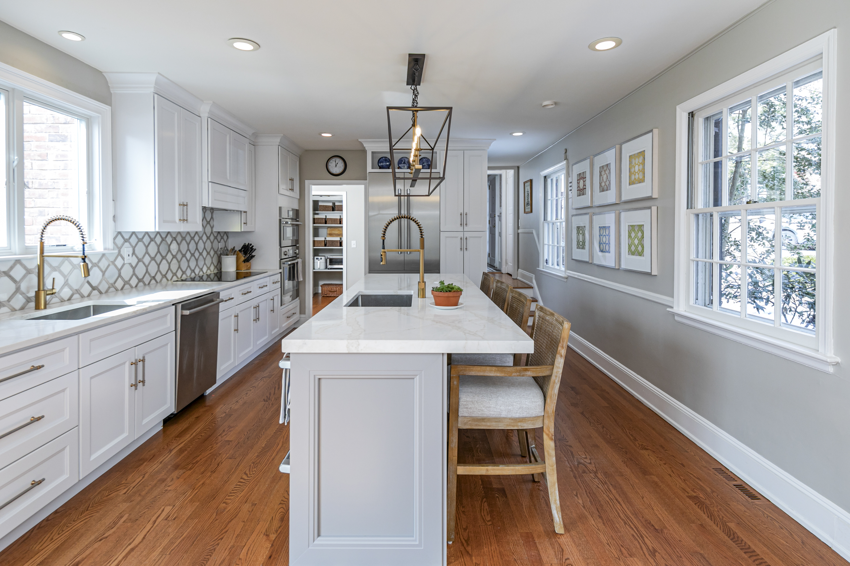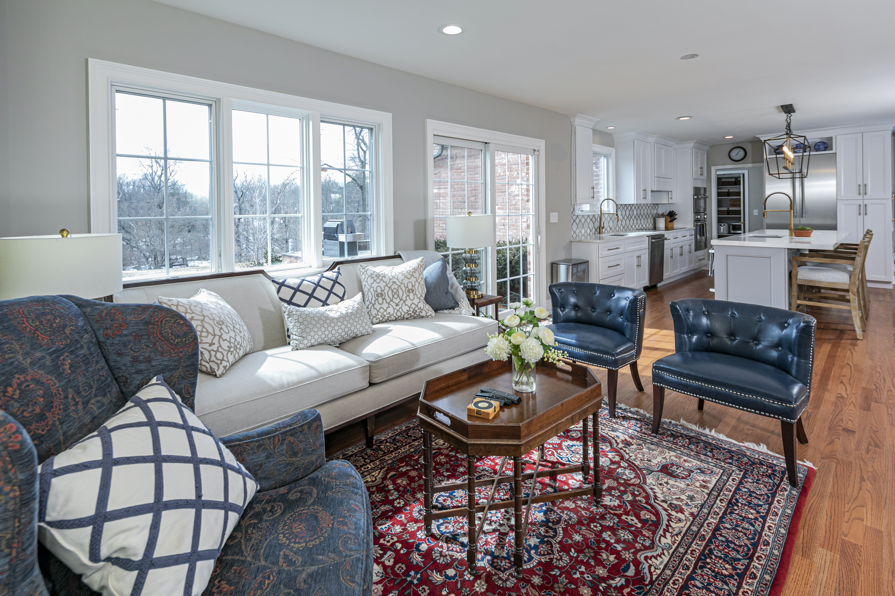 Set on more than two picturesque acres with panoramic views of Stony Brook, this beautifully expanded and flawlessly renovated brick home pairs classic details with smart updates. Just around the bend from The Hun School and a quick mile and a half from downtown, the setting feels well connected, yet peacefully estate-like, replete with a glorious oval swimming pool. The stunning entrance hall, finished in harlequin marble, introduces interiors designed for both elegant entertaining and comfortable living. In the grand living room, 11-foot ceilings, a fireplace and walls of glass create a light-filled gathering space that showcases the stunning outdoor backdrop. The kitchen, newly updated in 2024, centers around a generous quartz island and Thermador appliances. The openly adjoining sitting room with built-in computer station naturally draws everyone together. Hand-painted metallic wallpaper adds gleaming artistry to the dining room, while a wet bar serves the cozy library with its own fireplace. Within the bookshelves of this sophisticated retreat, a secret passage to the family room awaits discovery! A multi-room guest wing provides first-floor accommodations suitable for extended visits. A bonus room addition, currently used as a gym, is nicely separated and extra versatile with a generous sundeck and pristine full bath. The primary suite enjoys a central upper level position, along with every requisite amenity: custom walk-in closet, study, radiant heated modern bathroom with oversized shower and, of course, exquisite views from three exposures. Two more roomy suites have the perk of their own laundry closet, a supplement to the big, storage-rich mudroom. A circular driveway with extra parking court provides space for plenty of friends, who will be pleased to pop over for a swim or just to relish the view from one of the many stone terraces.