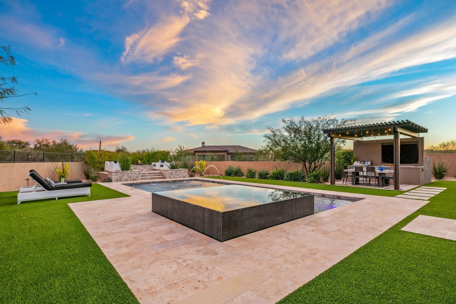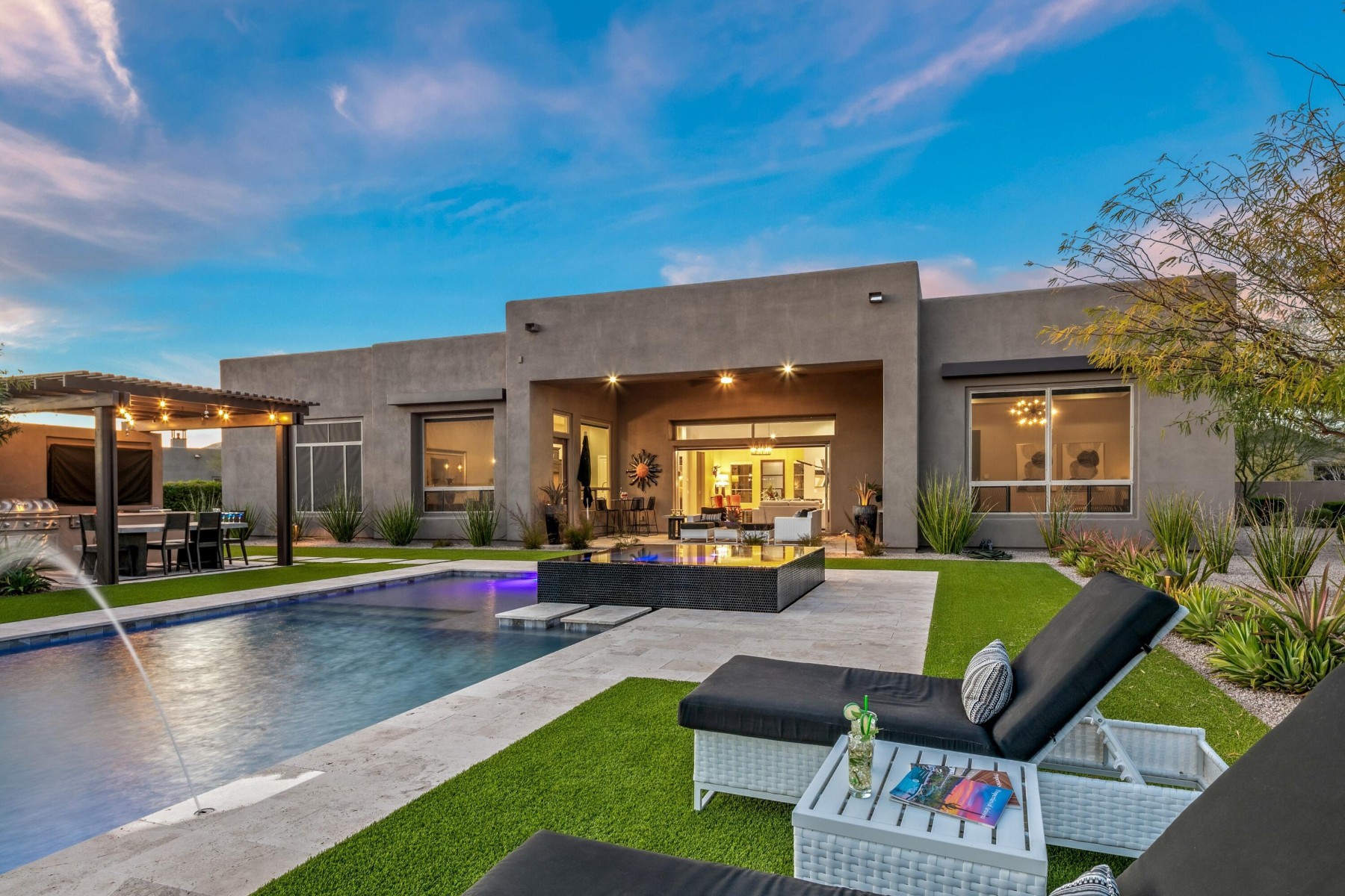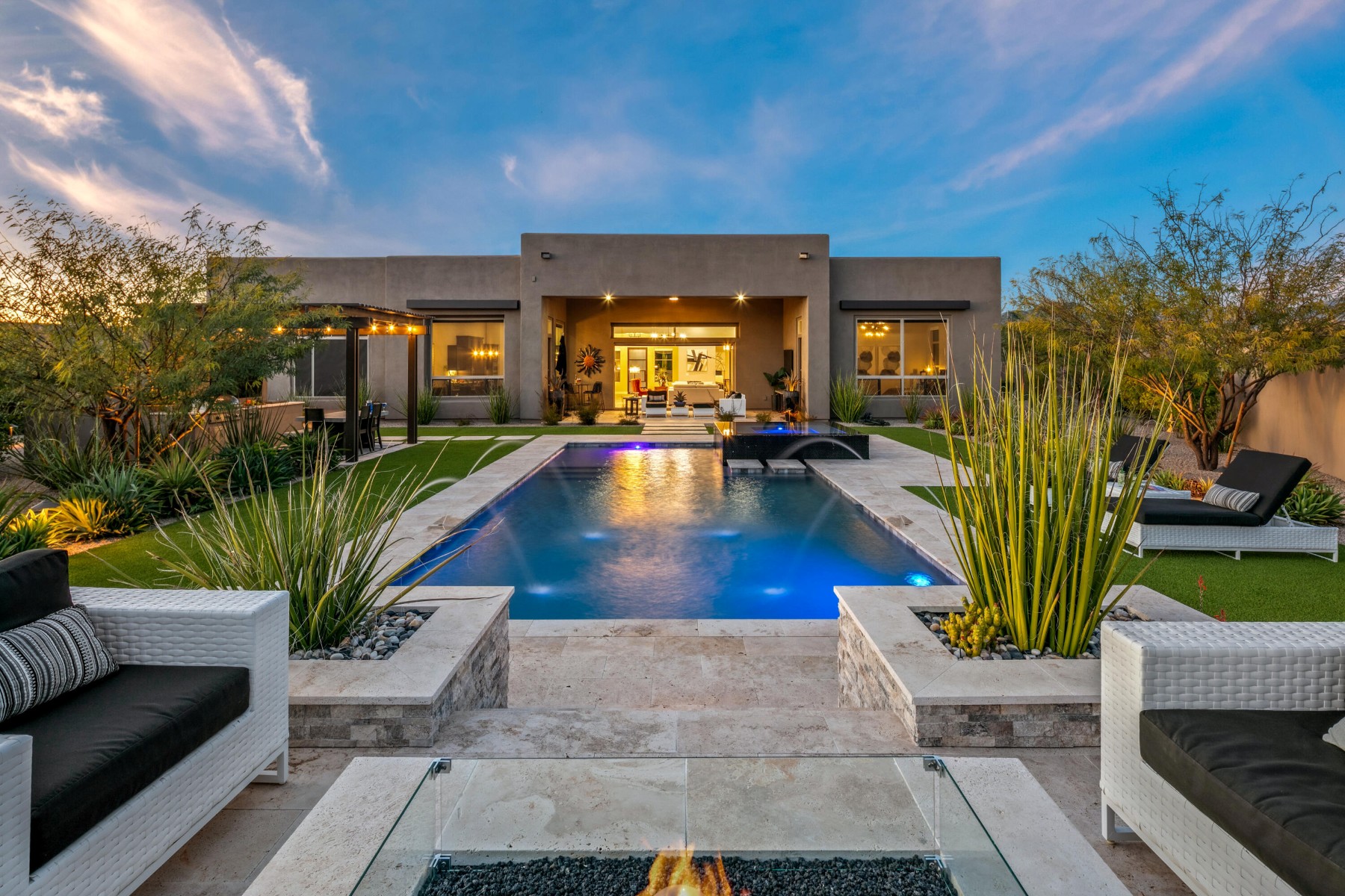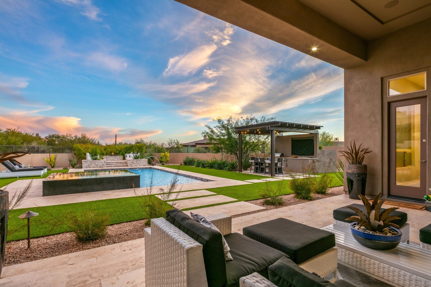 Located in coveted North Scottsdale, this 2020-built masterpiece sits on a premier cul-de-sac within the exclusive gates of Rosewood Ranch Estates. Sprawling across nearly an acre, this estate offers a rare sense of privacy and scale, delivering over 4,000 square feet of contemporary perfection. From the moment you arrive, the clean lines, manicured curb appeal, and spacious three-car garage signal that you've reached a home where no detail has been overlooked. Step inside to a world of unrivaled scale. The soaring ceilings and contemporary tile plank floors create a sense of airy sophistication that flows seamlessly from room to room.At the heart of the home lies a study in culinary excellence. This gourmet kitchen is a chef's dream, featuring Wolf and Sub-Zero appliances, an expansive social island, and undercounter beverage coolers. Organization is seamless here, with abundant cabinetry and a spacious pantry ensuring everything has its place. It's the ultimate hub for everything from your morning coffee to evening cocktails.Adjacent to the kitchen, the dining room offers a refined space for hosting, with private access doors that open directly onto the deep covered patio--perfect for transitioning from an intimate dinner to an evening under the stars.Just off the main entry, you'll discover a flexible den. Positioned away from the energy of the great room, this versatile space is perfect for a quiet home office or a dedicated studio--offering the privacy you need without sacrificing the home's open, modern feel.The luxury extends into the private quarters. Each oversized bedroom is designed as a personal retreat, paired with ensuite, spa-inspired baths that offer a serene escape from the everyday. While the interior is stunning, the backyard is where this estate truly shines. Designed for the ultimate Arizona lifestyle, the deep covered patio is an extension of the home, featuring a dedicated lounge with a large television and space for social seating.Lush turf creates a cool emerald escape framing, the crown jewel: a sparkling pool with cascading water features and a 360-degree zero-edge spa.After a long day on the golf course, gather around the tranquil firepit for conversation and dazzling Arizona sunsets. It is a setting for pure, unparalleled relaxation. For the entertainer, the poolside ramada is a destination of its own. Offering plenty of space for al fresco dining, and equipped with a built-in grill and a second outdoor media area to area to keep you connected to the game. Modern style, boutique privacy, and an entertainer's soul. 8555 East Eagle Claw Drive isn't just a place to live--it's a place to thrive. Come see for yourself. Your desert oasis is waiting.