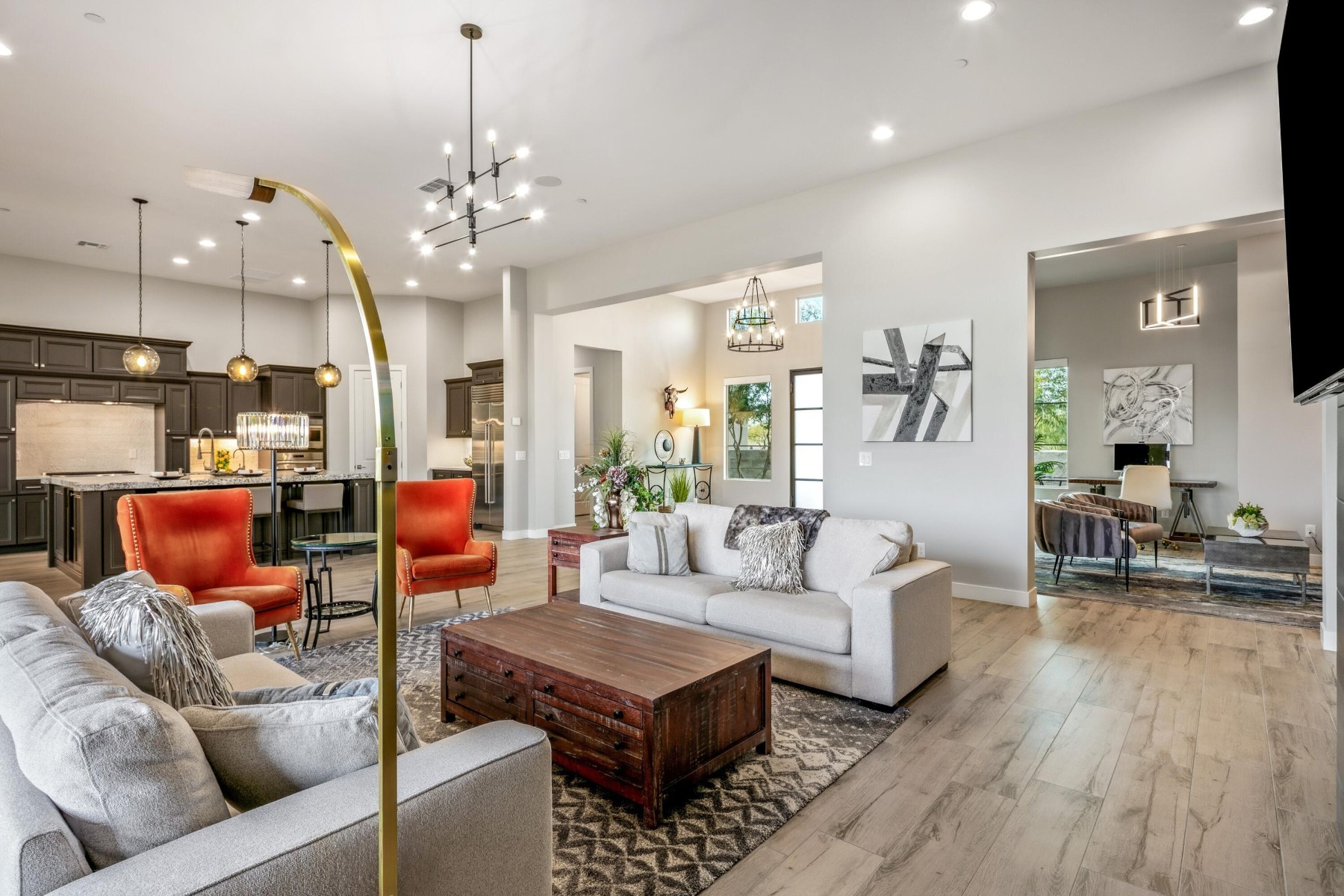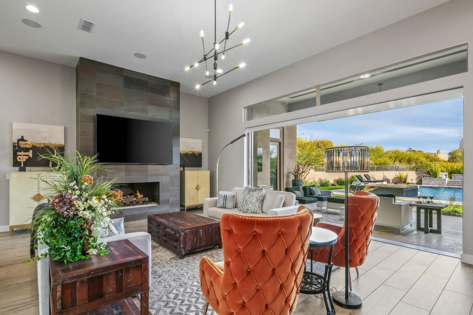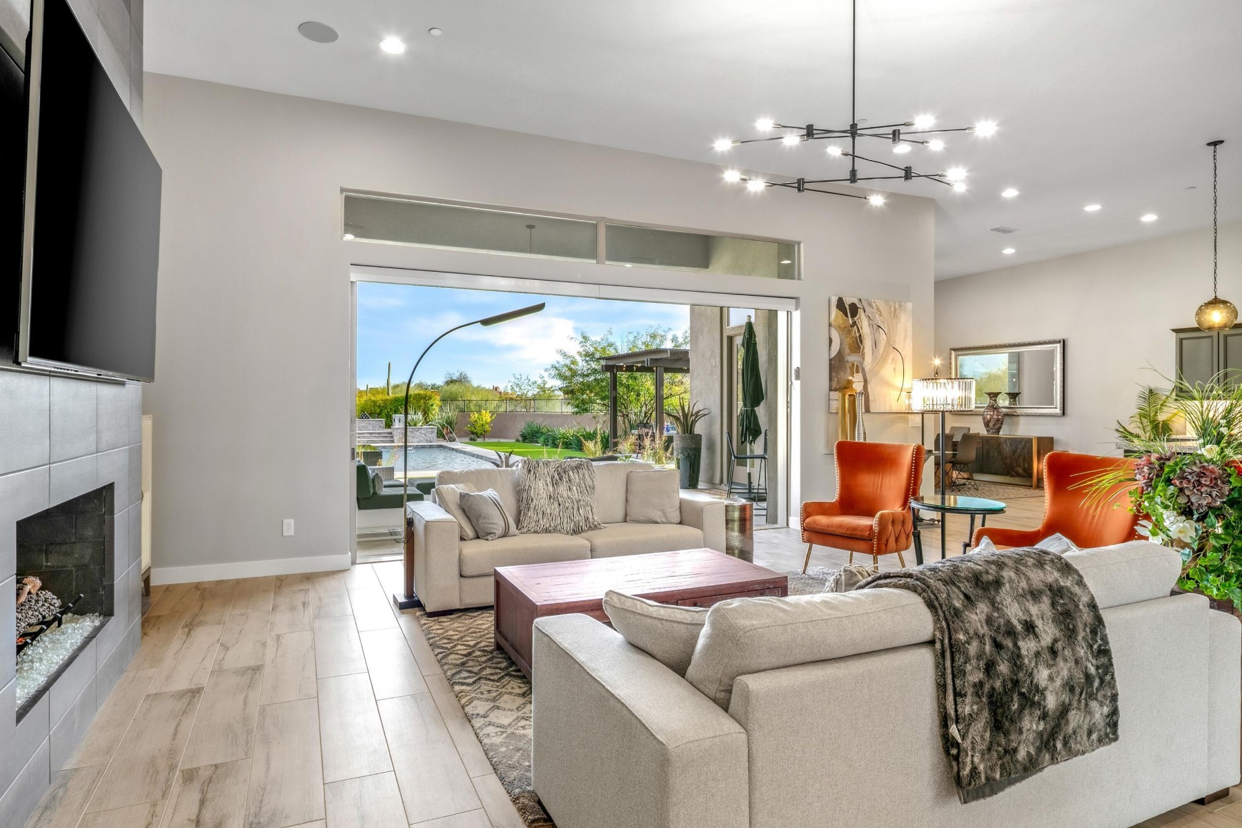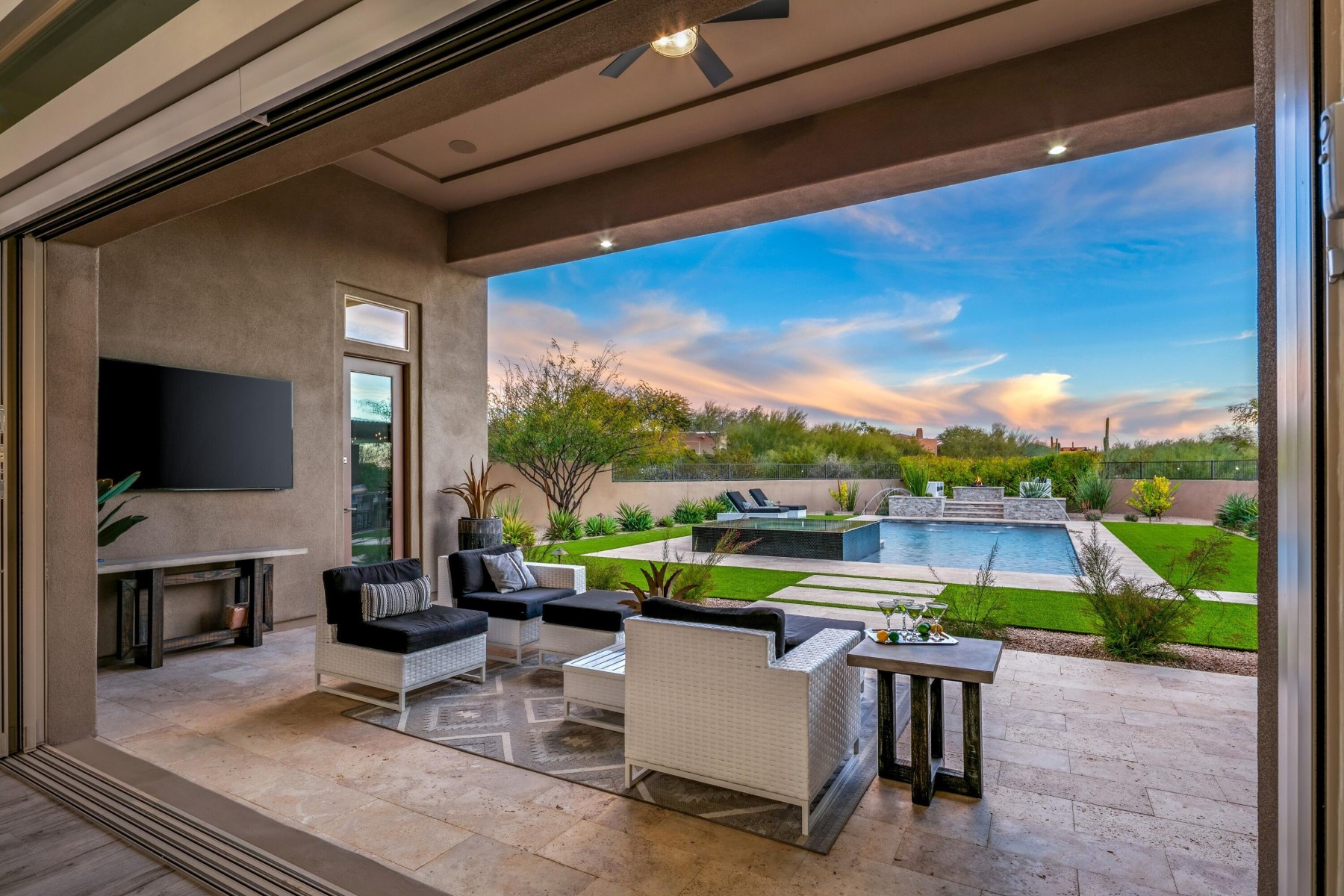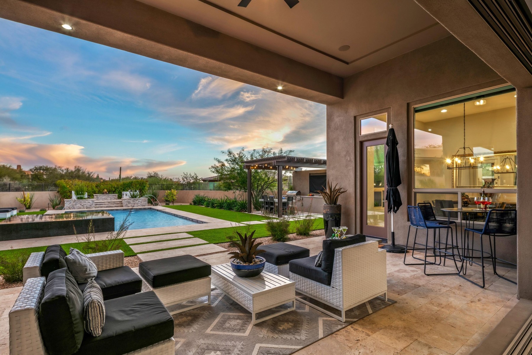 Located in coveted North Scottsdale, this 2020-built masterpiece sits on a premier cul-de-sac within the exclusive gates of Rosewood Ranch Estates. Sprawling across nearly an acre, this estate offers a rare sense of privacy and scale, delivering over 4,000 square feet of contemporary perfection. From the moment you arrive, the clean lines, manicured curb appeal, and spacious three-car garage signal that you've reached a home where no detail has been overlooked. Step inside to a world of unrivaled scale. The soaring ceilings and contemporary tile plank floors create a sense of airy sophistication that flows seamlessly from room to room.At the heart of the home lies a study in culinary excellence. This gourmet kitchen is a chef's dream, featuring Wolf and Sub-Zero appliances, an expansive social island, and undercounter beverage coolers. Organization is seamless here, with abundant cabinetry and a spacious pantry ensuring everything has its place. It's the ultimate hub for everything from your morning coffee to evening cocktails.Adjacent to the kitchen, the dining room offers a refined space for hosting, with private access doors that open directly onto the deep covered patio--perfect for transitioning from an intimate dinner to an evening under the stars.Just off the main entry, you'll discover a flexible den. Positioned away from the energy of the great room, this versatile space is perfect for a quiet home office or a dedicated studio--offering the privacy you need without sacrificing the home's open, modern feel.The luxury extends into the private quarters. Each oversized bedroom is designed as a personal retreat, paired with ensuite, spa-inspired baths that offer a serene escape from the everyday. While the interior is stunning, the backyard is where this estate truly shines. Designed for the ultimate Arizona lifestyle, the deep covered patio is an extension of the home, featuring a dedicated lounge with a large television and space for social seating.Lush turf creates a cool emerald escape framing, the crown jewel: a sparkling pool with cascading water features and a 360-degree zero-edge spa.After a long day on the golf course, gather around the tranquil firepit for conversation and dazzling Arizona sunsets. It is a setting for pure, unparalleled relaxation. For the entertainer, the poolside ramada is a destination of its own. Offering plenty of space for al fresco dining, and equipped with a built-in grill and a second outdoor media area to area to keep you connected to the game. Modern style, boutique privacy, and an entertainer's soul. 8555 East Eagle Claw Drive isn't just a place to live--it's a place to thrive. Come see for yourself. Your desert oasis is waiting.