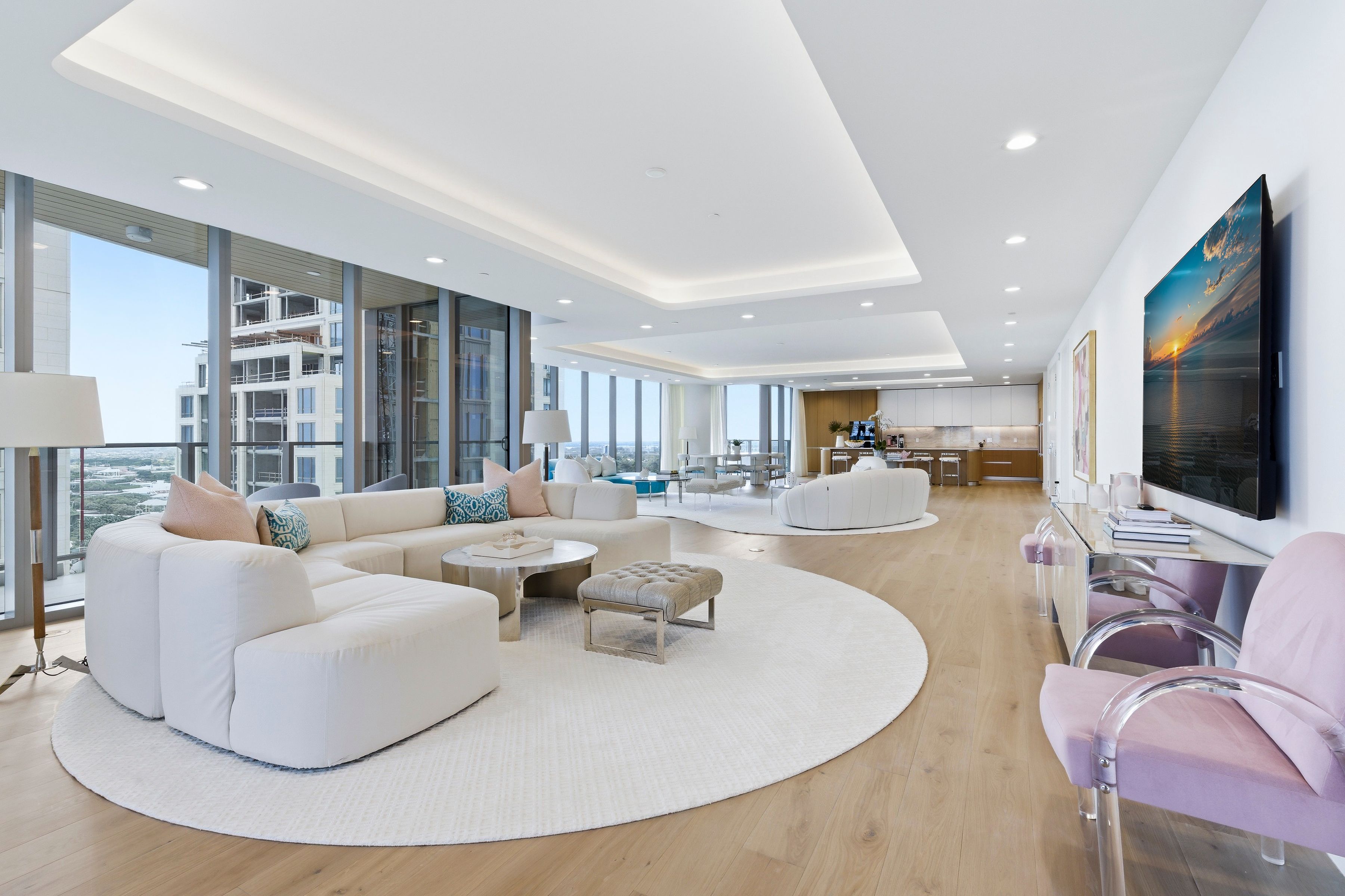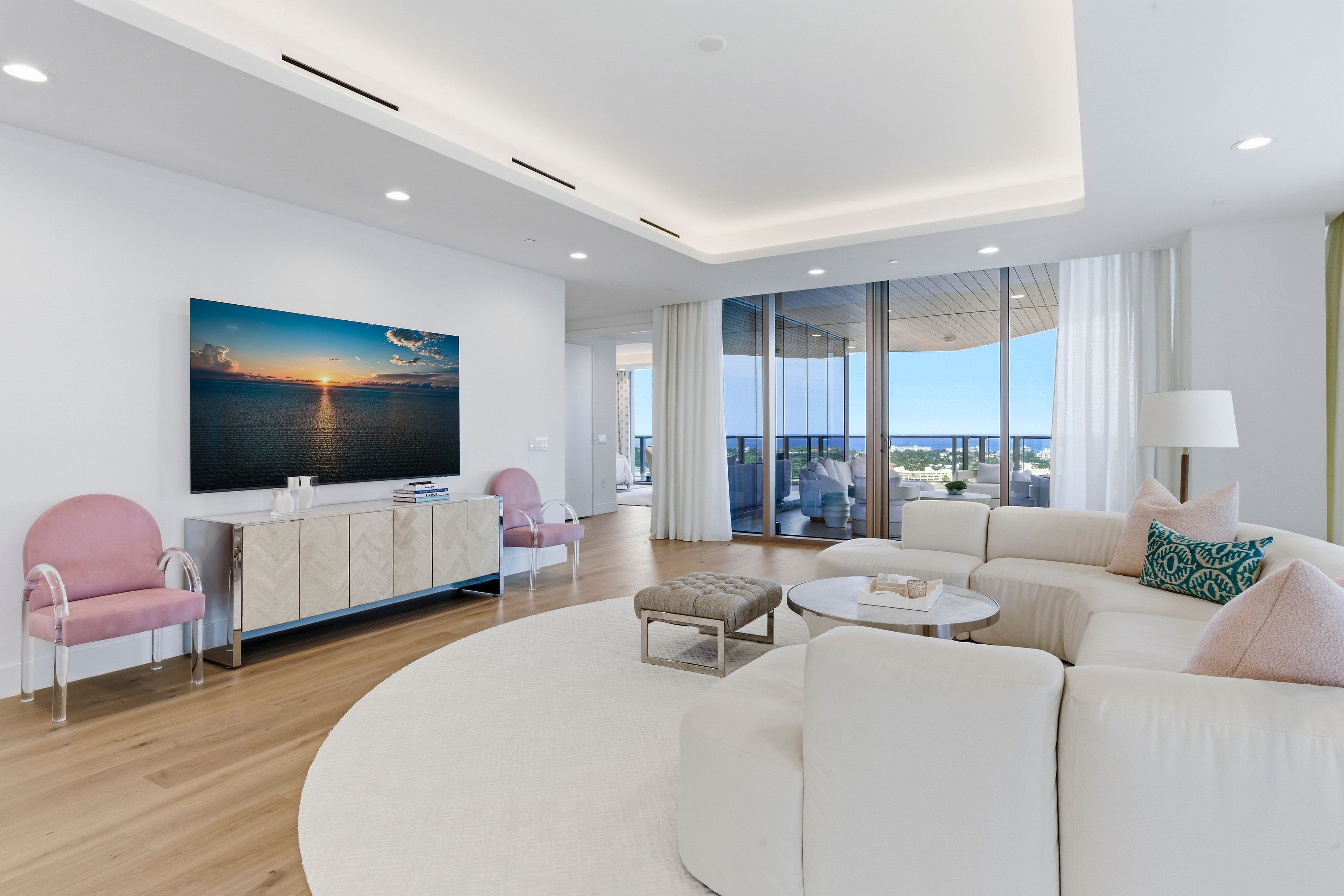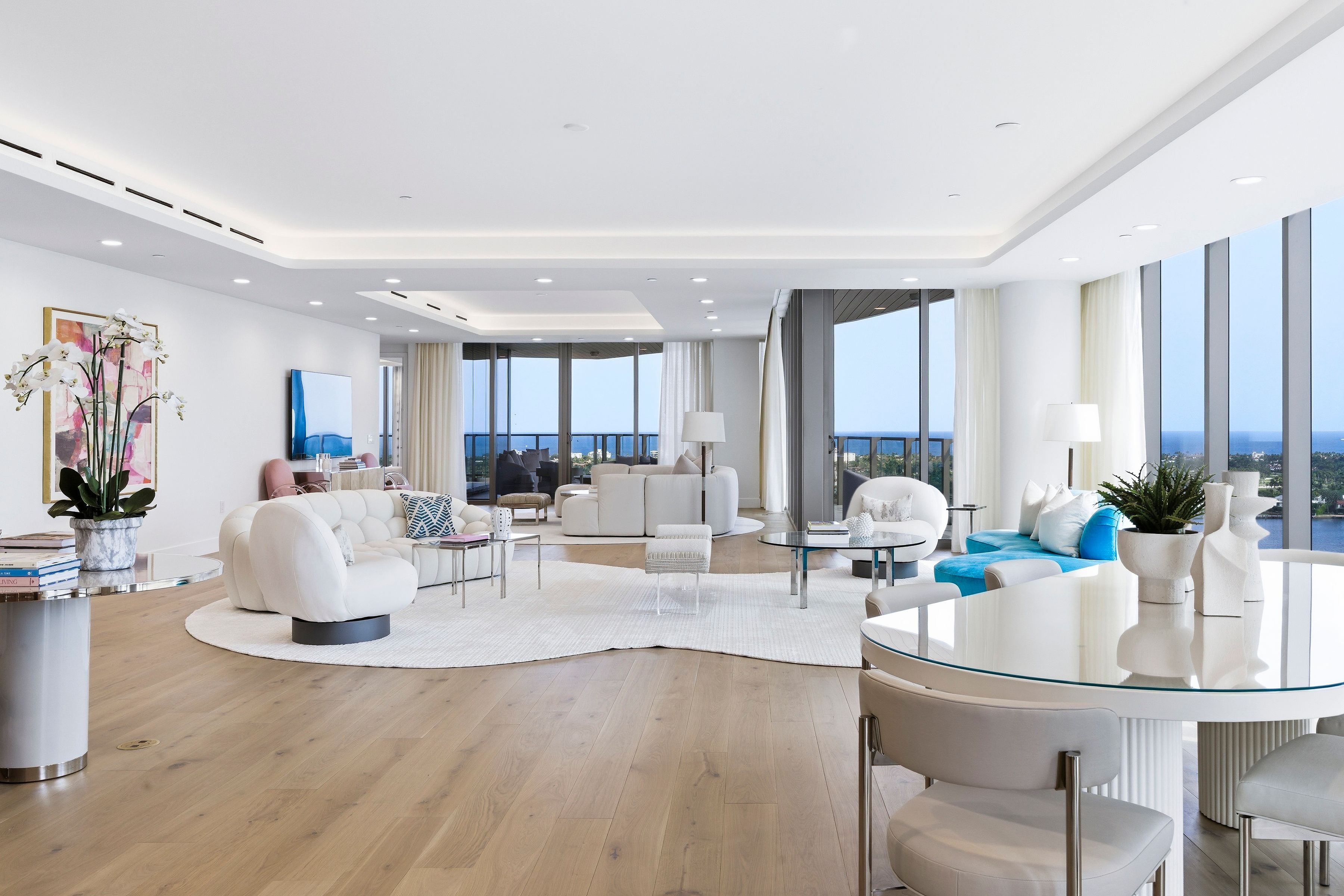 Turnkey and fully furnished, this 4 BR/ 4.5 BA flow through home on the 17th floor of Forte spans 5,458 sq ft and captures sweeping 180 degree views of the Intracoastal, Palm Beach & the ocean through floor-to-ceiling glass. Private elevator foyer opens to an expansive open concept living and dining areas designed for effortless entertaining and refined everyday living. The kitchen is outfitted with Italian cabinetry, Sub-Zero® and Wolf® appliances and Waterworks® fixtures. The luxurious primary suite boasts dual vanities & commodes, soaking tub, steam shower, and spacious walk-in closets. The 3 additional en-suite bedrooms have city views and terraces perfect for watching the stunning sunsets. Upgraded with built-ins, cove lighting, low voltage wiring and ready for smart home integration. There is a full laundry room with sink and an additional utility room. Located in the prestigious Forté on Flagler, with only 41 units, residents enjoy full-service luxury amenities including valet parking, 24-hour concierge, 75' lap pool, golf simulator, fitness center, yoga studio, multiple lounges, spa and steam room, and a 24 seat dining room with catering kitchen, guest suites, house car and curated resident services. Minutes to Worth Avenue, pristine beaches, downtown, and Palm Beach International Airport. Two garage spaces side by side are included. Visit Fortewpb.com for more information on this boutique luxury building on the coveted South Flagler corridor.