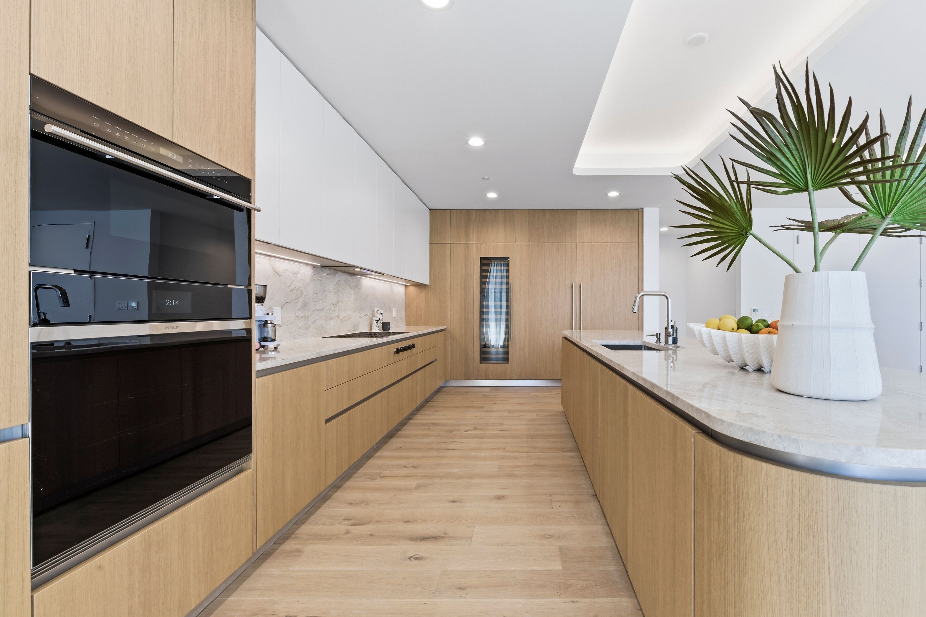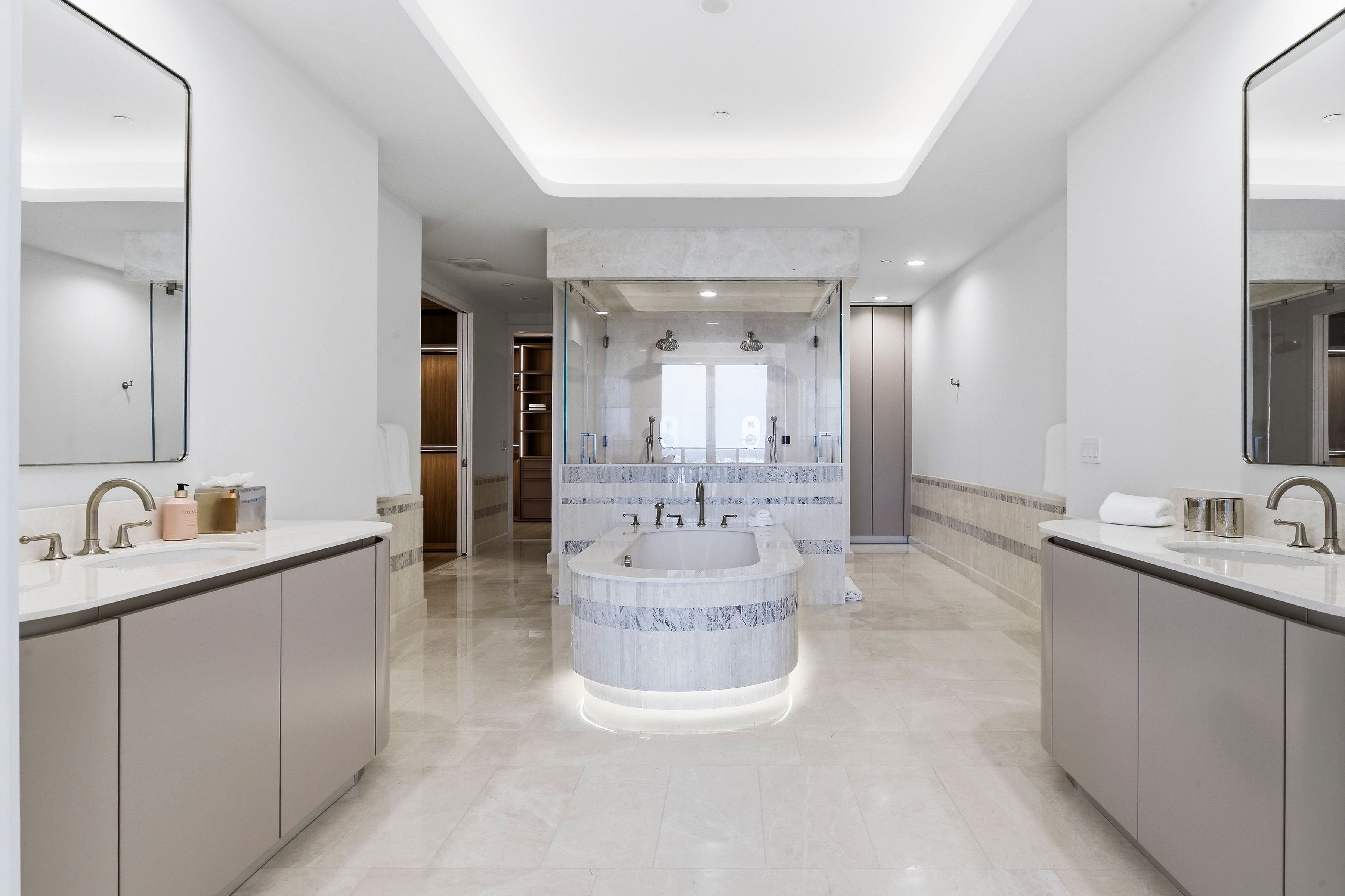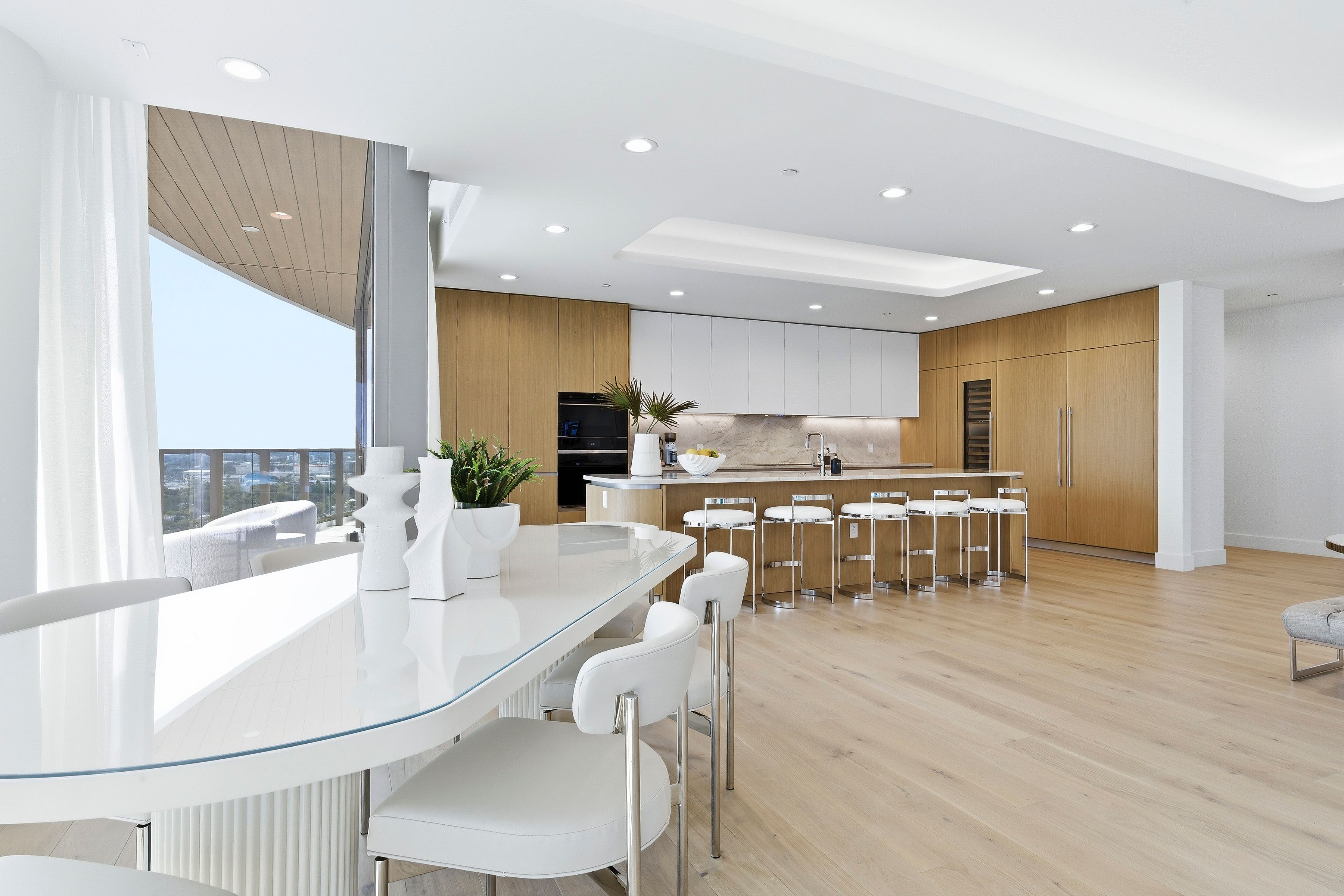 Turnkey and fully furnished, this 4 BR/ 4.5 BA flow through home on the 17th floor of Forte spans 5,458 sq ft and captures sweeping 180 degree views of the Intracoastal, Palm Beach & the ocean through floor-to-ceiling glass. Private elevator foyer opens to an expansive open concept living and dining areas designed for effortless entertaining and refined everyday living. The kitchen is outfitted with Italian cabinetry, Sub-Zero® and Wolf® appliances and Waterworks® fixtures. The luxurious primary suite boasts dual vanities & commodes, soaking tub, steam shower, and spacious walk-in closets. The 3 additional en-suite bedrooms have city views and terraces perfect for watching the stunning sunsets. Upgraded with built-ins, cove lighting, low voltage wiring and ready for smart home integration. There is a full laundry room with sink and an additional utility room. Located in the prestigious Forté on Flagler, with only 41 units, residents enjoy full-service luxury amenities including valet parking, 24-hour concierge, 75' lap pool, golf simulator, fitness center, yoga studio, multiple lounges, spa and steam room, and a 24 seat dining room with catering kitchen, guest suites, house car and curated resident services. Minutes to Worth Avenue, pristine beaches, downtown, and Palm Beach International Airport. Two garage spaces side by side are included. Visit Fortewpb.com for more information on this boutique luxury building on the coveted South Flagler corridor.