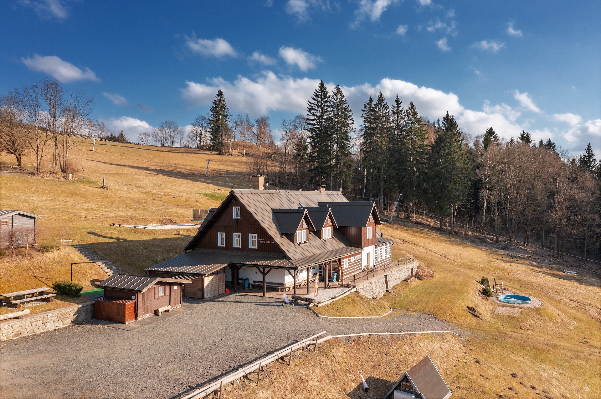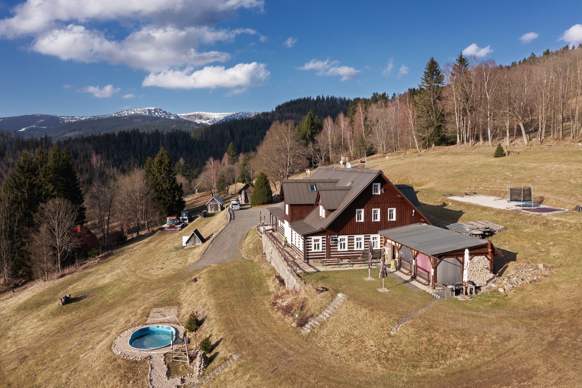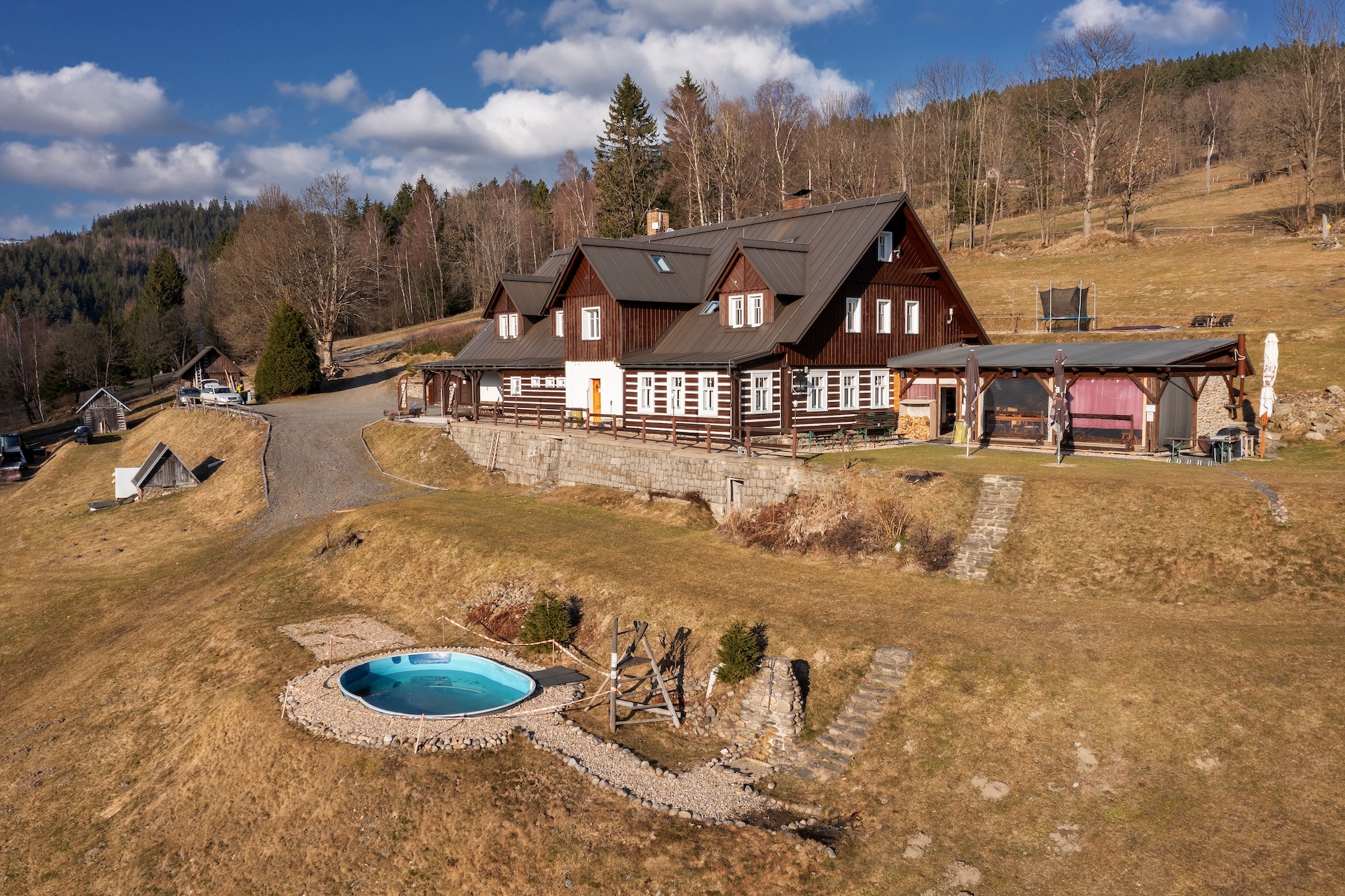 The resort includes a mountain chalet with a capacity of up to 33 people, which offers seven fully equipped apartments, each with its own kitchen and bathroom. The natural center of events is a restaurant with a bar and an adjacent outdoor seating area, which creates a background not only for accommodated guests, but also for the development of the event segment, including weddings or corporate events. The overall standard is complemented by a wellness area with a sauna and a jacuzzi, an outdoor pool and other spaces for leisure activities, thanks to which the resort operates fully throughout the year.