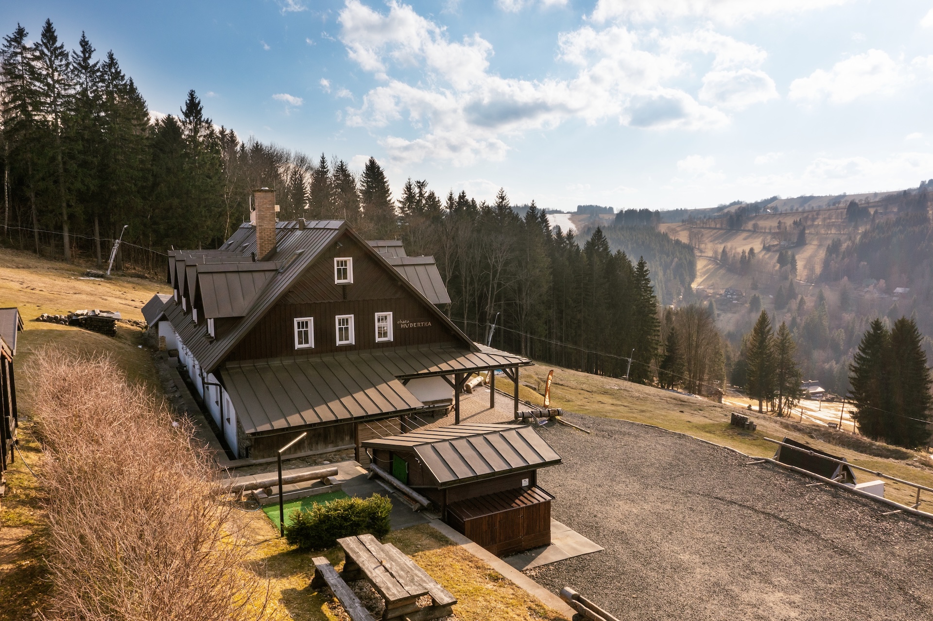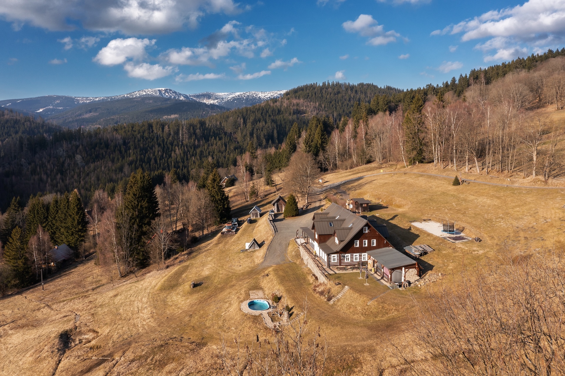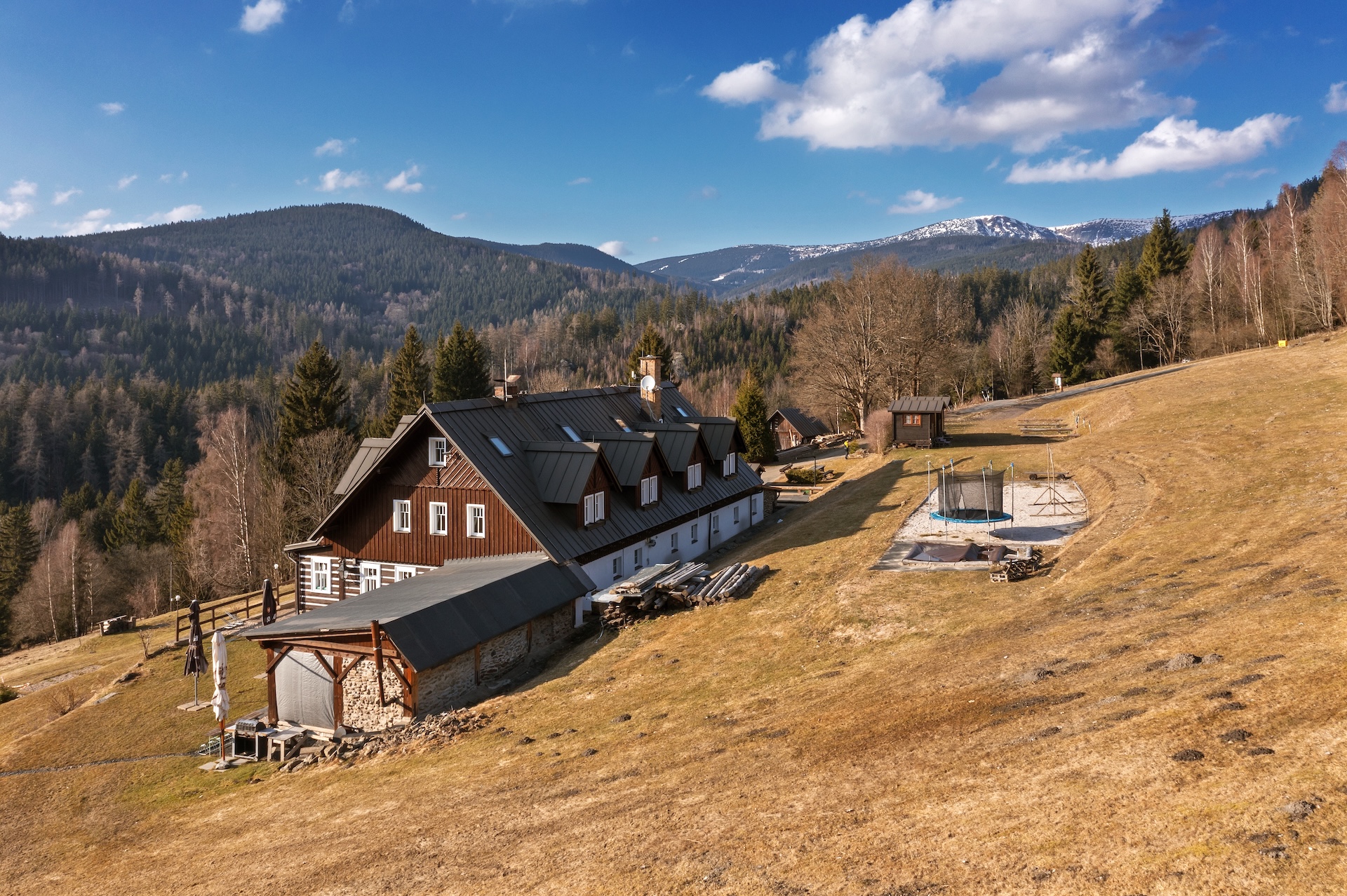 The resort includes a mountain chalet with a capacity of up to 33 people, which offers seven fully equipped apartments, each with its own kitchen and bathroom. The natural center of events is a restaurant with a bar and an adjacent outdoor seating area, which creates a background not only for accommodated guests, but also for the development of the event segment, including weddings or corporate events. The overall standard is complemented by a wellness area with a sauna and a jacuzzi, an outdoor pool and other spaces for leisure activities, thanks to which the resort operates fully throughout the year.