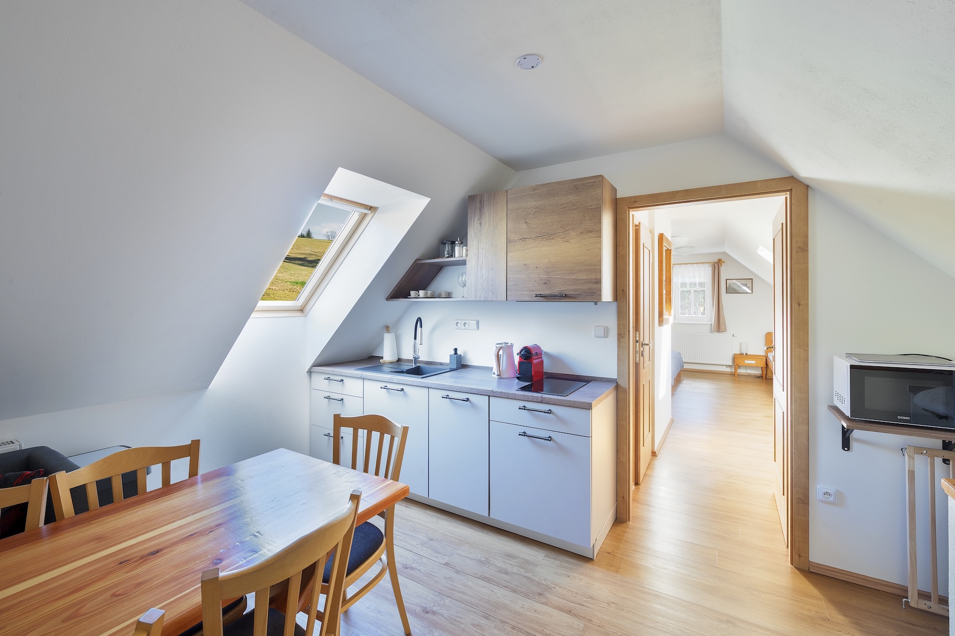 In addition to the established operation, the area offers significant development potential. The approved zoning plan, together with the already prepared architectural study, allows for an expansion by approximately 14 additional apartment units, sensitively and in stages, taking into account the character of the location. The sale also includes adjoining land, which provides not only space for further development, but also long-term privacy, and complete infrastructure including a reception and sufficient parking capacities directly on the area.