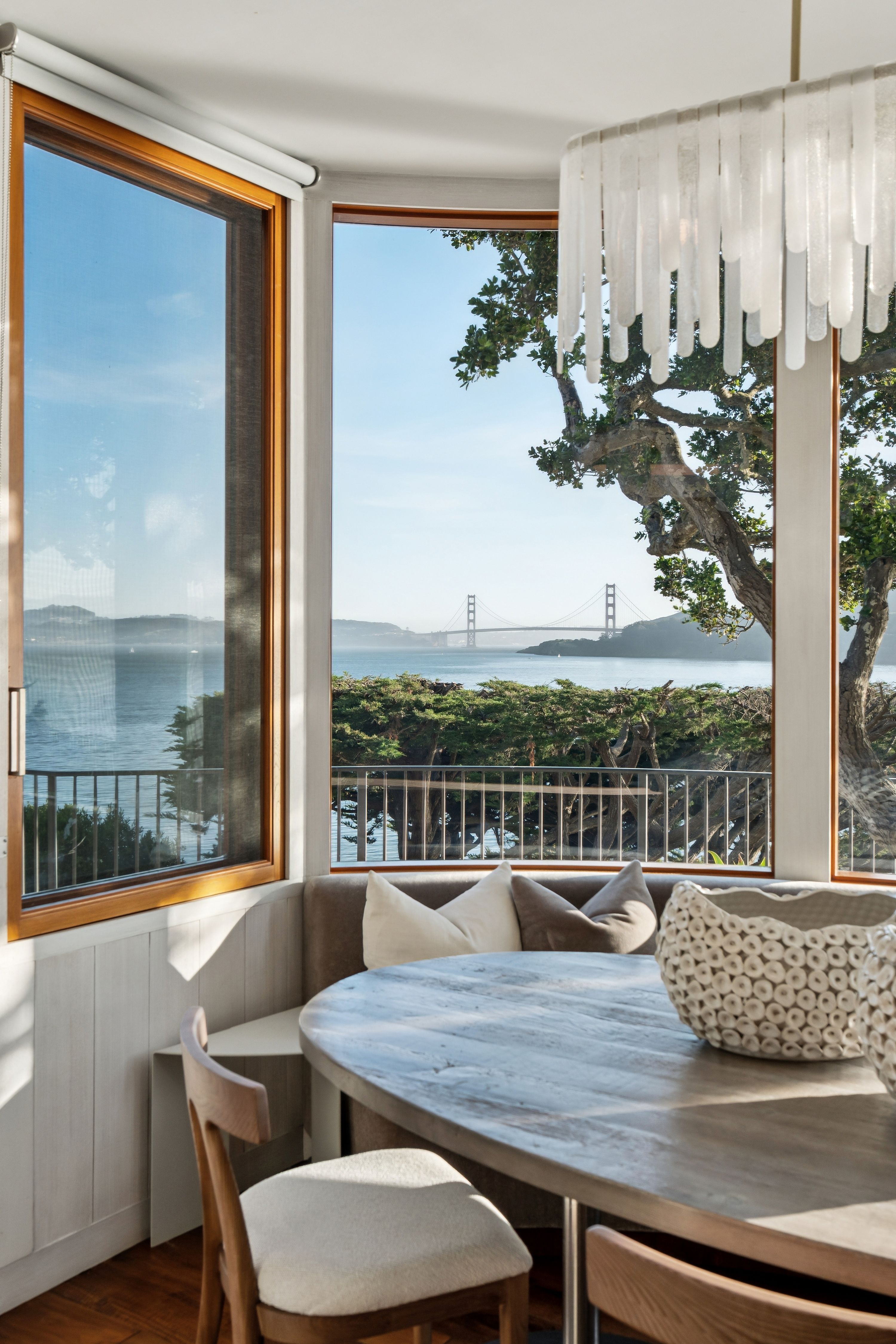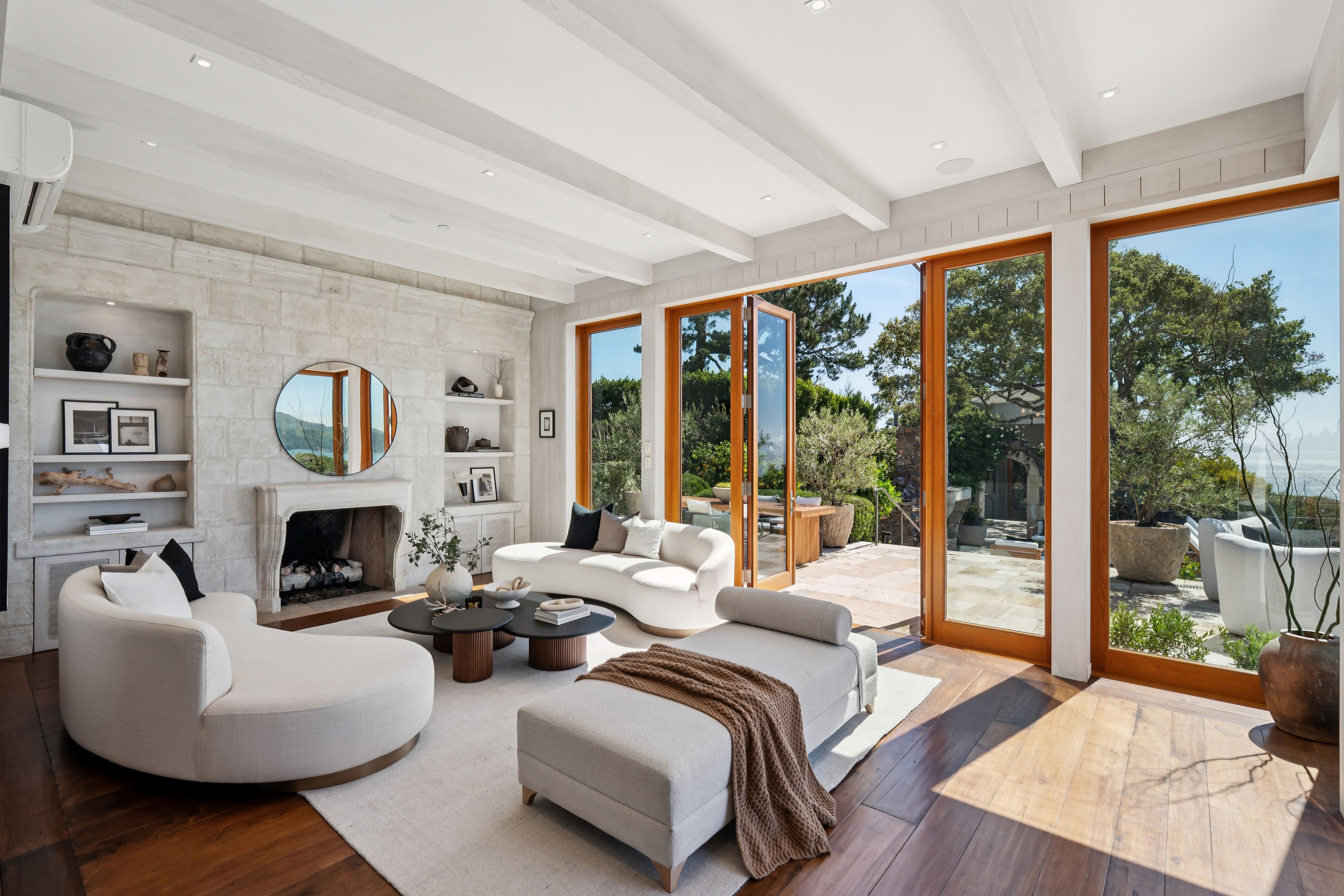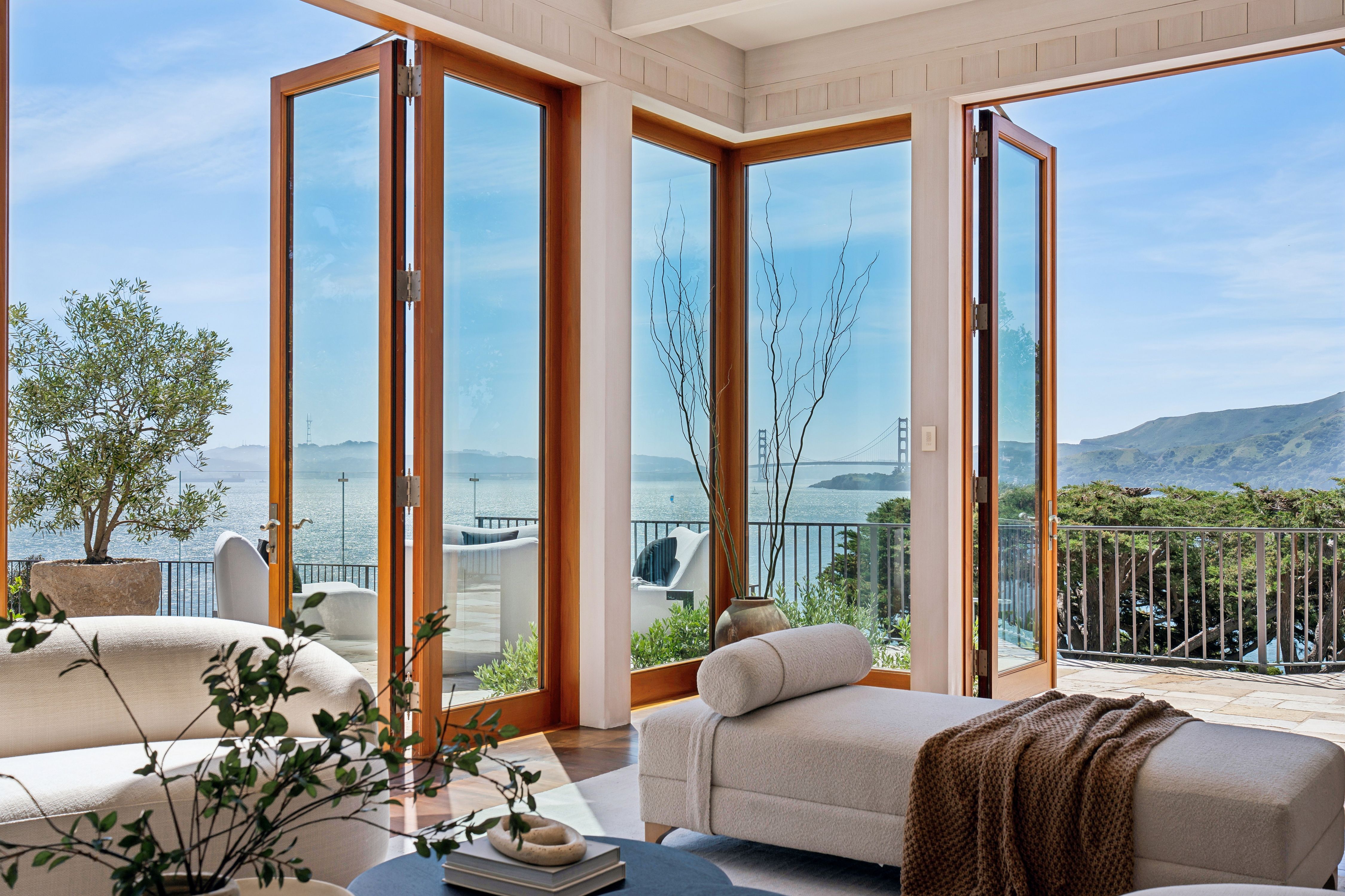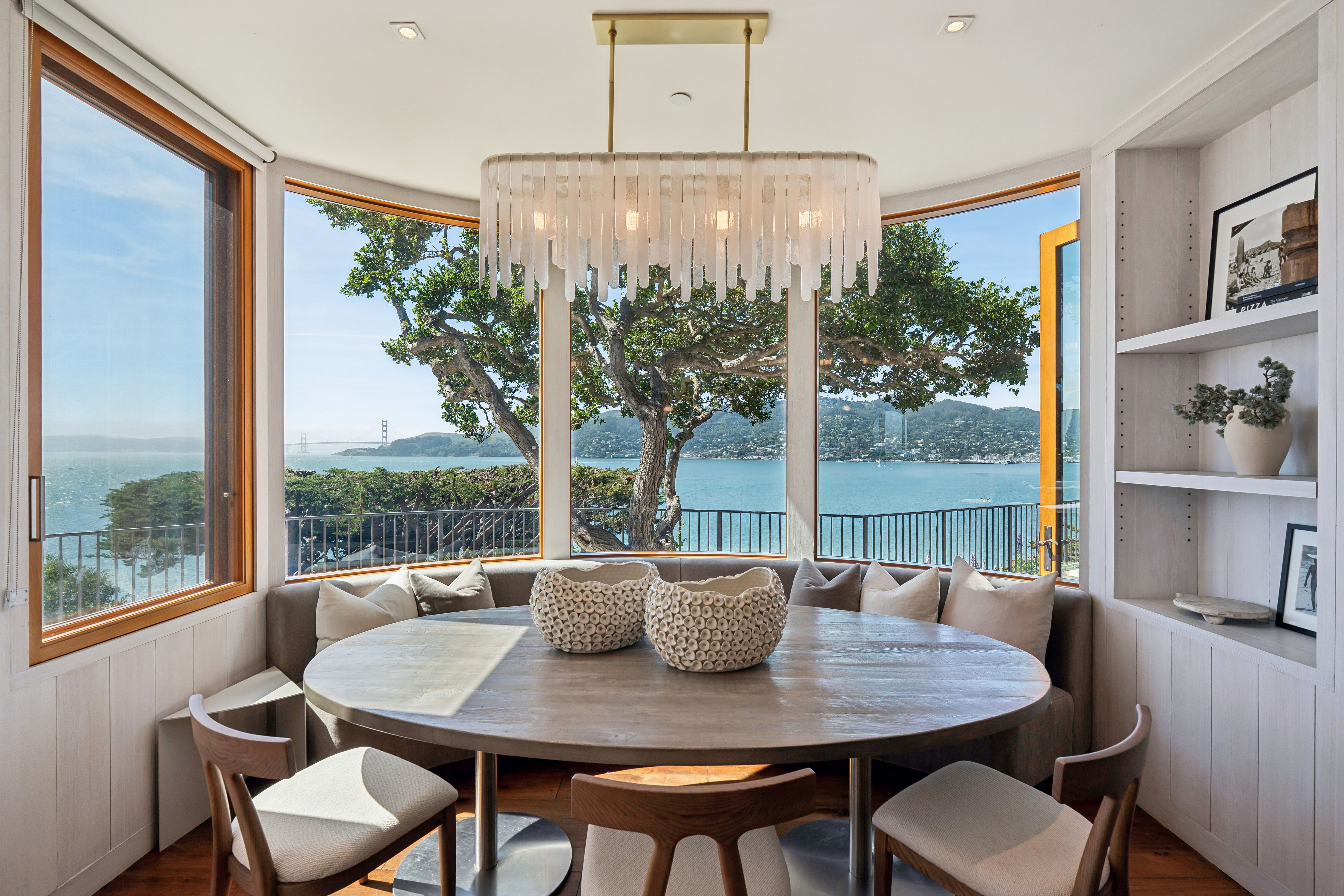 At the very edge of Belvedere Island on an exclusive, near-private cul-de-sac, the Belvedere Sanctuary at 4 Blanding Lane is a rare, world-class estate set within one of the most coveted enclaves on San Francisco Bay. Positioned on what is known as “Billionaires Point,” and surrounded by only a handful of residences, this extraordinary two-building compound offers a level of privacy and prestige that is nearly impossible to replicate.From this remarkable vantage point, sweeping panoramic views unfold in every direction—from the iconic Golden Gate Bridge to the Bay Bridge, across Sausalito and beyond—creating the sensation of a private retreat suspended above the water. Here, the landscape is ever-changing, with light, weather, and time painting a new masterpiece each day.Designed with bespoke finishes and timeless craftsmanship, the residence seamlessly blends Old World elegance with modern sophistication. Teak-framed windows, bronze railings, and hand-hewn wide-plank walnut floors anchor the home in warmth and quality, while soaring ceilings and curated designer lighting enhance the natural light and dramatic scale. The indoor-outdoor flow is effortless, opening to a stunning infinity-edge pool, outdoor fireplace, expansive stone terraces, and lush, manicured gardens—perfectly suited for both grand-scale entertaining and serene seclusion.The primary suite is a sanctuary unto itself, offering a private sitting area, custom-designed closets, integrated surround sound, and breathtaking views of the Golden Gate Bridge—even from the shower—transforming everyday living into an extraordinary experience.A separate studio guest house, complete with full amenities and its own garage, mirrors the elevated design of the main residence, creating a versatile and private compound with dual entrances—ideal for guests, extended stays, or a refined work-from-home environment.Set at the coveted tip of Belvedere Island, just across the Bay from San Francisco, this distinguished location offers one of California’s most exclusive lifestyles. Residents enjoy access to world-class yachting culture, including the renowned San Francisco Yacht Club and Corinthian Yacht Club, along with charming waterfront shops, fine dining, and convenient ferry service.4 Blanding Lane is more than a home—it is a rare and irreplaceable offering. A place where privacy, presence, and perspective converge… and where the beauty of the Bay becomes part of everyday life.