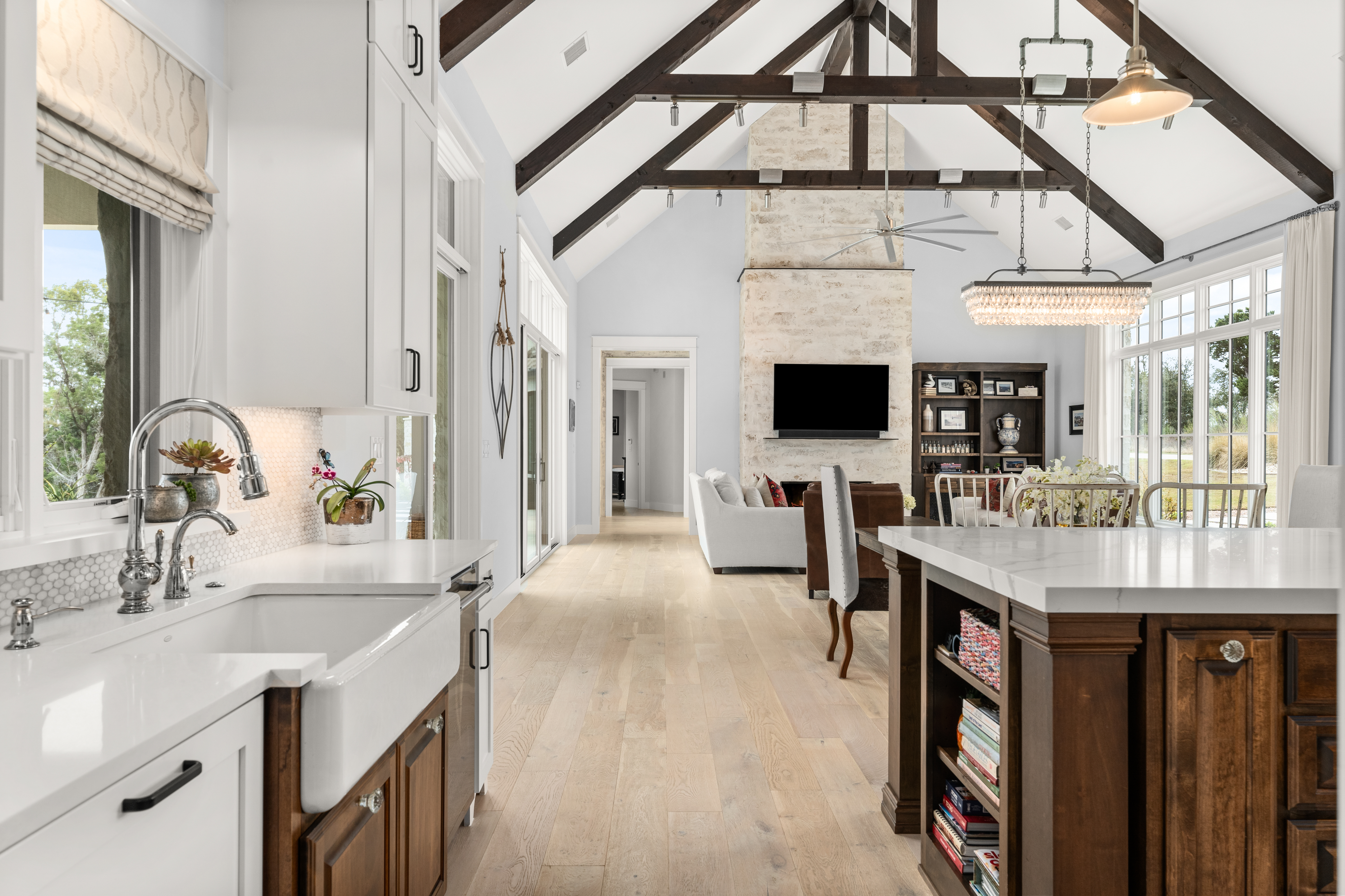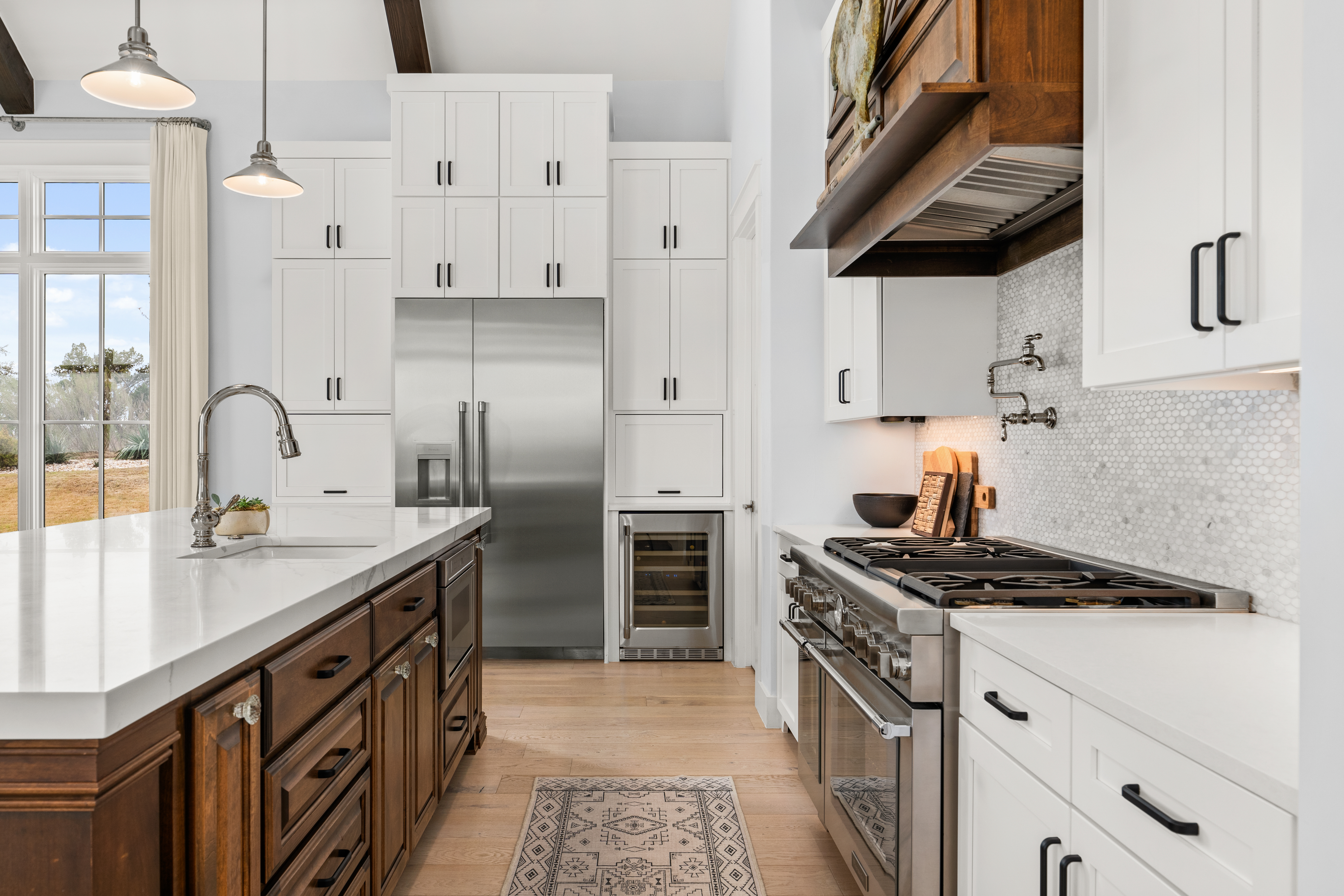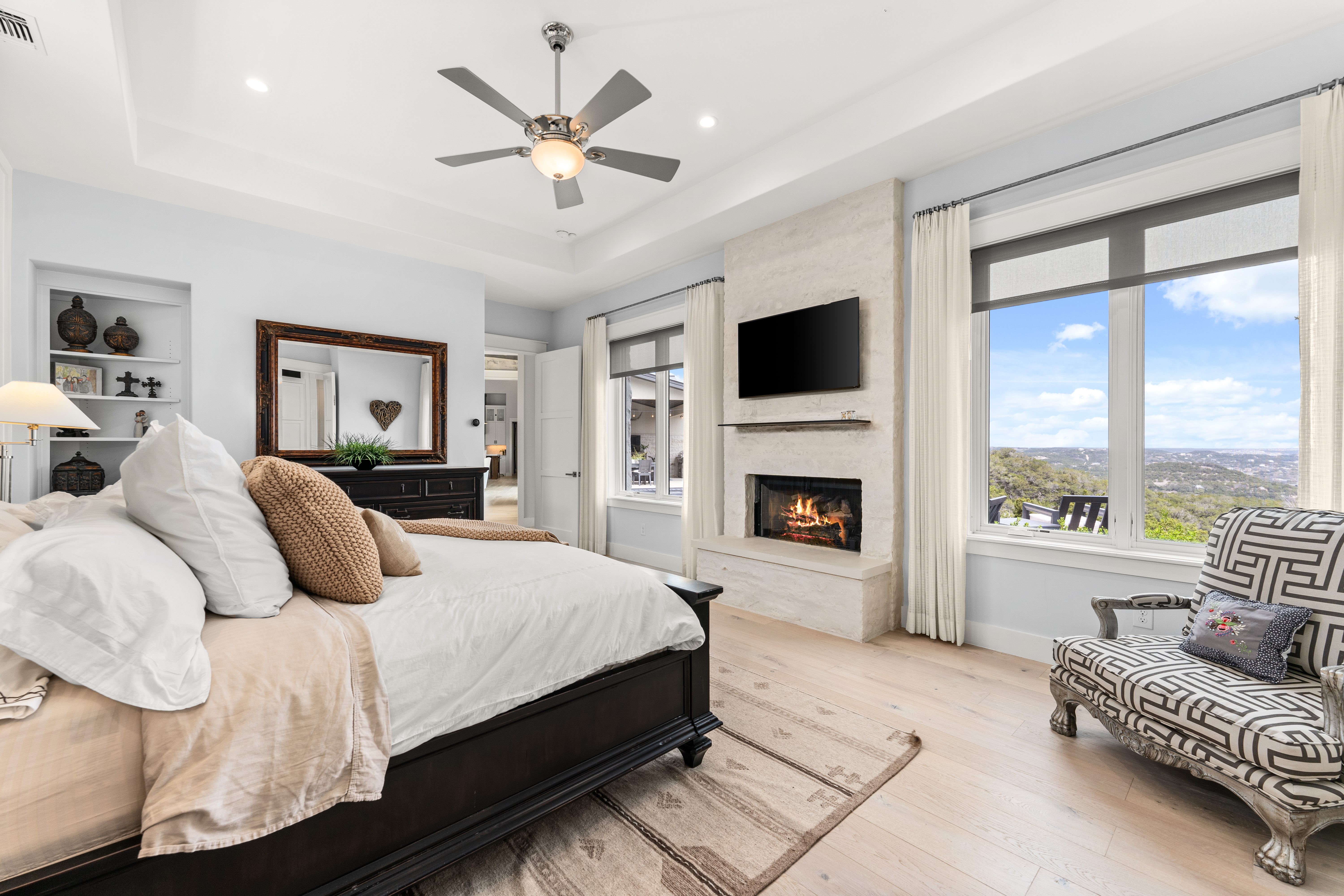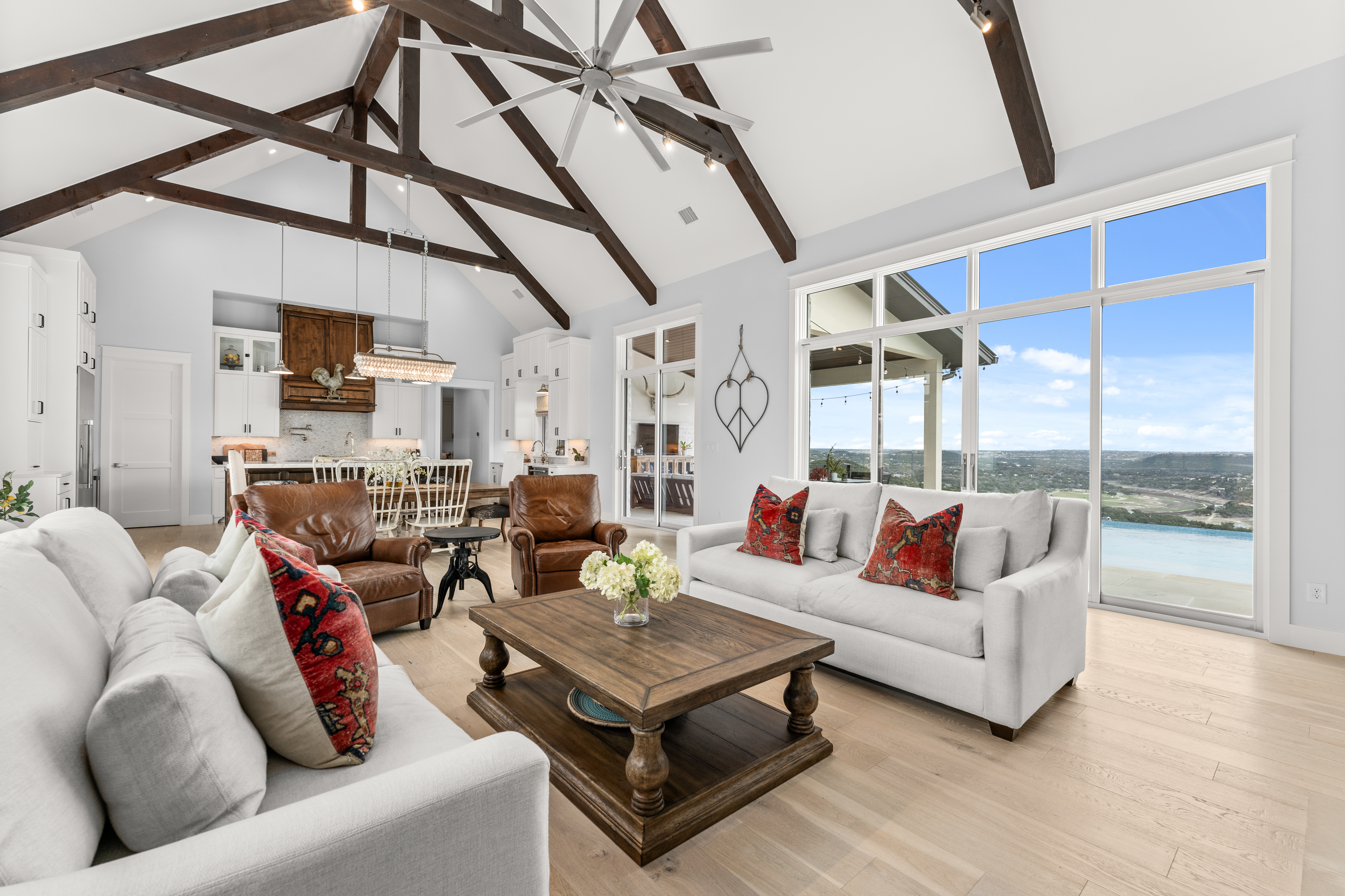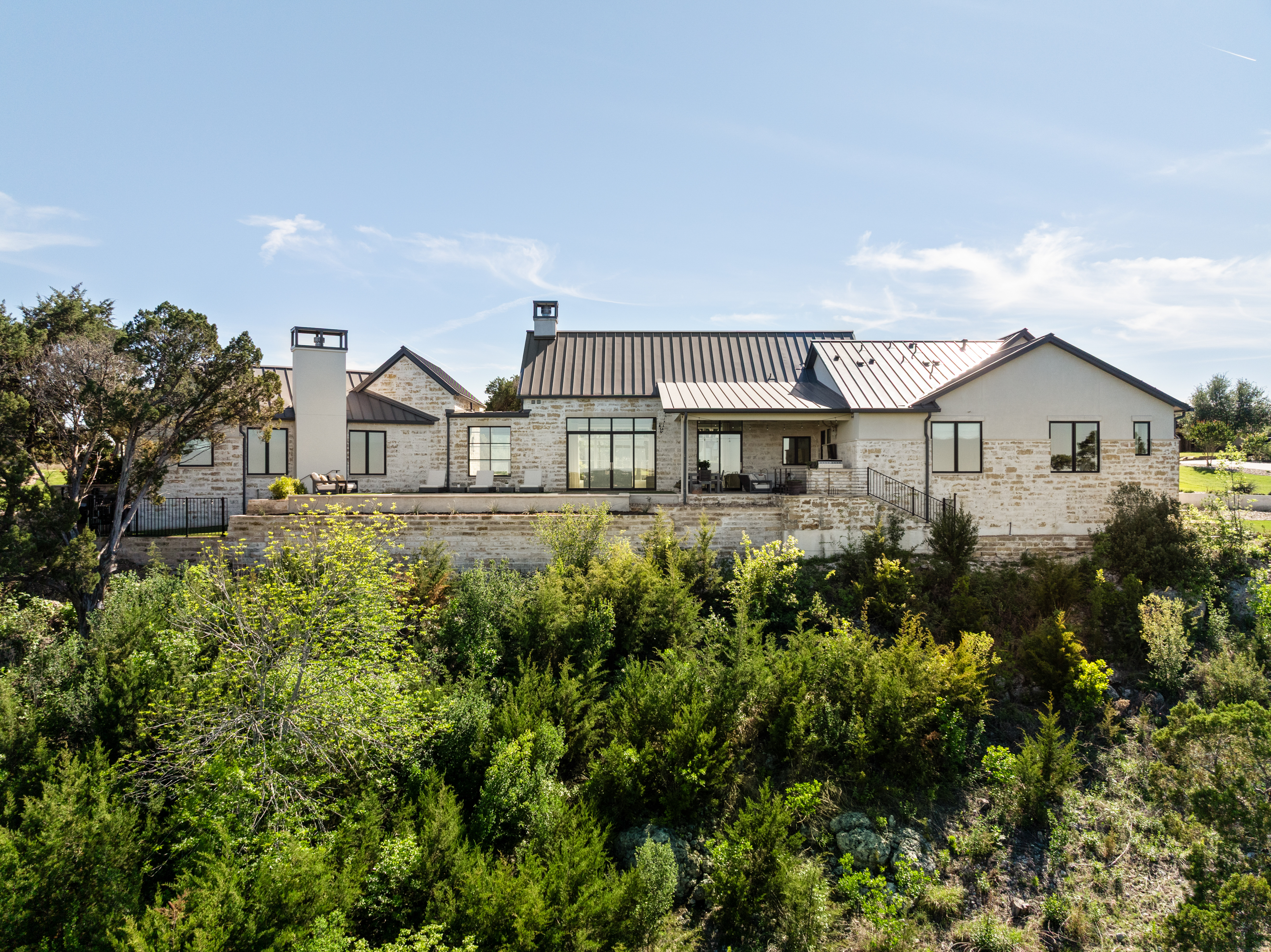 Set within the private, acreage community of Ranchland Hills in Jonestown, this home designed by award-winning architect Elliot Johnson and built by Richard Bright Custom Homes, a contemporary ranch-style residence with three bedrooms, three full bathrooms, and a dedicated office, captures panoramic views of Sandy Creek and Lake Travis, offering a refined Hill Country retreat. A slurry stone exterior finish, Lincoln wood windows, and a Legacy custom steel entryway define the home’s architectural character, blending natural materials with clean, modern lines.Expansive sliding doors create seamless indoor-outdoor connectivity and fill the home with natural light. The main living area features vaulted ceilings with exposed wood beams, a floor-to-ceiling stone fireplace, and wide-plank white oak flooring—forming a warm, open space oriented toward the views.The kitchen is centered around an oversized island with seating and prep sink, complemented by quartz countertops, Thermador appliances, and custom cabinetry. A farmhouse sink and clean, modern finishes complete a space designed for both daily living and elevated entertaining. The primary suite includes a floor-to-ceiling stone fireplace, a spacious vaulted walk-in closet designed for functionality, and an expansive walk-in shower with quartz countertops.Outdoor living is thoughtfully designed with a custom pool and hot tub, outdoor kitchen, and entertaining space by Jaida Custom Pools. Artificial turf and stone coping surround the pool, creating a clean, low-maintenance setting.Manicured landscaping with a curated mix of native plants enhances the approach and complements the natural surroundings.Additional features include a metal seam roof, reverse osmosis drinking water system, full security system, and a fully floored attic above the garage for additional storage. A three-car garage with epoxy flooring completes the property.Situated on a spacious homesite, the property offers privacy, space, and convenient access to Lake Travis, nearby parks, and the greater Austin area.