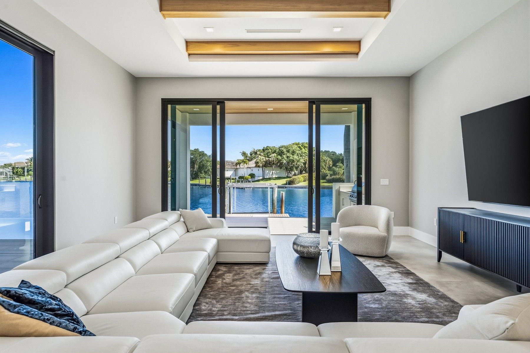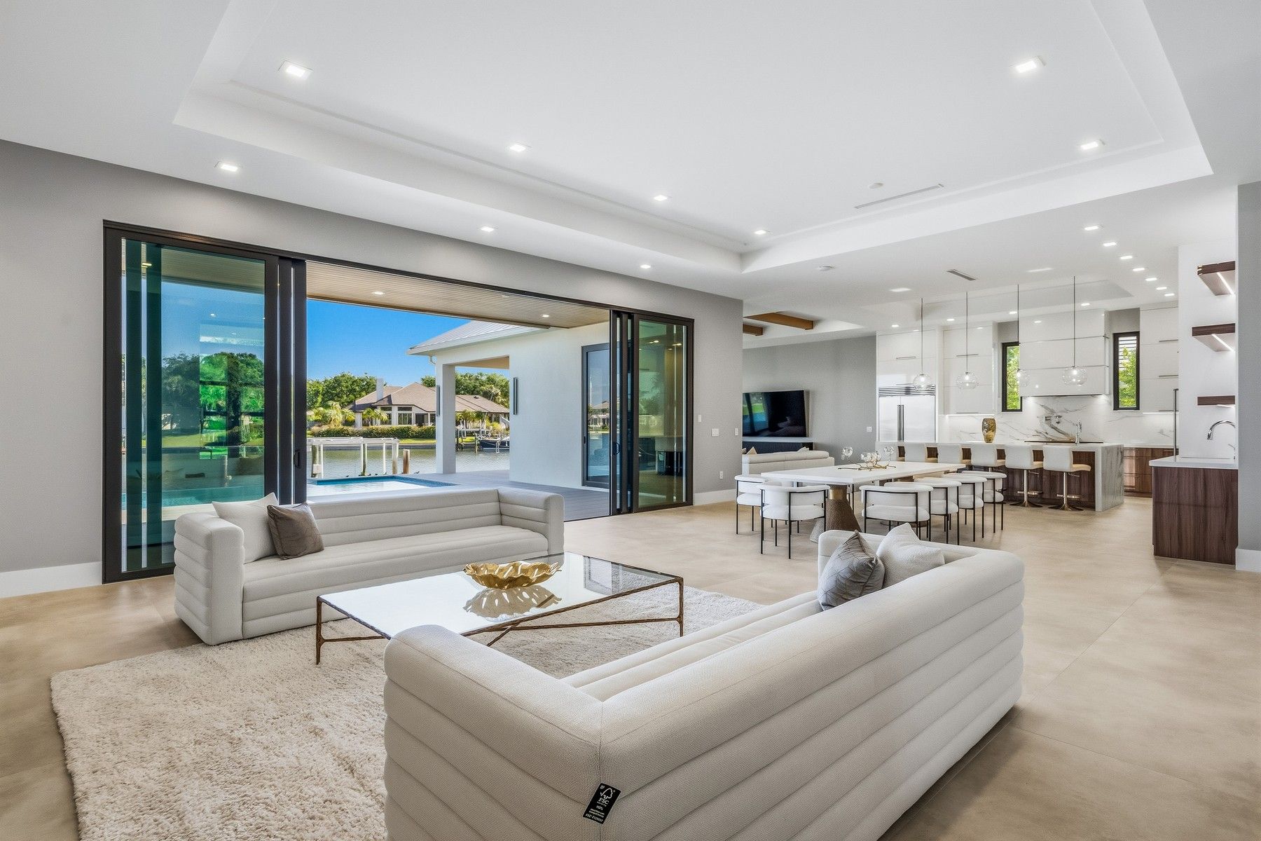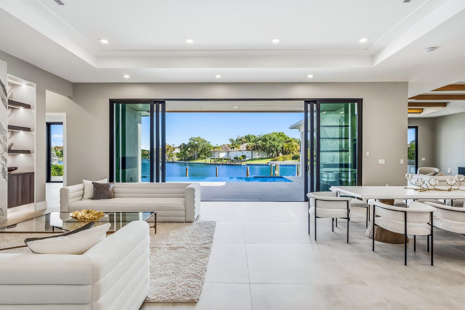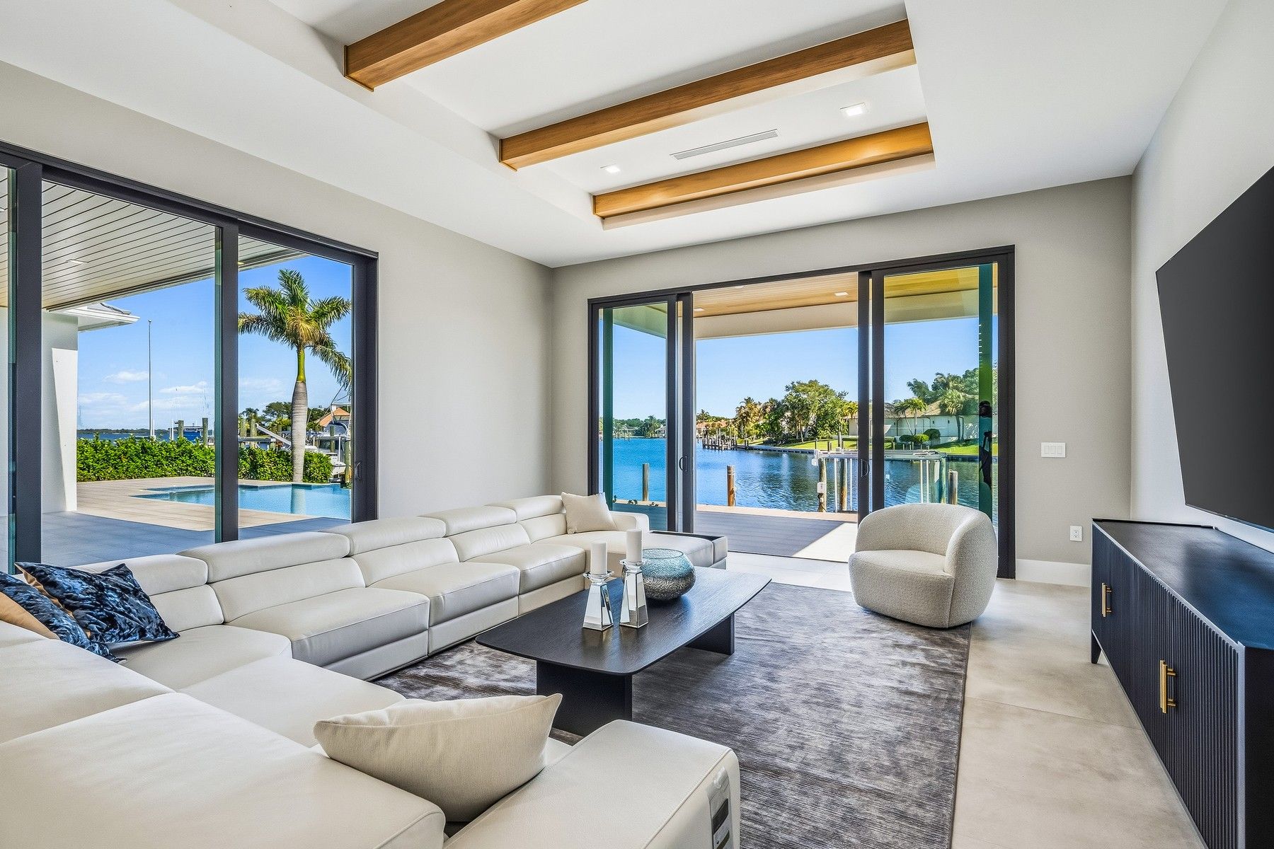Brand new custom deepwater estate in The Moorings, set on over half an acre with 2018 seawall. Trex dock with 12,000-pound boat lift and easy river access. 4 bedrooms, 4.5 baths plus den/office and 4-car garage. Built on pilings with impact windows and doors, and aluminum roof. Finishes include 48X48 porcelain floors, quartz countertops, custom cabinetry, oversized island with waterfall-edge, and Wolf and SubZero appliances. Spa-inspired baths with LED mirrors. Infinity edge saltwater pool and spa, plus expansive loggia ideal for waterfront entertaining. Voluntary HOA with beach access.